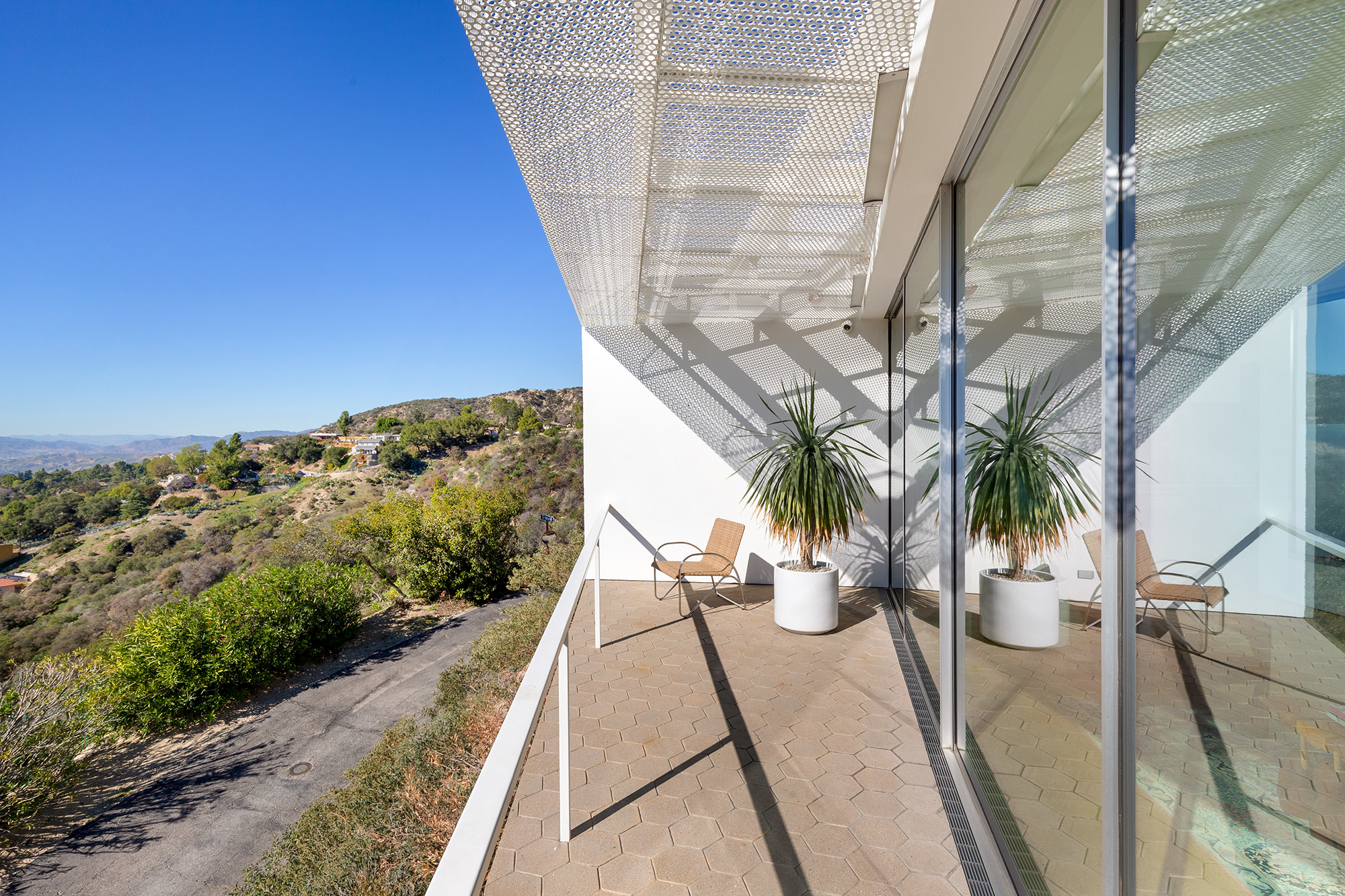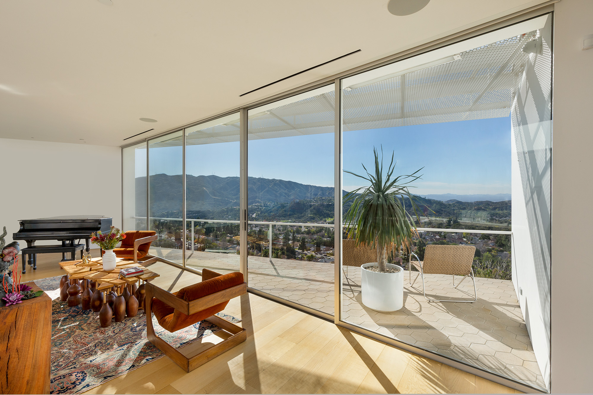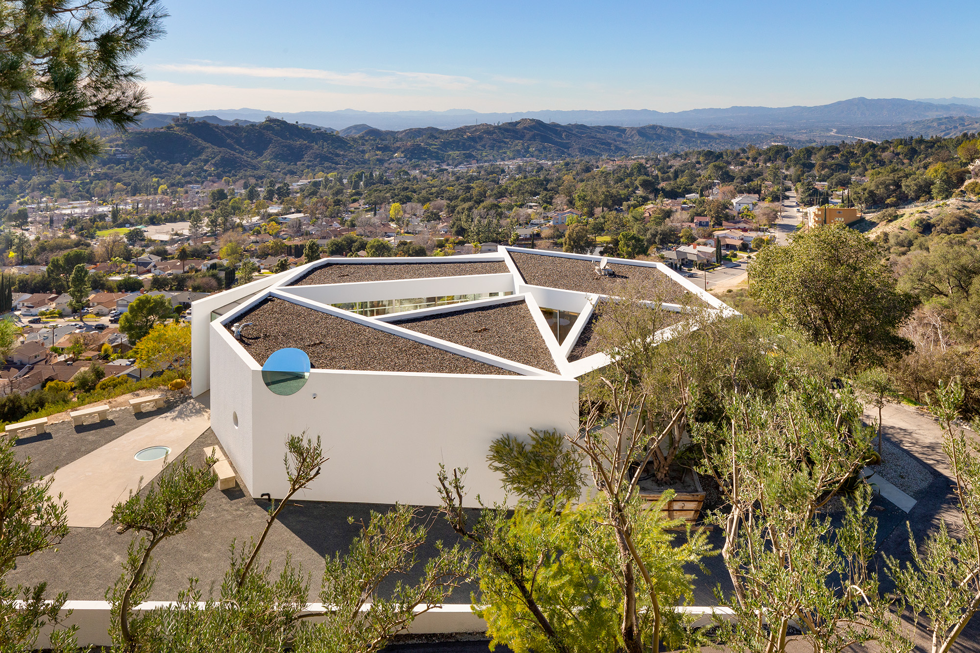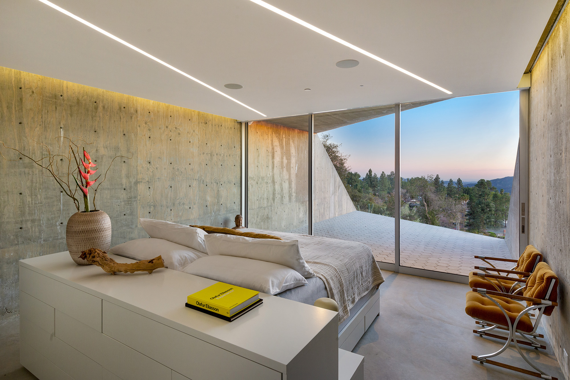 Exceptional Architectural compound offering total hilltop privacy. This stunning pair of pedigreed properties occupy an extraordinary 5.7 acre curated succulent garden. The original structure was built by Richard Neutra FAIA for his secretary, Dorothy Serulnic, in 1953. The 1,350 SF floor plan features 2 bedrooms, one bath, walls of glass, a bear valley stone fireplace and a plethora of Neutra designed built-ins, including a sofa system with record player and concealed speakers, multiple desks, shelving systems, dining room table, sliding breakfast nook and vanity. This pristine architectural masterpiece opens to a flat grassy pad with spectacular mountain and city skyline views throughout. Nearly a half a century later, award winning architect Michael Maltzan was commissioned to build the main residence. His unique design is anchored by a 7 sided structure with an interior courtyard. A sensational 875 SF addition was completed by the noteworthy architect in 2021. The entire structure has breathtaking mountain and city skyline views. The heavenly primary suite with curvilinear penny tiled bathroom looks through the courtyard and onto the dramatic view. There is a smart office area, cozy den, and a multitude of built-in storage throughout. The enormous Johnston Vidal lap pool is 50'long. The outdoor movie pavilion with wind screen and catering kitchen is the perfect place to entertain. A spectacular cabin designed by Mariah O'Brien interiors and Mind Tree Arts completes the unique estate. This special compound offers peace and privacy like no other.