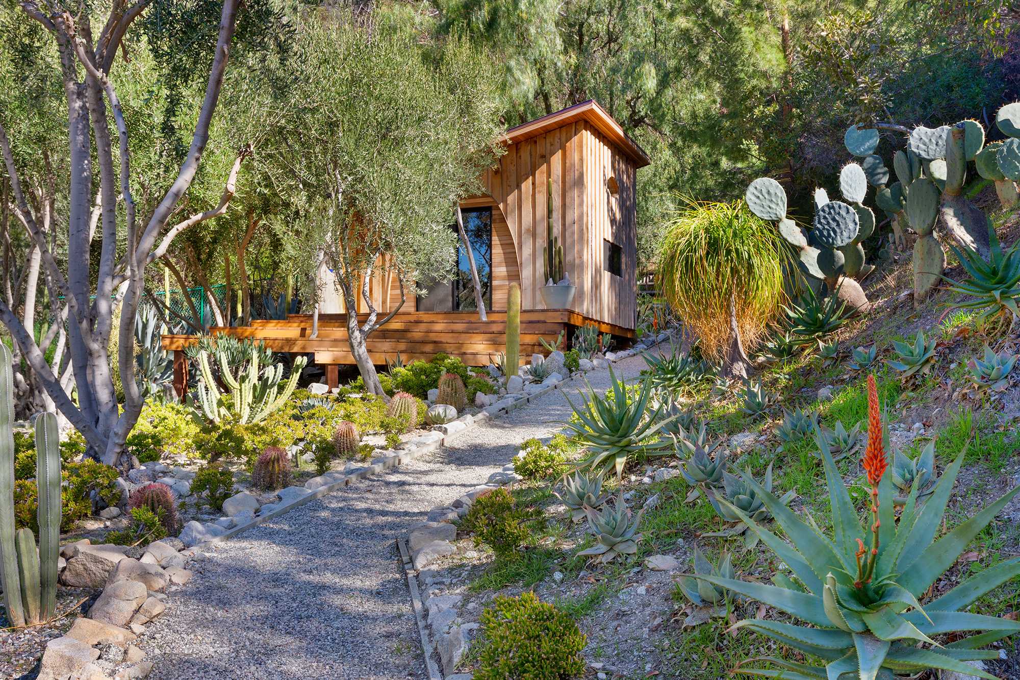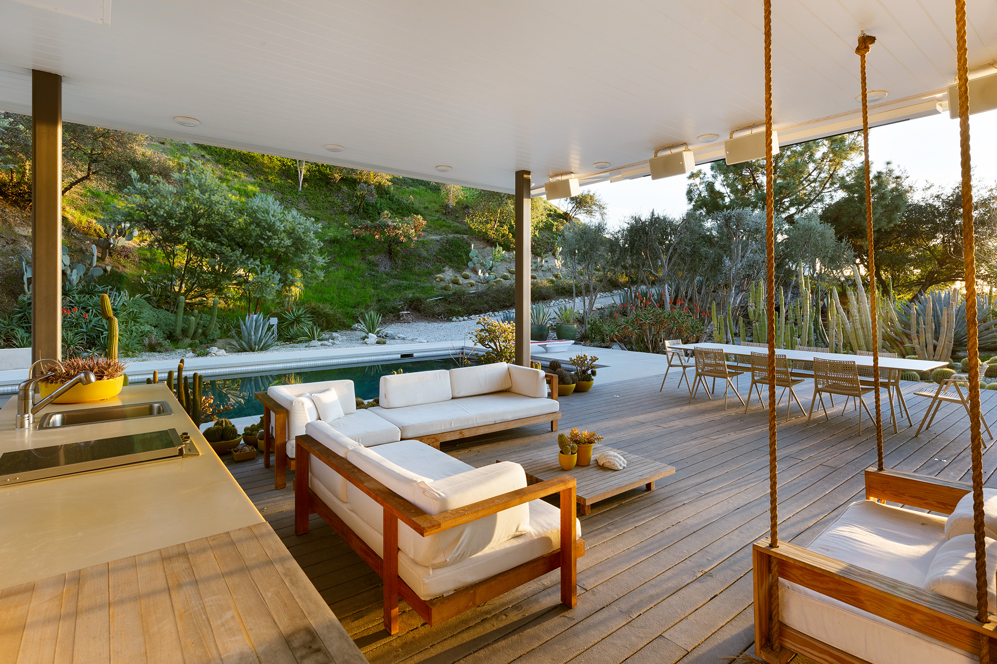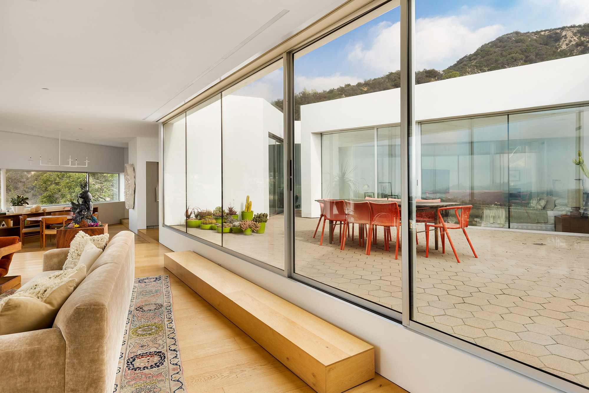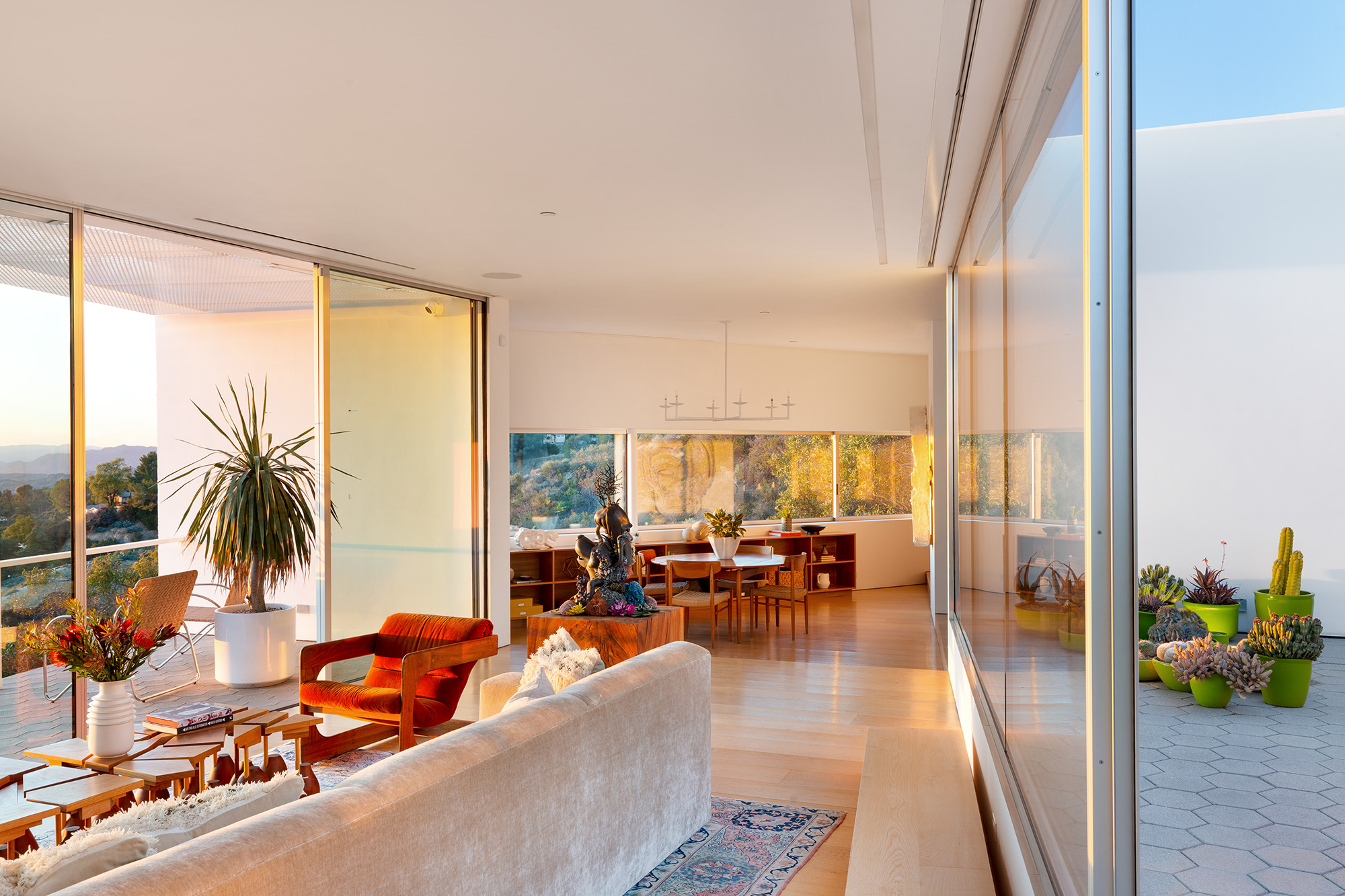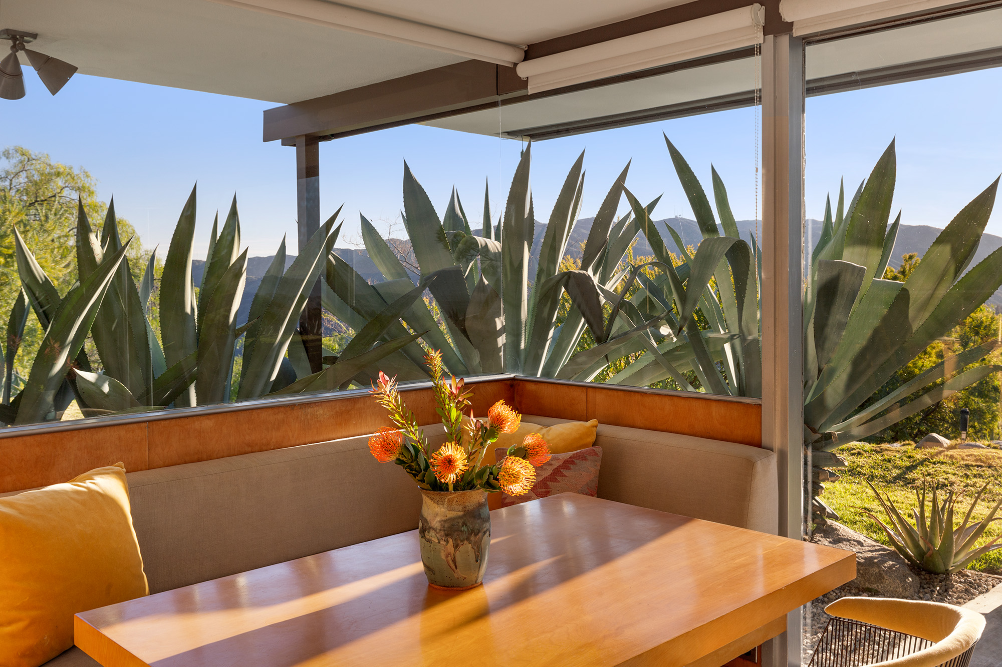 Exceptional Architectural compound offering total hilltop privacy. This stunning pair of pedigreed properties occupy an extraordinary 5.7 acre curated succulent garden. The original structure was built by Richard Neutra FAIA for his secretary, Dorothy Serulnic, in 1953. The 1,350 SF floor plan features 2 bedrooms, one bath, walls of glass, a bear valley stone fireplace and a plethora of Neutra designed built-ins, including a sofa system with record player and concealed speakers, multiple desks, shelving systems, dining room table, sliding breakfast nook and vanity. This pristine architectural masterpiece opens to a flat grassy pad with spectacular mountain and city skyline views throughout. Nearly a half a century later, award winning architect Michael Maltzan was commissioned to build the main residence. His unique design is anchored by a 7 sided structure with an interior courtyard. A sensational 875 SF addition was completed by the noteworthy architect in 2021. The entire structure has breathtaking mountain and city skyline views. The heavenly primary suite with curvilinear penny tiled bathroom looks through the courtyard and onto the dramatic view. There is a smart office area, cozy den, and a multitude of built-in storage throughout. The enormous Johnston Vidal lap pool is 50'long. The outdoor movie pavilion with wind screen and catering kitchen is the perfect place to entertain. A spectacular cabin designed by Mariah O'Brien interiors and Mind Tree Arts completes the unique estate. This special compound offers peace and privacy like no other.