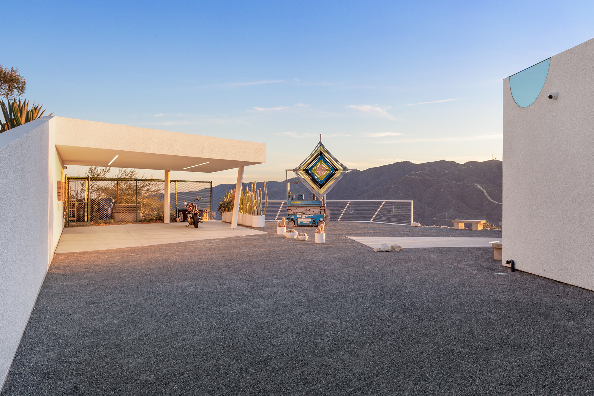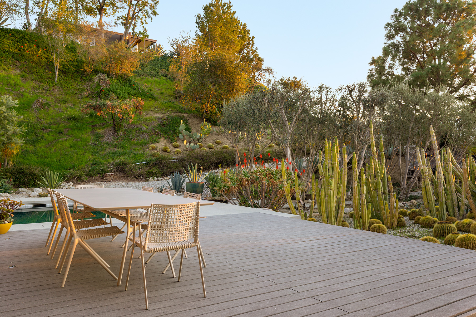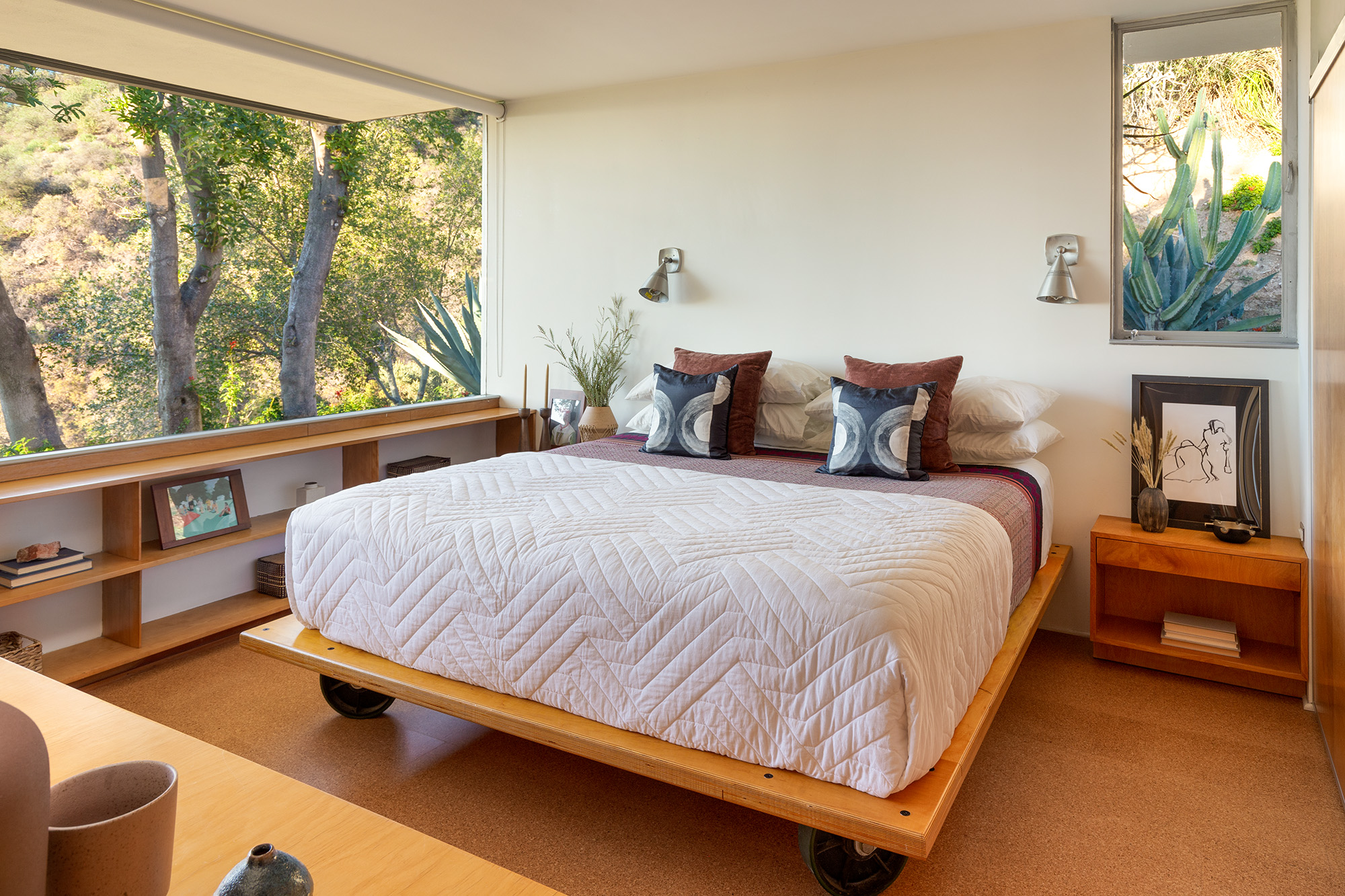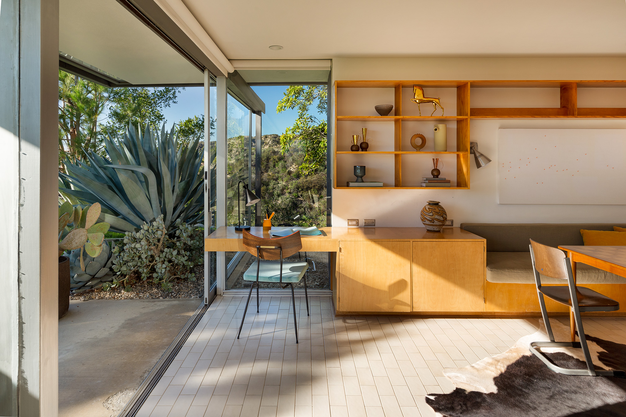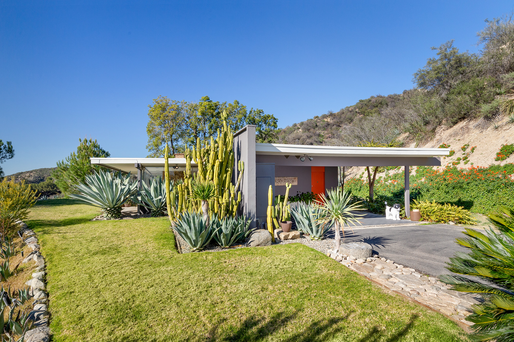 Exceptional Architectural compound offering total hilltop privacy. This stunning pair of pedigreed properties occupy an extraordinary 5.7 acre curated succulent garden. The original structure was built by Richard Neutra FAIA for his secretary, Dorothy Serulnic, in 1953. The 1,350 SF floor plan features 2 bedrooms, one bath, walls of glass, a bear valley stone fireplace and a plethora of Neutra designed built-ins, including a sofa system with record player and concealed speakers, multiple desks, shelving systems, dining room table, sliding breakfast nook and vanity. This pristine architectural masterpiece opens to a flat grassy pad with spectacular mountain and city skyline views throughout. Nearly a half a century later, award winning architect Michael Maltzan was commissioned to build the main residence. His unique design is anchored by a 7 sided structure with an interior courtyard. A sensational 875 SF addition was completed by the noteworthy architect in 2021. The entire structure has breathtaking mountain and city skyline views. The heavenly primary suite with curvilinear penny tiled bathroom looks through the courtyard and onto the dramatic view. There is a smart office area, cozy den, and a multitude of built-in storage throughout. The enormous Johnston Vidal lap pool is 50'long. The outdoor movie pavilion with wind screen and catering kitchen is the perfect place to entertain. A spectacular cabin designed by Mariah O'Brien interiors and Mind Tree Arts completes the unique estate. This special compound offers peace and privacy like no other.