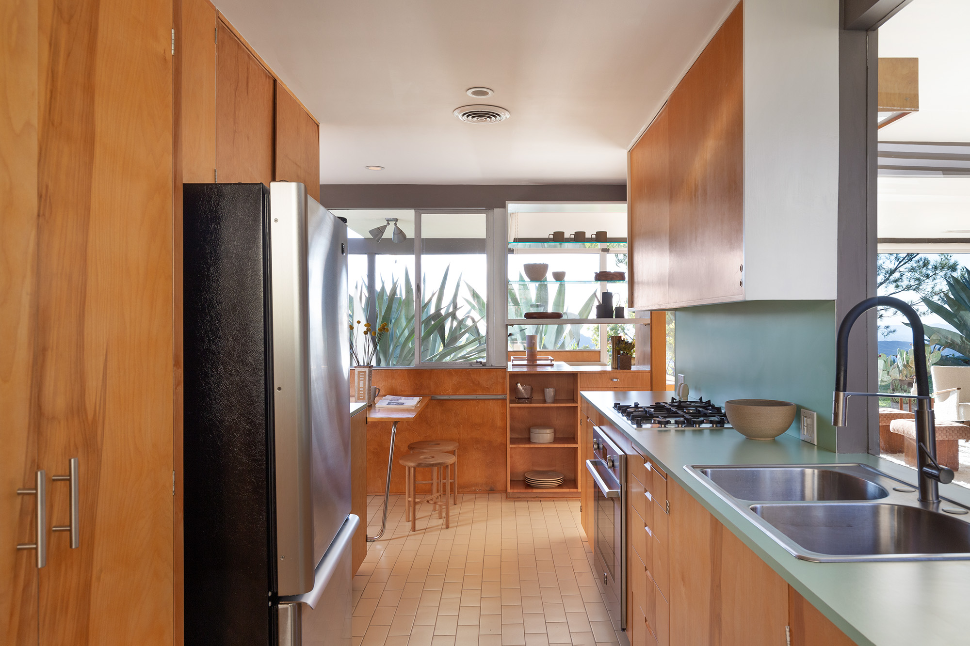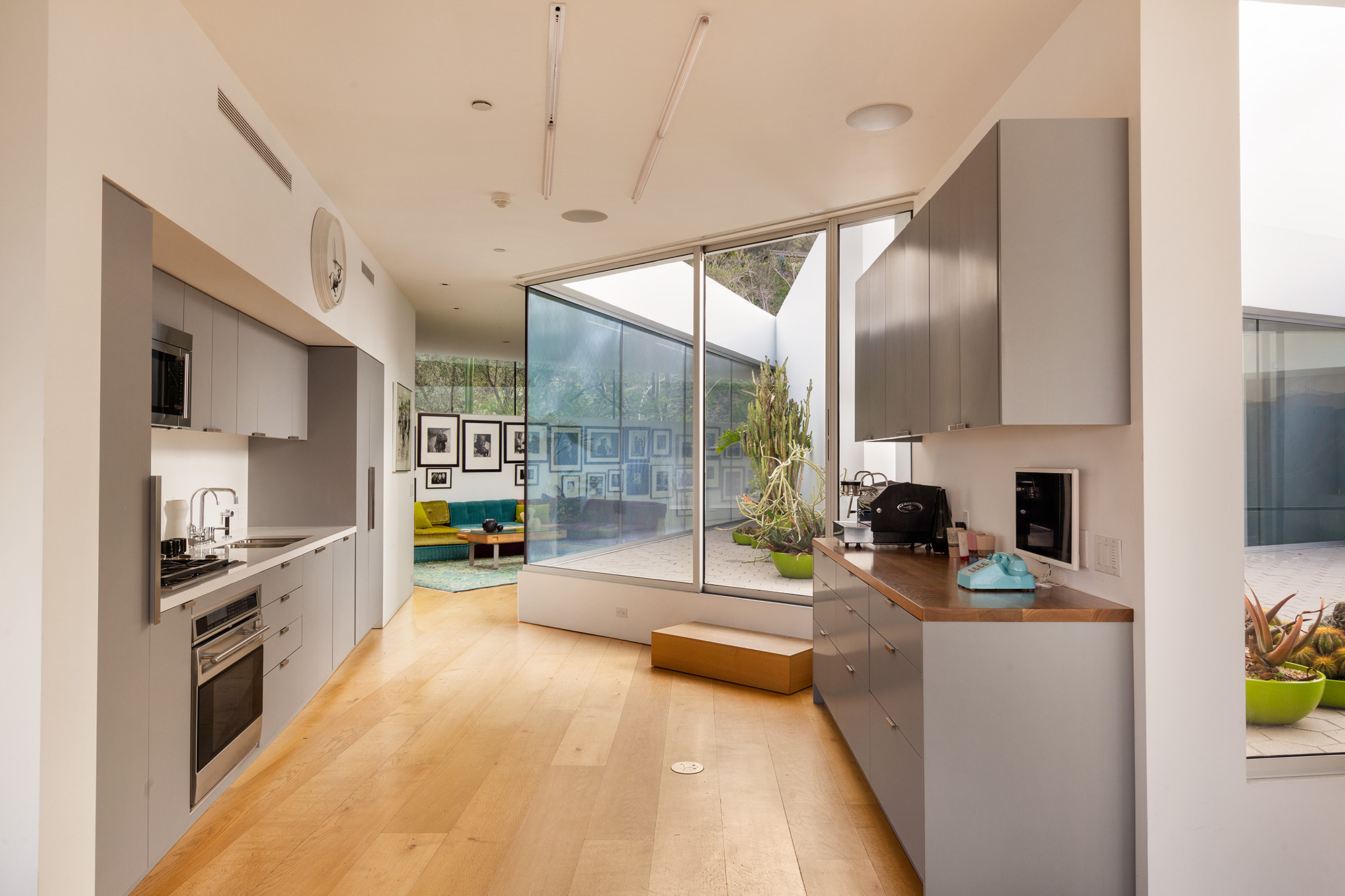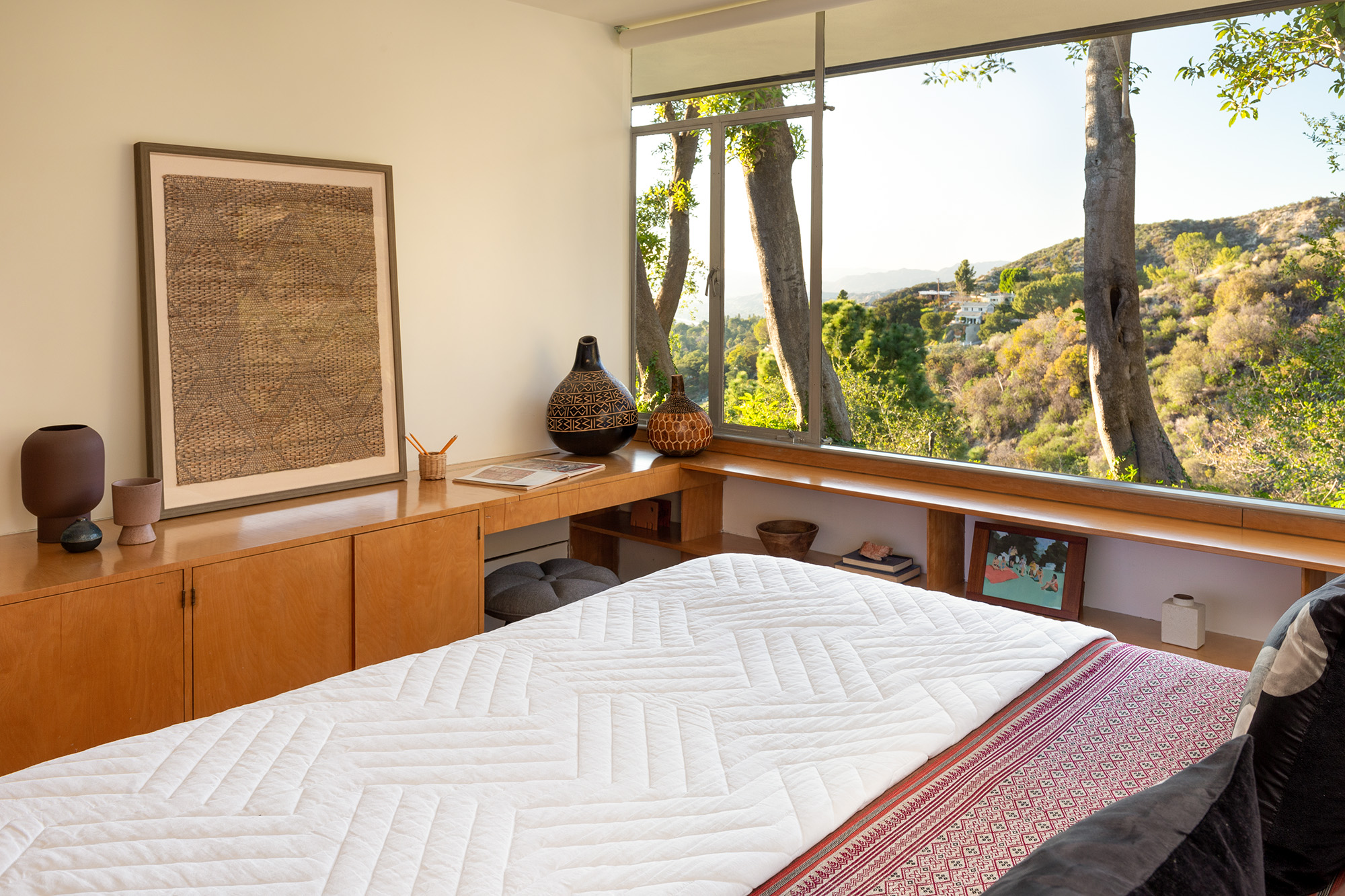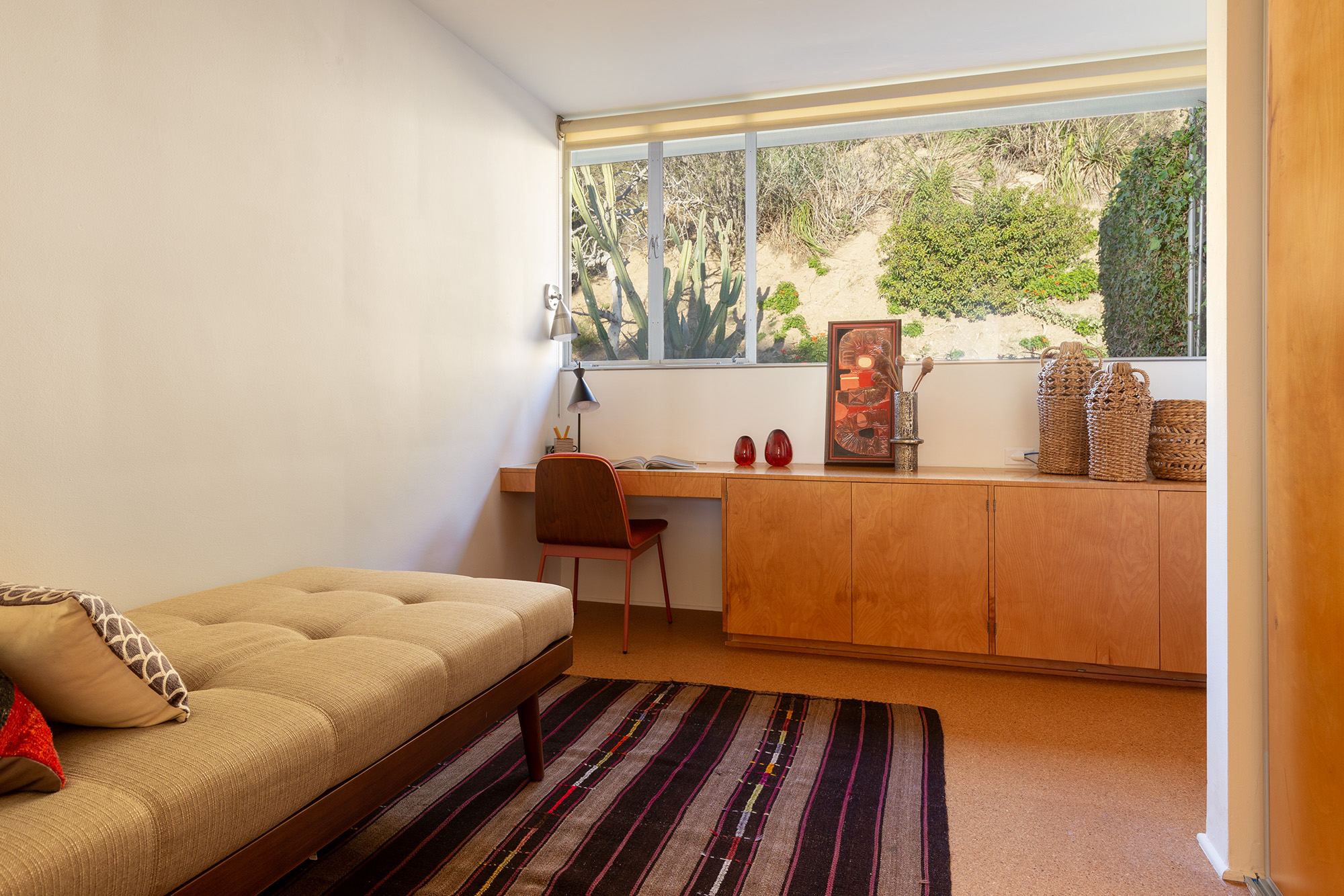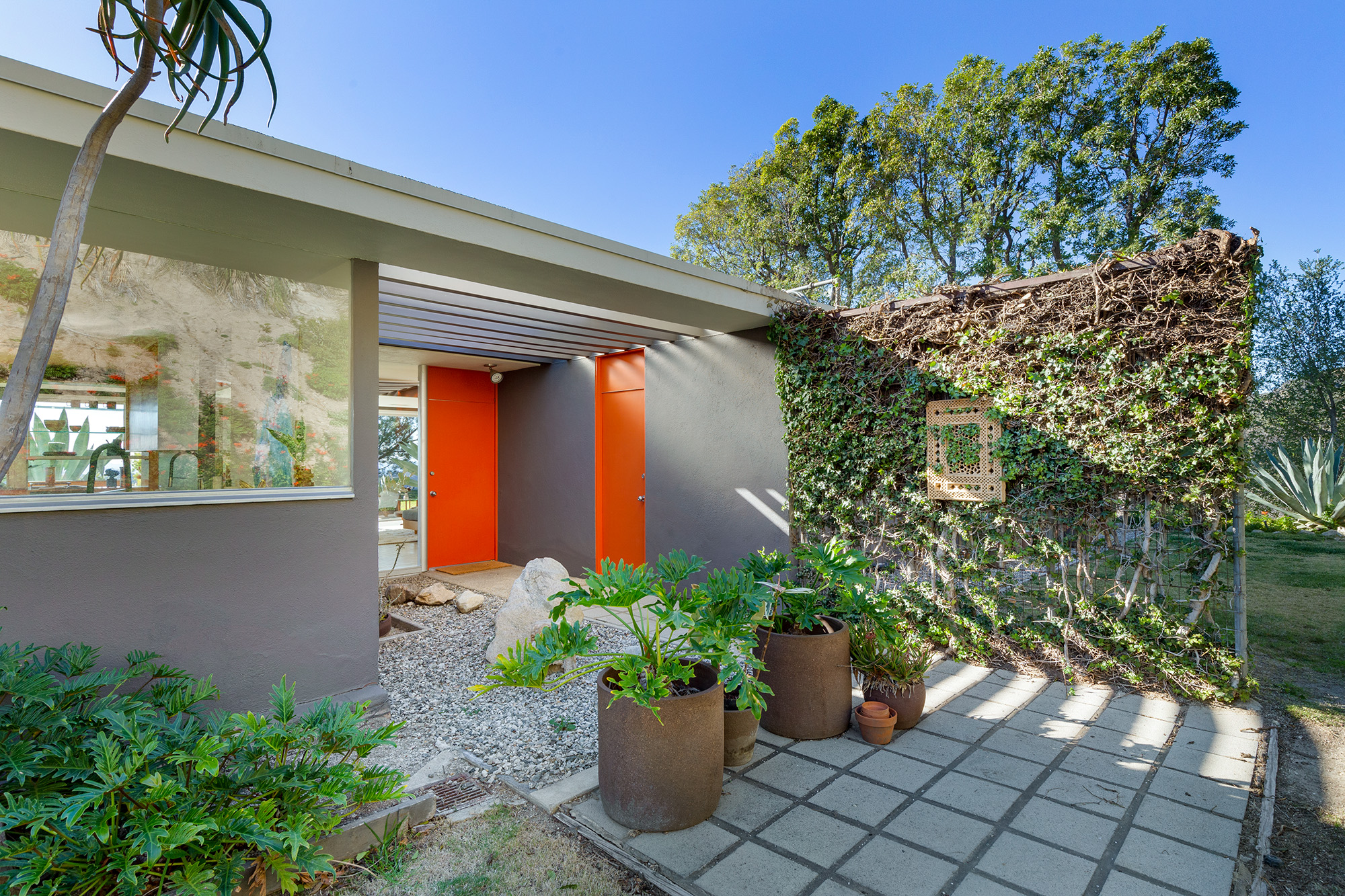 Exceptional Architectural compound offering total hilltop privacy. This stunning pair of pedigreed properties occupy an extraordinary 5.7 acre curated succulent garden. The original structure was built by Richard Neutra FAIA for his secretary, Dorothy Serulnic, in 1953. The 1,350 SF floor plan features 2 bedrooms, one bath, walls of glass, a bear valley stone fireplace and a plethora of Neutra designed built-ins, including a sofa system with record player and concealed speakers, multiple desks, shelving systems, dining room table, sliding breakfast nook and vanity. This pristine architectural masterpiece opens to a flat grassy pad with spectacular mountain and city skyline views throughout. Nearly a half a century later, award winning architect Michael Maltzan was commissioned to build the main residence. His unique design is anchored by a 7 sided structure with an interior courtyard. A sensational 875 SF addition was completed by the noteworthy architect in 2021. The entire structure has breathtaking mountain and city skyline views. The heavenly primary suite with curvilinear penny tiled bathroom looks through the courtyard and onto the dramatic view. There is a smart office area, cozy den, and a multitude of built-in storage throughout. The enormous Johnston Vidal lap pool is 50'long. The outdoor movie pavilion with wind screen and catering kitchen is the perfect place to entertain. A spectacular cabin designed by Mariah O'Brien interiors and Mind Tree Arts completes the unique estate. This special compound offers peace and privacy like no other.