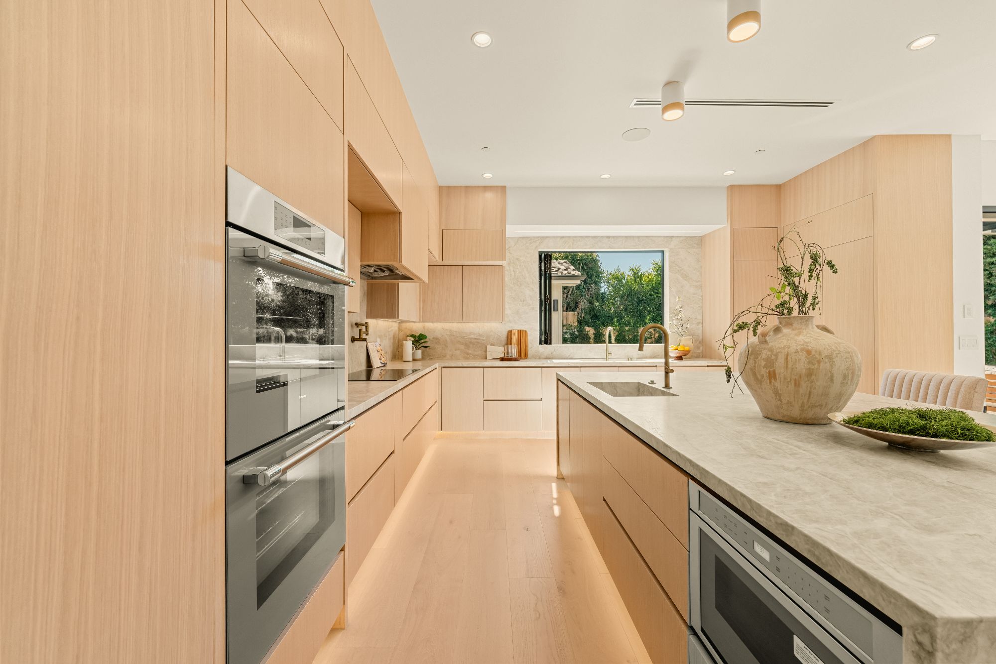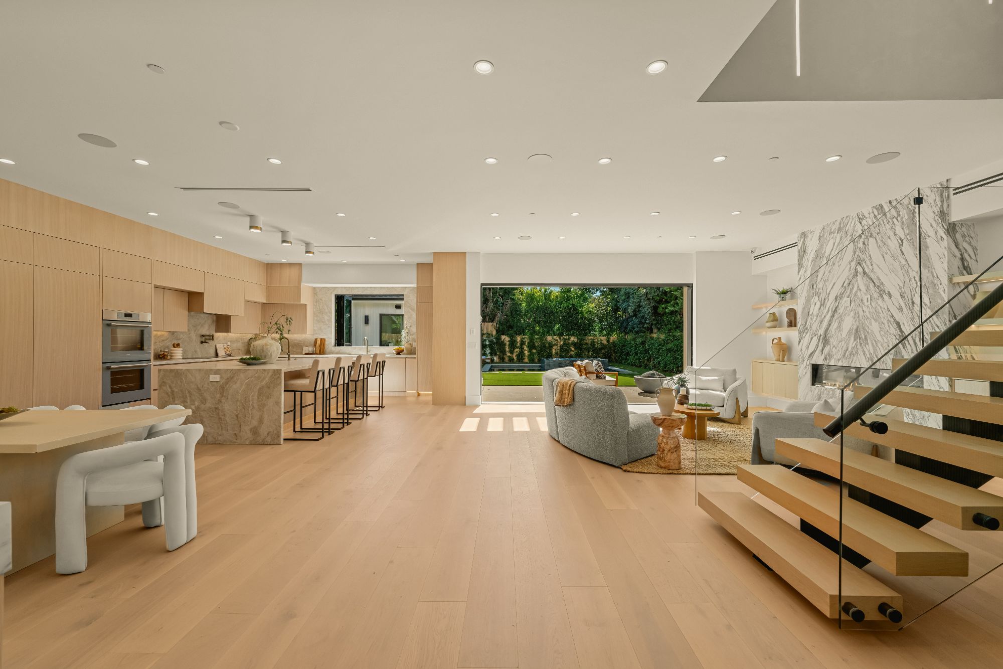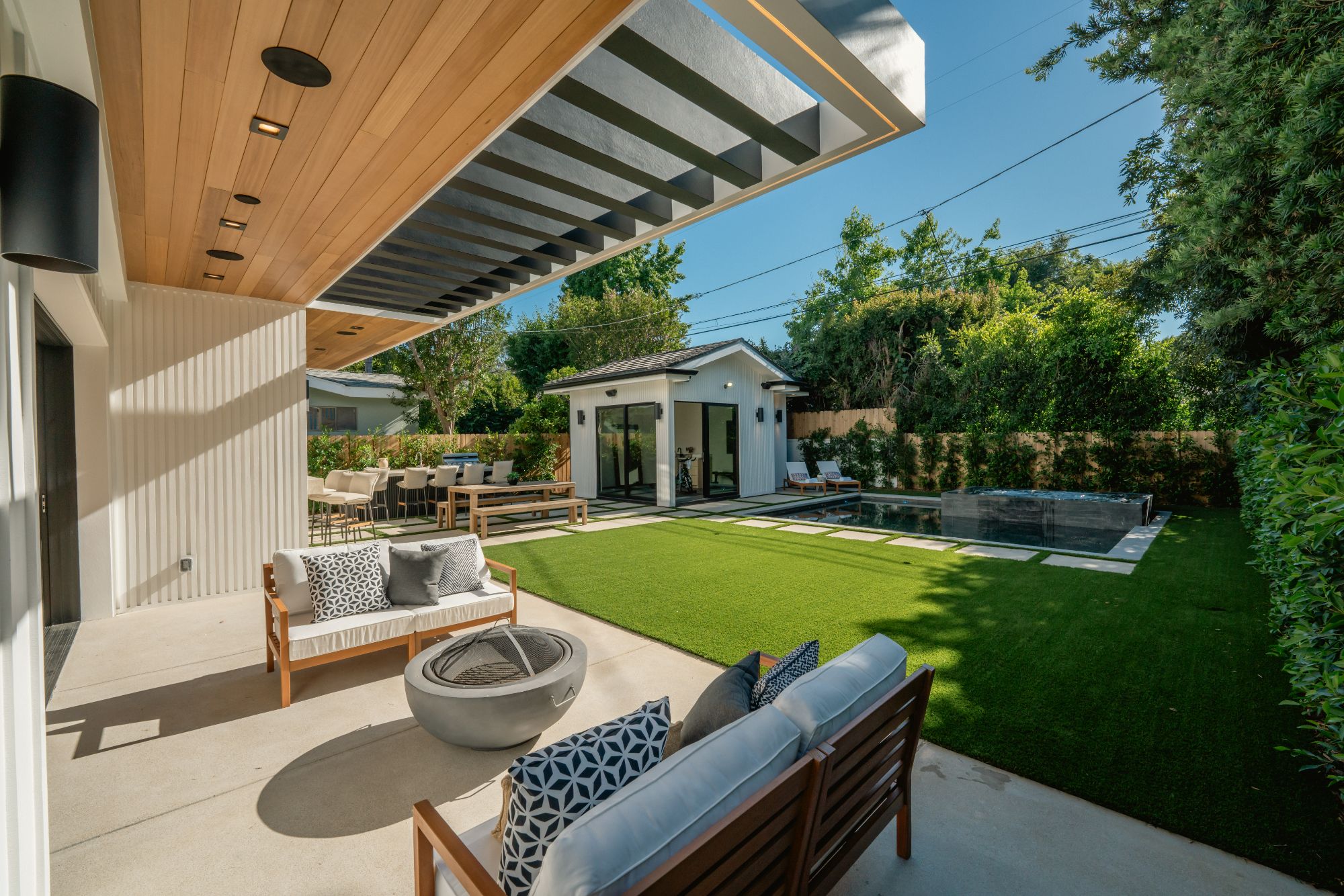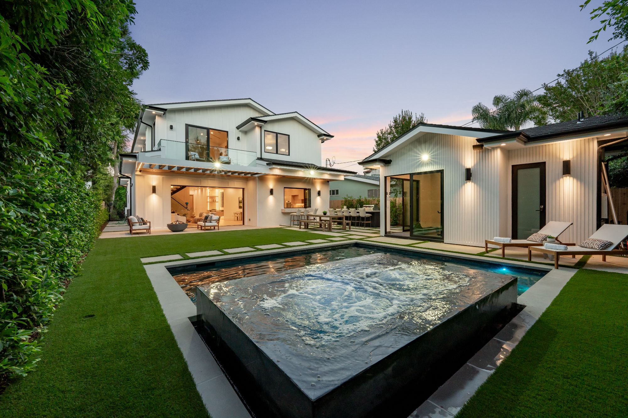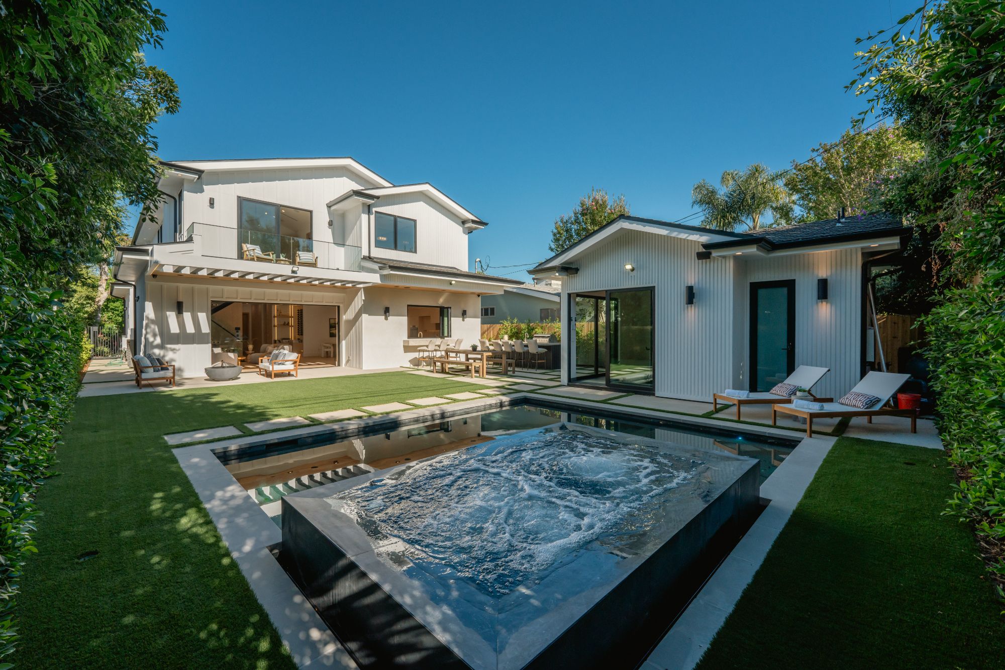 Welcome to your dream modern farmhouse in Colfax Meadows, nestled on a tranquil cul-de-sac in a coveted neighborhood. This stunning gated new construction exudes elegance and charm from the moment you step inside. The warmth of white oak floors welcomes you, seamlessly blending sophistication and comfort throughout the entire home. This home offers five spacious bedrooms and five and a half luxurious bathrooms, providing ample space for relaxation and entertainment. Fully equipped with the Elian smart home system, it ensures modern convenience. The chef's kitchen is a culinary enthusiast's dream, featuring premium appliances, stunning hardwood floors, and a service window bar for easy indoor-outdoor dining. The expansive layout includes a main house and a pool house, totaling approximately 3,800 square feet, perfect for hosting gatherings and creating unforgettable memories. The open floor plan seamlessly connects living areas, creating a fluid and inviting atmosphere. Large windows flood the space with natural light, enhancing its vibrant ambiance. The gourmet kitchen, the heart of the home, offers a haven for culinary delights with top-of-the-line appliances and ample counter space. Outside, a sparkling pool and versatile spa (cold plunge or hot spa) invite you to unwind under the sun. The BBQ area is perfect for outdoor entertaining, with an effortless indoor-outdoor transition to the covered backyard patio. Both the house and cabana are equipped with solar panels, emphasizing sustainability and efficiency, and the cabana includes a full bath, adding convenience and luxury. Thoughtfully designed backyard gardens enhance the beauty and tranquility of the outdoor space. The primary suite, located on the top floor, offers a private sanctuary with an en-suite bathroom featuring double sinks, a luxurious soaking tub, and a refreshing rain shower. A large walk-in closet provides ample storage for your wardrobe. Located within the highly sought-after Carpenter Ave School District, this exceptional new construction property in Studio City represents the pinnacle of modern elegance and is a rare opportunity not to be missed.