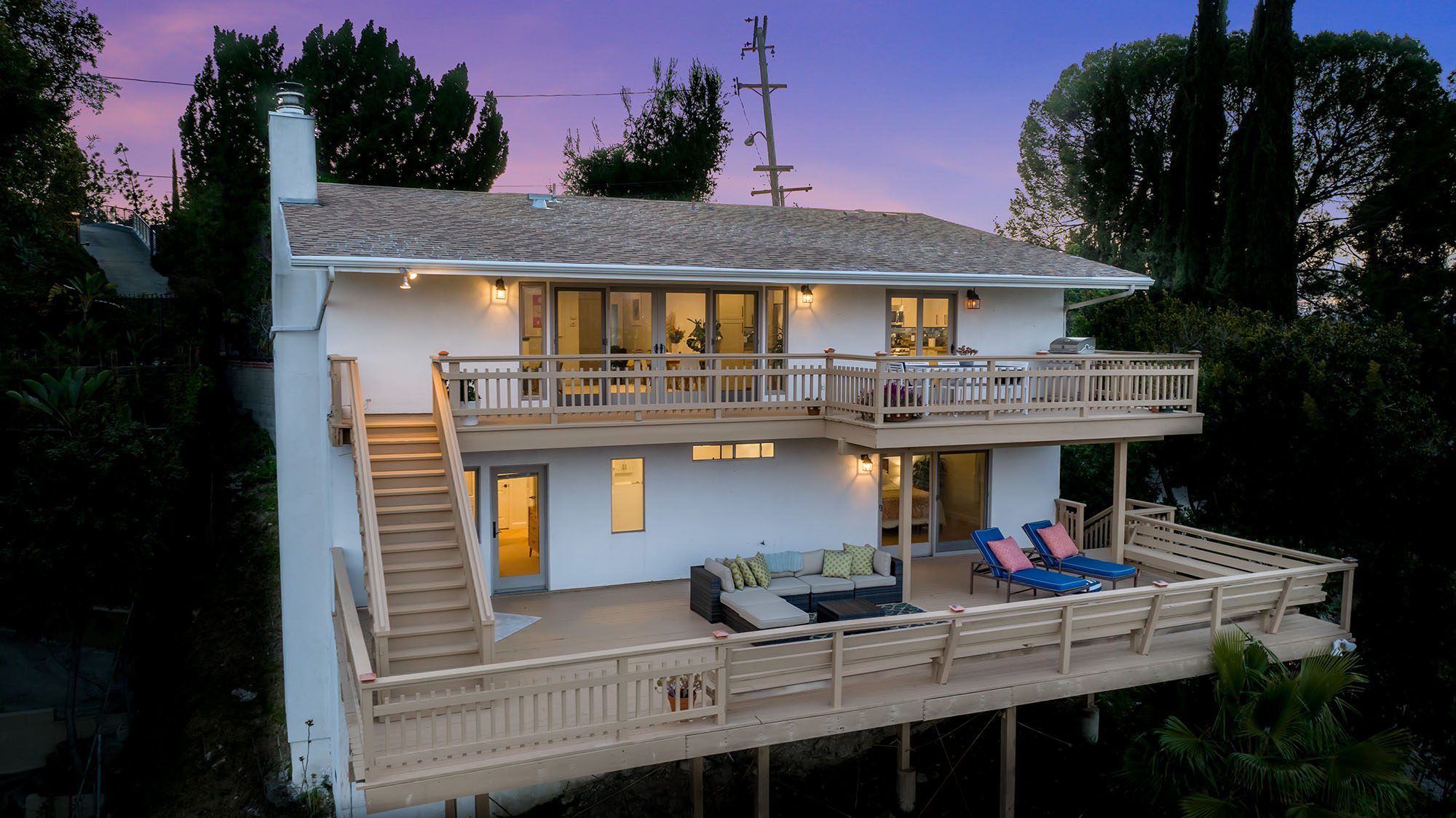 Welcome home to this light filled 4 bedroom, 2 1/2 bath contemporary home with explosive views on a quiet tree-lined street. This perfectly situated open floor-plan is nearly 2,500 sq ft, and the main level includes a beautifully updated kitchen opening to an expansive dining and living room with charming fireplace flowing into a large deck spanning the width of the home, perfect for entertaining while taking in the incredible views from every angle. Also included on the main level is one spacious bedroom and powder room. On the lower level, there is an elegant primary suite with an inviting ensuite bath and large walk-in-closet. This level has more breathtaking views with a second generous deck as well and two more spacious bedrooms and a second full bathroom. Other features of the home are updated bathrooms, electrical & plumbing, earthquake retrofitting, dual HVAC climate zones, tremendous closet and storage space and a fenced yard perfect for pets. Located in the lower portion of the coveted Sherman Oaks hills, this home is conveniently located just a short distance to Ventura Blvd and all of the local schools & recreation areas.