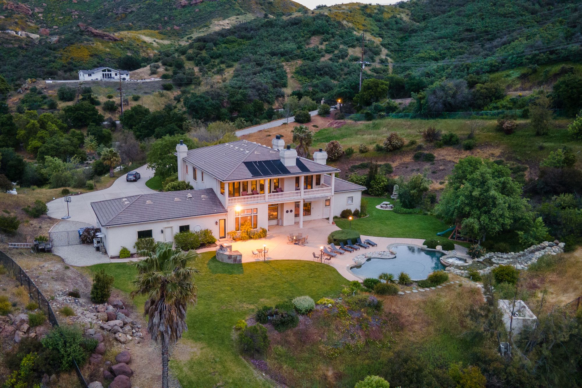 Tucked away in the serene hills of Malibu's breathtaking canyons, stands as one of California's most distinguished and private residential estates. This gated compound offers unmatched seclusion amid beautifully landscaped grounds and showcases unobstructed panoramic views of Boney Ridge, Sandstone Peak. Spanning approximately 11 acres, the 6,734 sq. ft. residence features 6 bedrooms and 7 bathrooms, blending refined luxury with timeless architecture. A grand portico entry welcomes you into a dramatic great room and soaring 24-foot ceilings, setting the tone for the home's elegant scale. High-end finishes are found throughout, including an expansive primary suite with a private sauna, a resort-style pool and spa with cascading waterfall, and a three-car garage designed to accommodate a boat or RV. With ample space to add an ADU, this property offers endless possibilities for those seeking privacy, sophistication, and natural beauty in Malibu's most scenic setting.