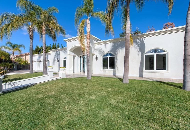 Elegant resort style one story Contemporary Mediterranean located near the end of a quiet cul-de-sac. This recently remodeled estate has an open floor plan featuring 4 bedrooms and 7 bathrooms. Formal entry and high ceilings with marble and hardwood floors throughout. Cozy living room with fireplace, study/library, and grand dining room/den with fireplace opening to backyard. Gourmet chefs kitchen with center island, multiple Viking and SubZero appliances, and breakfast area. Master bedroom with walk-in closet and spa like bathroom. All bedrooms are en-suite. Enormous lower level home theatre and game room. Large backyard ideal for entertaining including an outdoor kitchen, swimming pool with spa, sport court, grassy area, and sauna. 3 car garage with built-ins and additional parking. Scenic treetop/mountain views. Luxurious living on this primarily flat, gated lot in the hills of Encino.