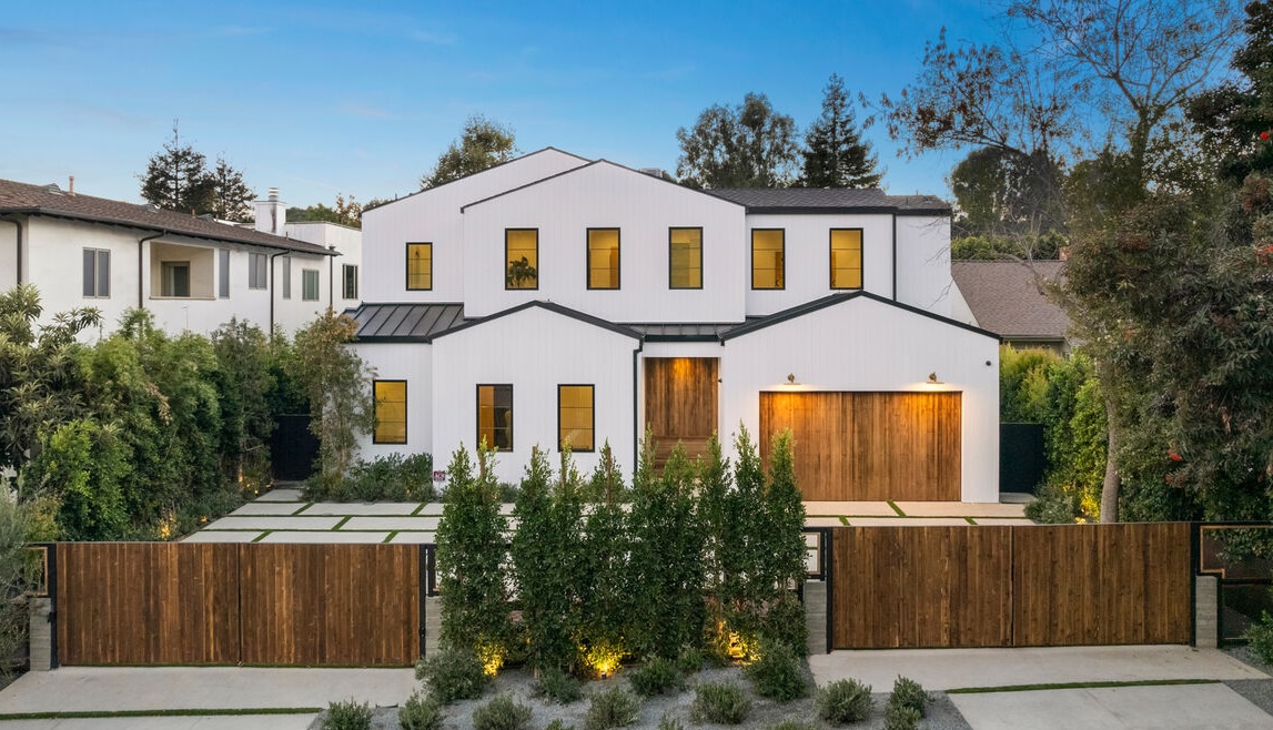 Ideally situated in the acclaimed Brentwood neighborhood, this newly constructed 6 bedroom and 7 bathroom designer residence features a contemporary take on the modern farmhouse. High-end elements from architectural designer Jae Omar and architect Eran Gispan are seamlessly woven throughout to generate a luxurious feel with a comfortable aire, including live edge surfaces, seamless cabinetry, statement bathrooms, and a thoughtful balance of natural materials. A flexible open layout blends the living and dining areas, alongside a gourmet kitchen, highlighted by dual islands, custom cabinetry, chef-grade appliances, and elegant stone surfaces. Upstairs, a remarkable primary suite encompasses a spa-grade bathroom, floor to ceiling marble fireplace, custom oversized walk-in closet, and a private balcony. Just outside, a mix of smart hardscaping and intricate landscaping composes a rear oasis, complete with outdoor kitchen and spacious pool with attached spa. The secondary bedrooms and bathrooms are situated across the 7,420 square foot residence and are laid out for both functionality and privacy. Adding to the residence is a home theater, attached garage with electric vehicle charging, dedicated laundry room, smart home technology, top-grade heating and cooling systems, and an ideal location.