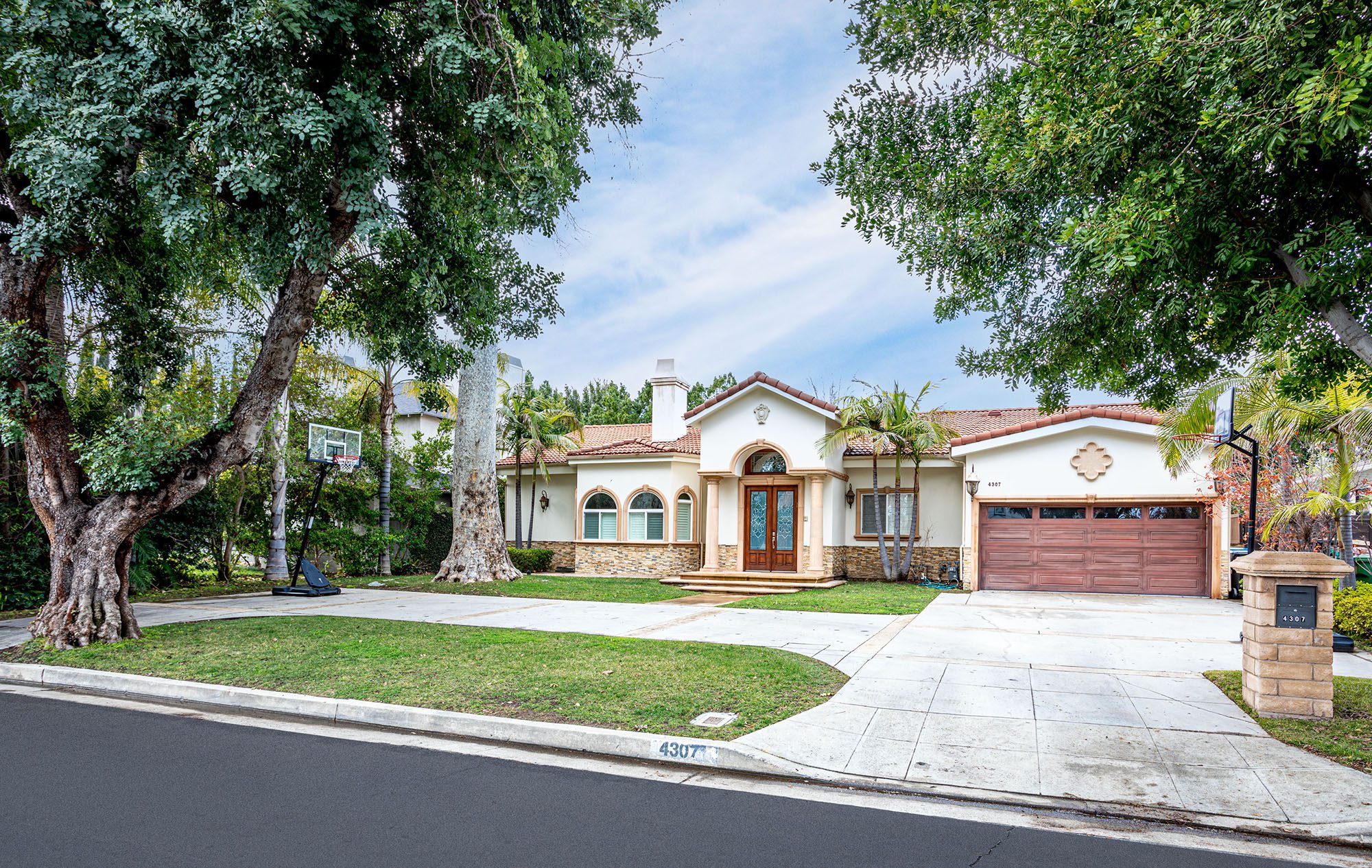 Experience luxury living in this stunning Mediterranean contemporary home located in the sought-after Colfax Meadows neighborhood of Studio City. This single-story home boasts Brazilian cherry wood flooring and 10-ft ceilings, creating a warm and inviting atmosphere in the living room which is centered around a French colonial-style fireplace. The kitchen is a chef's dream, with cherry wood cabinetry, granite countertops, and top-of-the-line Viking stainless steel appliances. The primary bedroom is spacious, featuring a custom walk-in closet and an en-suite bathroom with a spa-style tub. French doors lead from the bedroom to the expansive backyard, perfect for entertaining with its pool, built-in BBQ, and California basement which has been converted to a climate controlled wine cellar all on an 11,250 sqft lot.