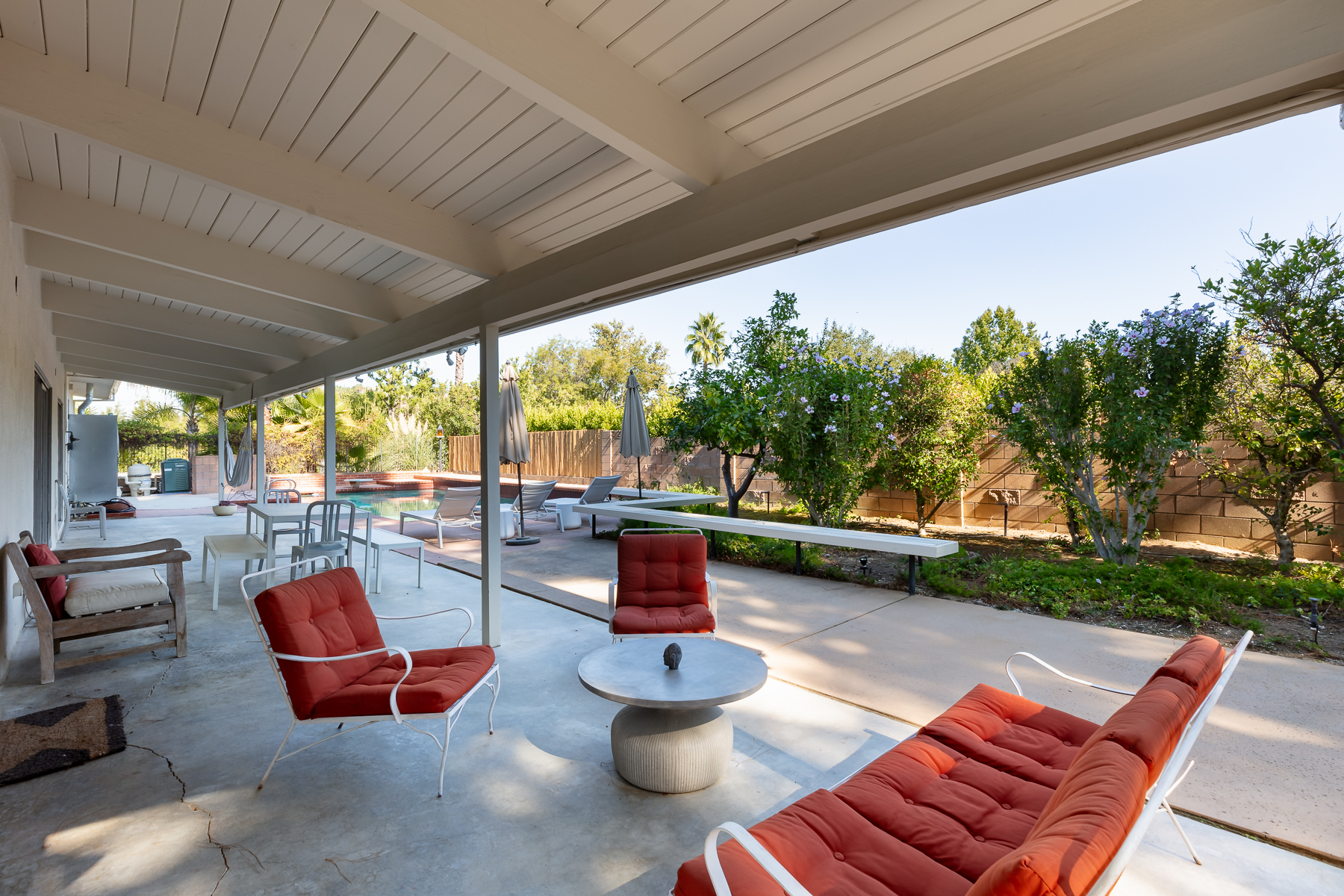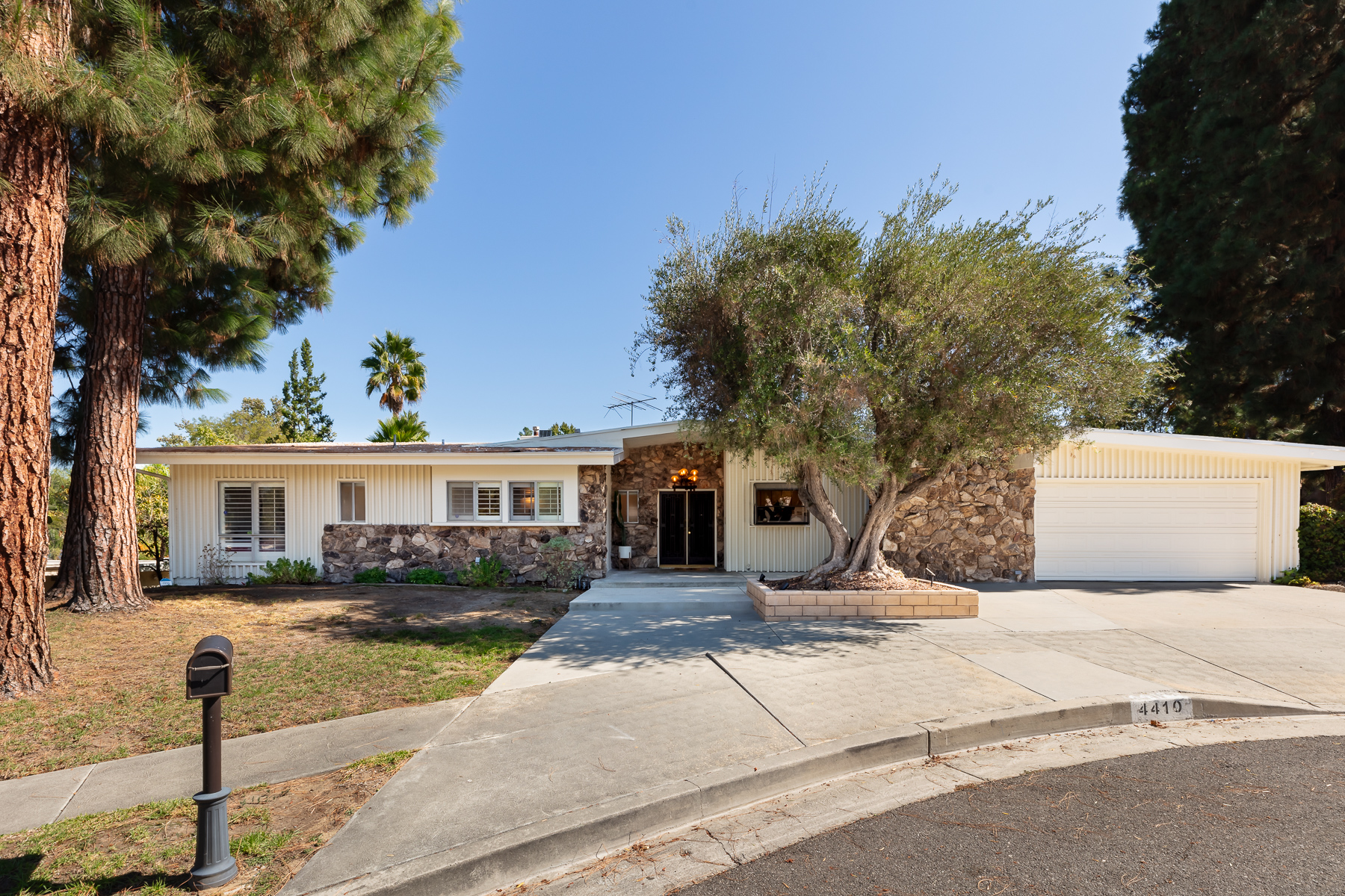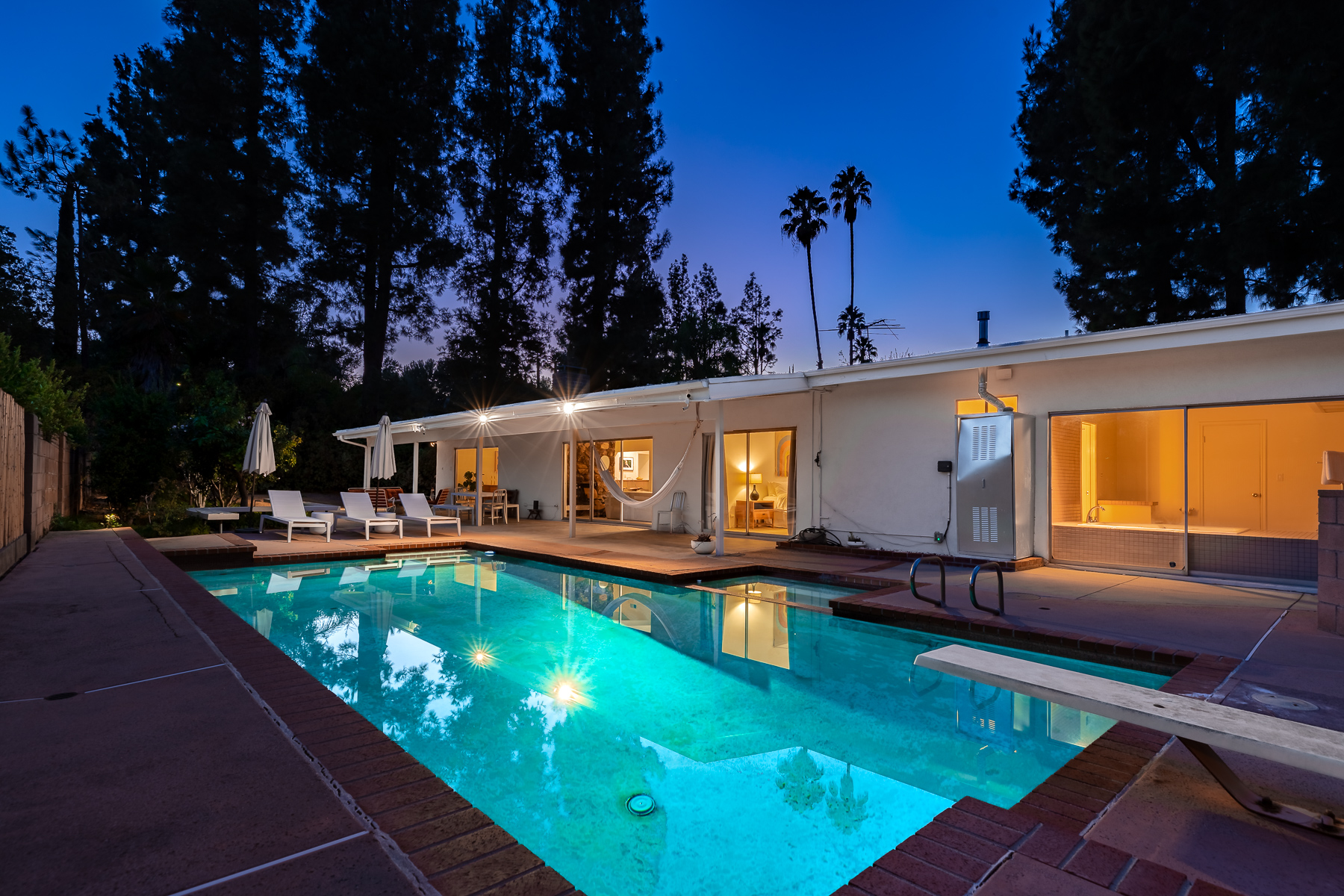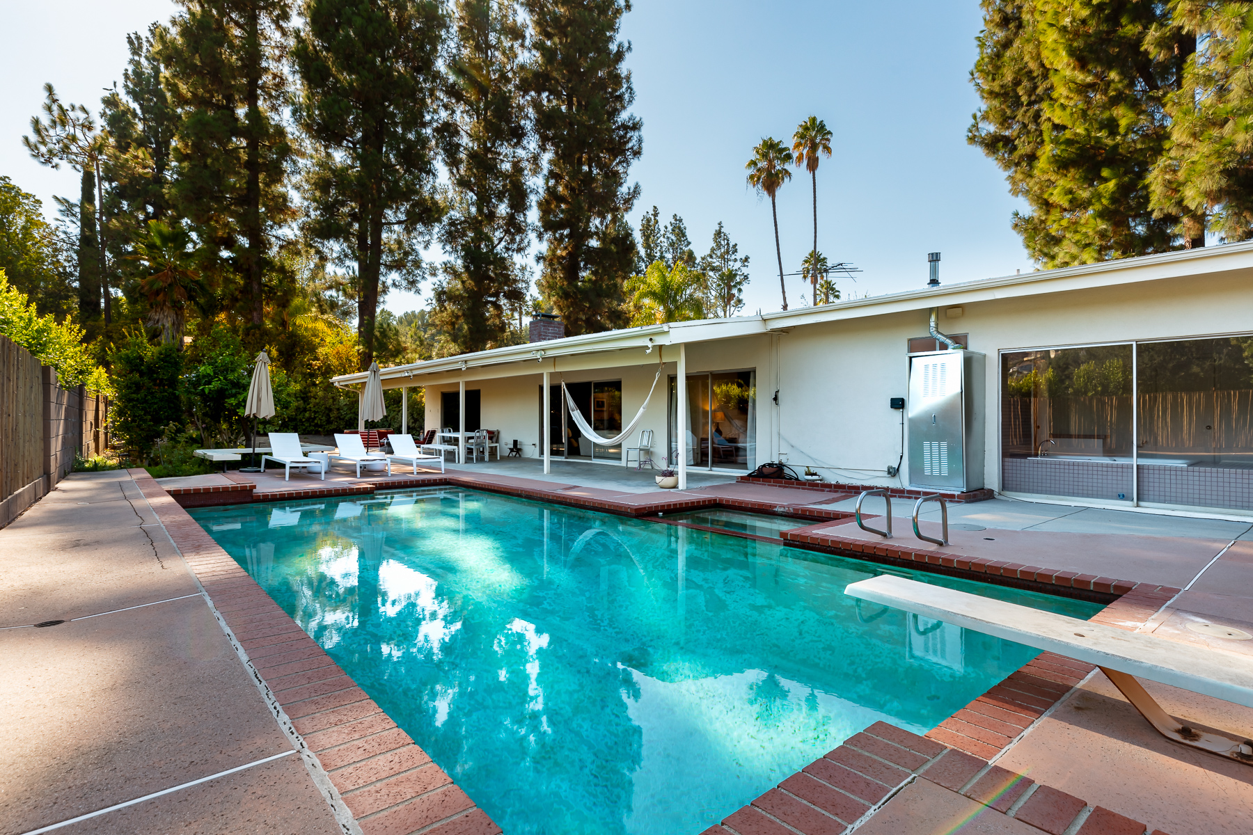 Welcome to this charming mid-century ranch home situated on a serene cul-de-sac south of the Boulevard in Tarzana. Crafted by famed architect Charles DuBouis, this residence boasts four bedrooms, three bathrooms, and a stunning pool and spa in the backyard. Towering mature trees welcome you to this timeless mid-century masterpiece. Upon entering, you will be greeted by an inviting open-concept living space highlighted by a beautiful stone double-sided fireplace that opens to the living and dining rooms. The home's classic and iconic mid-century architecture is showcased throughout, with vaulted ceilings, clean architectural lines, and large windows coming together to create an airy and bright living space to be enamored by all. The primary suite offers a spacious bedroom space with his and her walk-in closets and an additional dressing area. The primary suite bathroom is filled with an abundance of natural light and features a luxurious tub perfectly positioned to enjoy scenic views out the large format window. The home also hosts three additional generously sized guest bedrooms. Large sliding glass windows frame the vibrant beauty of the backyard. The backyard area provides the perfect space for entertaining, boasting a large pool and spa, a covered patio space, multiple dining areas, and a spacious, lush yard with mature trees offering both shade and privacy. The home is conveniently located in close proximity to a bountiful amount of dining and shopping options, three private country clubs, and multiple tranquil hiking/biking trails. Discover the limitless possibilities of this iconic mid-century residence.f