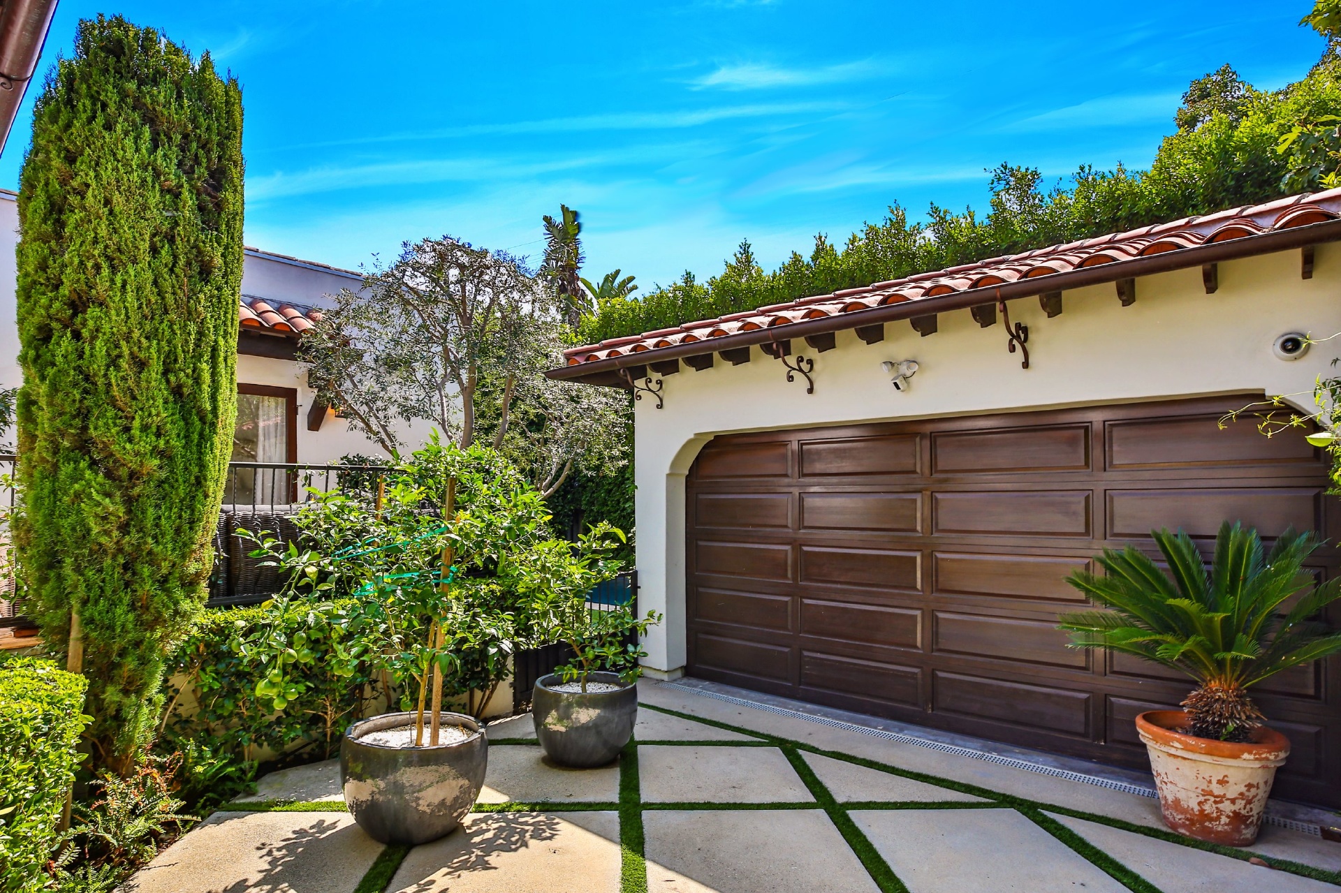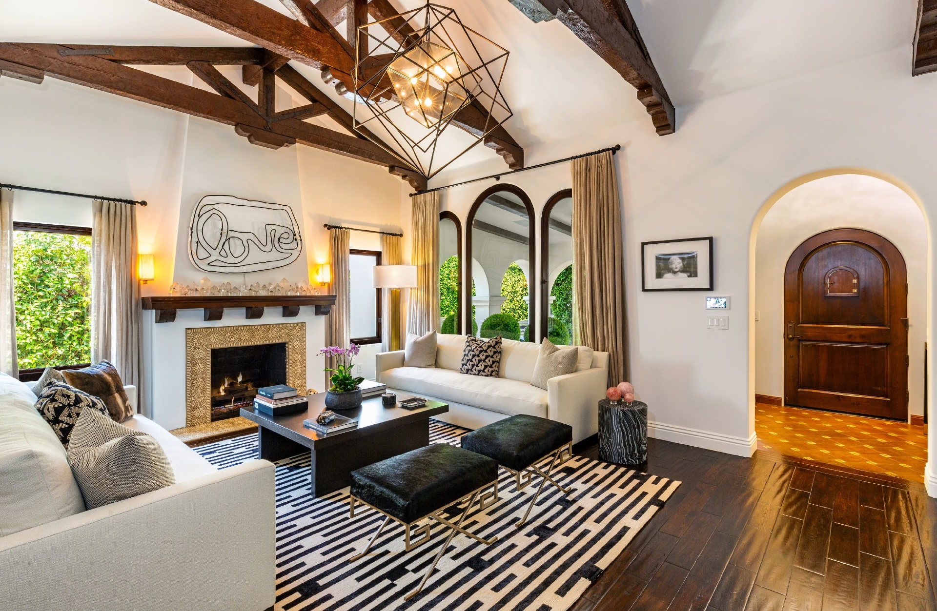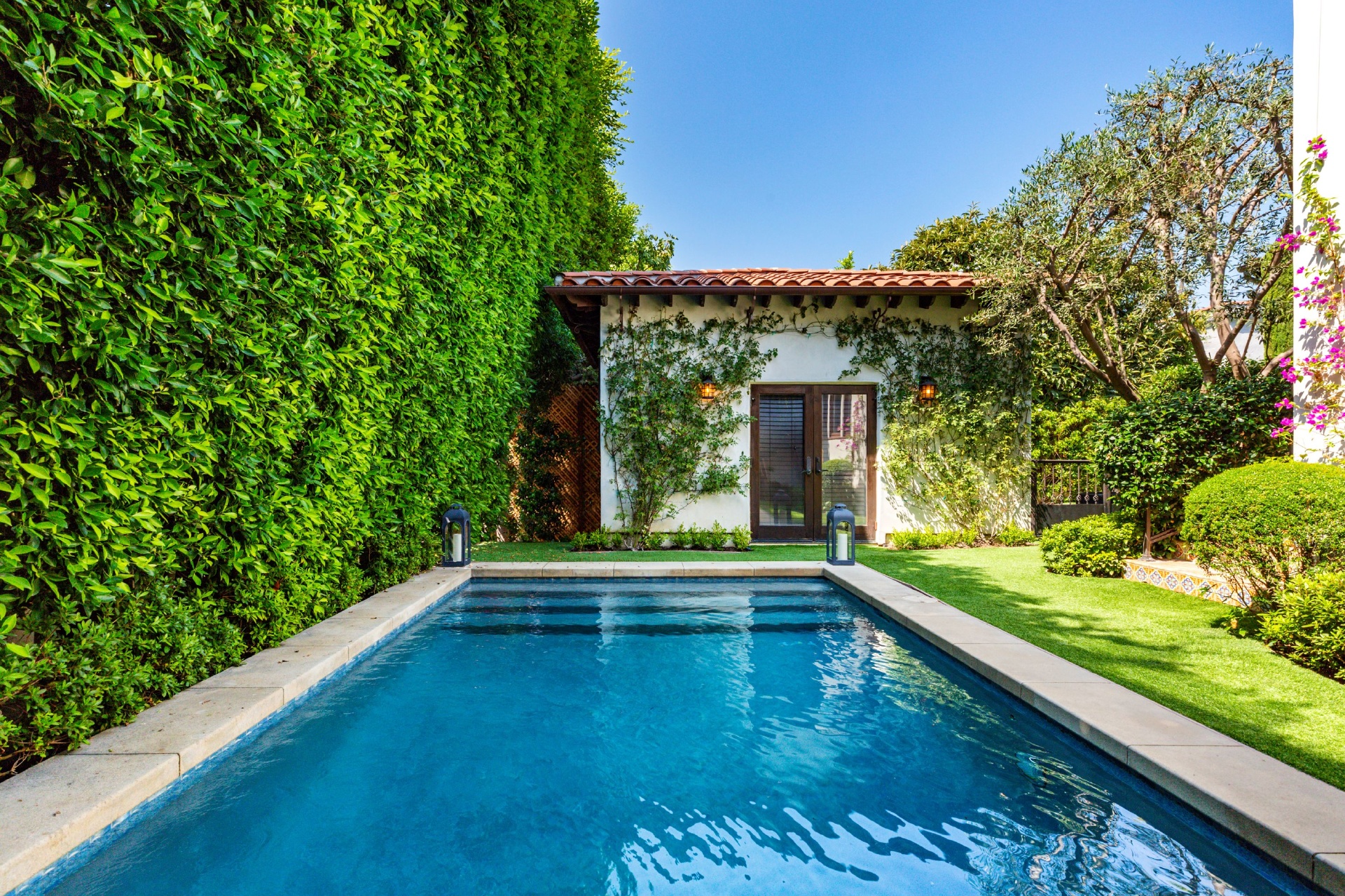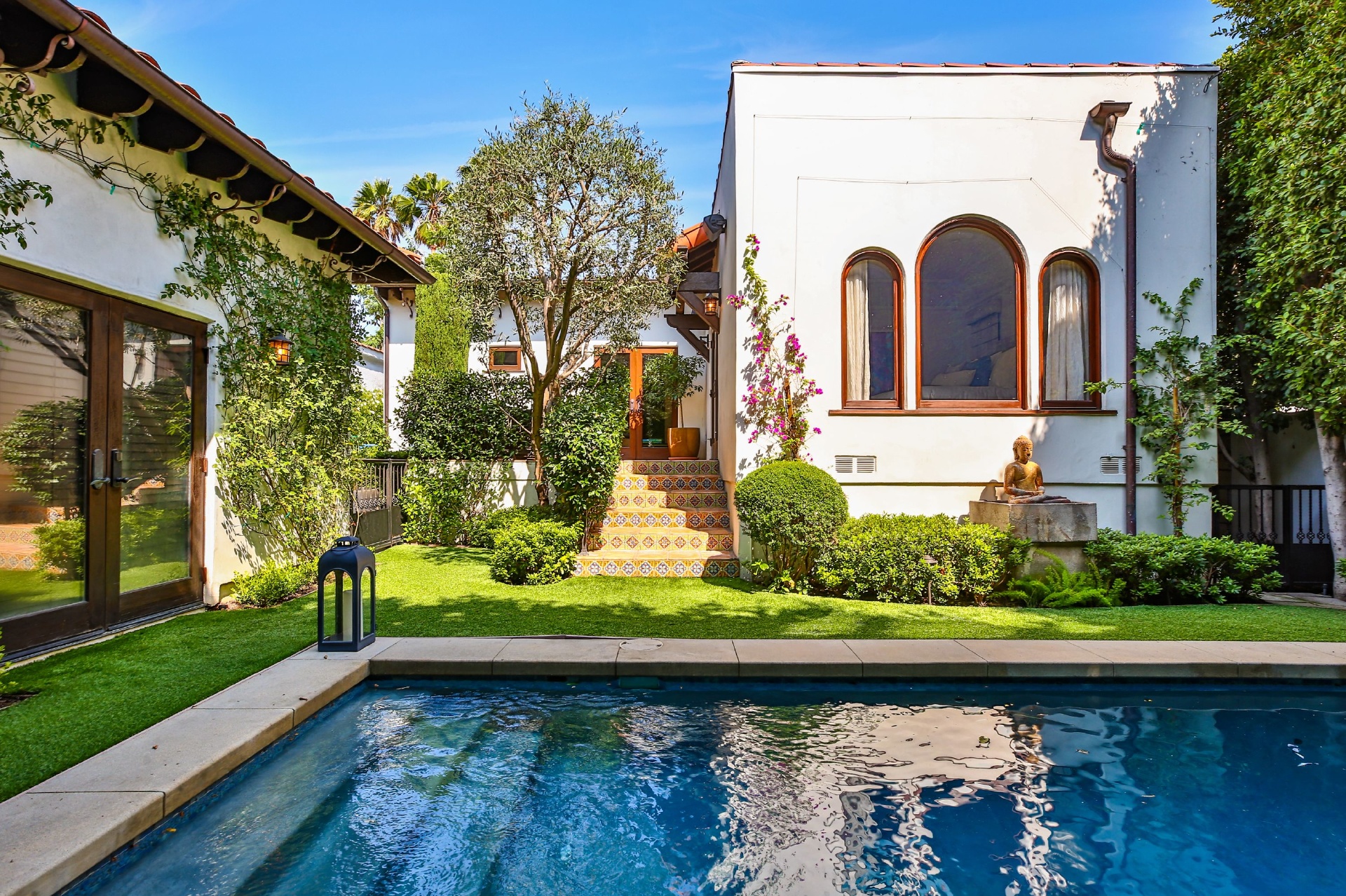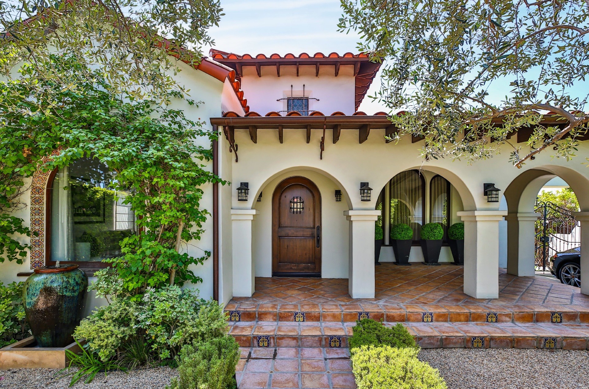 This strikingly beautiful Spanish villa is situated in one of the most coveted neighborhoods in the city, Beverly Grove, only a short walk to the best shopping, dining, and entertainment destinations. In a verdant, hedged setting, every inch of this tranquil, private retreat reflects exceptional taste with timeless details such as classic exposed beams and hand-painted tiles in the bathrooms. Captivating interiors with elegant archways throughout feature a living room with vaulted ceilings anchored by an exquisite fireplace, a gourmet kitchen equipped with Viking appliances and an elegant dining room. Outdoor entertaining oasis stretches from a magnificent, lush front court to a well-landscaped backyard with a raised lounge and an oversized pool. Lavish primary suite provides luxurious comfort with a lounge, a soothing soaking tub and floor-to ceiling wood-framed glass doors opening on to the backyard. Experience this timeless, elegant home with luxurious entertainment features in the heart of it all.