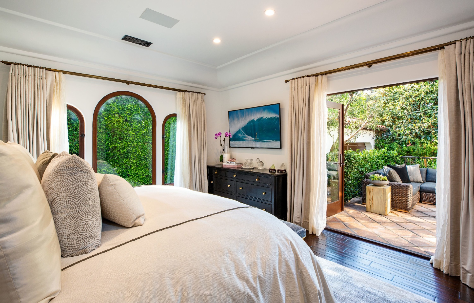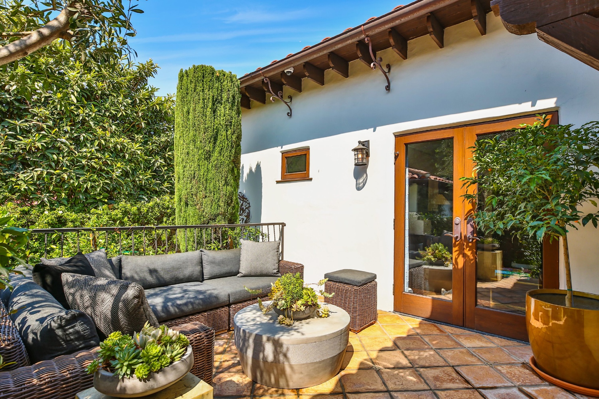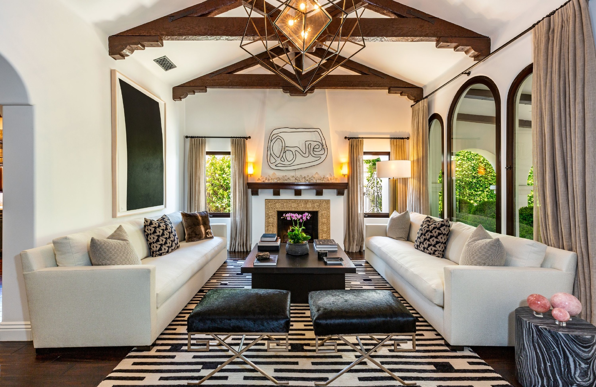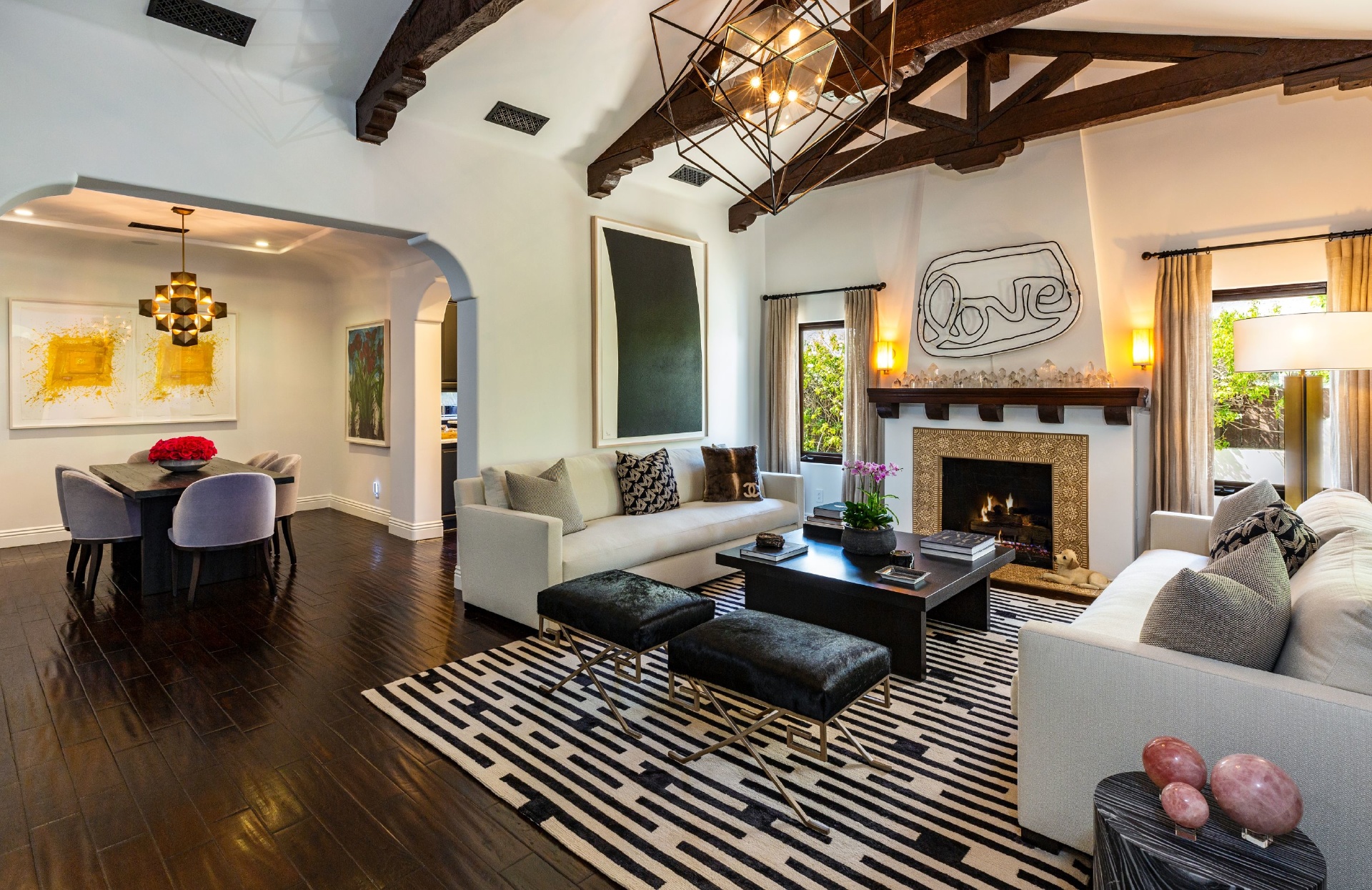 This strikingly beautiful Spanish villa is situated in one of the most coveted neighborhoods in the city, Beverly Grove, only a short walk to the best shopping, dining, and entertainment destinations. In a verdant, hedged setting, every inch of this tranquil, private retreat reflects exceptional taste with timeless details such as classic exposed beams and hand-painted tiles in the bathrooms. Captivating interiors with elegant archways throughout feature a living room with vaulted ceilings anchored by an exquisite fireplace, a gourmet kitchen equipped with Viking appliances and an elegant dining room. Outdoor entertaining oasis stretches from a magnificent, lush front court to a well-landscaped backyard with a raised lounge and an oversized pool. Lavish primary suite provides luxurious comfort with a lounge, a soothing soaking tub and floor-to ceiling wood-framed glass doors opening on to the backyard. Experience this timeless, elegant home with luxurious entertainment features in the heart of it all.