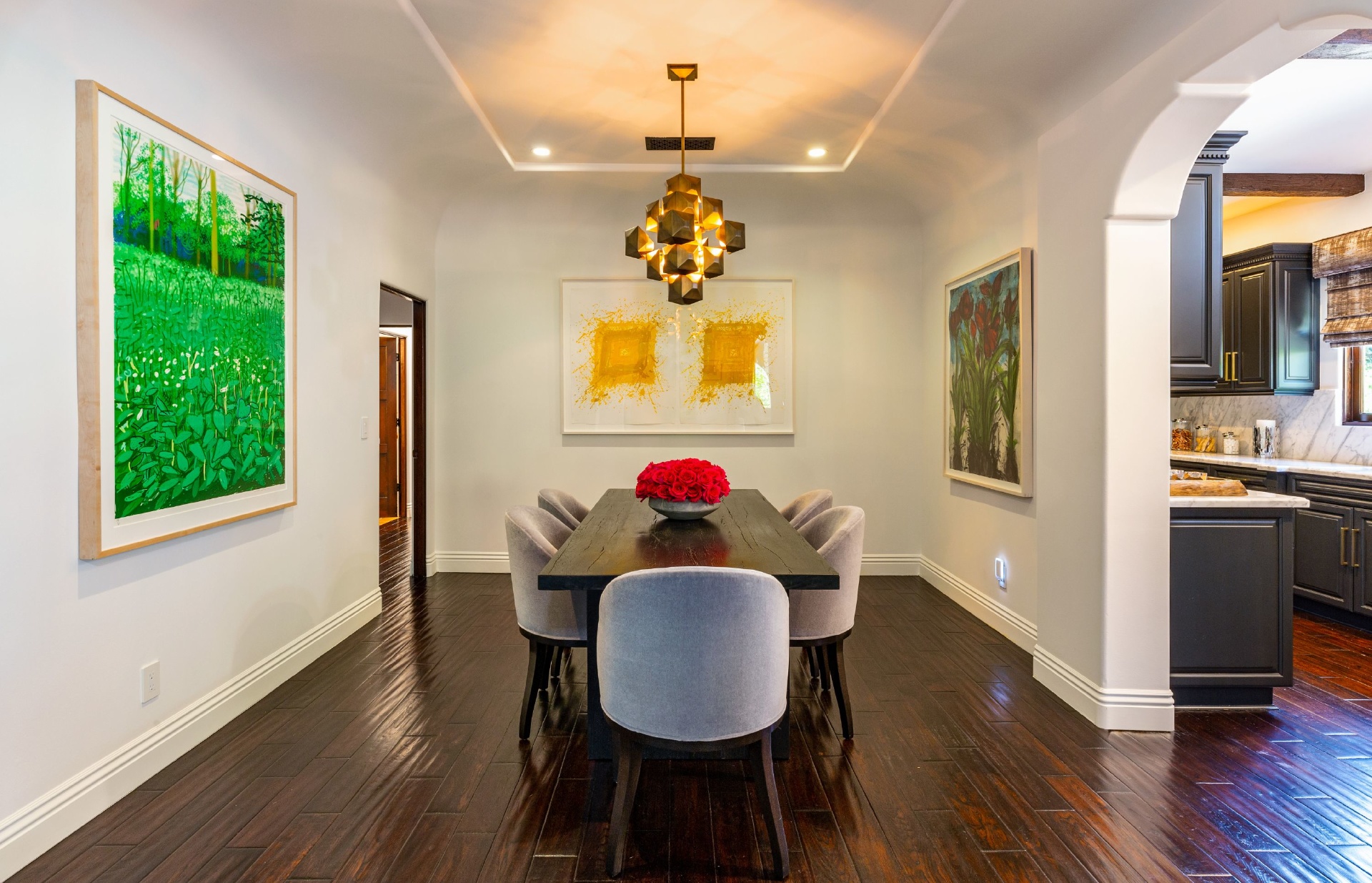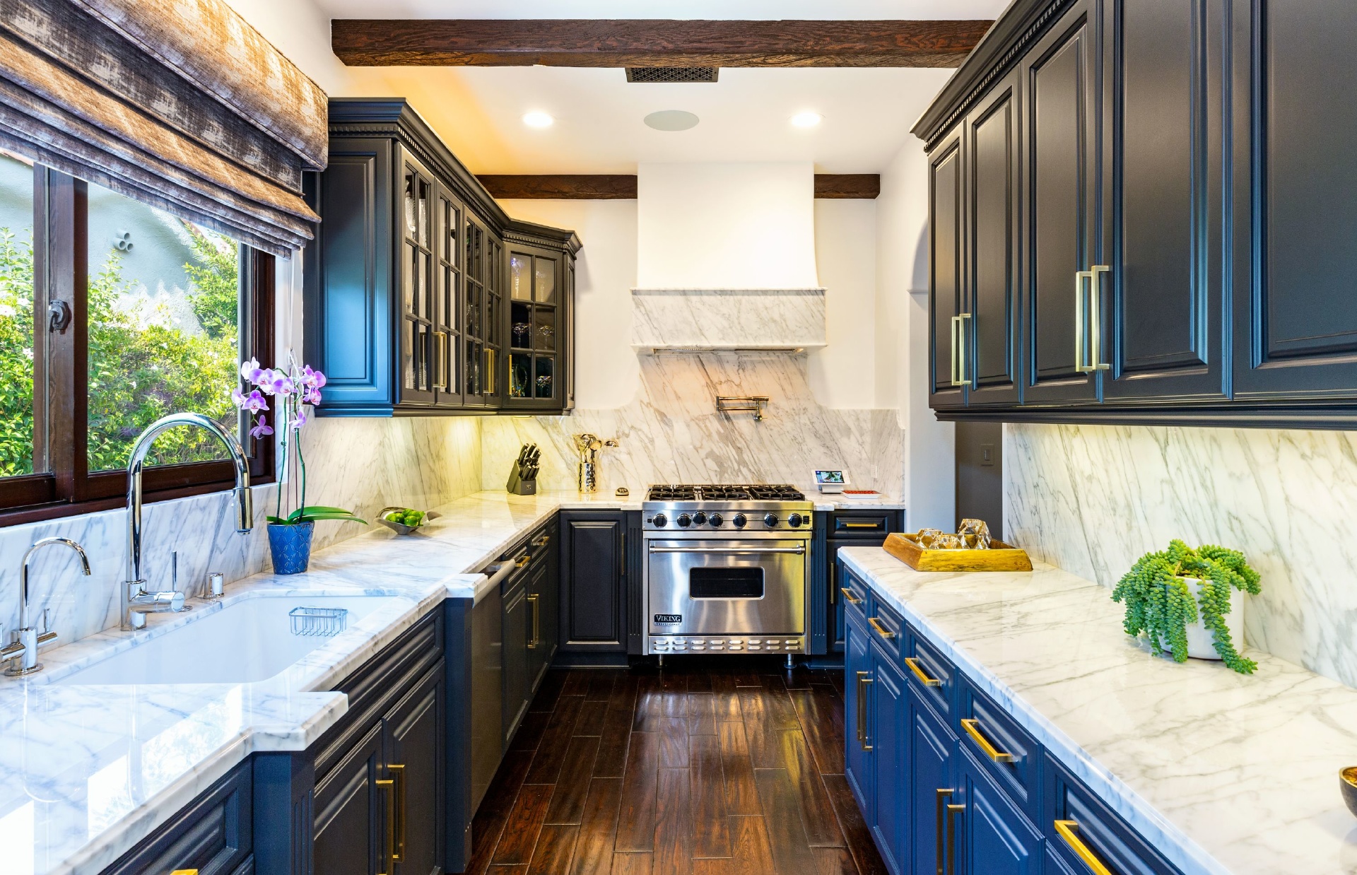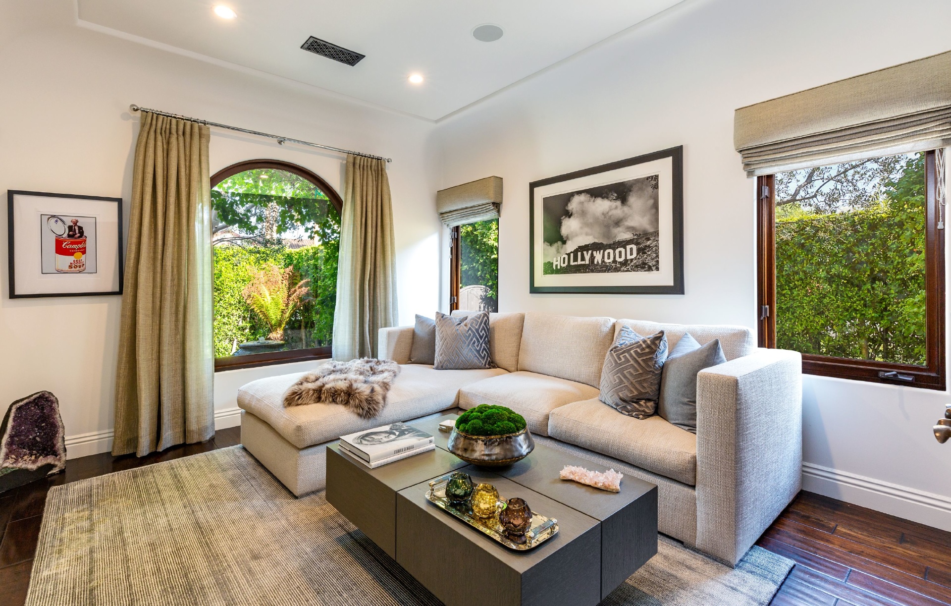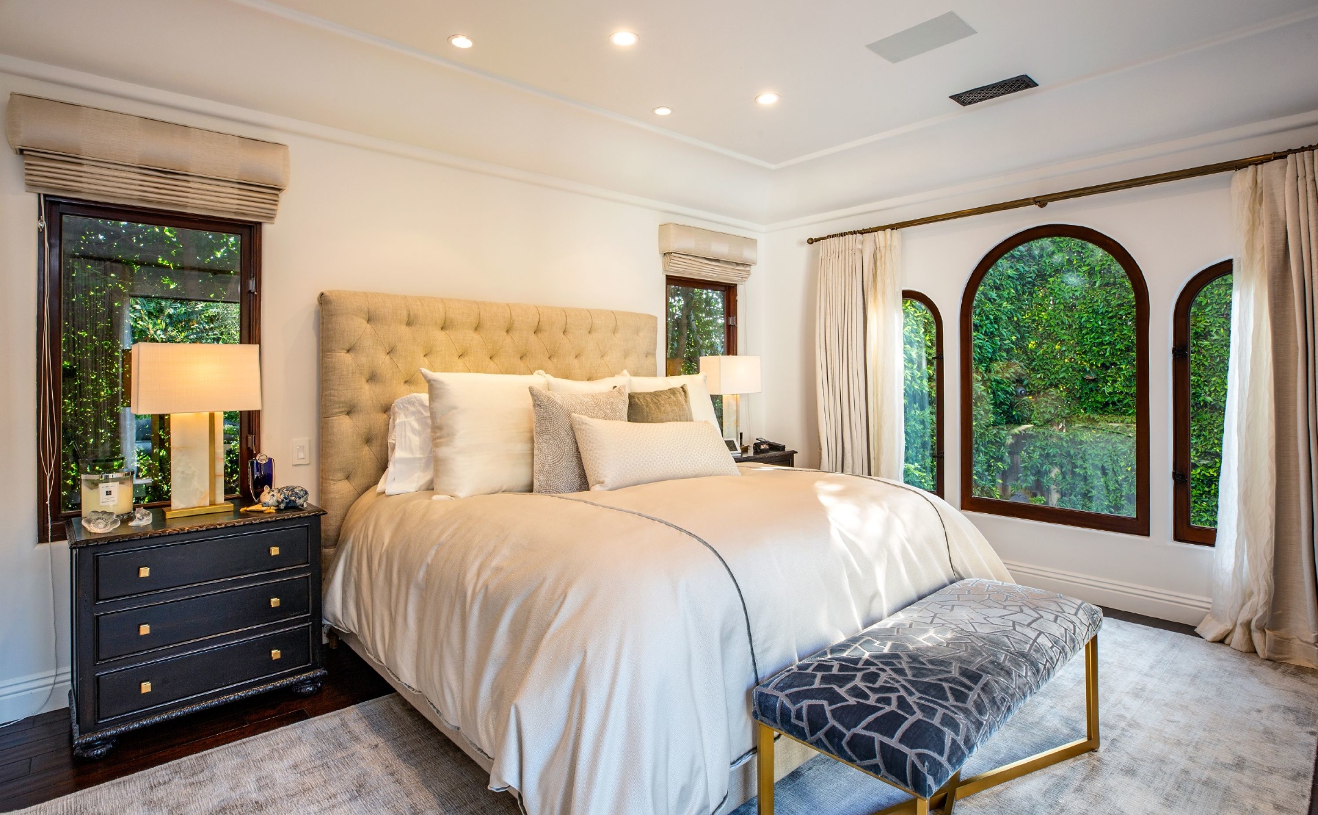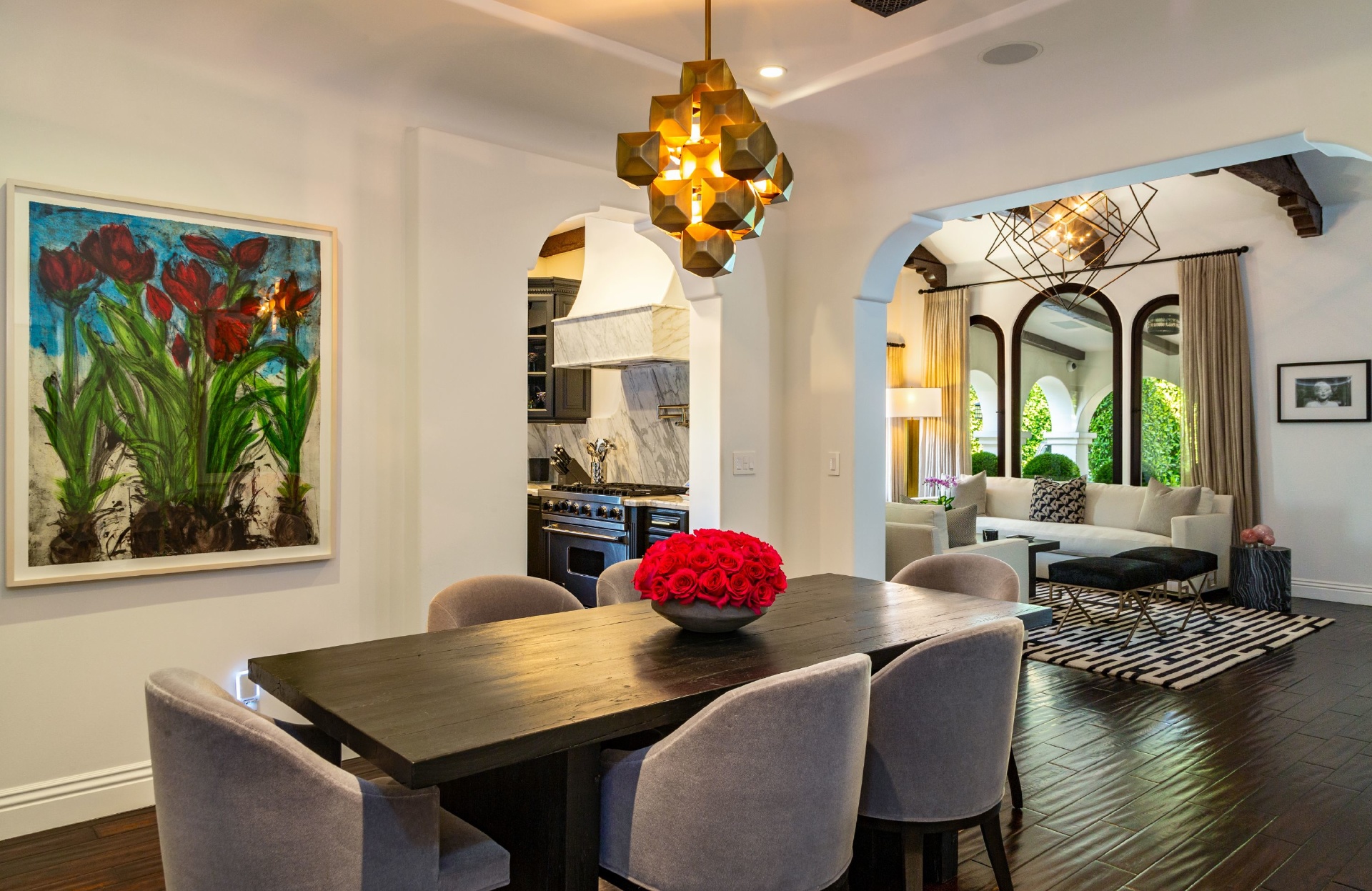 This strikingly beautiful Spanish villa is situated in one of the most coveted neighborhoods in the city, Beverly Grove, only a short walk to the best shopping, dining, and entertainment destinations. In a verdant, hedged setting, every inch of this tranquil, private retreat reflects exceptional taste with timeless details such as classic exposed beams and hand-painted tiles in the bathrooms. Captivating interiors with elegant archways throughout feature a living room with vaulted ceilings anchored by an exquisite fireplace, a gourmet kitchen equipped with Viking appliances and an elegant dining room. Outdoor entertaining oasis stretches from a magnificent, lush front court to a well-landscaped backyard with a raised lounge and an oversized pool. Lavish primary suite provides luxurious comfort with a lounge, a soothing soaking tub and floor-to ceiling wood-framed glass doors opening on to the backyard. Experience this timeless, elegant home with luxurious entertainment features in the heart of it all.