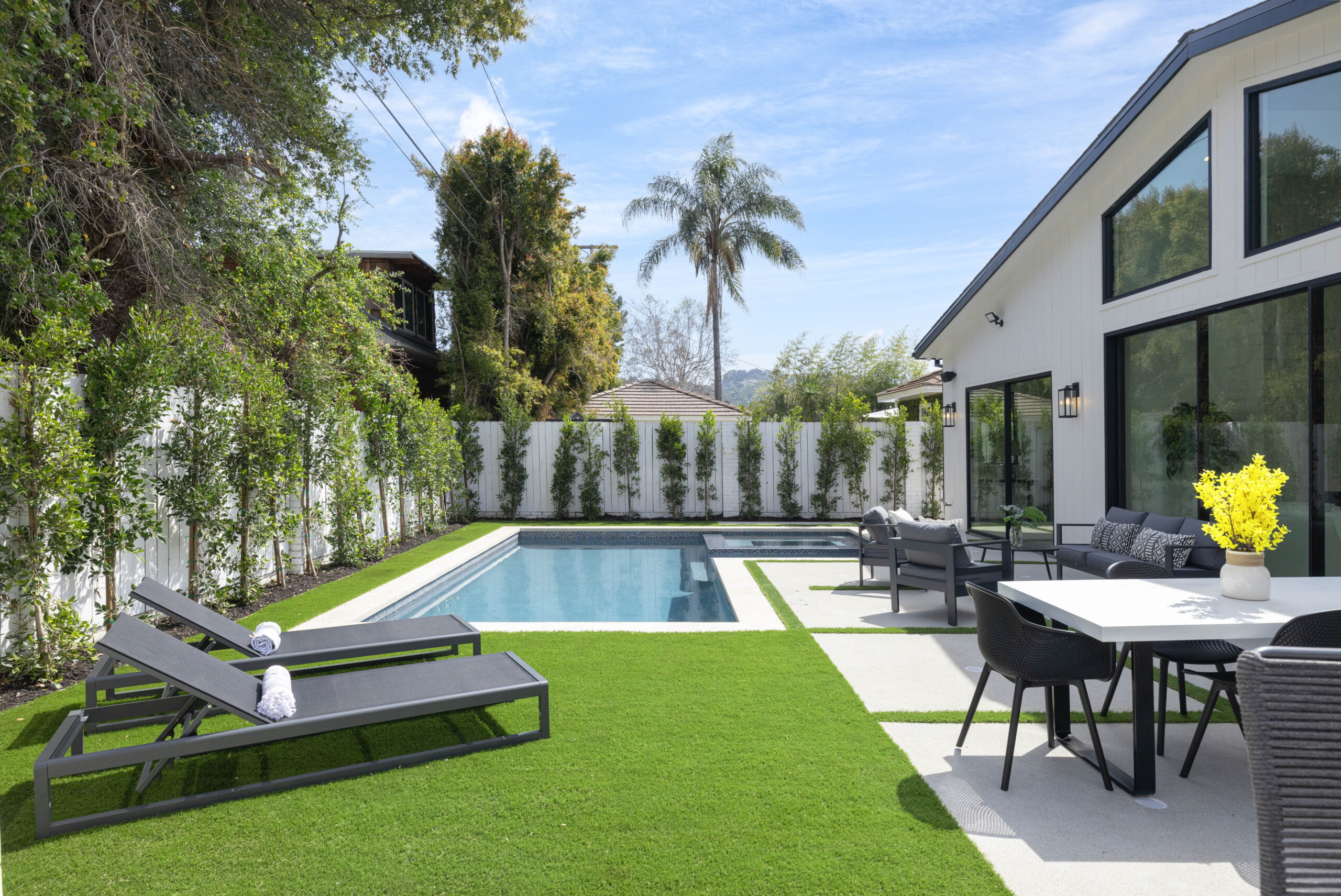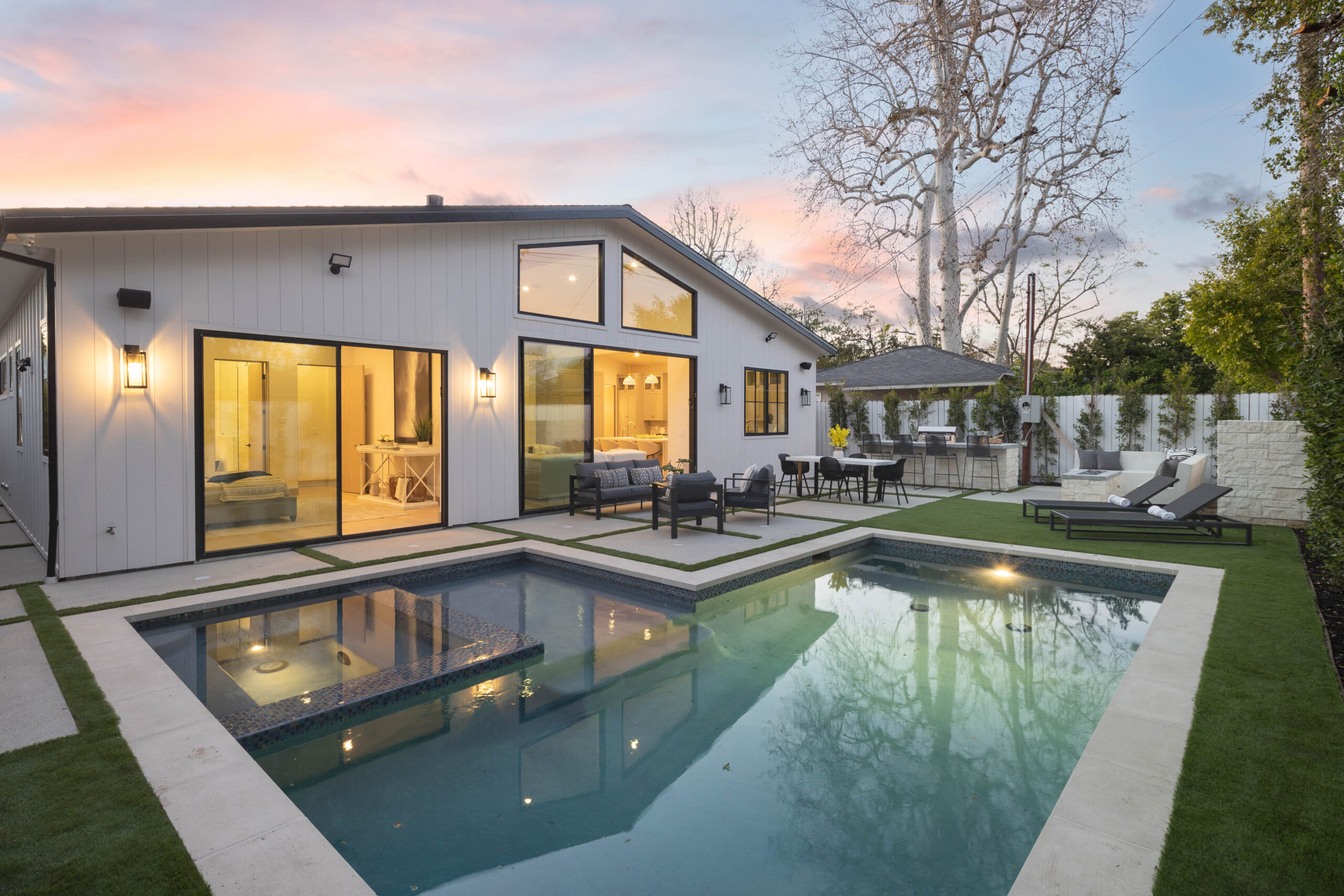 Located moments from Erewhon, Equinox, and the newly reimagined Sportsmen's Lodge, this simple yet sophisticated single-story modern farmhouse offers effortless luxury in the heart of Sherman Oaks. Thoughtfully designed on one level, the home features 4 spacious en-suite bedrooms and 4.5 bathrooms. A dramatic entry foyer anchors the flow, leading to beautifully proportioned living spaces. The gourmet chef's kitchen is a showpiece, appointed with custom quartzite countertops, a generous center island, La Cornue range, and Thermador appliances ideal for both everyday cooking and elevated entertaining. The serene primary suite is a private retreat with a generous wardrobe, spa-inspired bath with a soaking tub, double shower, and refined natural stone finishes. Each additional bedroom is en-suite, highlighted by bespoke plasterwork, artisanal tile, and refined stone details. Designed for California living, the property is secured by a gated front yard and features a resort-style rear yard with a pool, spa, and outdoor kitchen perfect for gatherings with friends and family. Modern amenities include solar panels and a Control4 smart home system for comfort and convenience. An exceptional blend of style, function, and location, this is Sherman Oaks living at its finest.