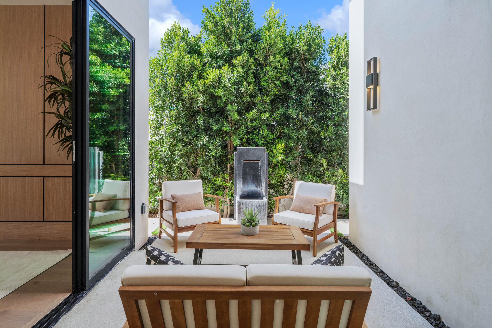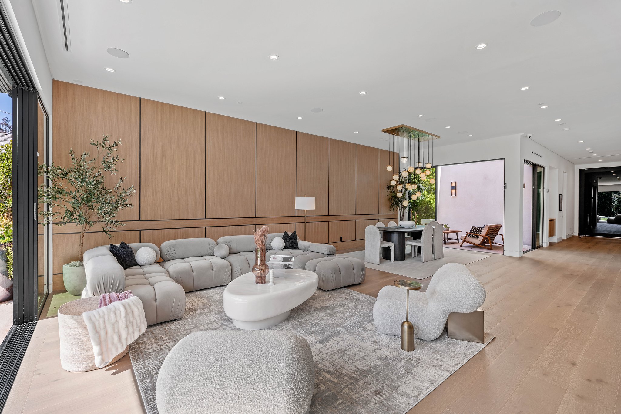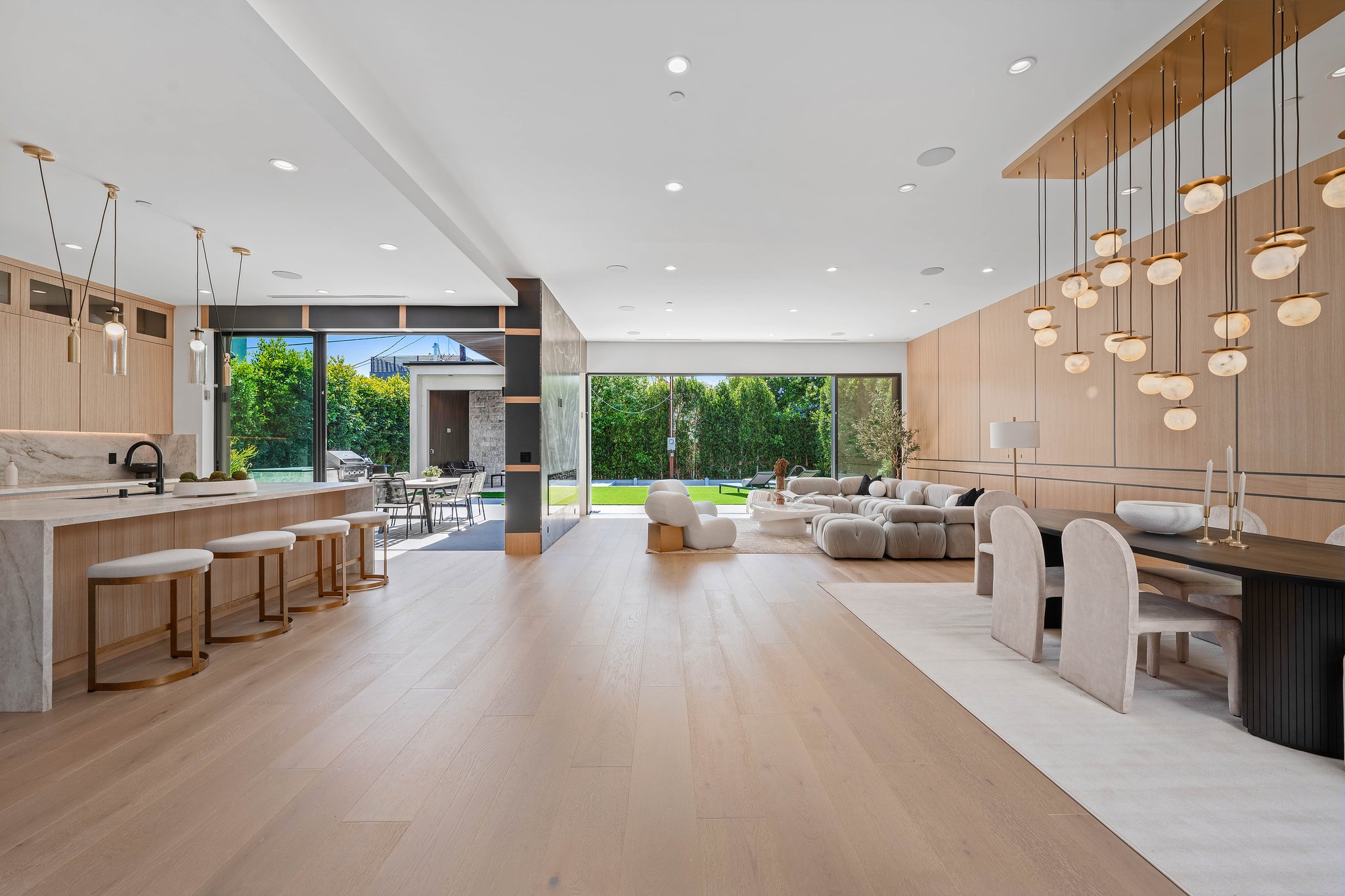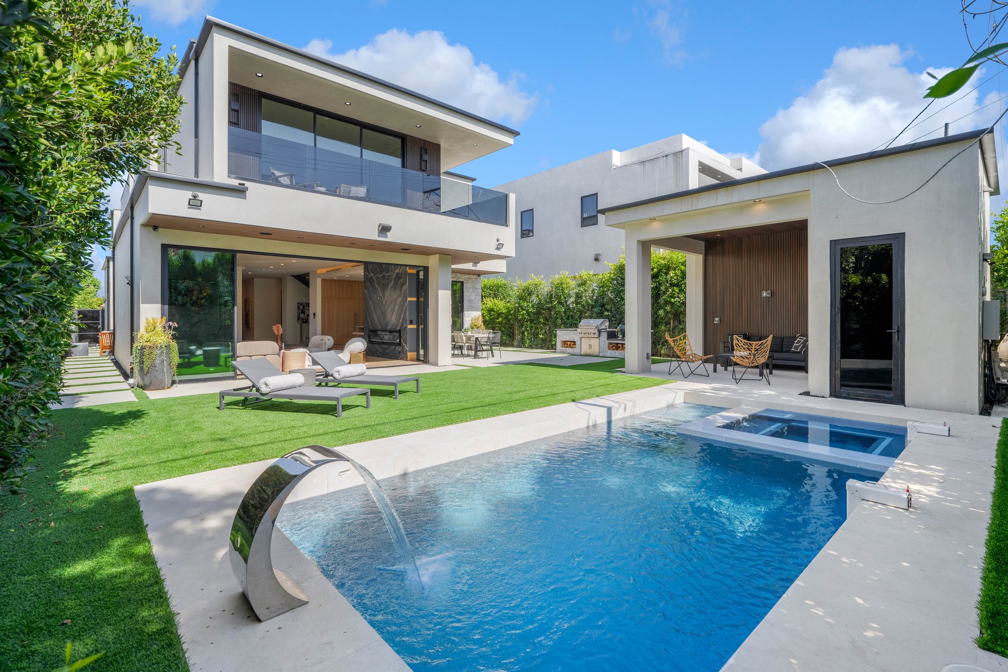 Welcome to this 2024 new construction 2-story, 4 bed/5.5 bath modern smart home, in the heart of Sherman Oaks. This house, built with a designer's eye using top-of-the-line materials, has the perfect layout for entertaining, a growing family, or a couple building a new life. With oak flooring and cabinetry, a marble island, state-of-the-art lighting fixtures, and the finest accessories, this house epitomizes warm, but modern, chic. As you enter - on the main floor is a en-suite bedroom, with oversized windows - perfectly situated for an office or guest bedroom. The well-sized dining area opens with glass sliders to a private courtyard. It leads seamlessly into the large living room, which is framed by a fireplace surrounded by gorgeous stone on the back wall. Opposite the living room is every chef's dream - a large kitchen with stainless steel appliances - side-by-side refrigerator and freezer, microwave, and a built-in stove with exhaust fan. The large marble island offers ample room for cooking, serving, and dining on the opposite side. The top and bottom cabinets surrounding the kitchen provide endless storage.The wall-to-wall/floor-to-ceiling sliding glass doors leads into the backyard of your dreams - a patio with room for lounging and dining, as well as a pool, spa, outdoor chef's kitchen, and cabana with its own bathroom. This yard is perfect for a relaxing day at home, or a barbecue and entertaining. The staircase leading to the upstairs bedrooms is lit by a stunning pendant light - hanging from the second-floor ceiling and providing ample lighting from the first to second floor. Upstairsoffers three en-suite bedrooms and a full-sized laundry room. The primary bedroom has a large bathroom and walk-in closet, as well as a built-in fireplace, and private balcony - perfect for relaxing, meditating, morning coffee, or a nightcap. This house is California indoor-outdoor living at its finest, steps to Ventura Blvd this home is not to be missed!