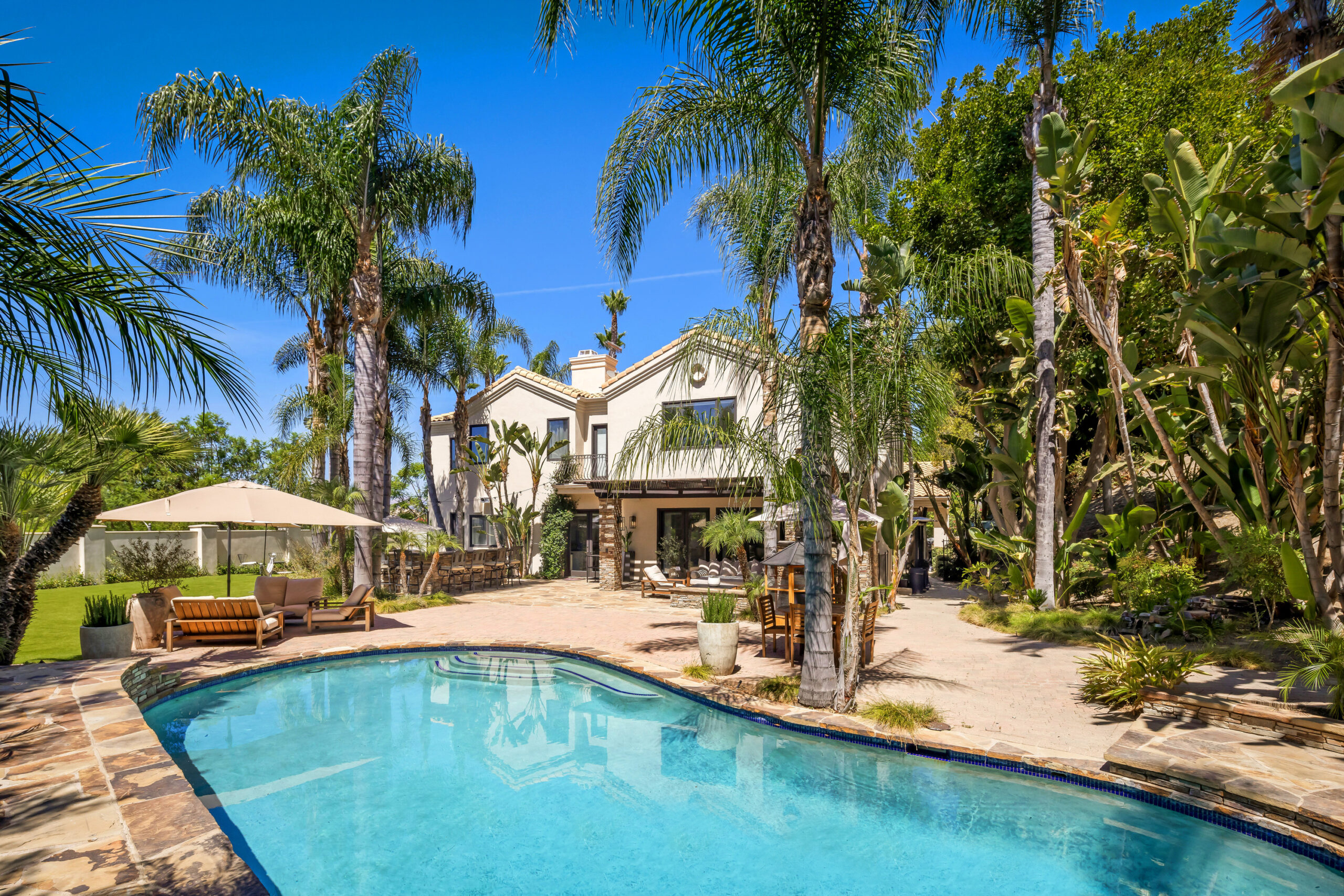 Welcome to an extraordinary estate nestled in the prestigious neighborhood, "The Heights" of Woodland Hills, where classic sophistication meets modern luxury. Set on almost an acre of sprawling, mostly flat land, this remarkable property is the epitome of privacy, elegance, and refined living. This home is perched atop hills, South of Ventura Blvd, offering unparalleled privacy and sweeping views. As you approach the property, a long, private, gated driveway leads you to a grand motor court surrounded by mature, lush landscaping and towering trees, creating a serene and tranquil atmosphere. The double-door entry opens to a breathtaking foyer and atrium, bathed in natural light from oversized windows that frame stunning views from every angle. The soaring ceilings and expansive open spaces create an immediate sense of grandeur. The formal living room exudes chic sophistication, with its inviting ambiance enhanced by exposed beams and fireplace. Adjacent to this space is a beautiful office, offering custom built-ins and a perfect setting for work or study. The formal dining room, fit for the most exquisite dinner parties, seamlessly flows to the outdoor entertaining areas. A stunning bar adds an element of glamour, while the large family room, open to the kitchen, creates a perfect gathering spot for family and friends. At the heart of the home, the chef's kitchen is a true masterpiece. Featuring a massive island, abundant storage, a walk-in pantry, and a separate coffee station, every detail has been meticulously maintained. Equipped with new, high-end Bertazzoni appliances including dual dishwashers, a sleek refrigerator, and a top-of-the-line ILVE range the kitchen is as functional as it is beautiful. A whole-house water filtration system adds an extra touch of luxury. Step outside, and you'll find a true entertainer's paradise. The expansive backyard features a fully equipped outdoor kitchen, complete with a built-in BBQ, range, warming drawer, ice maker, two sinks, refrigerator, and a pizza oven perfect for hosting gatherings. An inviting seating area comfortably accommodates guests, while the massive, lush grass area offers ample space for events, children's play, pets, or simply enjoying the outdoors in complete privacy. With breathtaking views of the surrounding landscape, this outdoor space is unparalleled. The enormous pool and Jacuzzi, complete with a built-in seating area above the Jacuzzi, provide an idyllic retreat. For added convenience, there is a luxurious guest suite located on the main floor. This private retreat is ideal for visitors, featuring a spacious bedroom, full bathroom, and easy access to all the home's primary living areas, ensuring both comfort and privacy. Upstairs, the private quarters include four spacious bedrooms, each with exceptional closet space, and two full Jack-and-Jill bathrooms. The grand primary suite is nothing short of an oasis offering a fireplace, a generous seating area, breathtaking views from every window, two walk-in closets plus a separate shoe closet, and a luxurious spa-inspired bathroom with a jetted tub, steam shower, heated floors, and majestic scenery. A Juliet balcony adds the finishing touch to this incredible retreat. This exceptional property is more than just a home...it's a lifestyle!