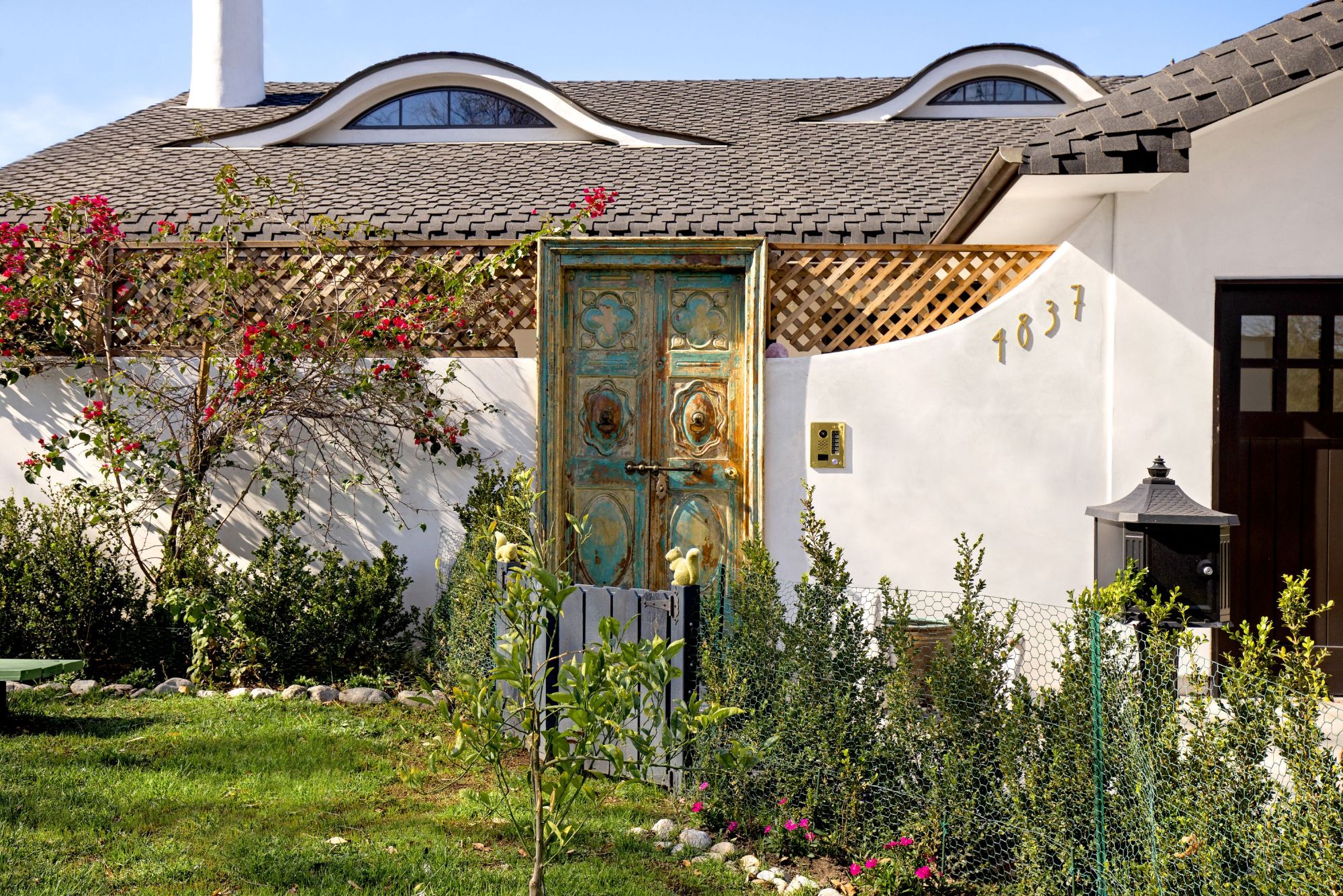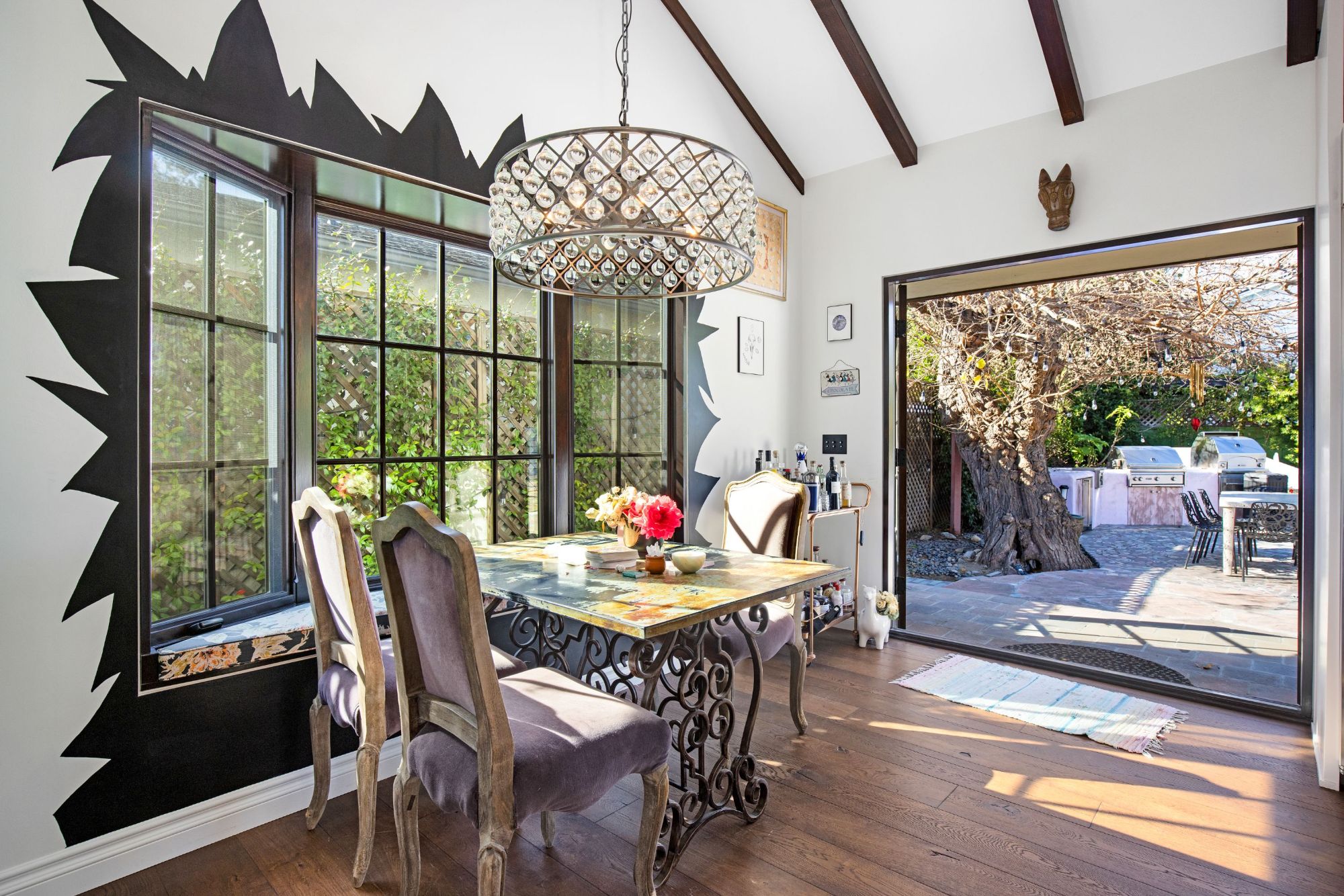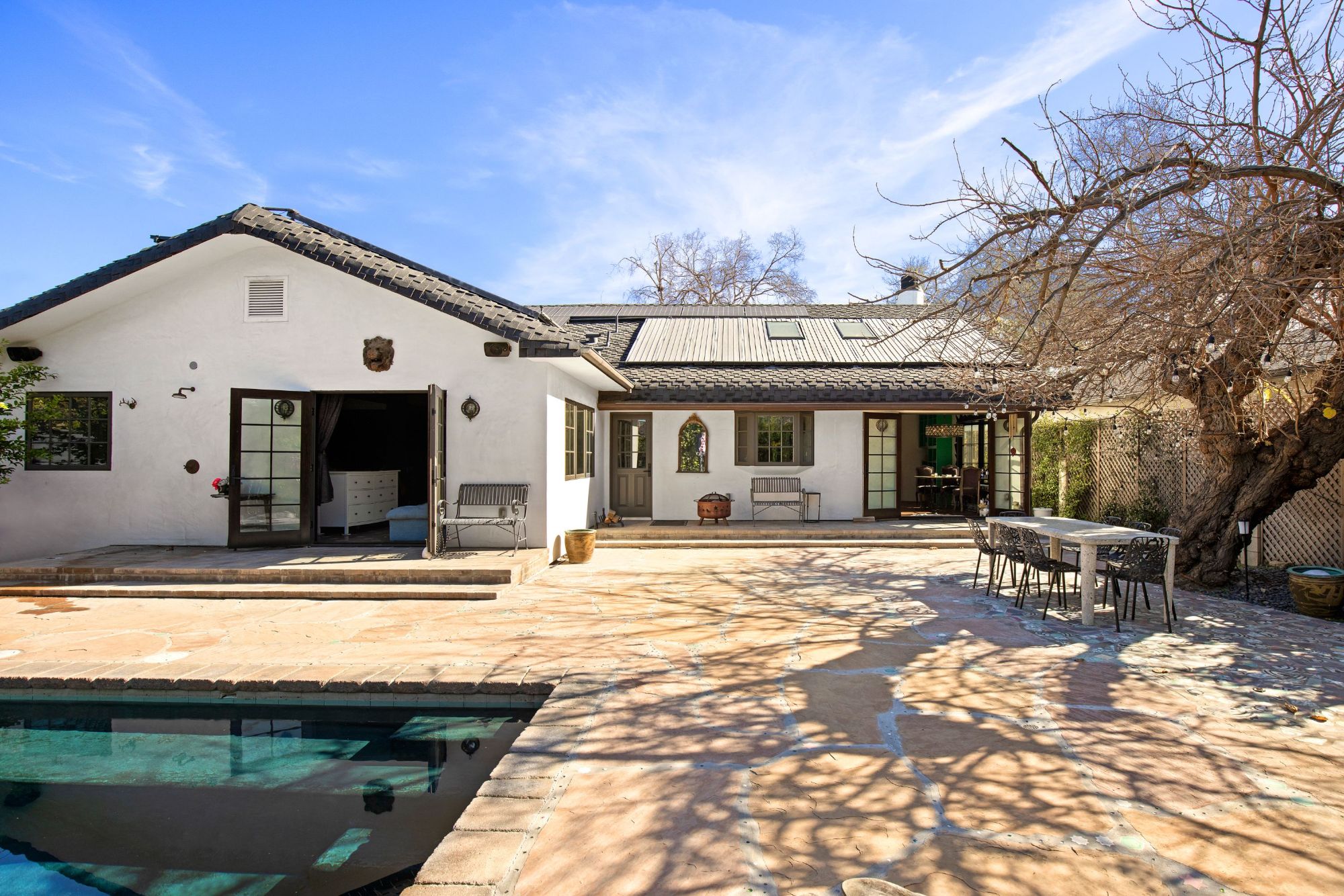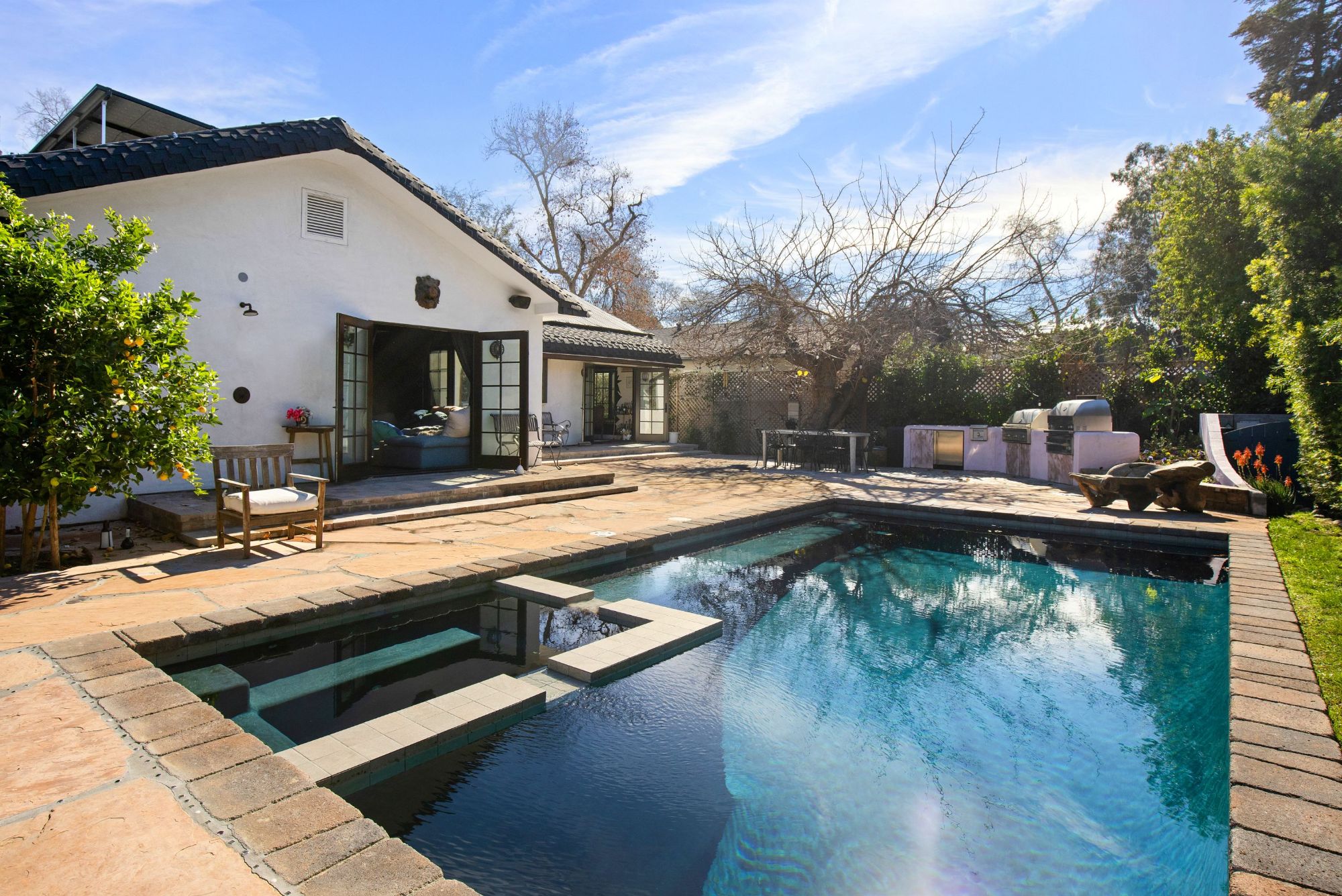 This architectural artist-designed home sits on a large 7,200 SQFT flat lot, set back on a quiet street in Toluca Woods. The front of the house has a large grass pad perfect for pets. As you enter the early 1900's reclaimed vintage door there's a covered porch. Entering the house greets you with double-height ceilings flooded with natural light coming in from the skylights and a spacious open floor plan. This house has it all, seamless indoor-outdoor living, a large saltwater pool, and jacuzzi, a full outdoor kitchen & dining perfect for entertaining, an outdoor shower, a beautiful mulberry tree, energy crystals set in the foundation, solar panels, and copper plumbing throughout. This house features wolf top-of-the-line appliances, an extra-large fireplace, 3 bedrooms 3 baths, and a bonus art loft. The oversized master features a walk-in closet and star-studded bathroom & a large bathtub. The whole house is on a water filtration system, everything has been fully thought out and the construction was done for an owner end user so the quality is second to none. If you are looking for a done newer house in one of the best locations in the valley you found it.