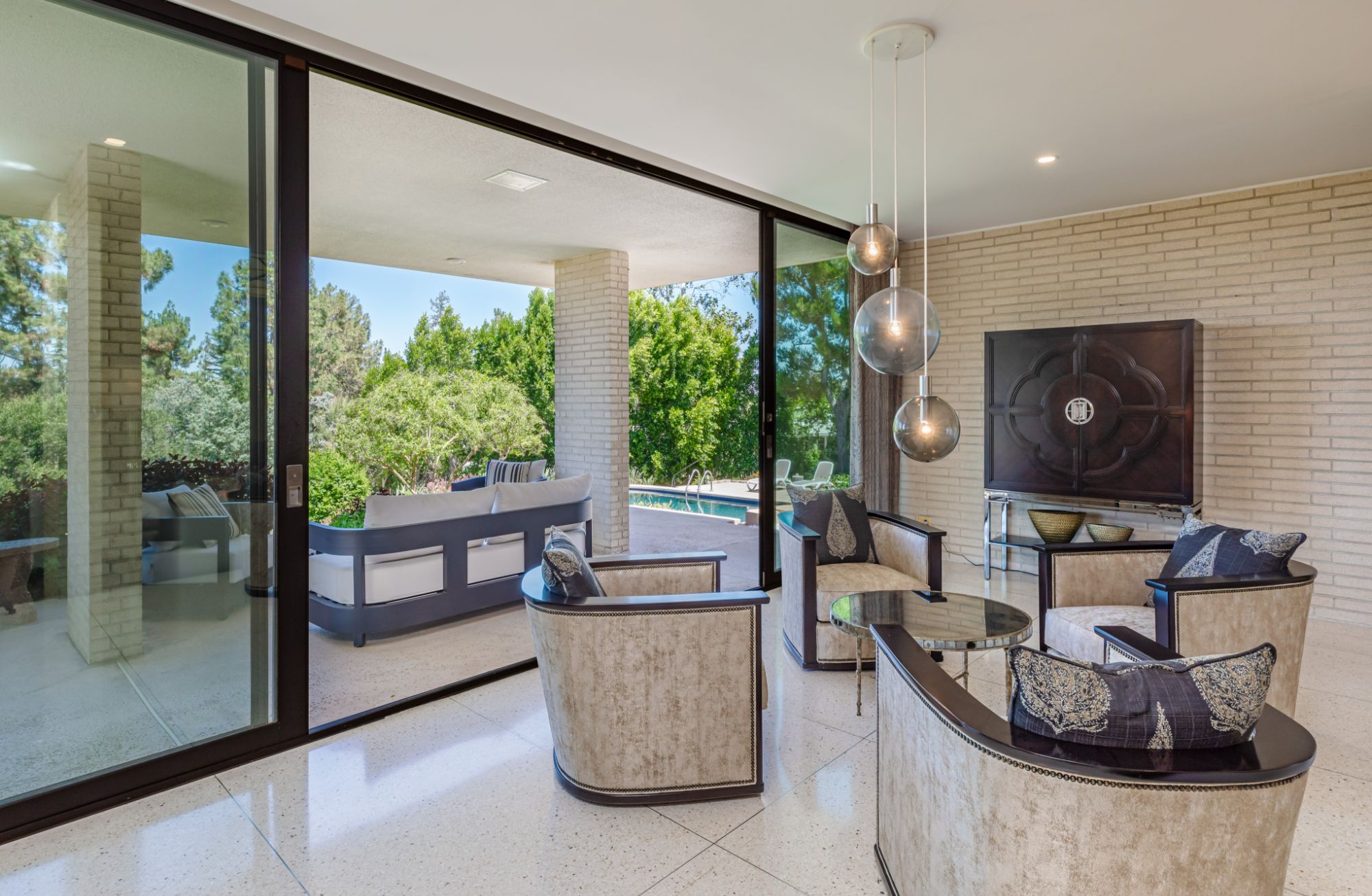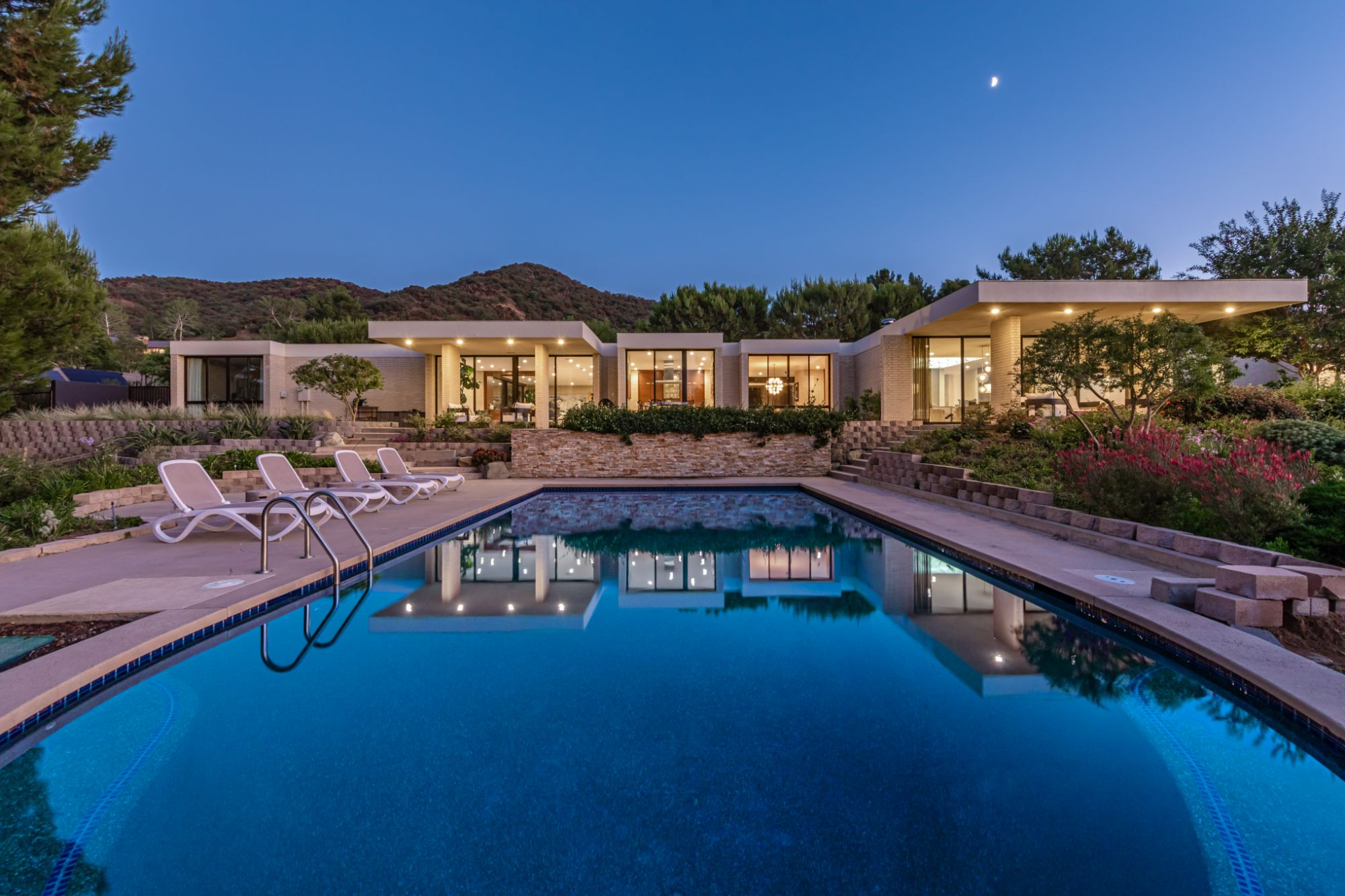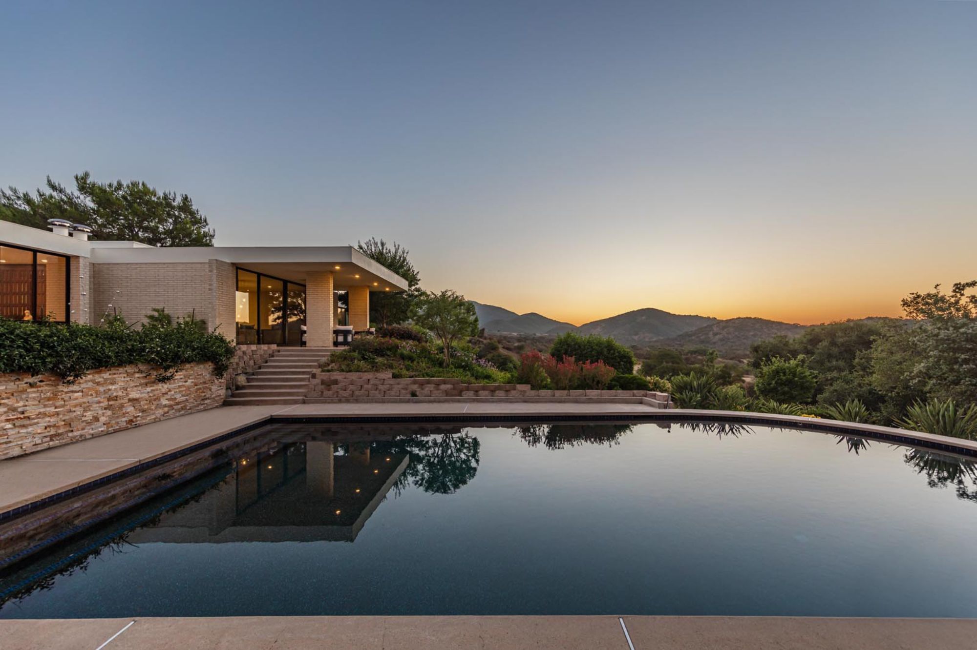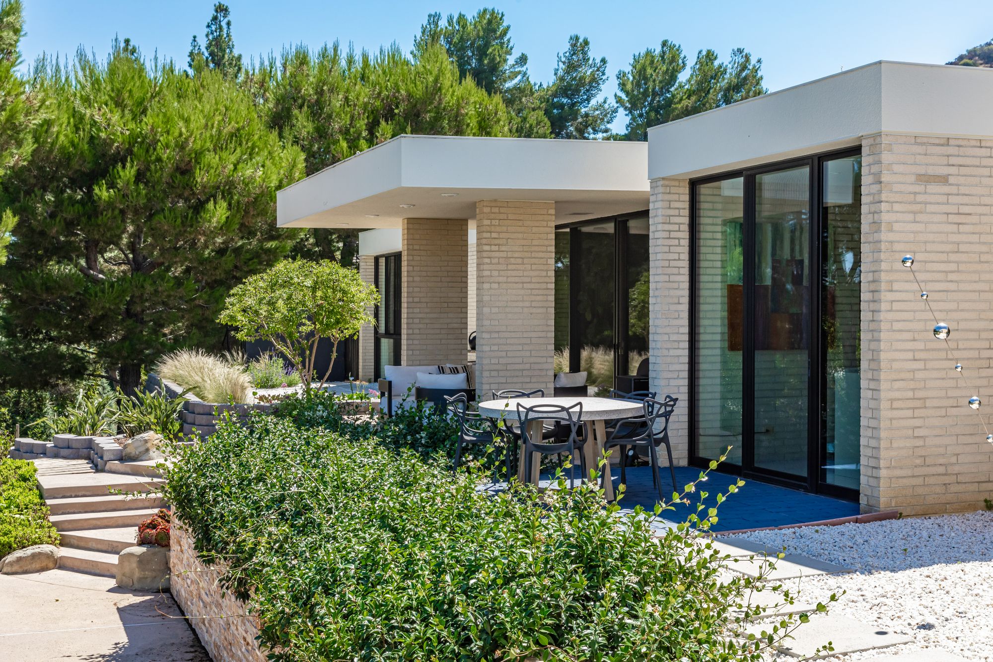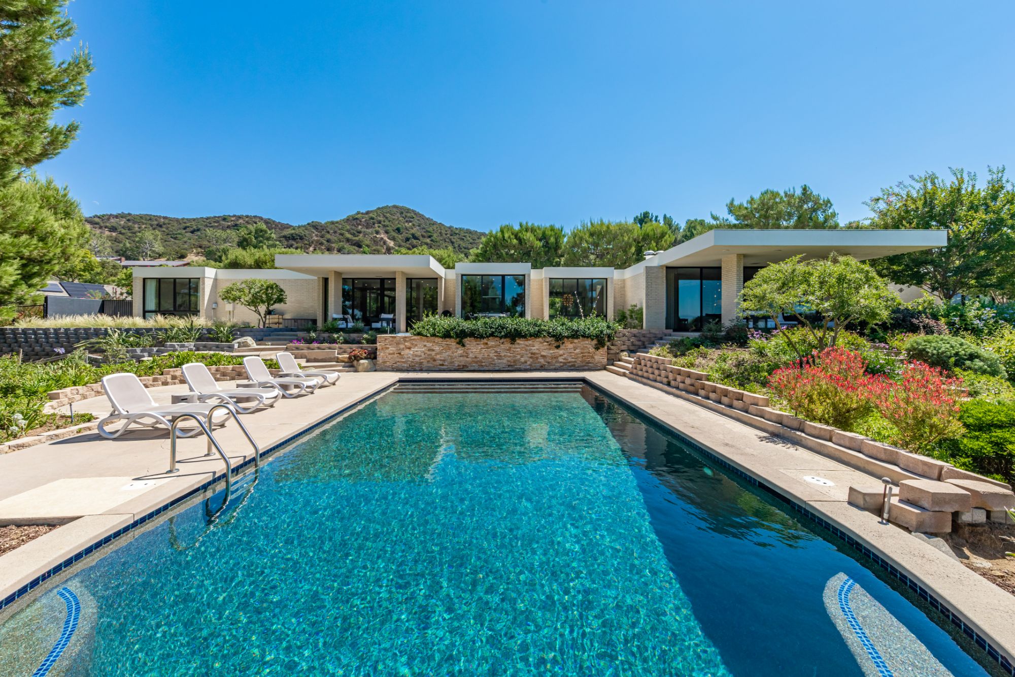 Welcome to Oak Creek Residence, a true masterpiece of Mid-Century Modern design nestled within the prestigious gated enclave of Los Robles Hills Estates. This exquisite home, meticulously crafted by the renowned Architect Clemens Kaasmann, A.I.A., stands as a testament to modern sophistication and enduring architectural excellence. Kaasmann worked closely with the famed John Lautner and Los Robles Hills Estates is notable to architectural purists as the location of Case Study House #28 by Buff and Hensman. Elegantly situated on a single level, this bespoke residence boasts four bedrooms and three and a half bathrooms, offering a seamless blend of contemporary luxury and timeless sophistication. The interior spaces flow effortlessly, showcasing meticulous attention to detail and a commitment to quality that is truly unparalleled. From the moment you step through the front door, you are enveloped by an ambiance of refinement and elegance. Spanning 5,774 sq ft on a 1.20-acre panoramic view lot, this residence embraces the indoor-outdoor California lifestyle. Impeccable features include terrazzo floors, Chicago Brick, floor-to-ceiling windows, and Fleetwood sliding doors. Primary suite includes a heated wet-room spa with a three person infrared sauna and jacuzzi that also serves as a cold plunge all adjacent to a large walk-in shower. Bathed in natural light, the living spaces are adorned with architectural nuances that capture the essence of Mid-Century Modern design. Expansive windows frame panoramic vistas that stretch across the landscape, inviting the outdoors in and creating a harmonious connection with the surroundings. The open-concept layout encourages fluid movement between the living, dining, and culinary areas, making it ideal for both relaxed living and elegant entertaining. Outside, the meticulously landscaped grounds extend the living experience, providing a sanctuary of serenity and tranquility. The residence is gracefully perched on a sprawling 1.2 acre lot within one of the most prestigious gated communities - a haven of privacy and exclusivity, boasting only twenty-eight custom-built homes. Immerse yourself in the allure of this private community, where luxury living meets natural beauty. Experience a lifestyle of convenience and sophistication of Thousand Oaks, with premier dining, upscale shopping, and captivating entertainment just moments away. Nearby parks and hiking trails offer opportunities for outdoor exploration, while the proximity to Westlake Village, Malibu, and the esteemed Los Robles Hospital enhances the convenience of daily life. The Oak Creek Residence has only had two owners and stands as a testament to the meticulous craftsmanship and refined taste of its architect and owners, who have cherished this remarkable property for half a century. Now, it is your turn to embrace the legacy of this extraordinary home, one that harmoniously marries modern aesthetics with timeless elegance. Seize the opportunity to own a residence that transcends the ordinary, where every corner reflects an unwavering commitment to luxury living. Come and discover the pinnacle of sophisticated living and embrace the exclusivity of Los Robles Hills Estates, a gated community of 28 custom-built homes on minimum one-acre lots.