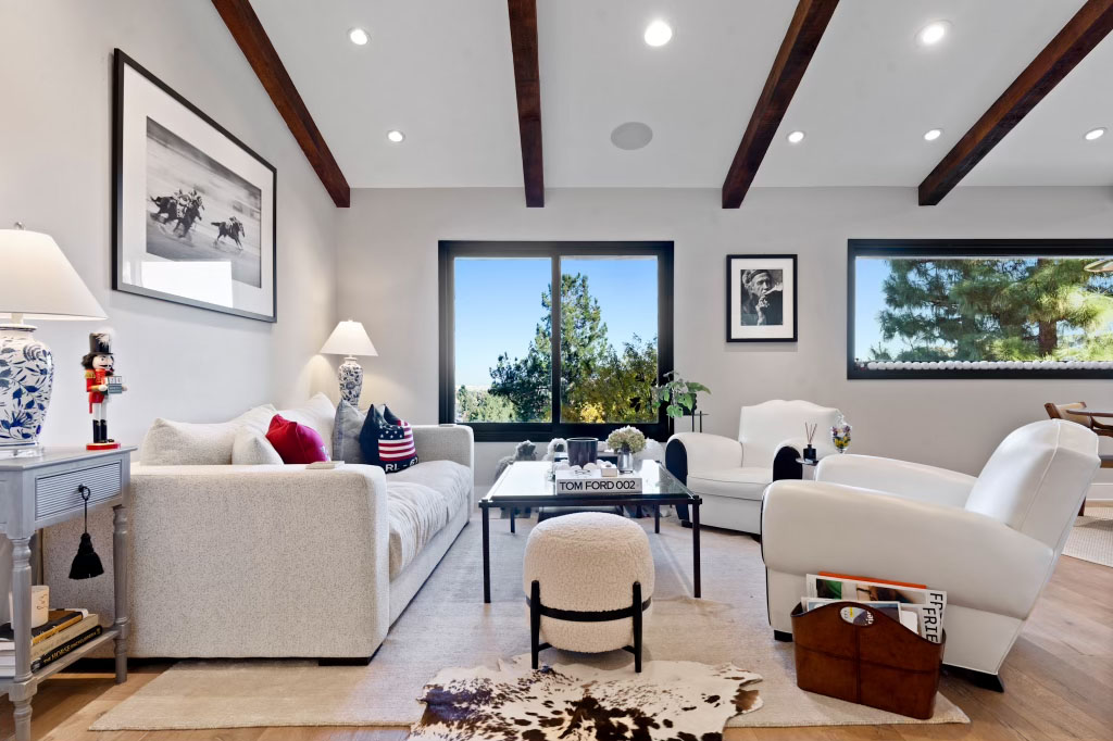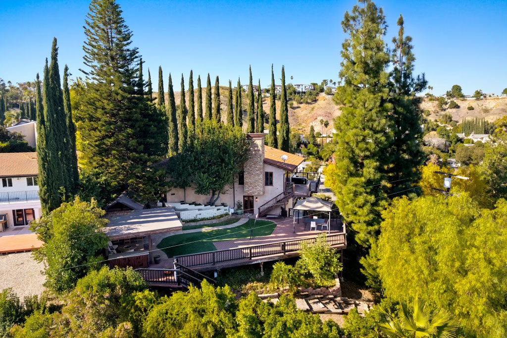Down a long driveway, sits a hidden sanctuary nestled on a lovely hillside in beautiful Woodland Hills. As you enter the property, you are immediately greeted with incredible views that fill large format windows throughout the home. The open layout creates a bright and free flowing sense of functionality that perfectly suits the first level. The kitchen, featuring a large island and high grade appliances, opens seamlessly to both the dining and family rooms. The second level provides three bedrooms, highlighted by a sizable primary bedroom with a lovely primary bathroom and walk-in closet. Previously a fourth bedroom, is now currently set up as an additional walk-in closet/dressing area that is accessible from the primary suite. The massive backyard provides the perfect area for all entertainment purposes. The vast turf area opens to an incredible custom built covered BBQ and cabana area. The area showcases multiple seating areas and two outdoor TV's that surround an illuminating fire pit. Colossal trees encase the backyard that provide ample shade and privacy. The space pairs perfectly with the sprawling views, coming together to create your new private compound.