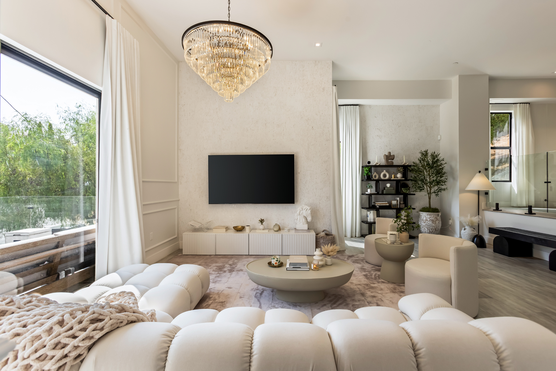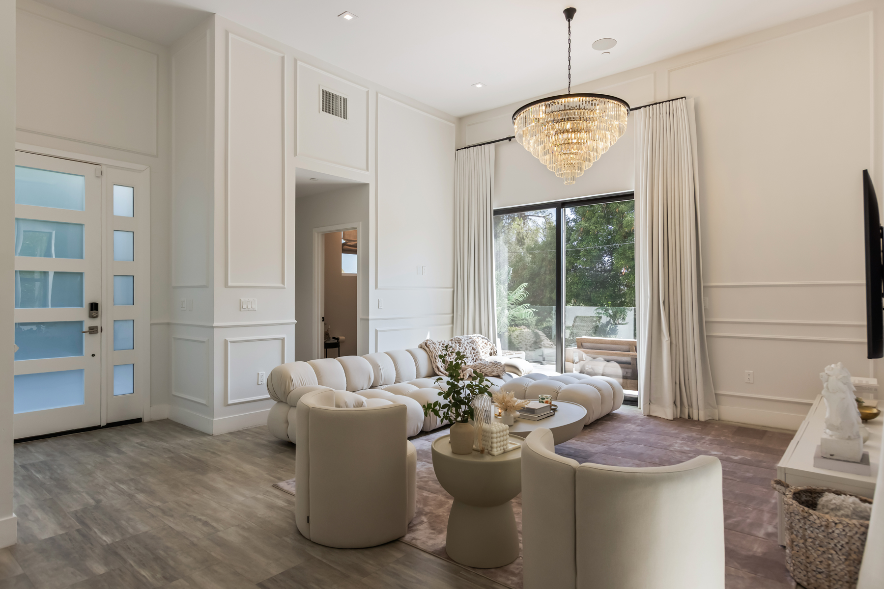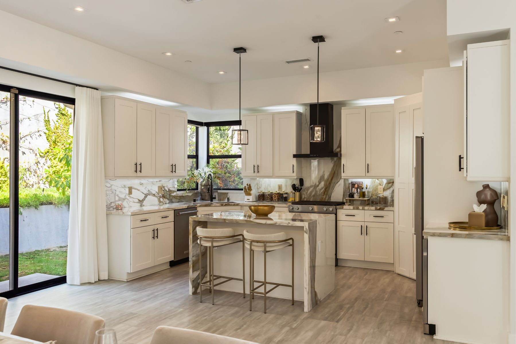 Tucked into the peaceful hills south of Ventura Boulevard, this newly renovated modern home offers an extraordinary blend of style, comfort, and technology. From the moment you enter, you're welcomed by soaring ceilings, abundant natural light, and an open layout that seamlessly connects each living space with effortless flow. Designer touches are found throughout from custom Italian wallpaper accented with 24k gold leaf to refined lime-wash finishes and statement lighting. The chef-inspired kitchen features high-end stainless-steel appliances, a bold center island, and striking Mediterraneo Macchia Antica porcelain surfaces, making it as functional as it is beautiful.The spacious family room, complete with a sleek fireplace, is perfect for cozy nights or entertaining guests. Upstairs, the luxurious primary suite offers a spa-like bathroom with dual vanities, a freestanding soaking tub, walk-in shower, and access to a private balcony with peaceful hillside views. Two additional bedrooms provide ample space, while a separate bonus room/office on the lower level adds flexibility for work or play.A true standout feature is the converted 2-car garage, now a high-performance private gym outfitted with custom flooring, top-tier equipment, and a built-in sauna perfect for fitness enthusiasts or post-workout relaxation.Enjoy complete control and comfort with cutting-edge smart home technology, including Sonos surround sound, NEST thermostat, dual-zone HVAC, tankless water heater, and security-enhancing unbreakable glass.Located just minutes from Westfield Topanga, premium dining, and boutique shopping, this turn-key property offers incredible value in one of Woodland Hills' most sought-after neighborhoods.A rare opportunity at an unbeatable price act fast, this home won't stay on the market for long.