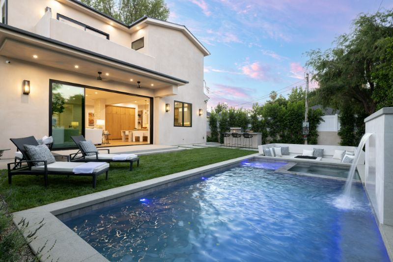 A true representation of quality and cutting edge design at its finest this spectacular new construction features over 5,700 sqft including a fully equipped basement level. Immaculate ONE-OF-A-KIND New Construction Estate showcasing top-tier craftsmanship throughout and situated within a highly coveted Sherman Oaks location. As you enter you will be impressed by the soaring high ceilings and the abundance of natural light. Elegant family room displays built-in oak cabinetry, fireplace and floor to ceiling glass pocket doors that lead to the yard. Magazine worthy chefs kitchen featuring top of the line Thermador appliances, travertine countertops with with built in breakfast bar, and butlers pantry. The basement level is an entertainers dream with endless amenities including a state of the art theater room, a fully equipped gym with sauna room, a wet bar, spacious family room, outdoor lounge area and an additional ensuite guest bedroom. Grand primary suite with vaulted ceilings, cozy fireplace, large balcony and expansive walk in closet space. Spa like primary bath with dual vanities, oversized walk in shower with integrated soaking tub. Oasis-like backyard with a BBQ seating center, sparkling pool/spa, and sunken fire pit. Additional amenities include smart system, surround sound and security cameras. Perfectly located on a tree lined street and just minutes from the best shops, restaurants and schools.