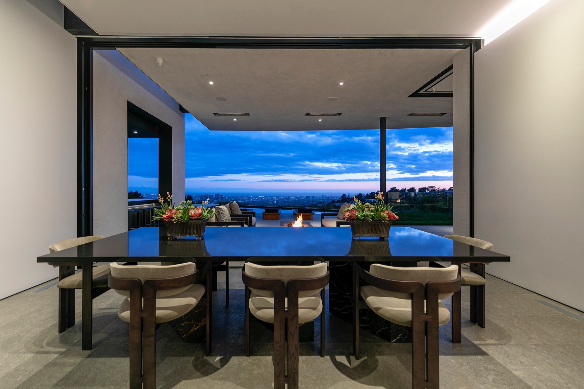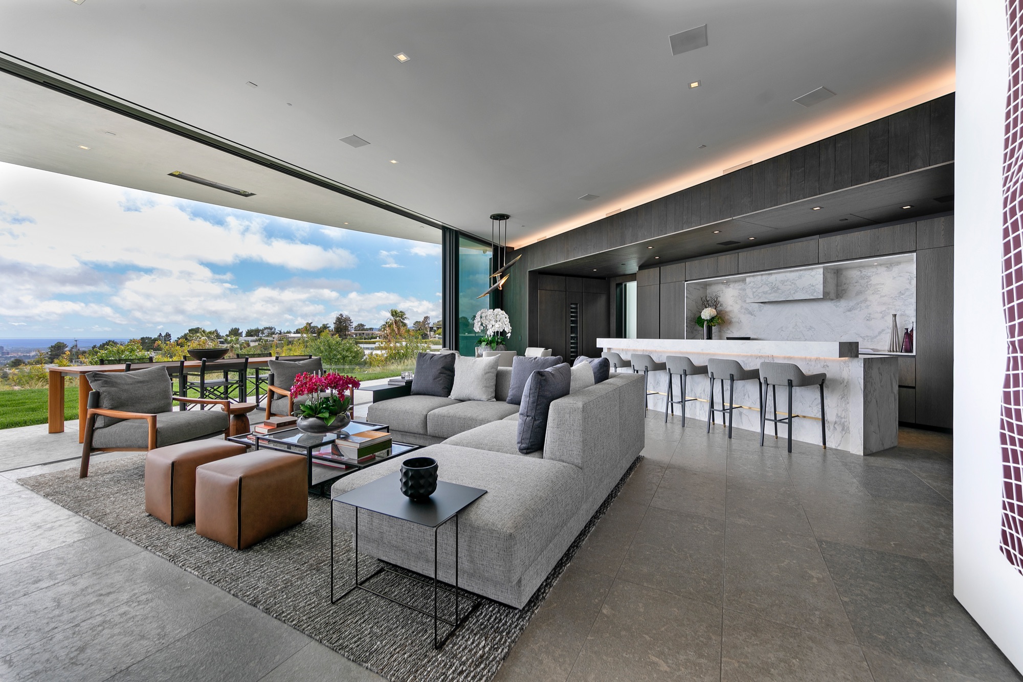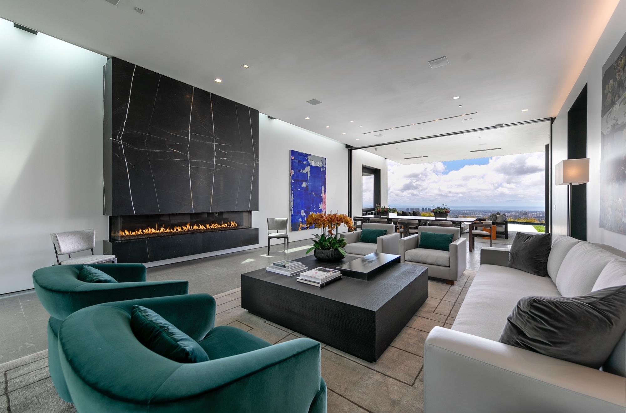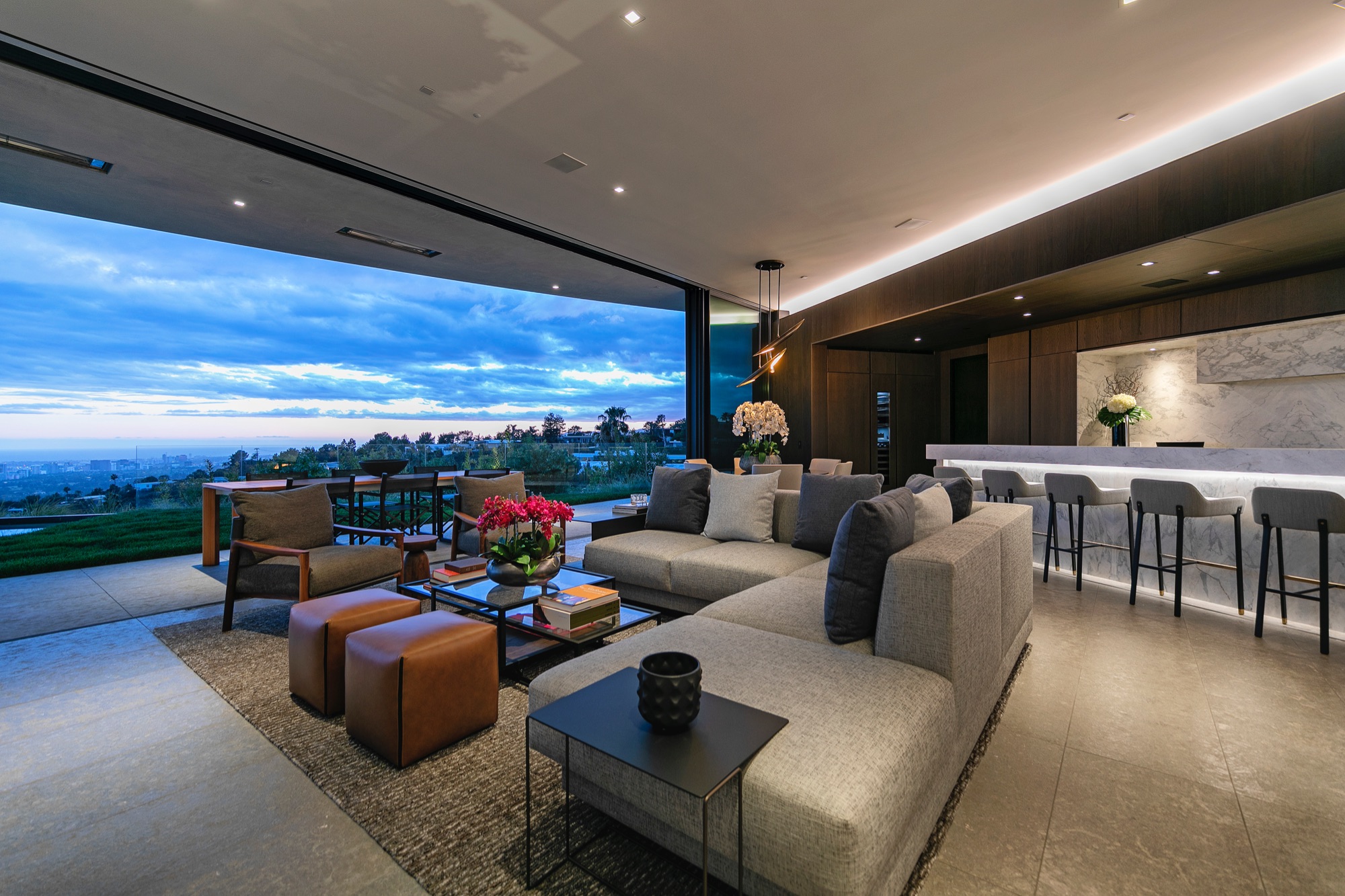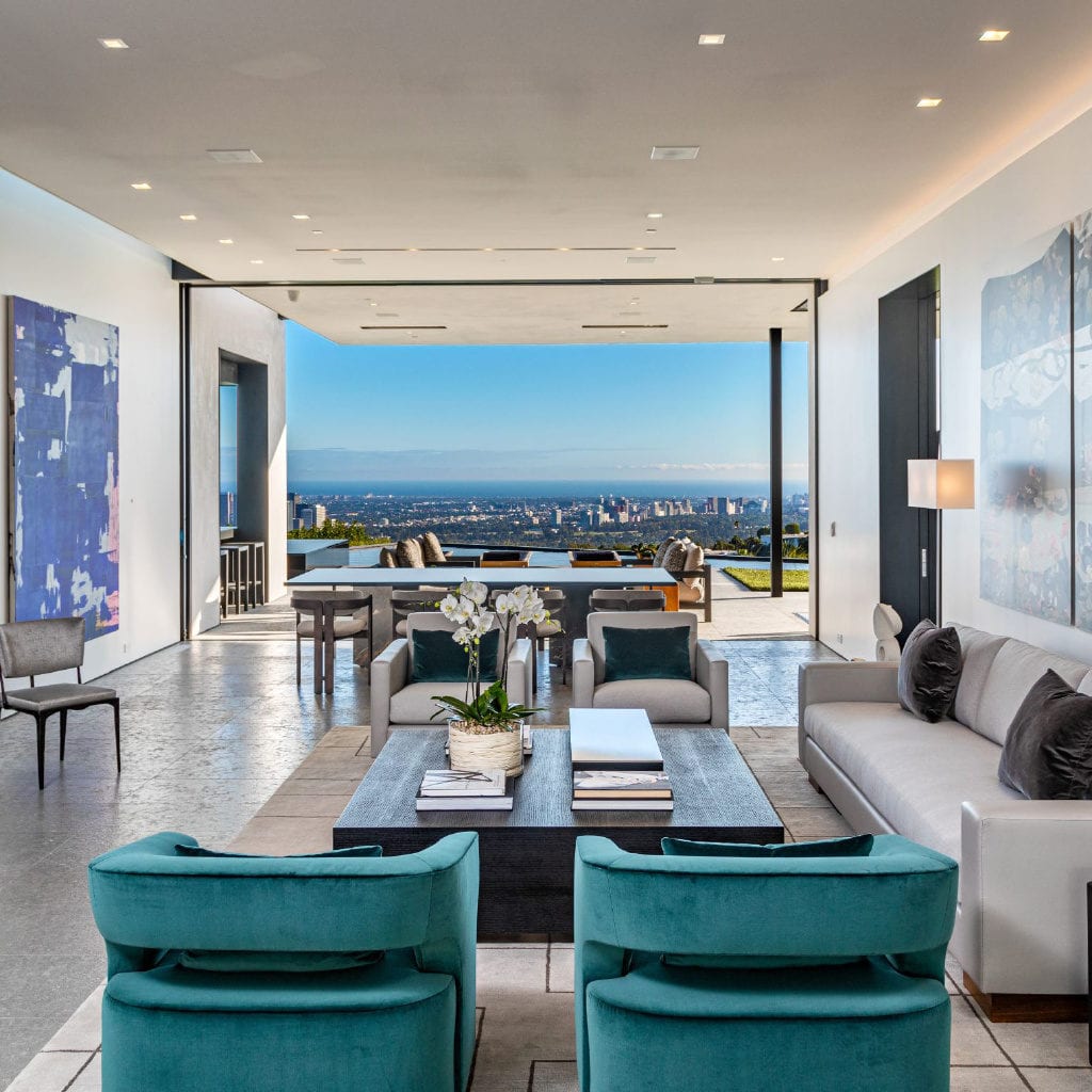 A spectacular hillside glass-walled sanctuary by design icon Mark Rios with Trousdale Estates most explosive panoramic city to ocean views. Interiors by Dusenbury Design, this modern organic masterpiece provides the most captivating entertainment features. Behind the privacy of a 13-ft architectural wall, the 12,456-sf, 6-beds, 11-baths estate boasts a 15-ft waterfall in the front court cascading into a lower-level reflecting pool & a 2100-sf subterranean garage. Elegant, clean lines reflecting mid-century modern sophistication meet luxurious stone, wood & marble finishes. Floor-to-ceiling doors & elegant open concept fill every inch of the main living spaces with natural light and unobstructed views. Chefs kitchen, breakfast bar, formal & alfresco dining. Outdoor entertainment features a firepit lounge with a bar and a lush terrace with an expansive pool/spa soaring over the skyline. Lower-level entertainment oasis features a stunning blue velvet lounge with a marble bar, an oversized glass wine cellar & a theater with matching palette. Lavish 1,600-sf primary suite features dual bathrooms with a tranquil tub overlooking the 360 vista. Additional amenities include gym, massage, elevator, beauty salon, en-suite guest rooms & staff quarters. Make your mark among the most discerning elite with this legendary home.