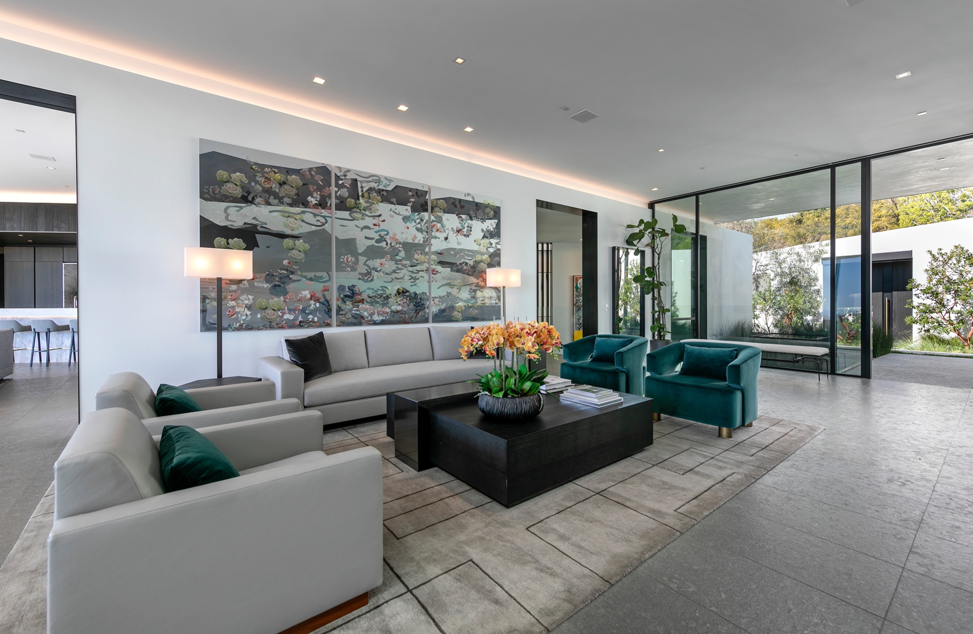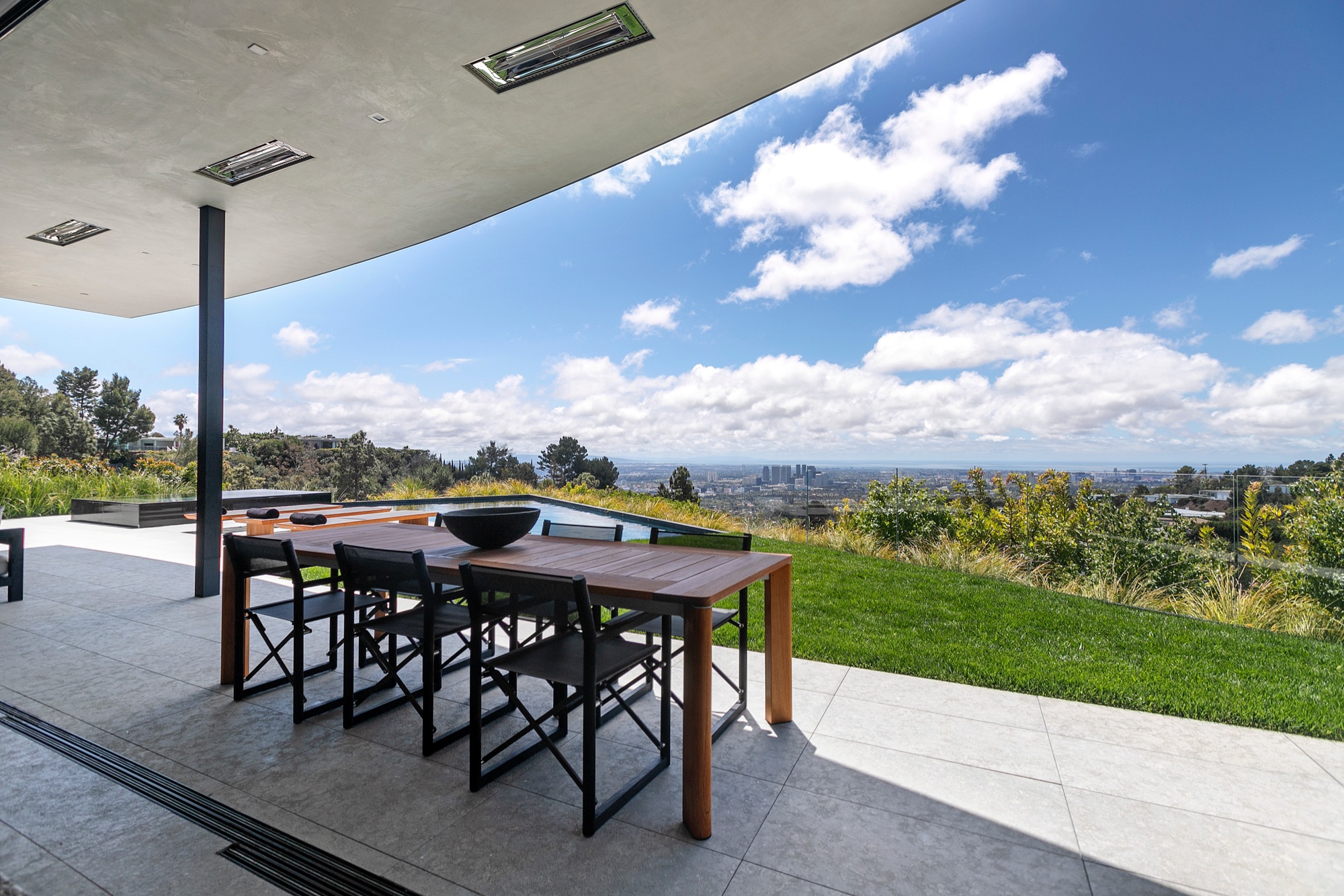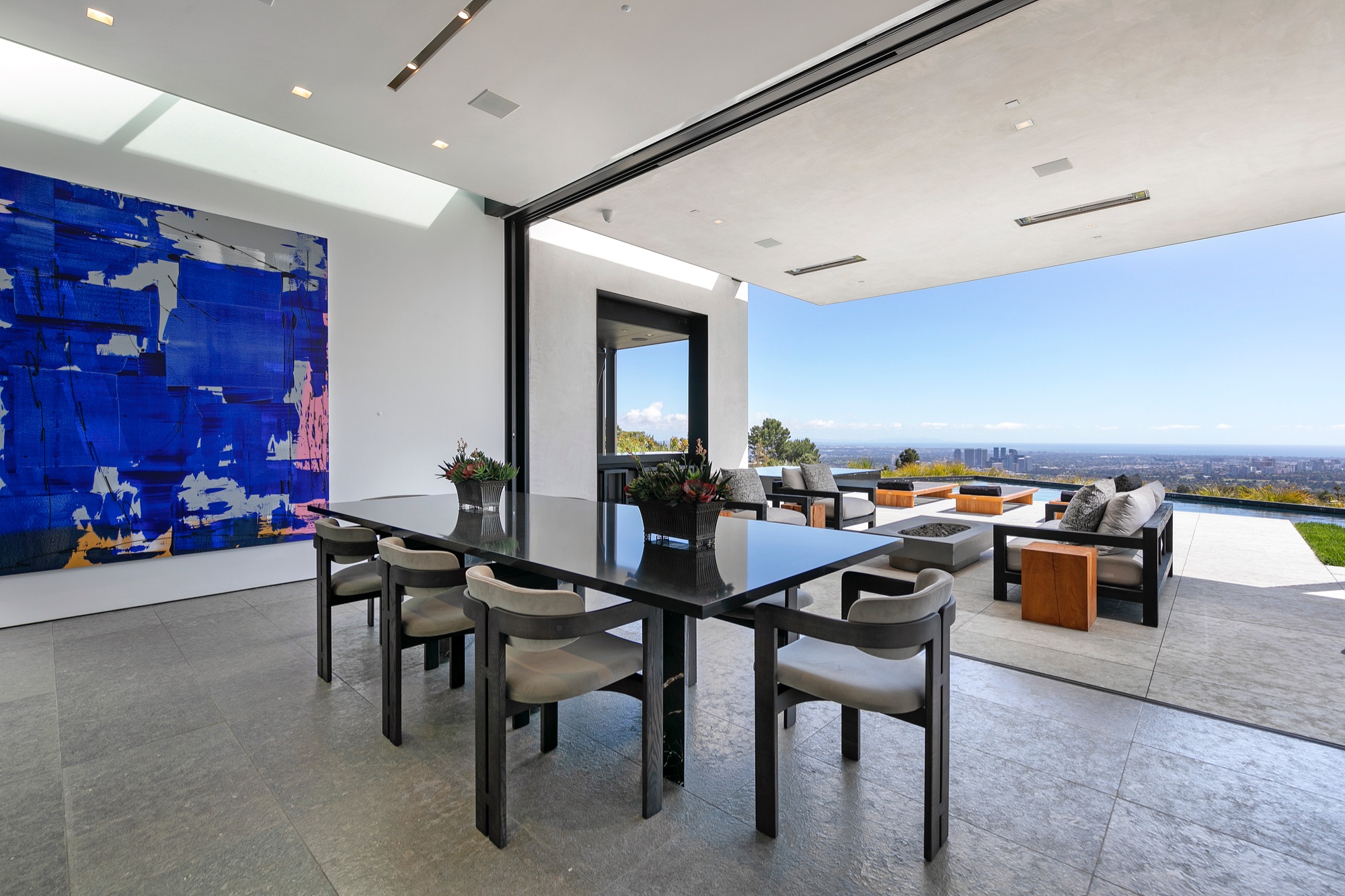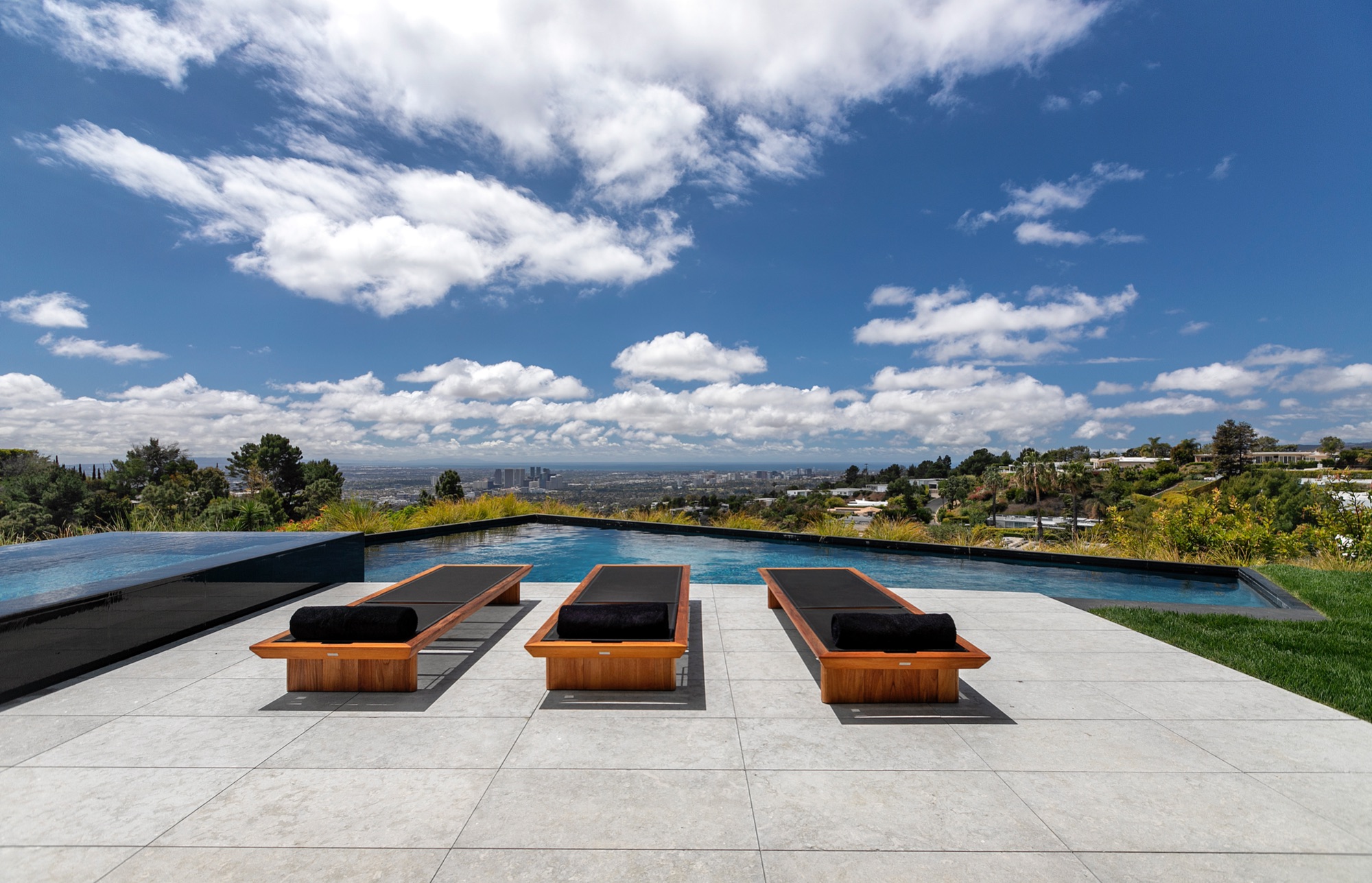A spectacular hillside glass-walled sanctuary by design icon Mark Rios with Trousdale Estates most explosive panoramic city to ocean views. Interiors by Dusenbury Design, this modern organic masterpiece provides the most captivating entertainment features. Behind the privacy of a 13-ft architectural wall, the 12,456-sf, 6-beds, 11-baths estate boasts a 15-ft waterfall in the front court cascading into a lower-level reflecting pool & a 2100-sf subterranean garage. Elegant, clean lines reflecting mid-century modern sophistication meet luxurious stone, wood & marble finishes. Floor-to-ceiling doors & elegant open concept fill every inch of the main living spaces with natural light and unobstructed views. Chefs kitchen, breakfast bar, formal & alfresco dining. Outdoor entertainment features a firepit lounge with a bar and a lush terrace with an expansive pool/spa soaring over the skyline. Lower-level entertainment oasis features a stunning blue velvet lounge with a marble bar, an oversized glass wine cellar & a theater with matching palette. Lavish 1,600-sf primary suite features dual bathrooms with a tranquil tub overlooking the 360 vista. Additional amenities include gym, massage, elevator, beauty salon, en-suite guest rooms & staff quarters. Make your mark among the most discerning elite with this legendary home.
