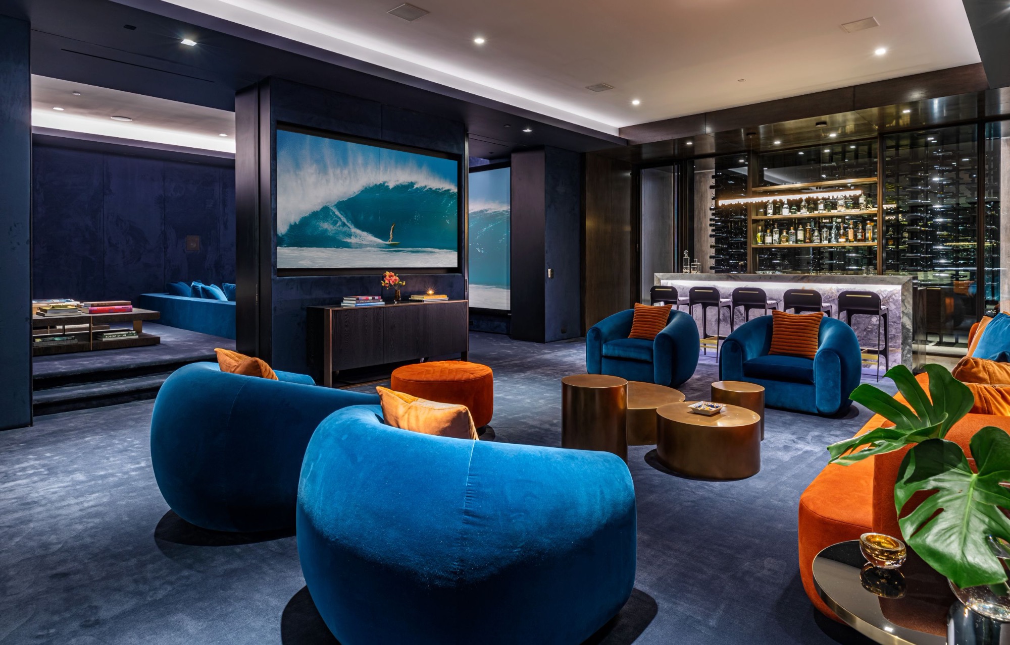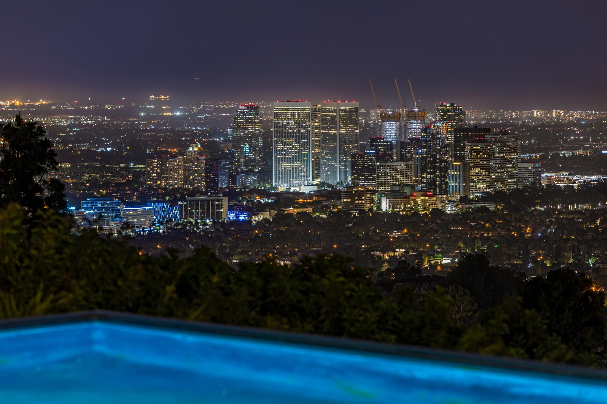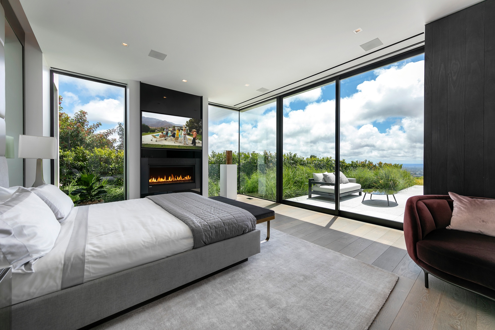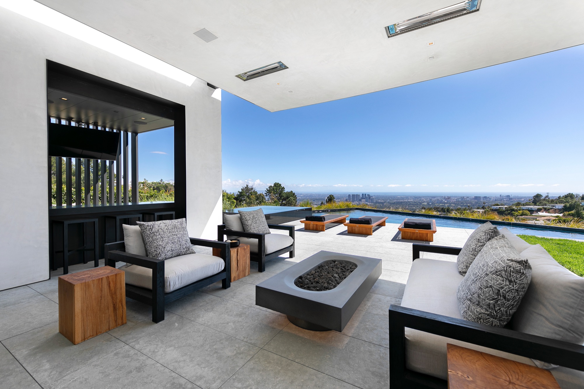 A spectacular hillside glass-walled sanctuary by design icon Mark Rios with Trousdale Estates most explosive panoramic city to ocean views. Interiors by Dusenbury Design, this modern organic masterpiece provides the most captivating entertainment features. Behind the privacy of a 13-ft architectural wall, the 12,456-sf, 6-beds, 11-baths estate boasts a 15-ft waterfall in the front court cascading into a lower-level reflecting pool & a 2100-sf subterranean garage. Elegant, clean lines reflecting mid-century modern sophistication meet luxurious stone, wood & marble finishes. Floor-to-ceiling doors & elegant open concept fill every inch of the main living spaces with natural light and unobstructed views. Chefs kitchen, breakfast bar, formal & alfresco dining. Outdoor entertainment features a firepit lounge with a bar and a lush terrace with an expansive pool/spa soaring over the skyline. Lower-level entertainment oasis features a stunning blue velvet lounge with a marble bar, an oversized glass wine cellar & a theater with matching palette. Lavish 1,600-sf primary suite features dual bathrooms with a tranquil tub overlooking the 360 vista. Additional amenities include gym, massage, elevator, beauty salon, en-suite guest rooms & staff quarters. Make your mark among the most discerning elite with this legendary home.