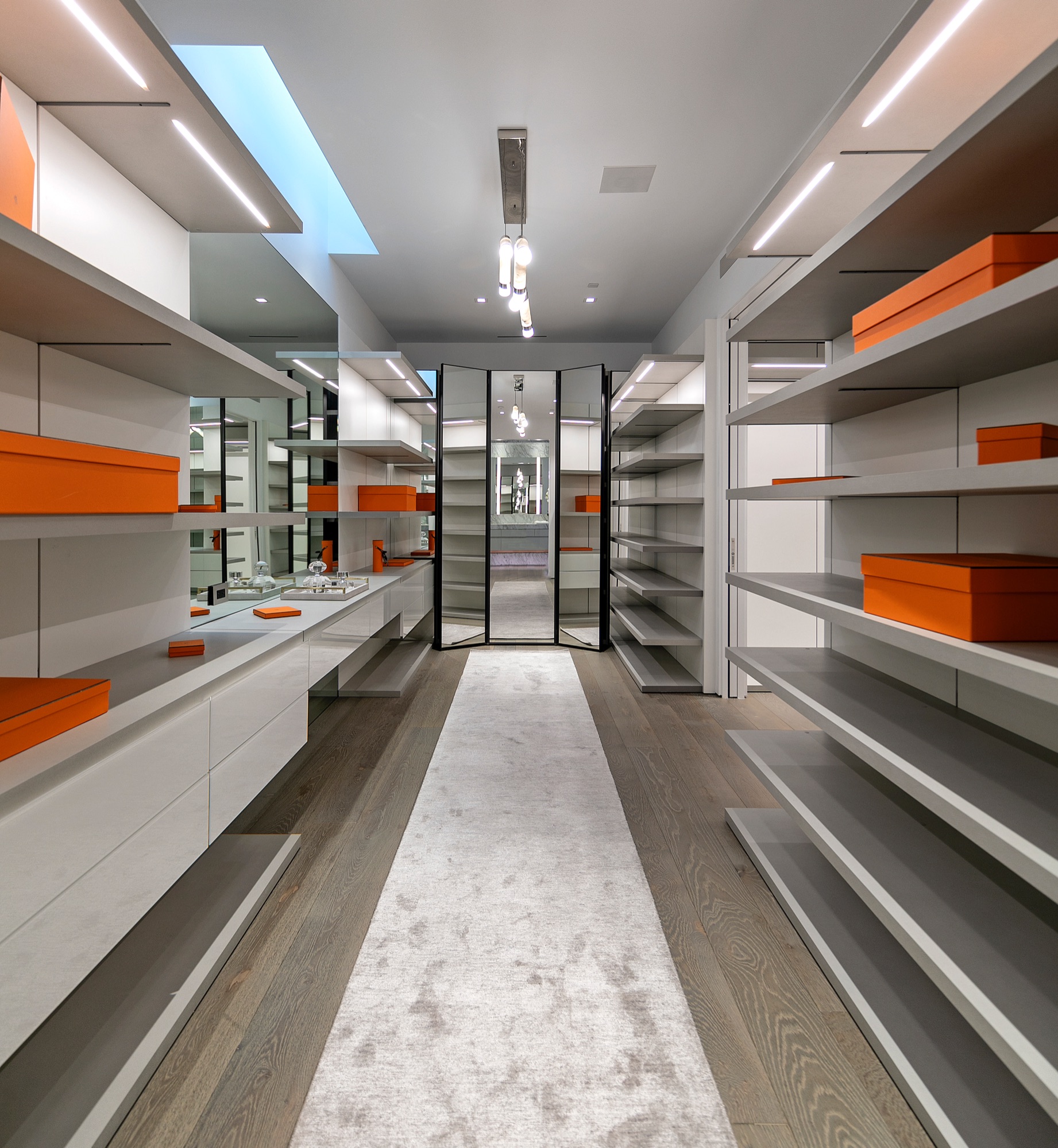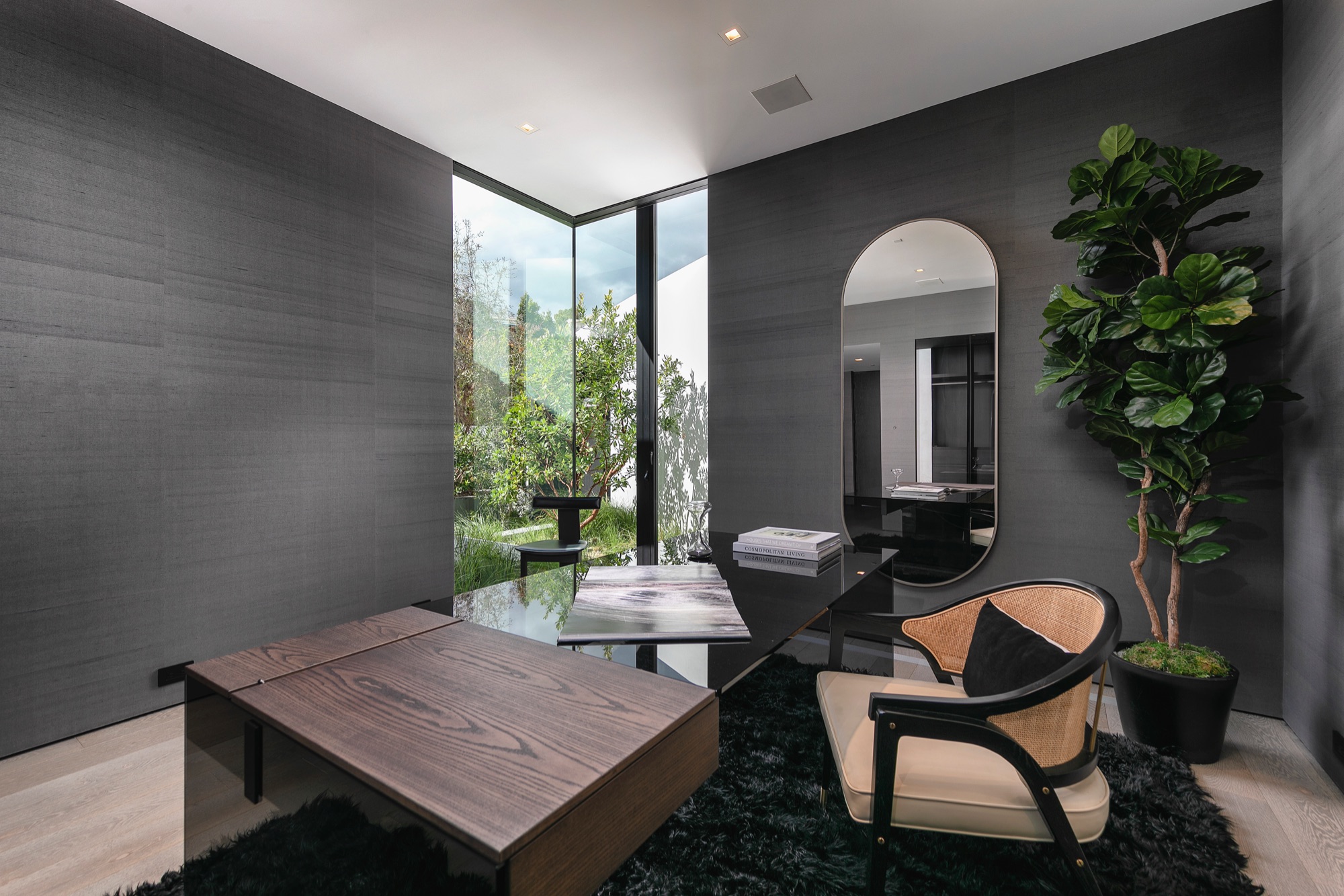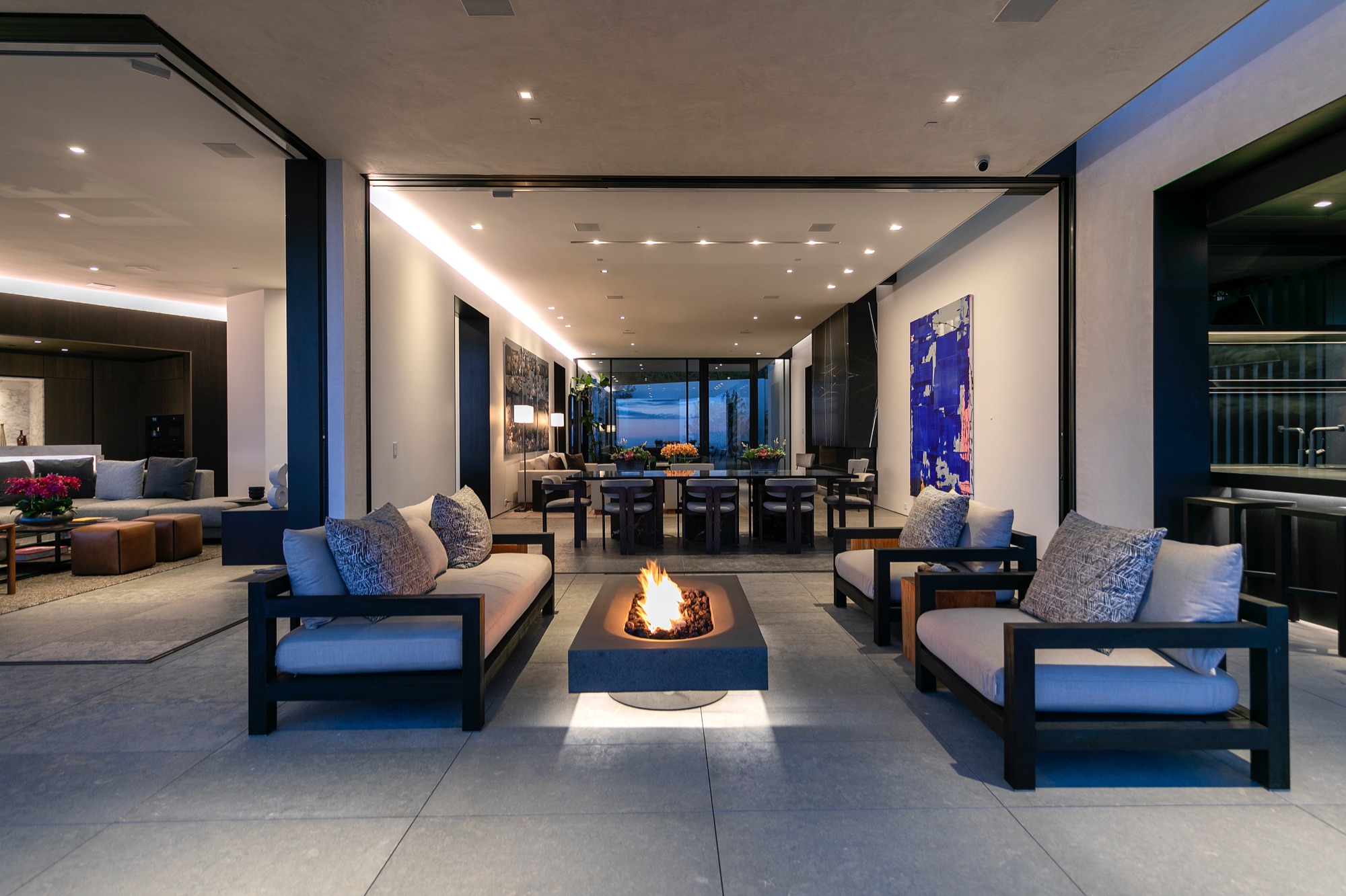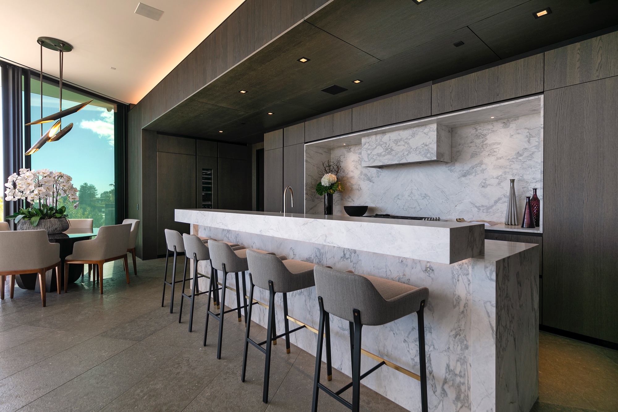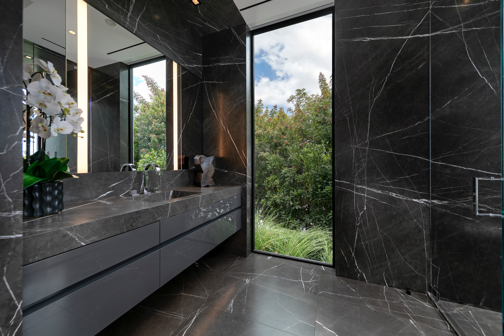 A spectacular hillside glass-walled sanctuary by design icon Mark Rios with Trousdale Estates most explosive panoramic city to ocean views. Interiors by Dusenbury Design, this modern organic masterpiece provides the most captivating entertainment features. Behind the privacy of a 13-ft architectural wall, the 12,456-sf, 6-beds, 11-baths estate boasts a 15-ft waterfall in the front court cascading into a lower-level reflecting pool & a 2100-sf subterranean garage. Elegant, clean lines reflecting mid-century modern sophistication meet luxurious stone, wood & marble finishes. Floor-to-ceiling doors & elegant open concept fill every inch of the main living spaces with natural light and unobstructed views. Chefs kitchen, breakfast bar, formal & alfresco dining. Outdoor entertainment features a firepit lounge with a bar and a lush terrace with an expansive pool/spa soaring over the skyline. Lower-level entertainment oasis features a stunning blue velvet lounge with a marble bar, an oversized glass wine cellar & a theater with matching palette. Lavish 1,600-sf primary suite features dual bathrooms with a tranquil tub overlooking the 360 vista. Additional amenities include gym, massage, elevator, beauty salon, en-suite guest rooms & staff quarters. Make your mark among the most discerning elite with this legendary home.