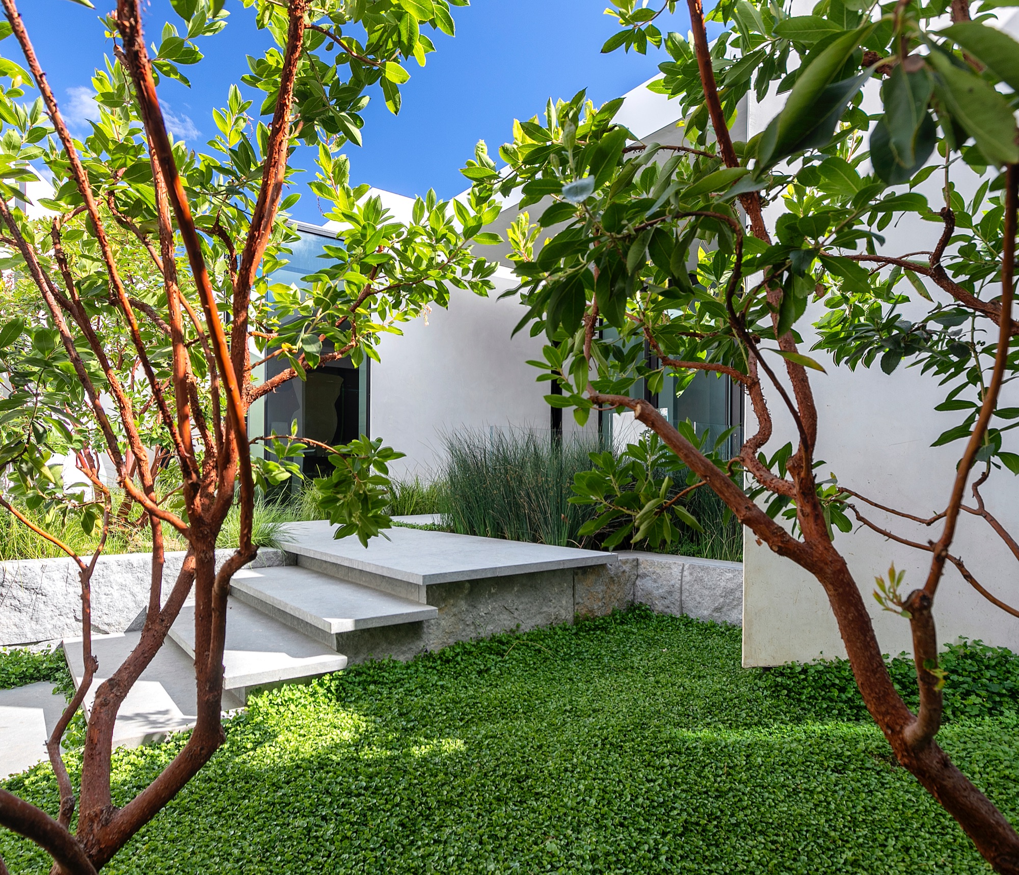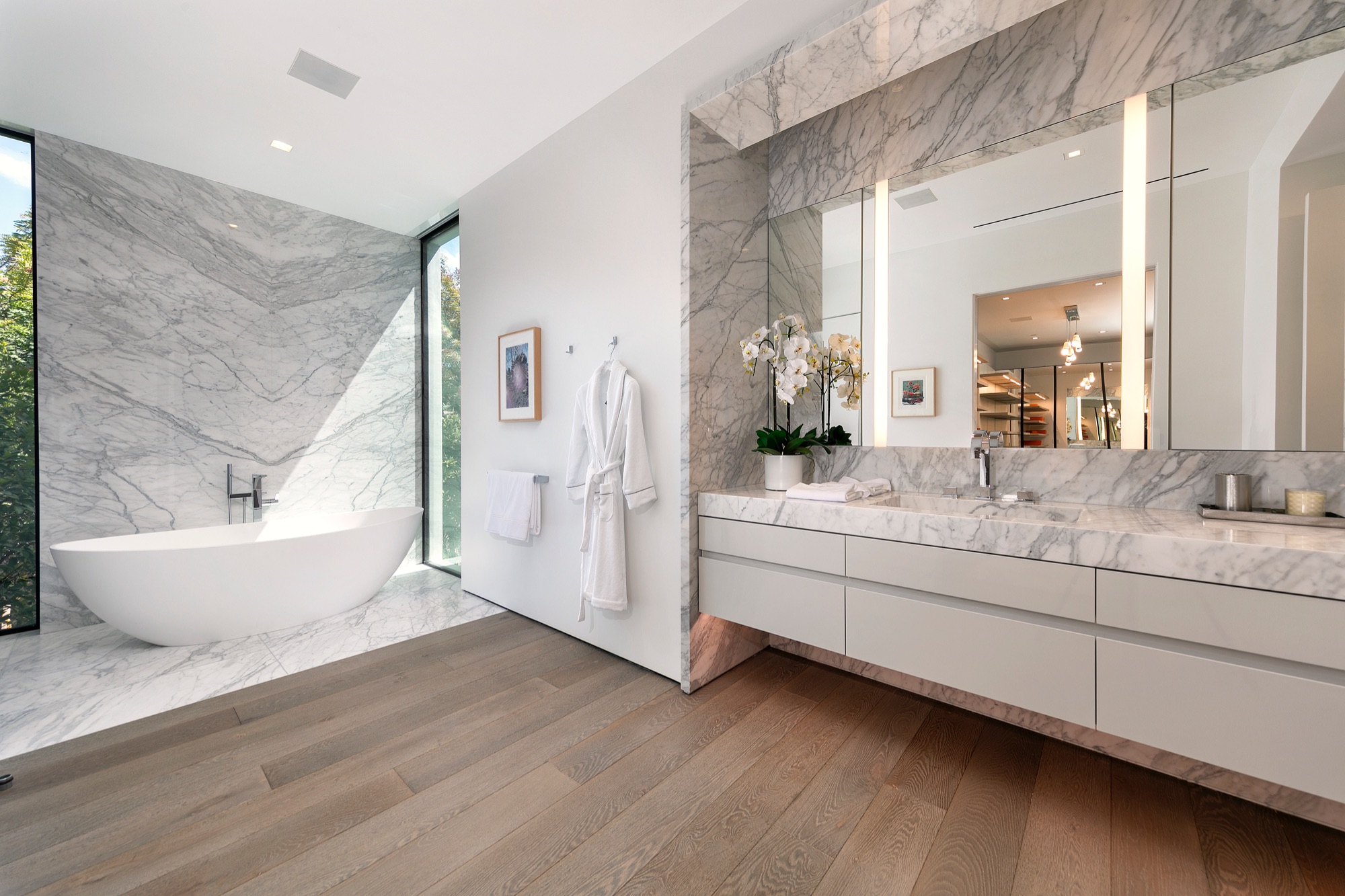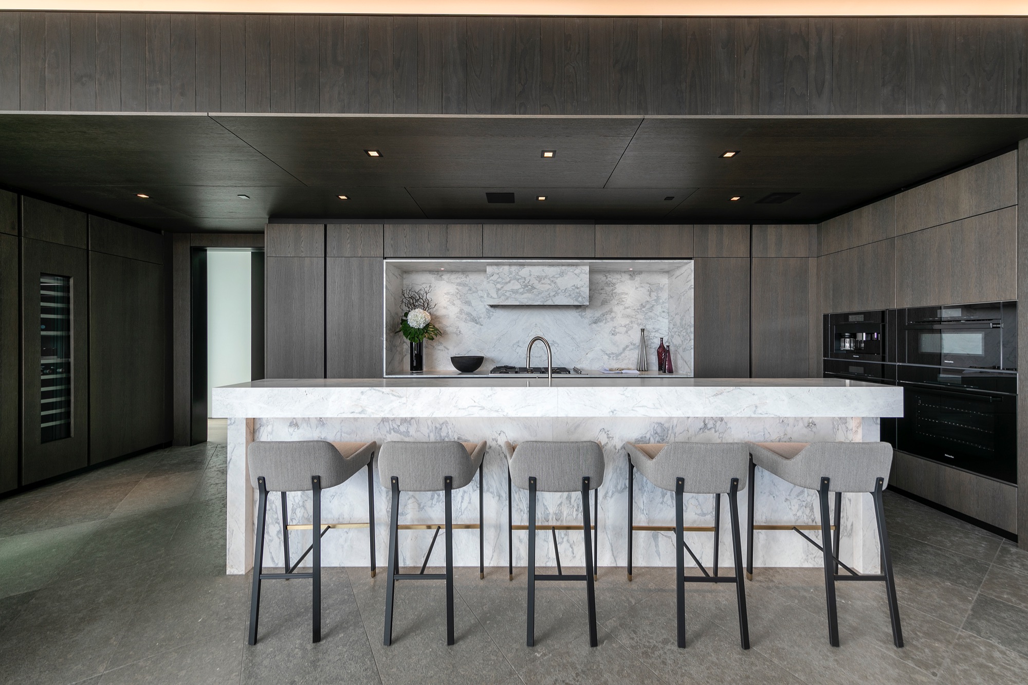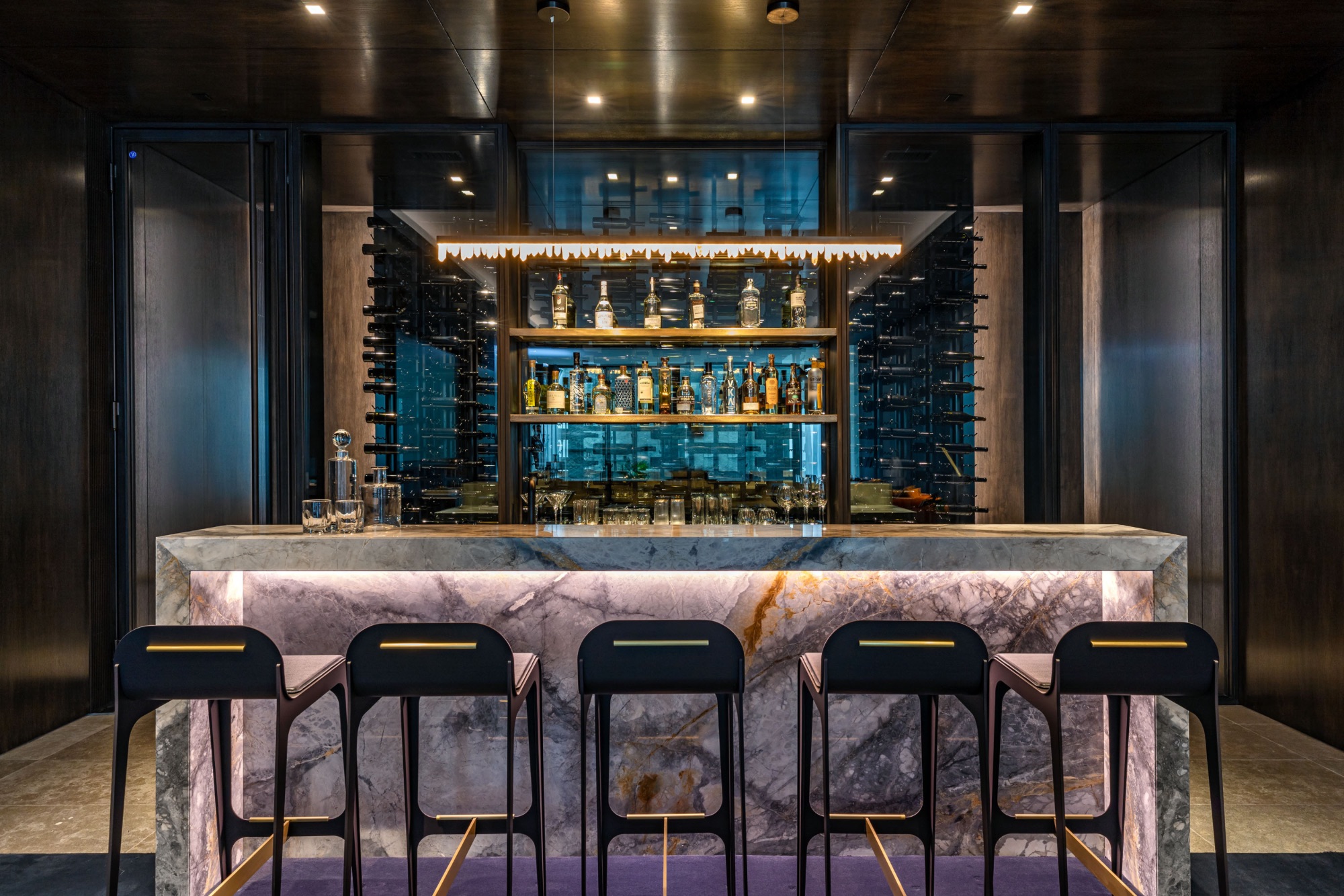 A spectacular hillside glass-walled sanctuary by design icon Mark Rios with Trousdale Estates most explosive panoramic city to ocean views. Interiors by Dusenbury Design, this modern organic masterpiece provides the most captivating entertainment features. Behind the privacy of a 13-ft architectural wall, the 12,456-sf, 6-beds, 11-baths estate boasts a 15-ft waterfall in the front court cascading into a lower-level reflecting pool & a 2100-sf subterranean garage. Elegant, clean lines reflecting mid-century modern sophistication meet luxurious stone, wood & marble finishes. Floor-to-ceiling doors & elegant open concept fill every inch of the main living spaces with natural light and unobstructed views. Chefs kitchen, breakfast bar, formal & alfresco dining. Outdoor entertainment features a firepit lounge with a bar and a lush terrace with an expansive pool/spa soaring over the skyline. Lower-level entertainment oasis features a stunning blue velvet lounge with a marble bar, an oversized glass wine cellar & a theater with matching palette. Lavish 1,600-sf primary suite features dual bathrooms with a tranquil tub overlooking the 360 vista. Additional amenities include gym, massage, elevator, beauty salon, en-suite guest rooms & staff quarters. Make your mark among the most discerning elite with this legendary home.