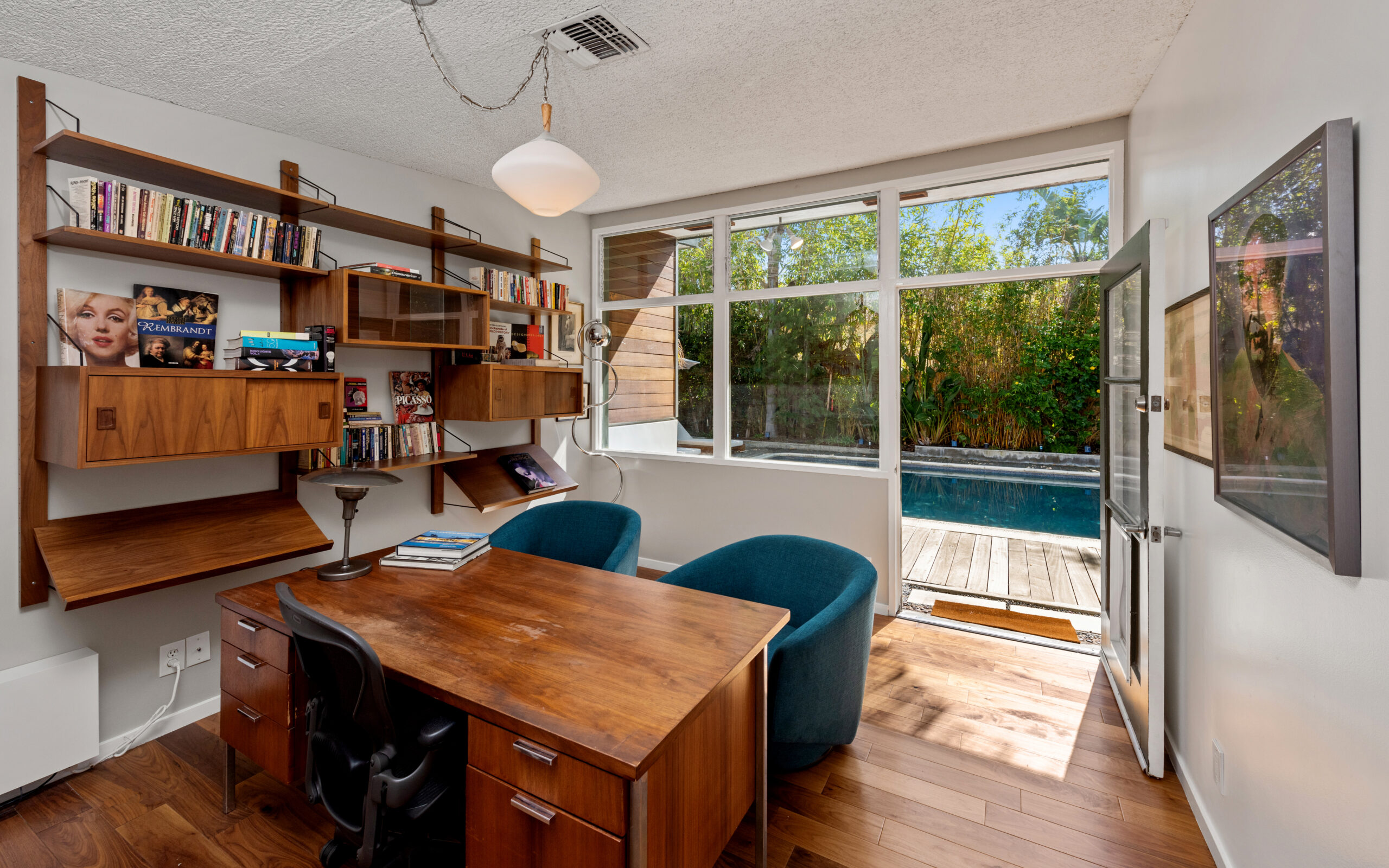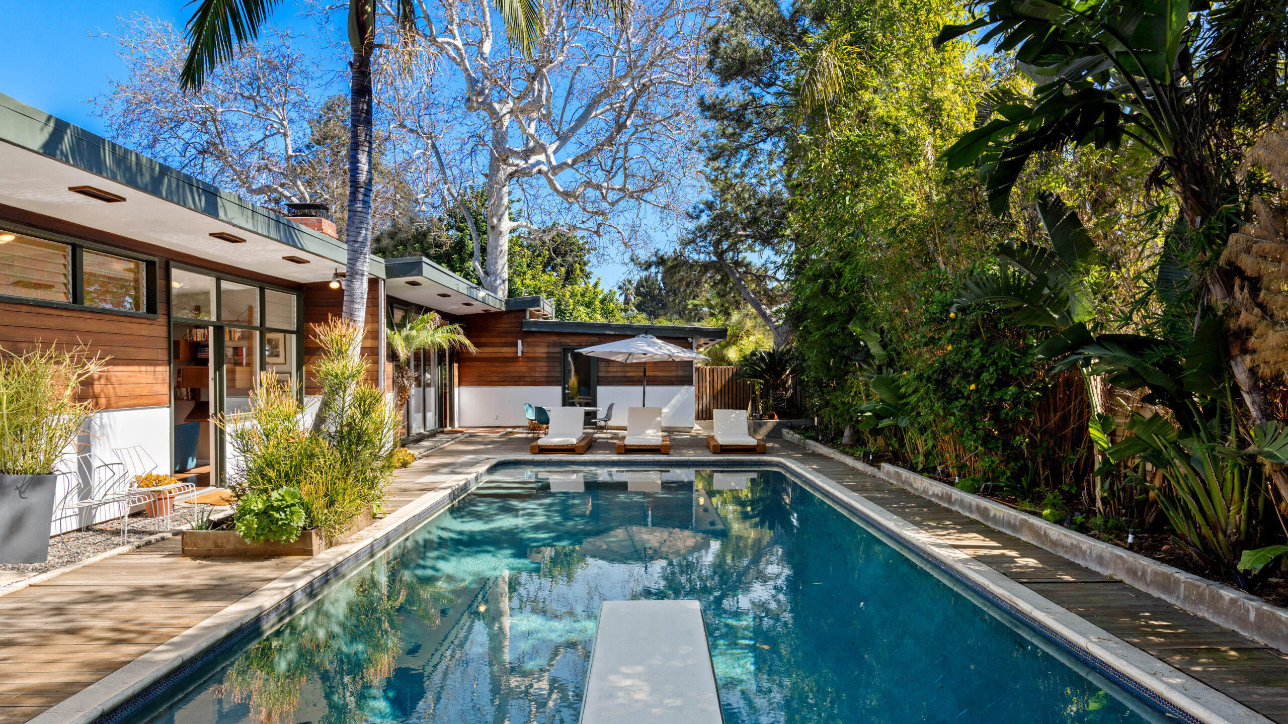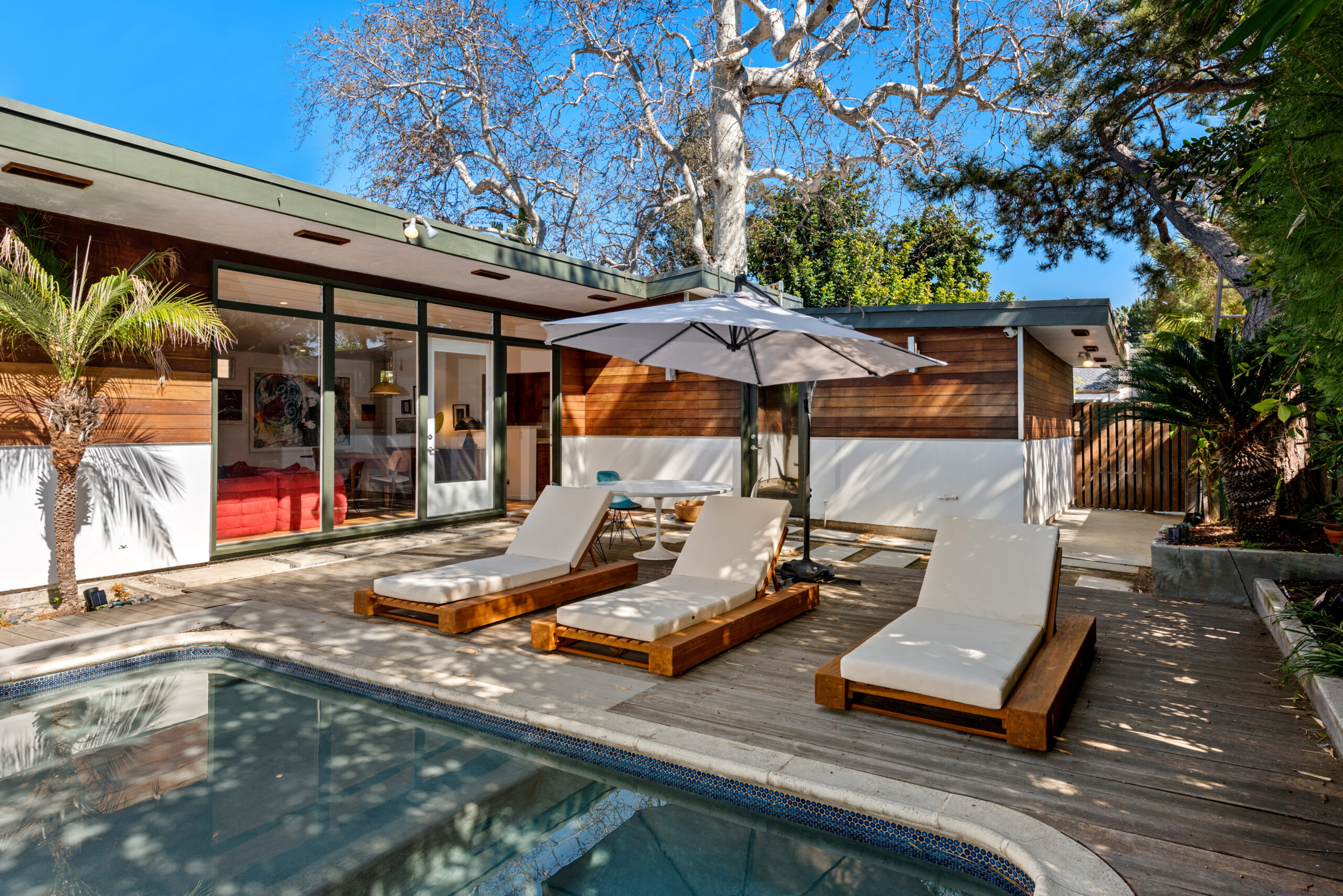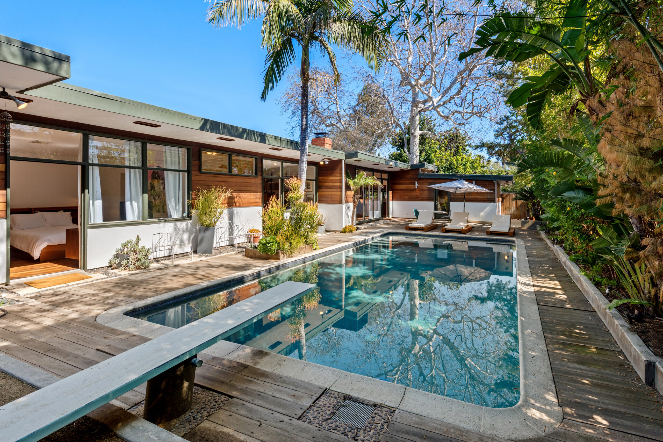 Experience the charm of this impeccably designed 3-bedroom, 2-bathroom Mid Century residence nestled on a spacious lot with a large pool in a prime North Hollywood. Set behind tall ficus, Fully private from the street discover this serene retreat boasting vintage architectural accents seamlessly blended with modern upgrades. Flooded with natural light, the airy living/dining area connects effortlessly to the well-appointed kitchen featuring vintage cabinetry, upgraded appliances, and a sunny bay herb growing window. Each bedroom offers direct access to the lush yard large pool with a baja shelf and desirable diving board, embraced by an ipe wood deck and verdant foliagean ideal setting for outdoor gatherings. The tranquil primary suite boasts generous closets and a renovated bathroom adorned with a skylight and designer touches. With off-street parking, a separate laundry room, and a garage for added convenience, this home epitomizes the quintessential California lifestyle you've been longing for.