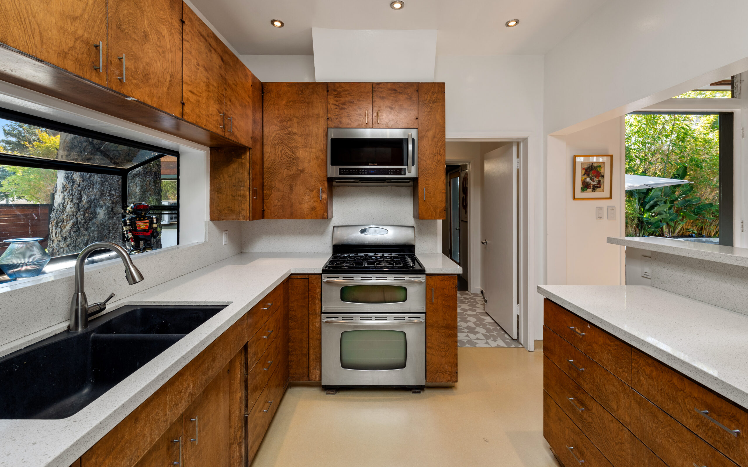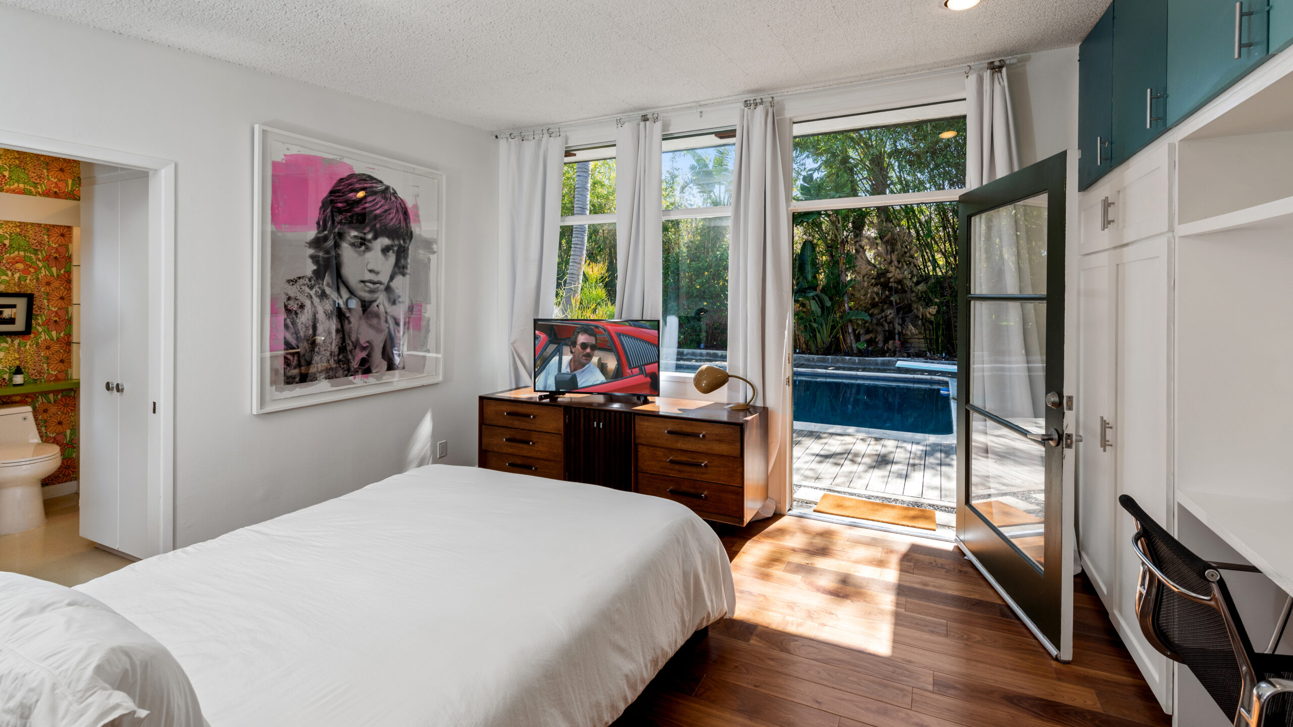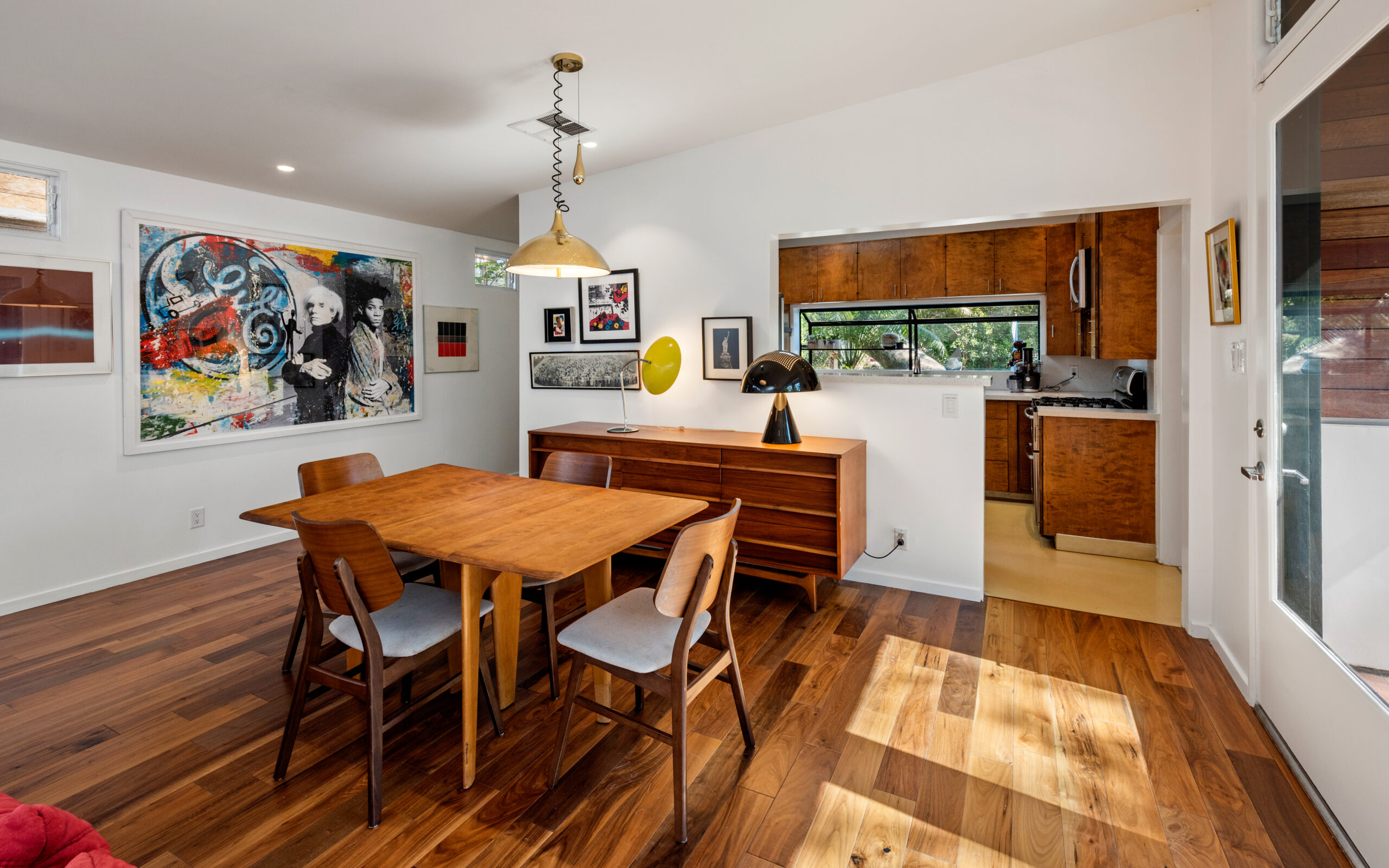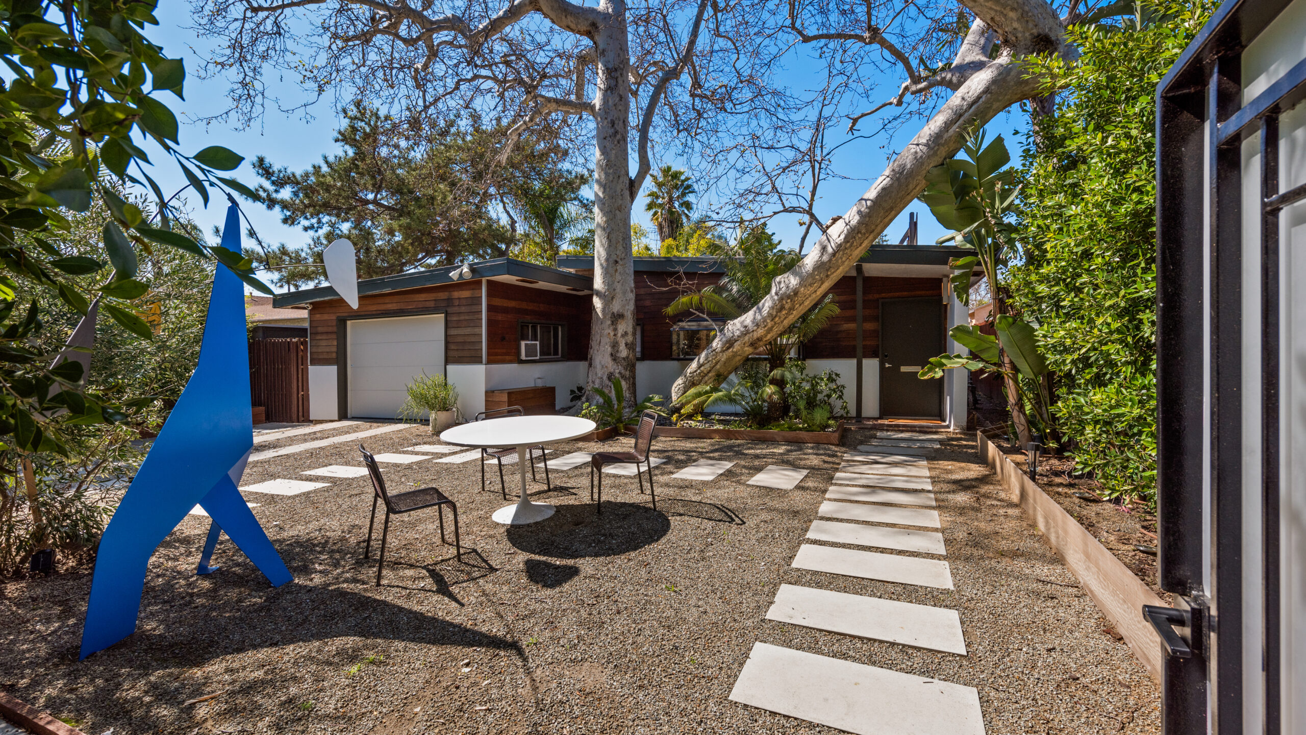 Experience the charm of this impeccably designed 3-bedroom, 2-bathroom Mid Century residence nestled on a spacious lot with a large pool in a prime North Hollywood. Set behind tall ficus, Fully private from the street discover this serene retreat boasting vintage architectural accents seamlessly blended with modern upgrades. Flooded with natural light, the airy living/dining area connects effortlessly to the well-appointed kitchen featuring vintage cabinetry, upgraded appliances, and a sunny bay herb growing window. Each bedroom offers direct access to the lush yard large pool with a baja shelf and desirable diving board, embraced by an ipe wood deck and verdant foliagean ideal setting for outdoor gatherings. The tranquil primary suite boasts generous closets and a renovated bathroom adorned with a skylight and designer touches. With off-street parking, a separate laundry room, and a garage for added convenience, this home epitomizes the quintessential California lifestyle you've been longing for.
