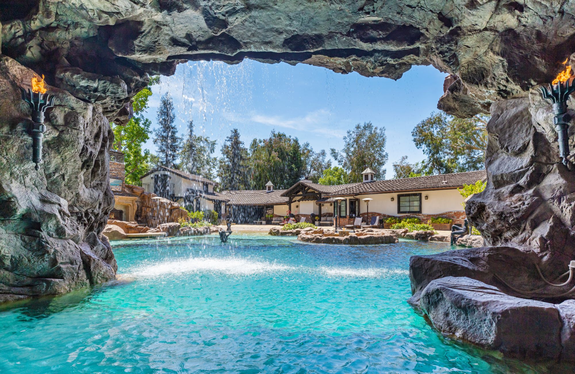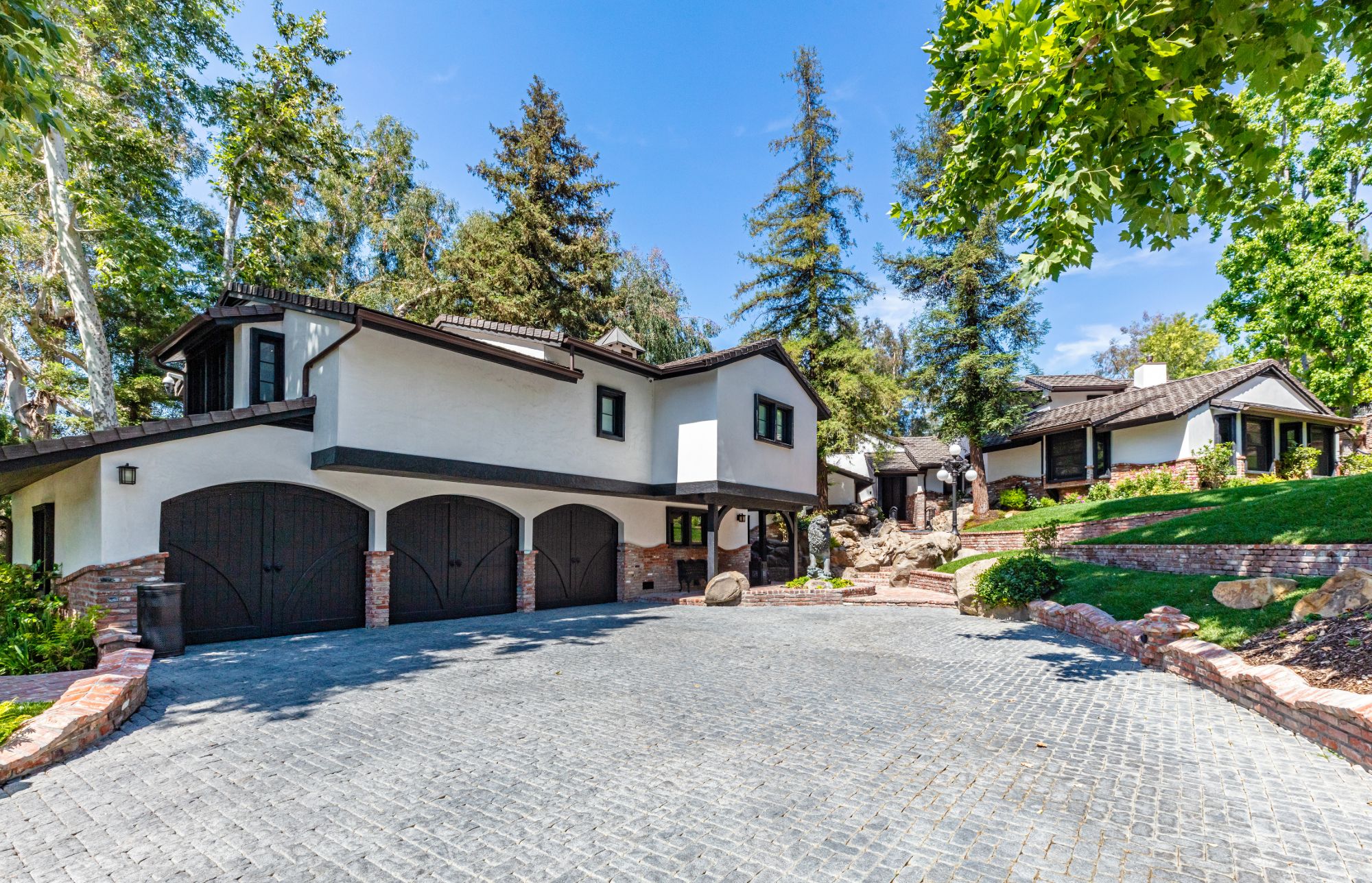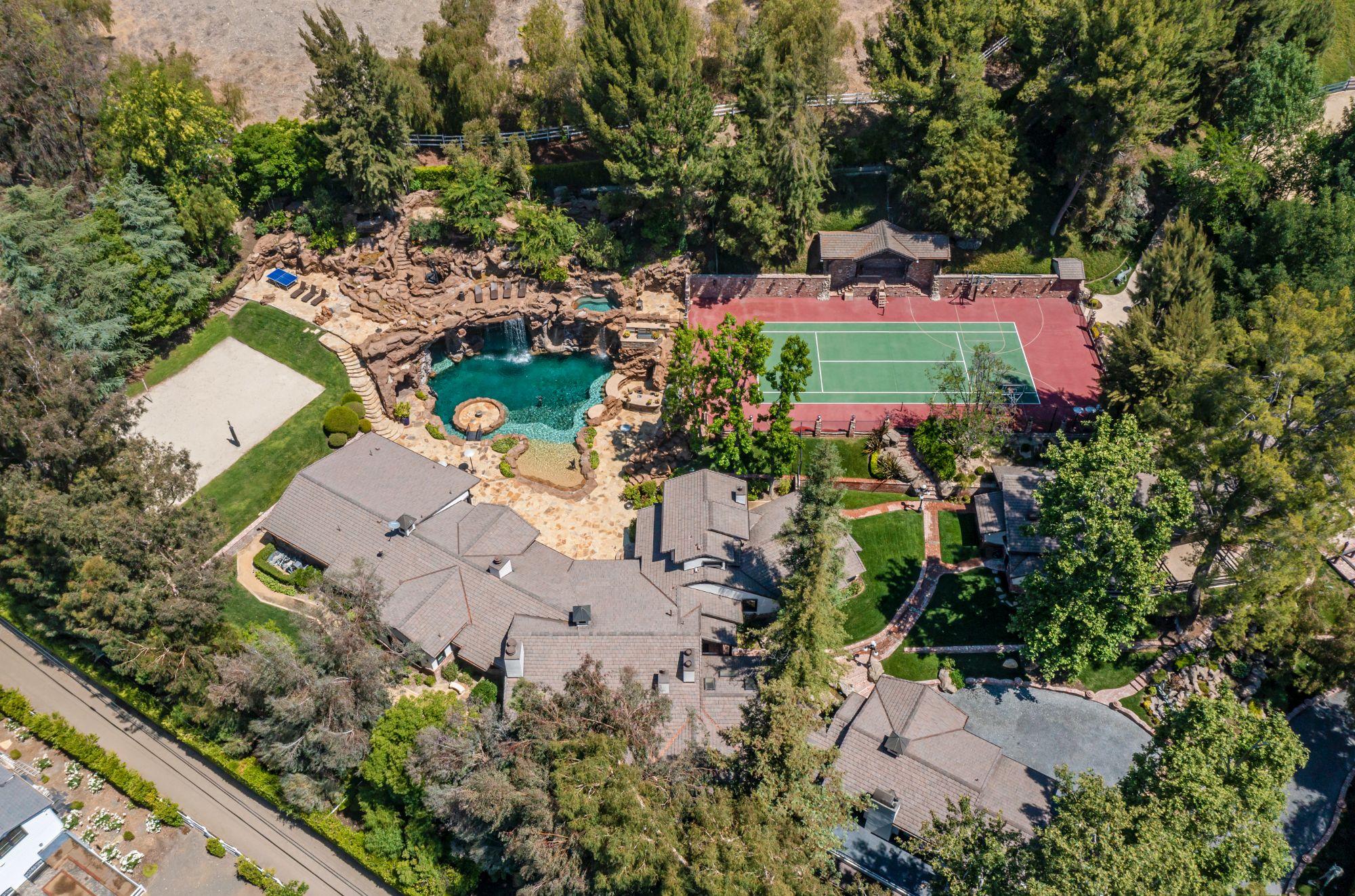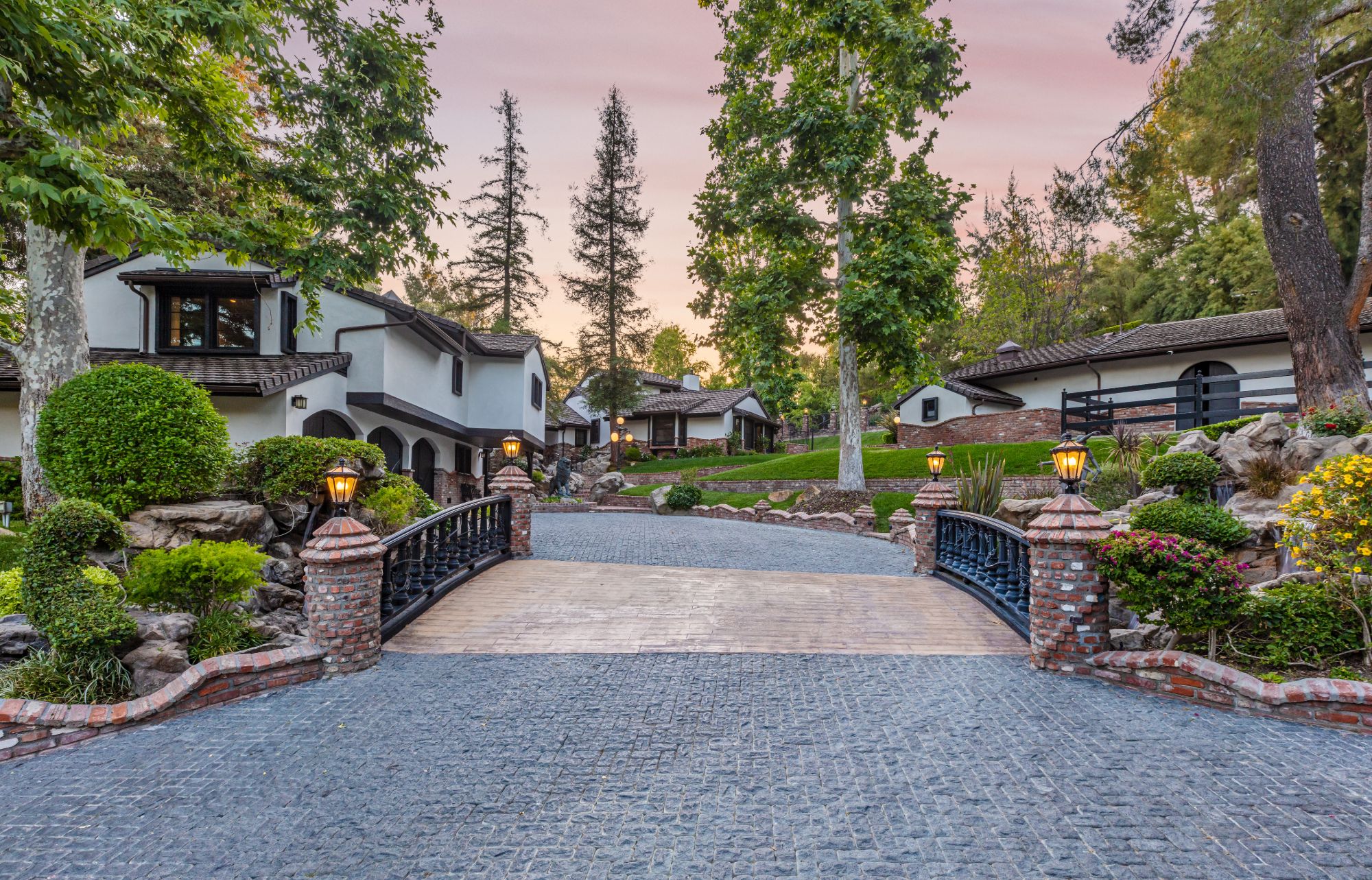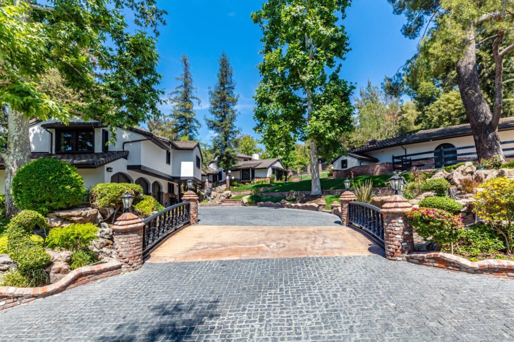 The Yolo Estate—a jaw-dropping 3 acre resort-style home tucked away in the ultra-exclusive, guard-gated enclave of Hidden Hills. Set on a private cul-de-sac & surrounded by equestrian trails, this English Tudor is the perfect blend of rustic charm & modern convenience. The 12,500SF home features coffered & beamed ceilings, 6 fireplaces & an exquisite wine cellar w/separate tasting room. A wood-paneled bookshelf opens to reveal a nearly 2,000SF primary suite w/luxurious partners spa ft. marble surrounded soaking tubs & dual vanities. Retreat to your private oasis boasting massive swimming pool w/spa grotto, swim-up bar, cascading waterfalls, an 80ft-long rock waterslide & surrounded by TVs to watch the big game or enjoy a float-in movie. Estate also offers a champion tennis/basketball court, sand volleyball court, horse stable & equestrian ring, a mechanical riding bull & 25-seat theater. Have every amenity at your fingertips while you live & entertain in this star-studded community.