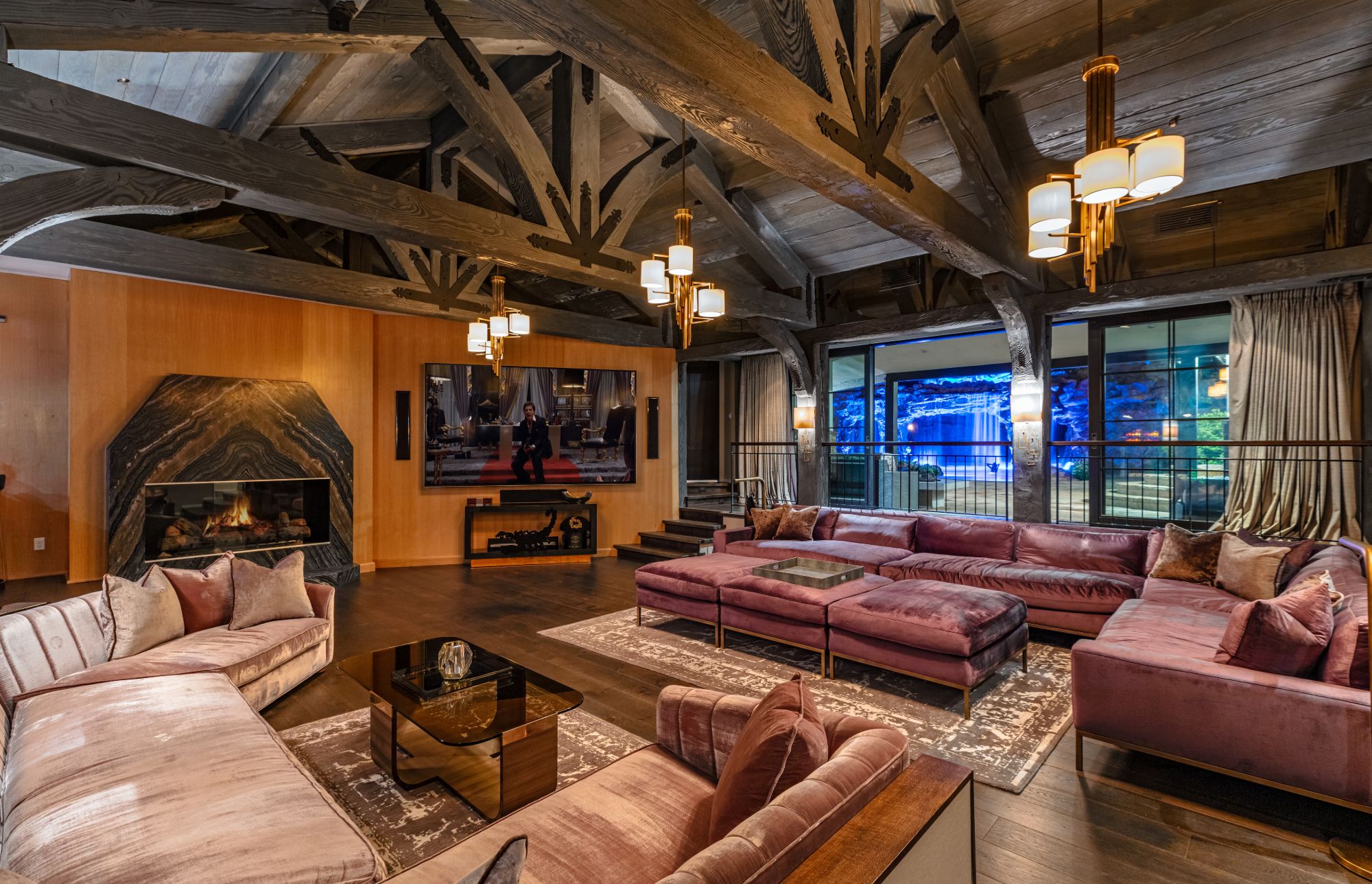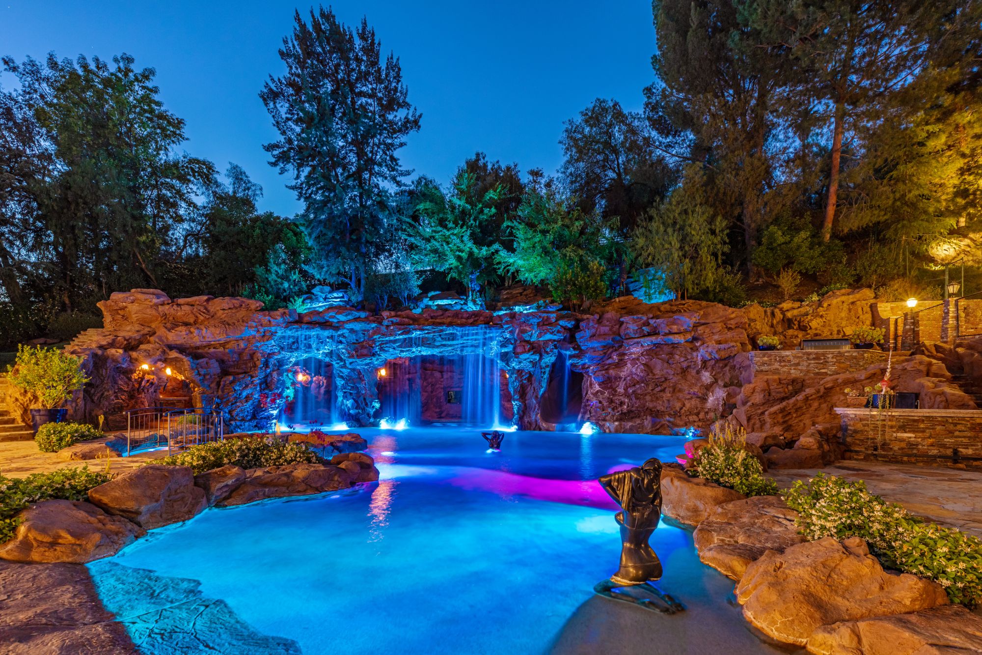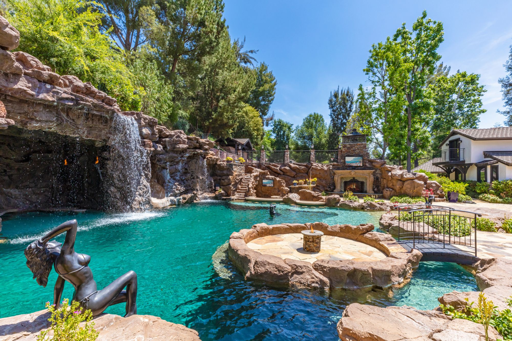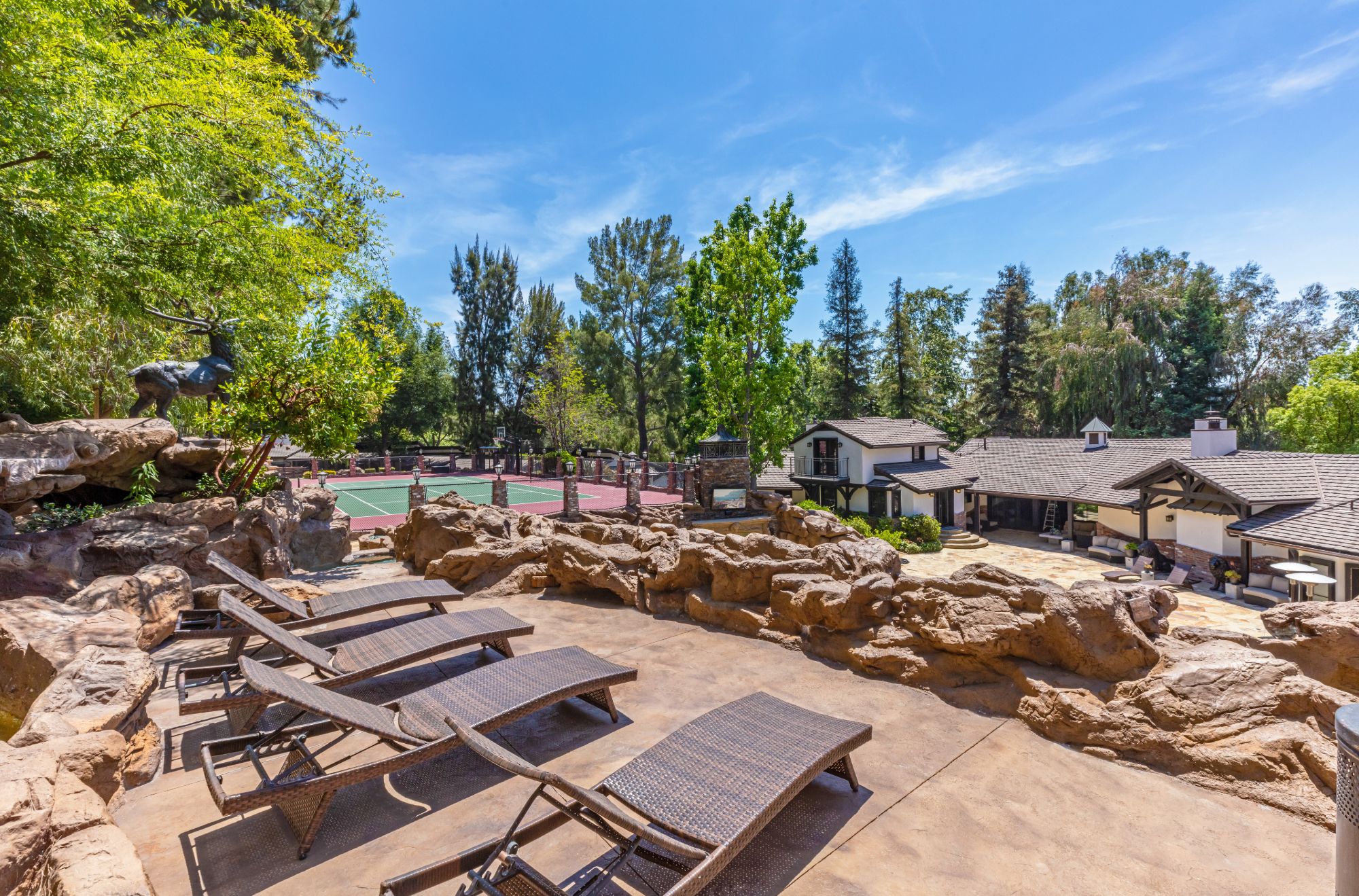 The Yolo Estate—a jaw-dropping 3 acre resort-style home tucked away in the ultra-exclusive, guard-gated enclave of Hidden Hills. Set on a private cul-de-sac & surrounded by equestrian trails, this English Tudor is the perfect blend of rustic charm & modern convenience. The 12,500SF home features coffered & beamed ceilings, 6 fireplaces & an exquisite wine cellar w/separate tasting room. A wood-paneled bookshelf opens to reveal a nearly 2,000SF primary suite w/luxurious partners spa ft. marble surrounded soaking tubs & dual vanities. Retreat to your private oasis boasting massive swimming pool w/spa grotto, swim-up bar, cascading waterfalls, an 80ft-long rock waterslide & surrounded by TVs to watch the big game or enjoy a float-in movie. Estate also offers a champion tennis/basketball court, sand volleyball court, horse stable & equestrian ring, a mechanical riding bull & 25-seat theater. Have every amenity at your fingertips while you live & entertain in this star-studded community.