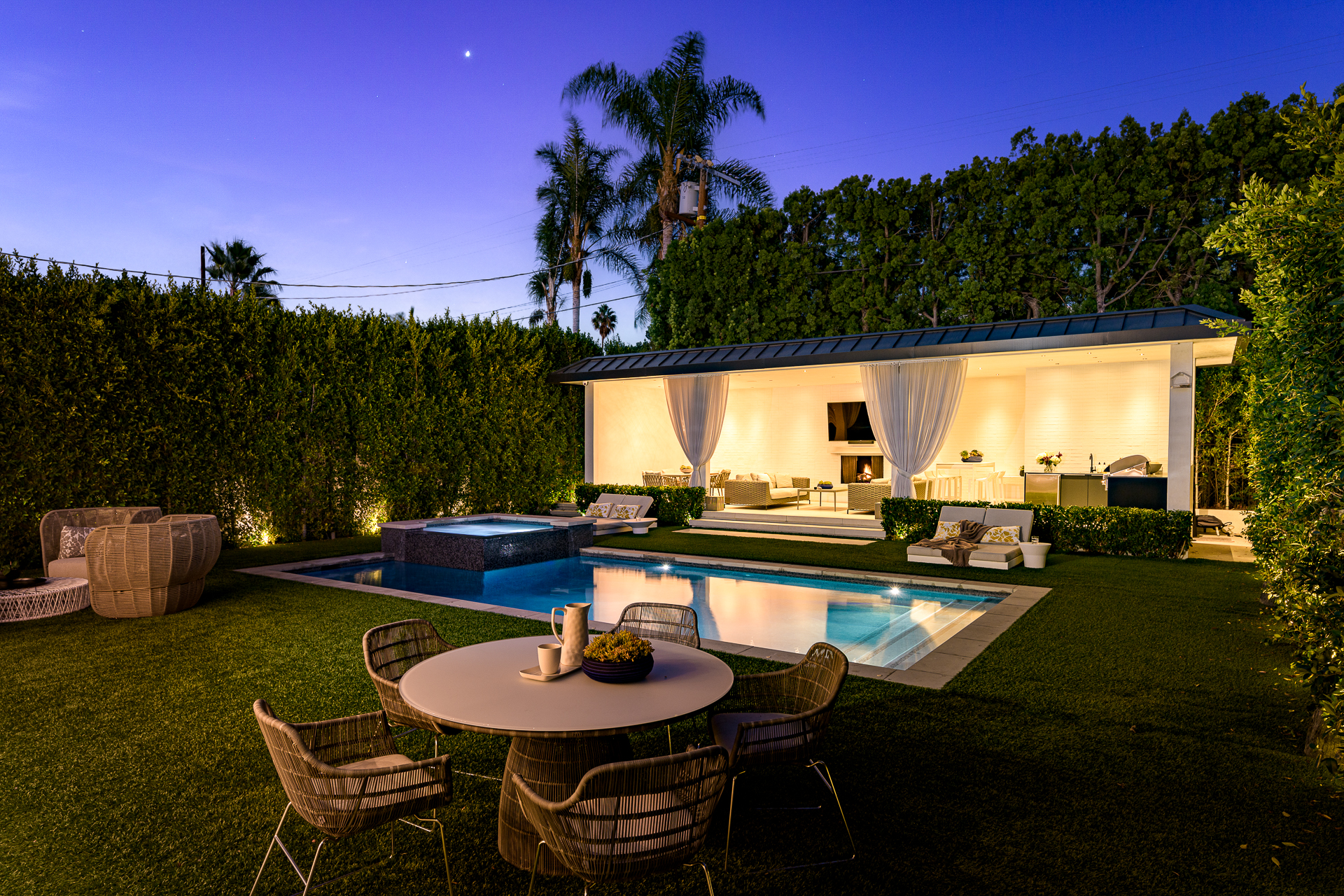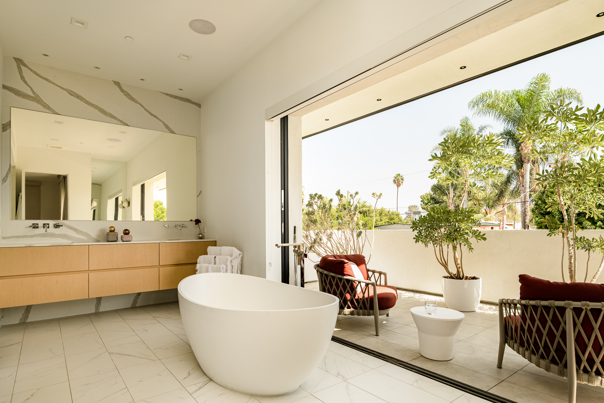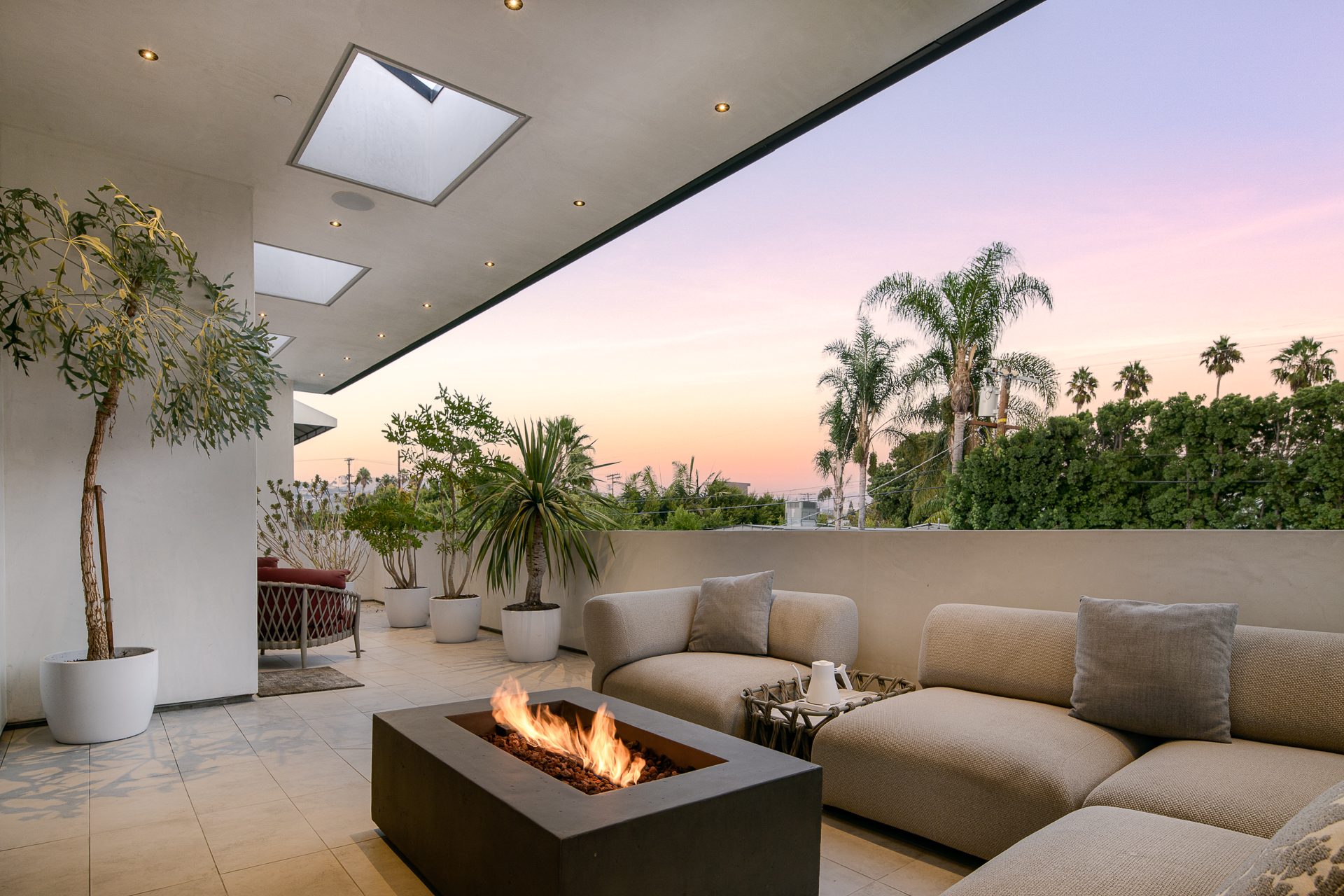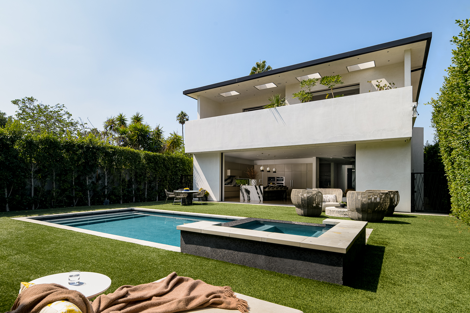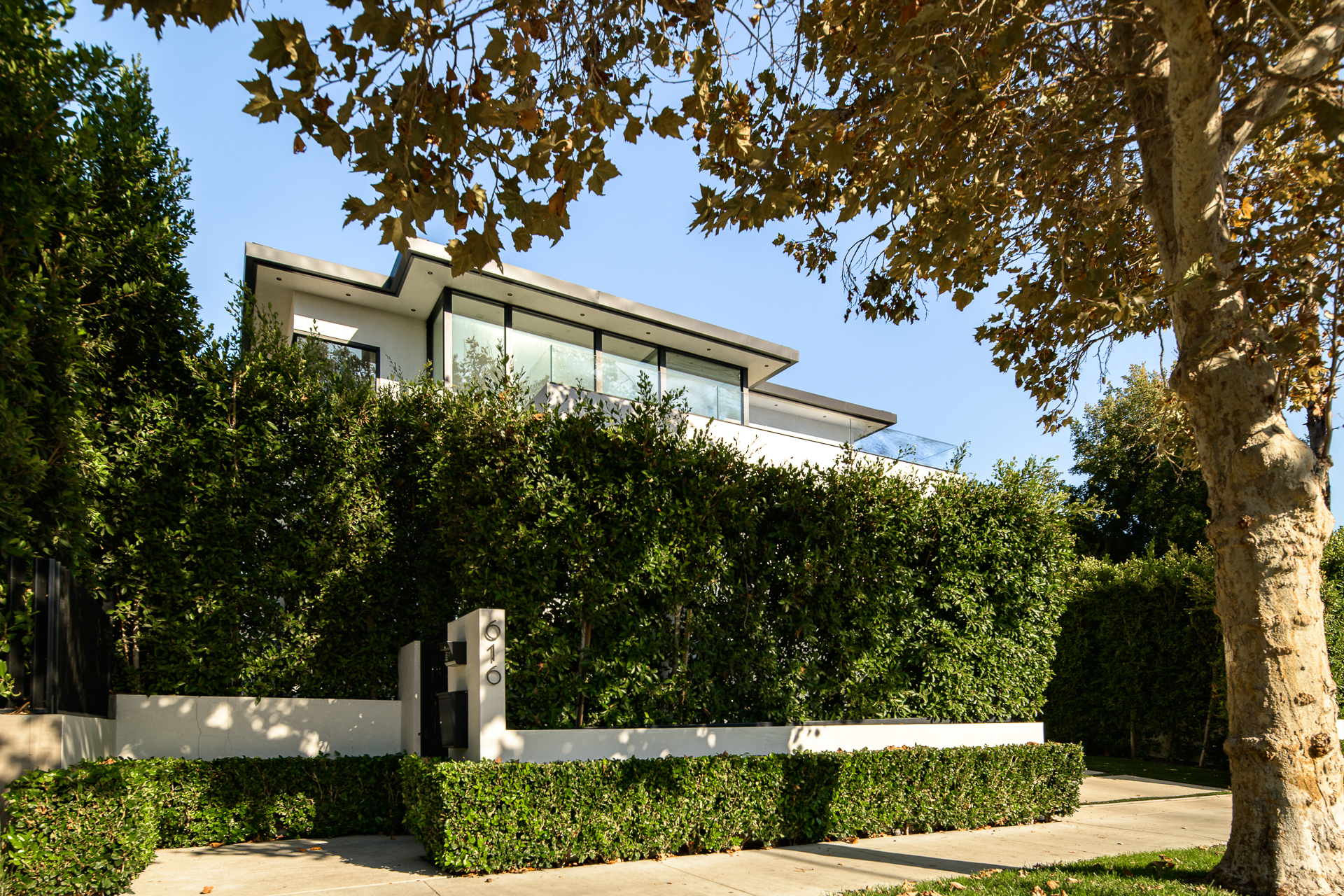 Experience the ultimate privacy, elegance, and prestige in this warm contemporary home set on a rare, oversized, approx 8,228-sqft lot in Melrose Village. Behind lush privacy hedges, natural light and serenity fill every corner of this resort-like oasis where todays design meets the finest organic finishes such as French oak floors. Sophisticated, architectural exterior features a metal roof, white brick walls, and a 10-ft pivot door. Sun-splashed, approx 4,676-sqft of living spaces boasts captivating flowing open floor plan and entertaining features. Wine room, formal dining with a wet bar, entertainers Italian kitchen, and a sensational living room with a fireplace flow together seamlessly. Walls of glass open to spectacular outdoor entertaining spaces, including a well-landscaped terrace, pool, spa, a guest cabana with kitchen, al fresco dining, lounge area by the fireplace, and bathroom. 5 en-suite bedrooms and 7 bathrooms include 3 en-suites upstairs with private balconies and views. The extravagant primary suite features a designer closet, luxurious home spa, private patio, and a fire pit. Lutron-powered smart home with media, security, and dual-zone climate control. Family-friendly. An unrivaled home in the most coveted enclave of culture and entertainment.