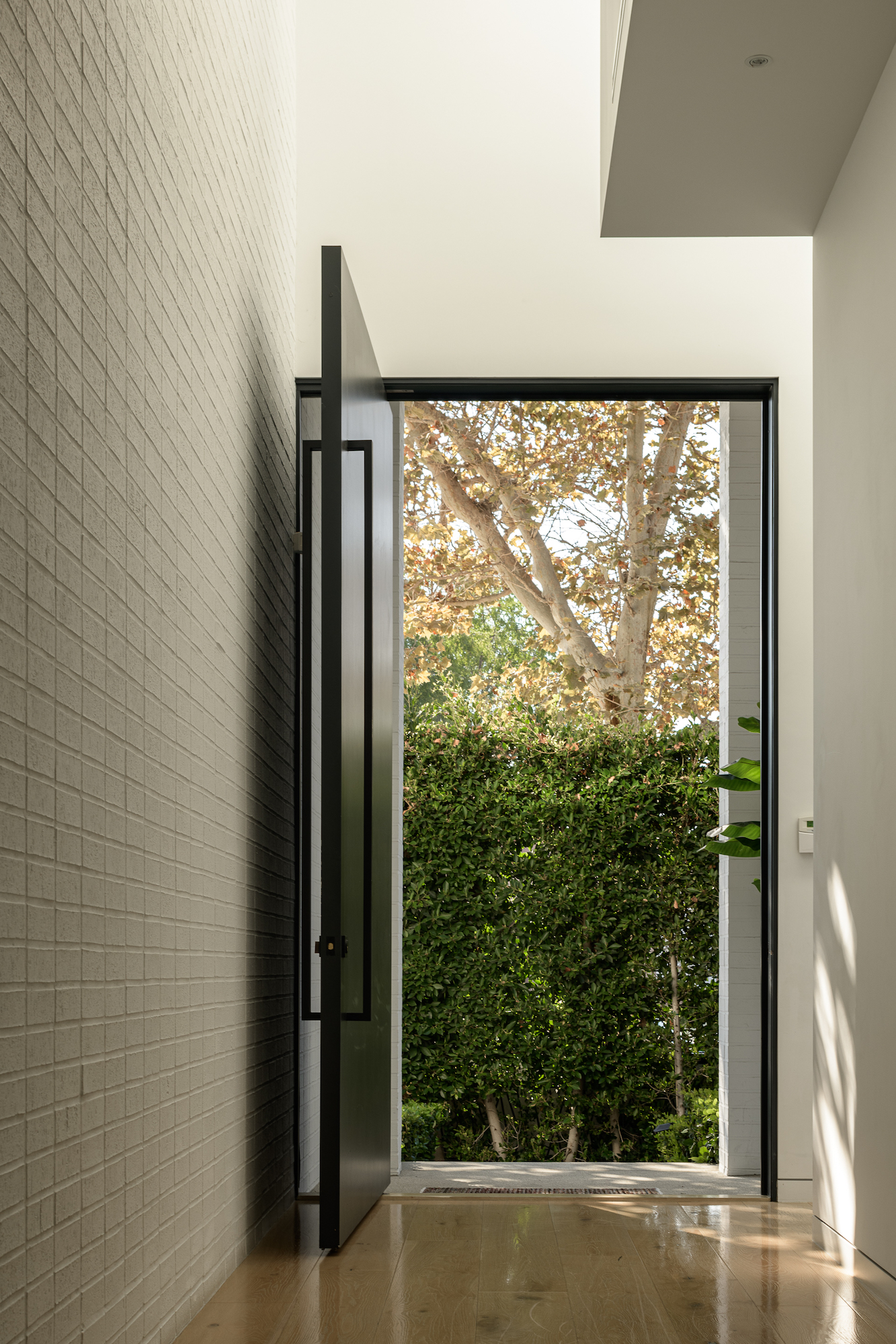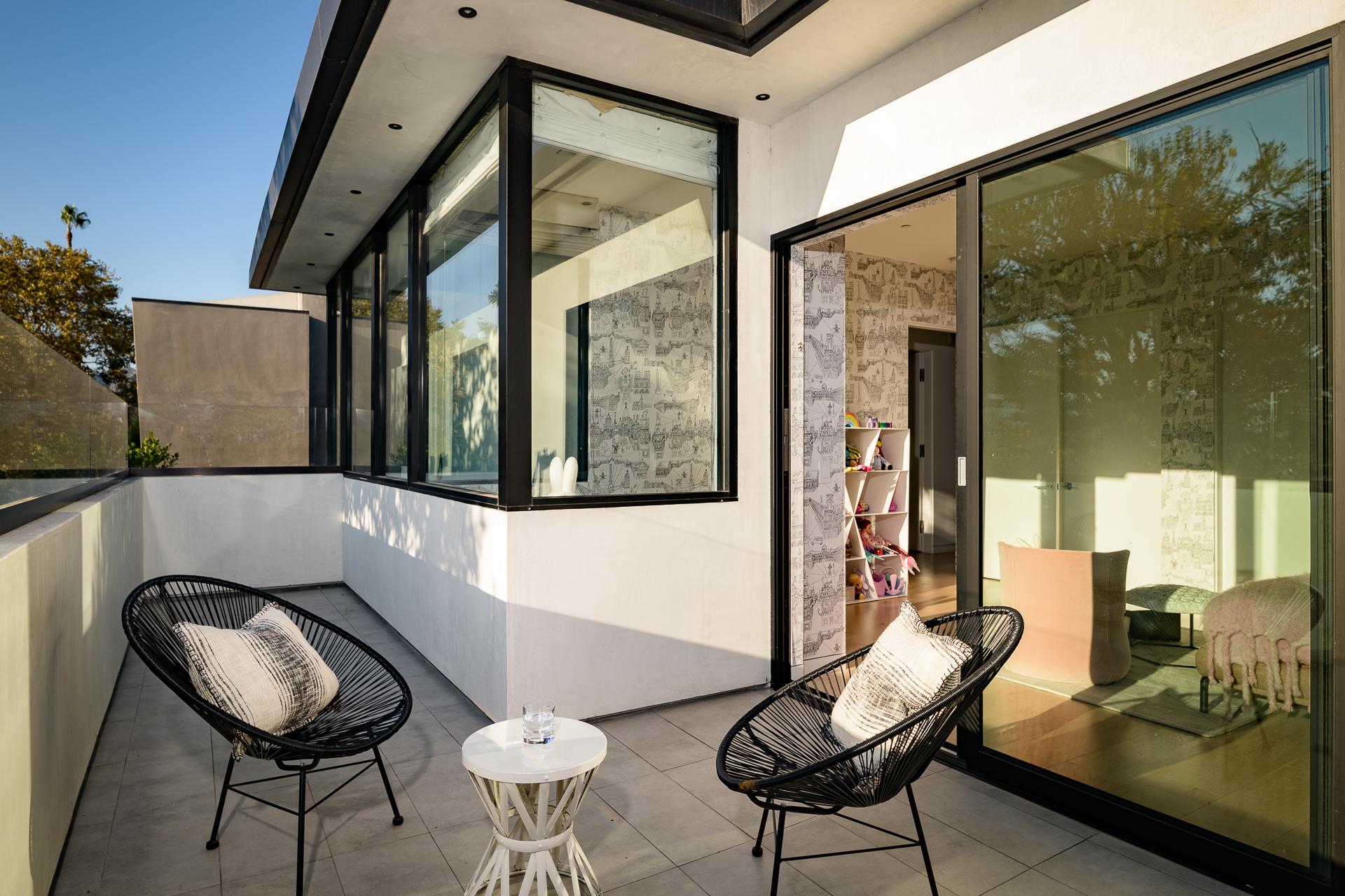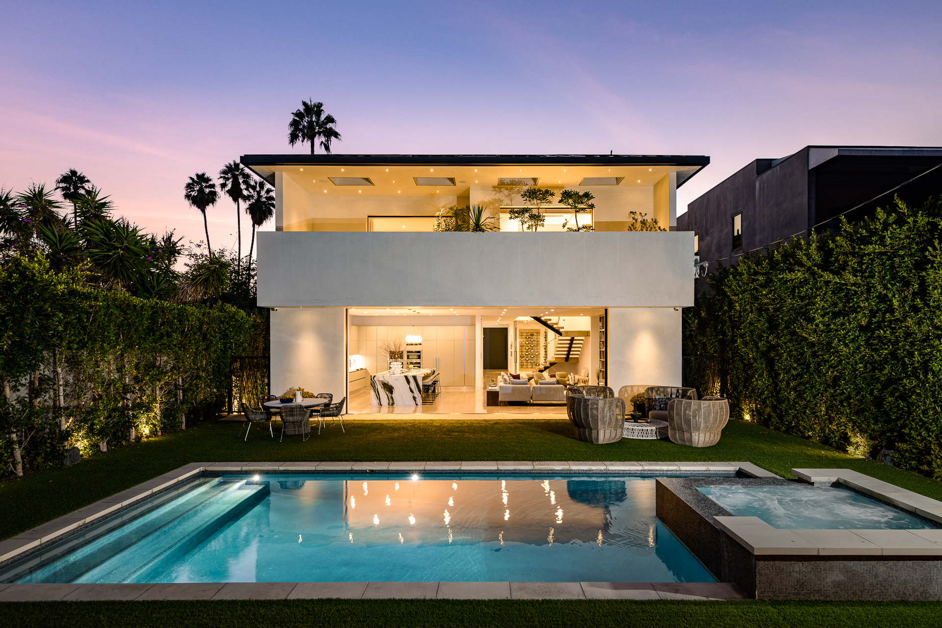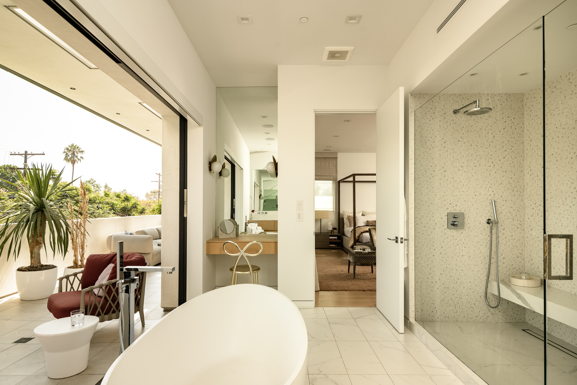Experience the ultimate privacy, elegance, and prestige in this warm contemporary home set on a rare, oversized, approx 8,228-sqft lot in Melrose Village. Behind lush privacy hedges, natural light and serenity fill every corner of this resort-like oasis where todays design meets the finest organic finishes such as French oak floors. Sophisticated, architectural exterior features a metal roof, white brick walls, and a 10-ft pivot door. Sun-splashed, approx 4,676-sqft of living spaces boasts captivating flowing open floor plan and entertaining features. Wine room, formal dining with a wet bar, entertainers Italian kitchen, and a sensational living room with a fireplace flow together seamlessly. Walls of glass open to spectacular outdoor entertaining spaces, including a well-landscaped terrace, pool, spa, a guest cabana with kitchen, al fresco dining, lounge area by the fireplace, and bathroom. 5 en-suite bedrooms and 7 bathrooms include 3 en-suites upstairs with private balconies and views. The extravagant primary suite features a designer closet, luxurious home spa, private patio, and a fire pit. Lutron-powered smart home with media, security, and dual-zone climate control. Family-friendly. An unrivaled home in the most coveted enclave of culture and entertainment.