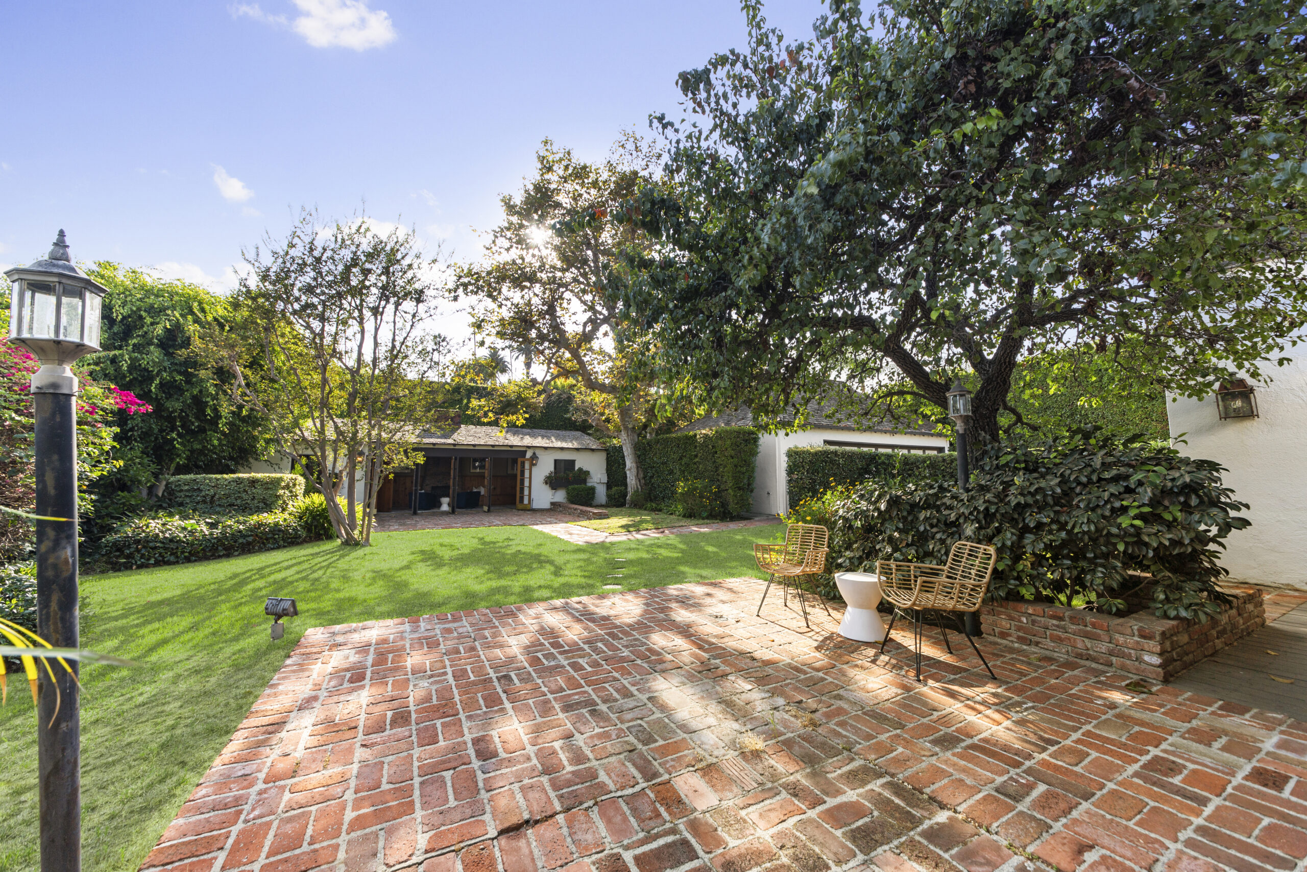 Nestled on an iconic street in the prestigious Beverly Hills Flats, this charming traditional estate offers 4 bedrooms and 3.5 bathrooms, blending timeless elegance with comfort. The formal living room features original hardwood floors and large picture windows that flood the space with natural light. Adjacent is the inviting family room, complete with warm wood-paneled walls and a built-in bar, creating a cozy atmosphere for relaxation or entertaining. The refined dining room leads into a kitchen that includes a butler's pantry and a breakfast nook, offering a classic and functional layout. Upstairs, the primary suite boasts dual walk-in closets, a private office, and an ensuite bathroom, providing a serene retreat. Two additional bedrooms complete the upper floor, each thoughtfully designed for comfort.The expansive, grassy backyard provides ample space for outdoor entertaining or peaceful relaxation. A detached two-car garage includes a laundry room, generous storage, and a workshop for added convenience. Located just minutes from the Beverly Hills Hotel, Rodeo Drive, and the best of Beverly Hills, this home captures the essence of elegant living in one of the city's most sought-after neighborhoods.