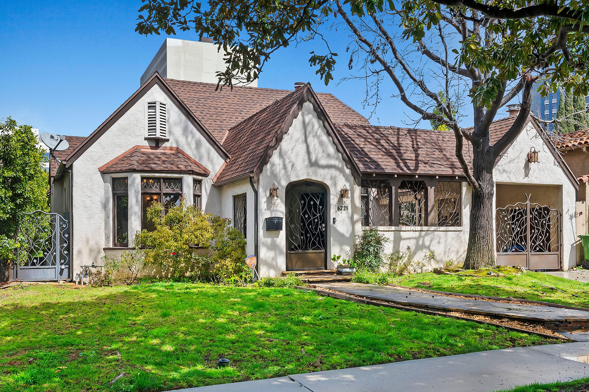 This stunning Tudor-style home is located in the historic Carthay Circle neighborhood incredible opportunity to own a converted Mills Act home. It boasts a beautiful private courtyard accessed through a gated entryway, as well as leaded-glass accents, a grand living room with a vaulted ceiling and floor-to-ceiling windows, a wet bar, and a formal dining room. The kitchen is a chef's dream with high-end Elite appliances, custom cabinetry and built-ins, a custom breakfast nook, and a vaulted beamed ceiling. A dramatic main hall leads to the primary suite, a guest en-suite, a bedroom, and a separate marble bath with mosaic tile accents. The property also features a private rear patio with a pergola and a "bonus" guesthouse with a private bath, gas hook-up, and additional storage, all situated on a spacious 7,500-square-foot lot. This home is truly outstanding and an excellent value.