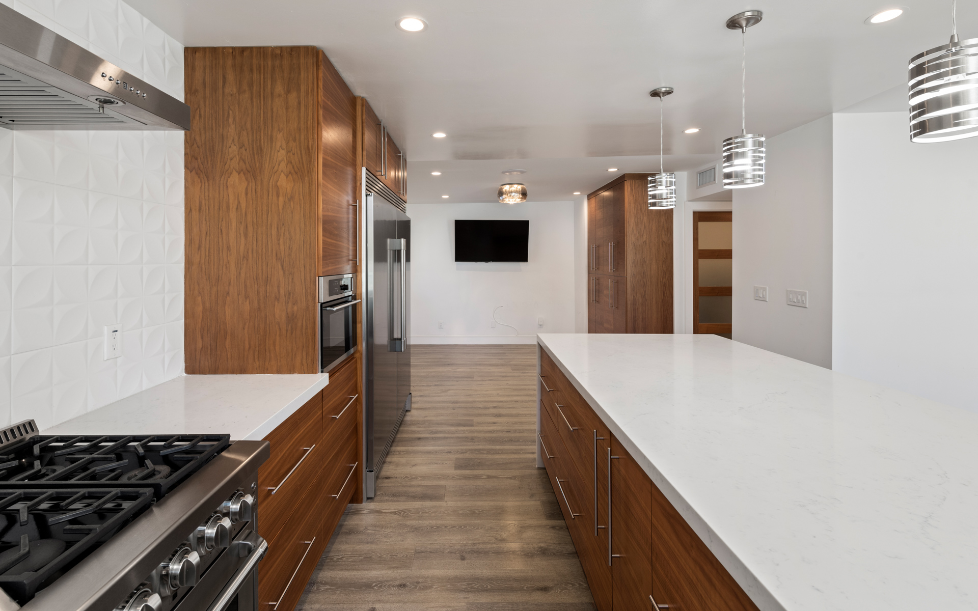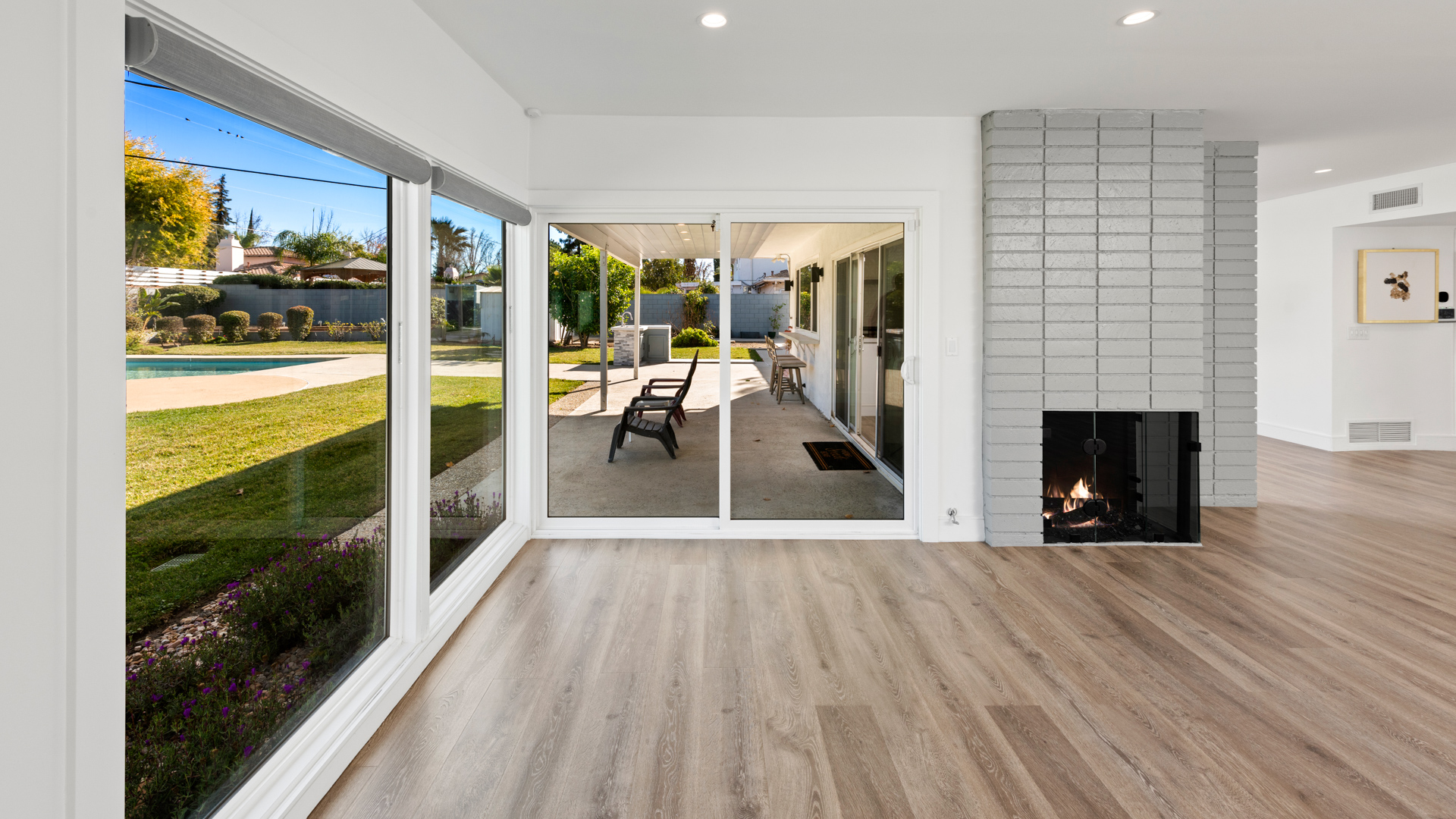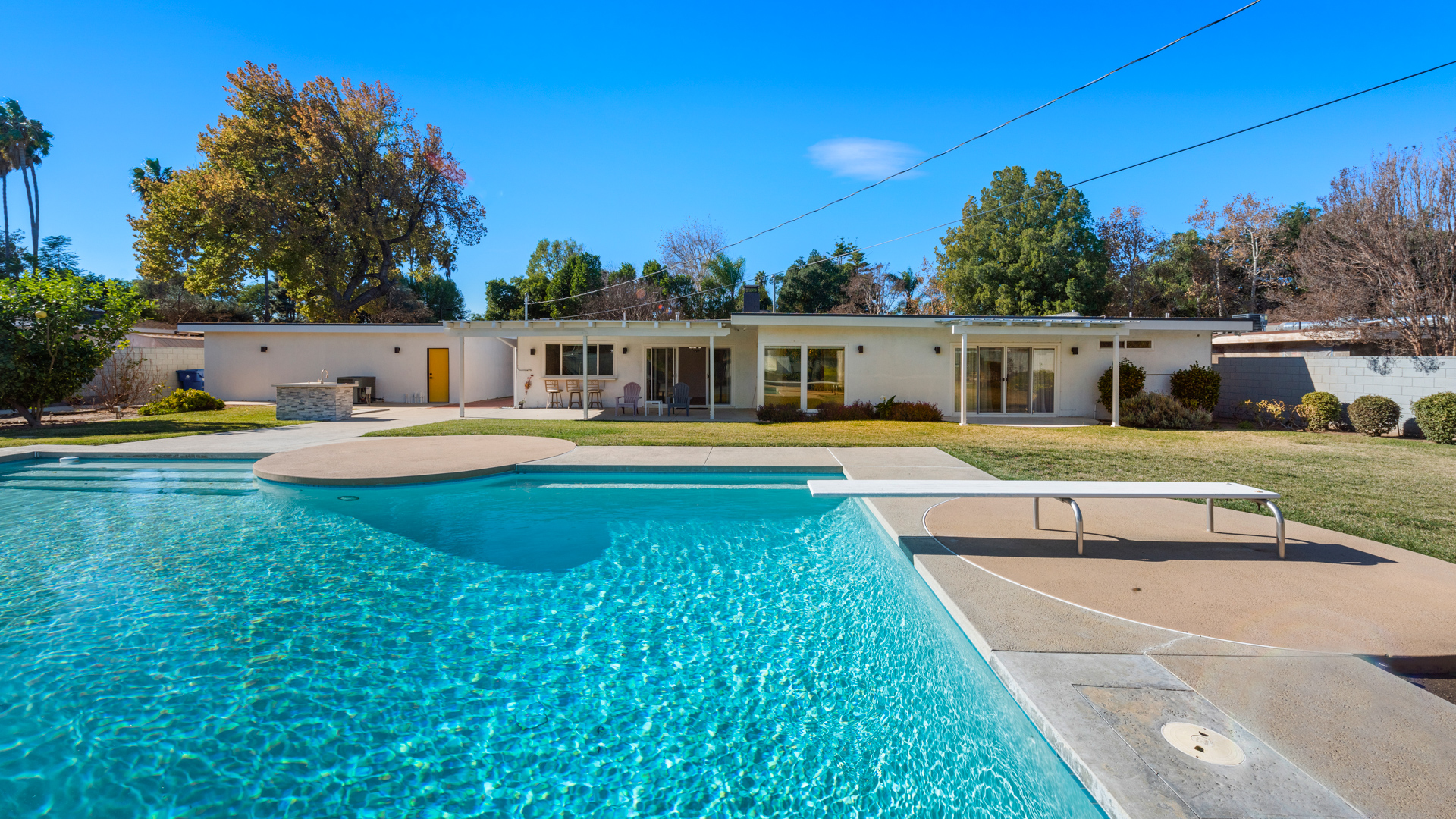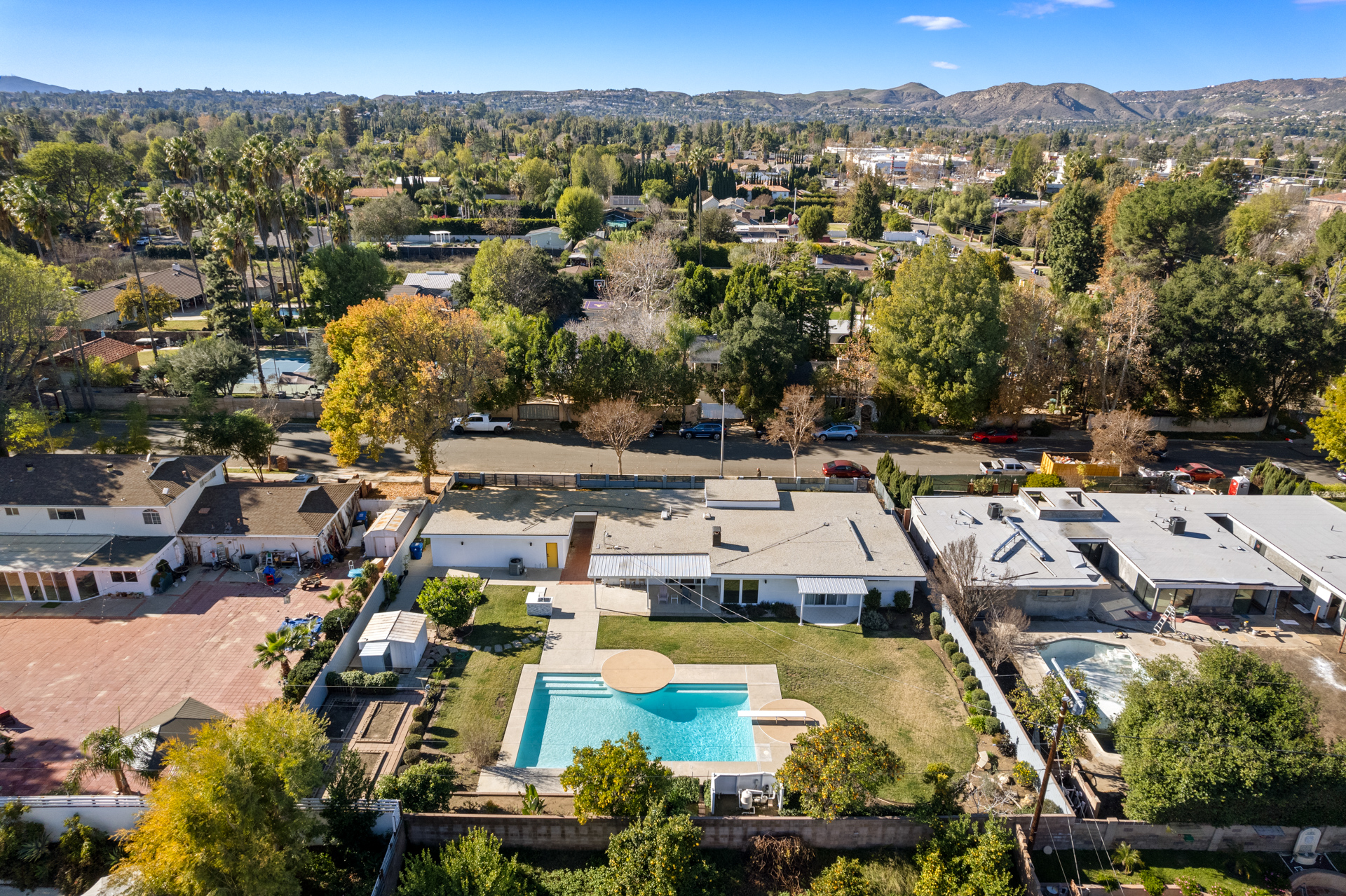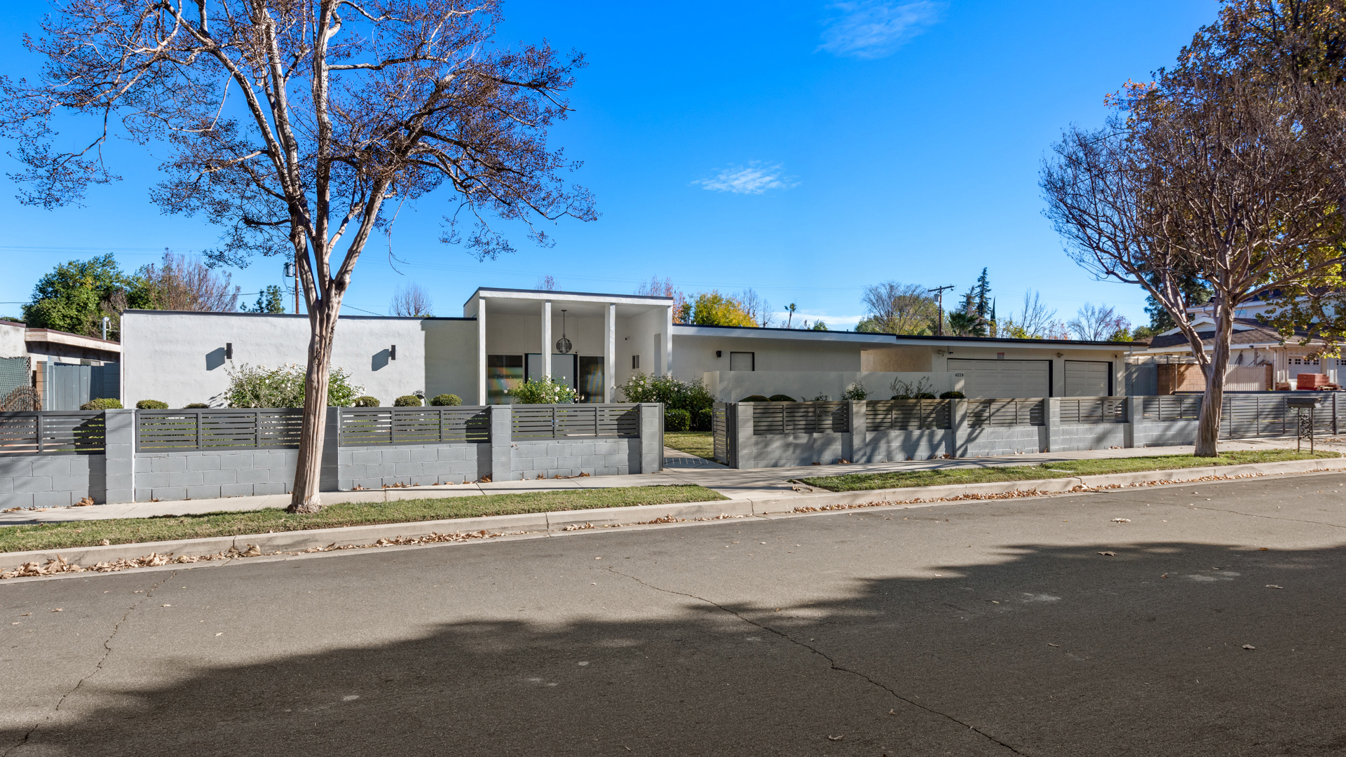 Welcome to this re-imagined Mid-Century Modern house in Woodland Hills located just minutes from the Westfield Mall/Topanga Village and local amenities. This gated 3 bedroom 3 bath home features an open living area with wood-burning fireplace, floor-to-ceiling windows & doors that open up to the spacious back yard complete with large pool, mature fruit trees, expansive garden area & large grassy lawn perfect for entertaining. Enjoy the welcoming dining room, family room, full bath & custom kitchen feat. walnut cabinetry, luxury stainless steel appliances and quartz countertops. The other side of this home has 3 generously sized bedrooms including a gorgeous primary suite w/walk-in closet & bath complete with dual showers, separate bathtub & dual vanities. Additional features include new electrical, new LED lighting, security cameras, 3-car garage & a smart home system that controls the lights, a whole-home sound system, and HVAC, etc. This is a great opportunity to own a mid-century home on a spacious lot.