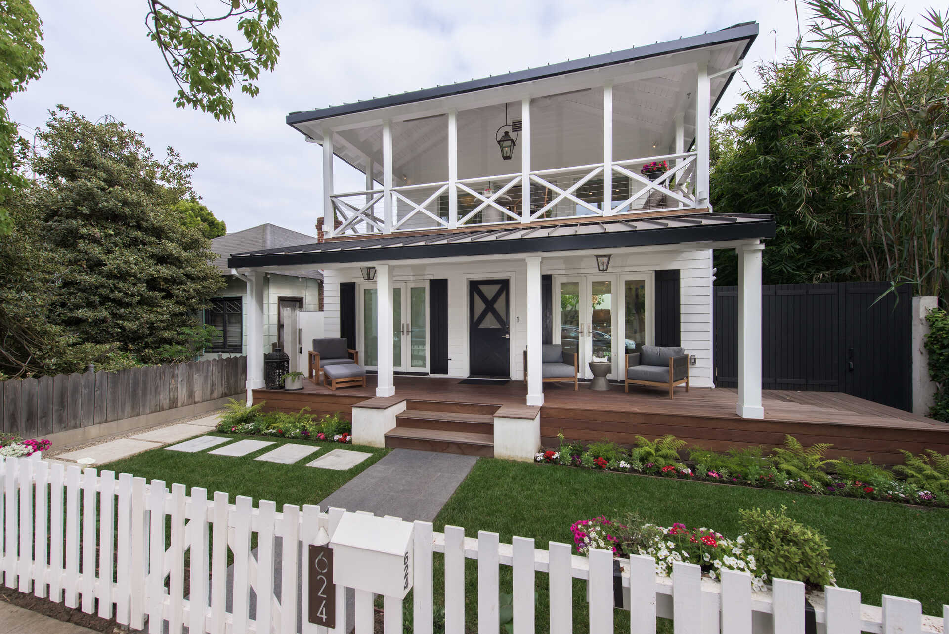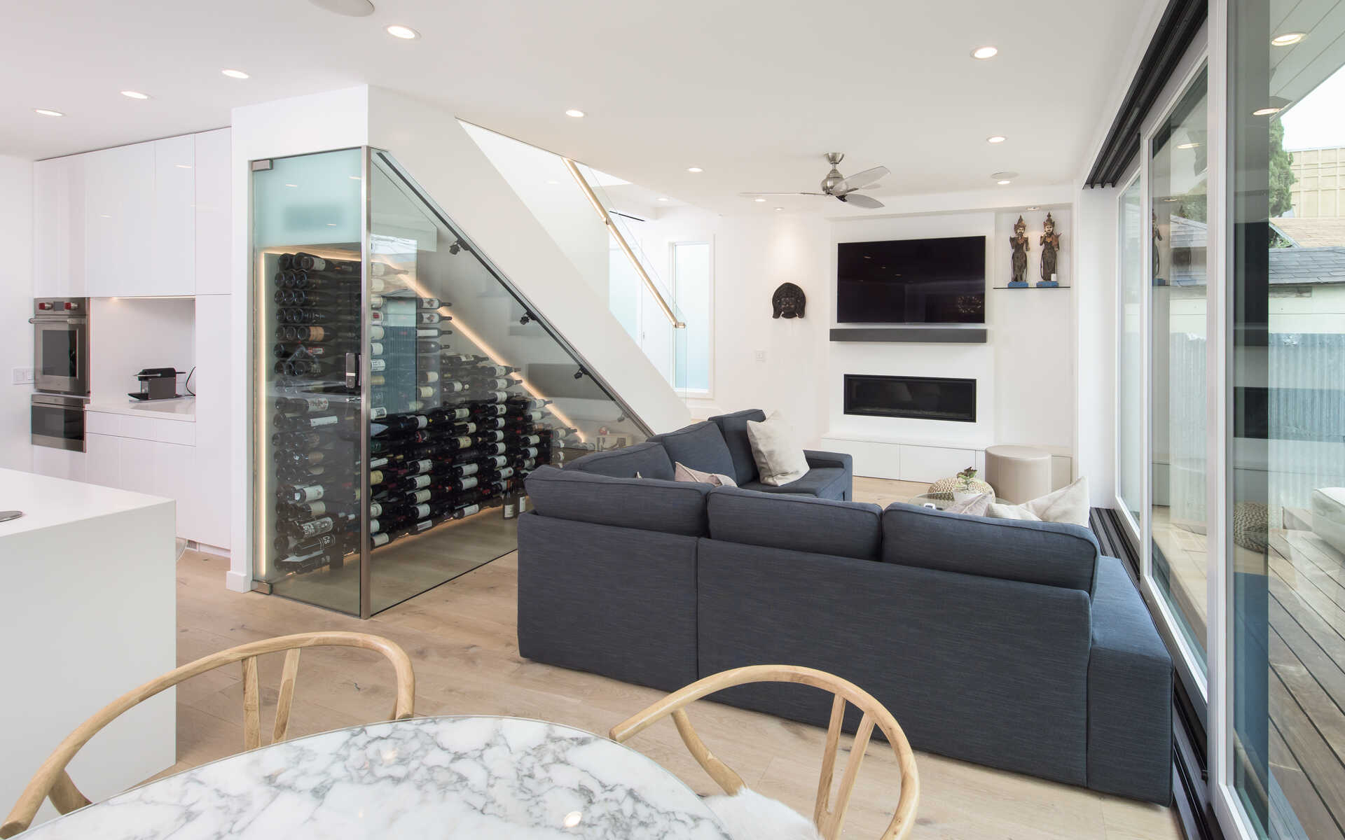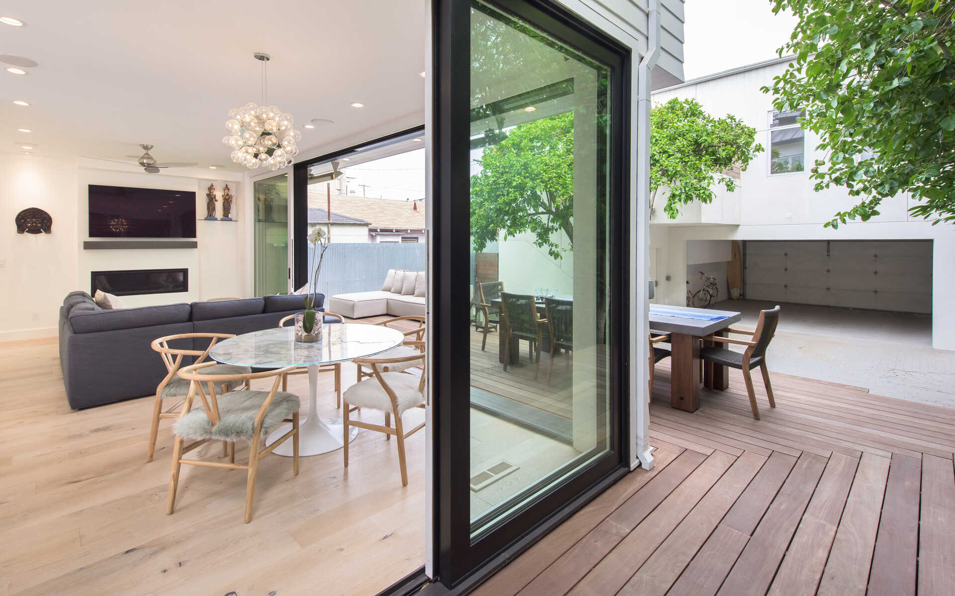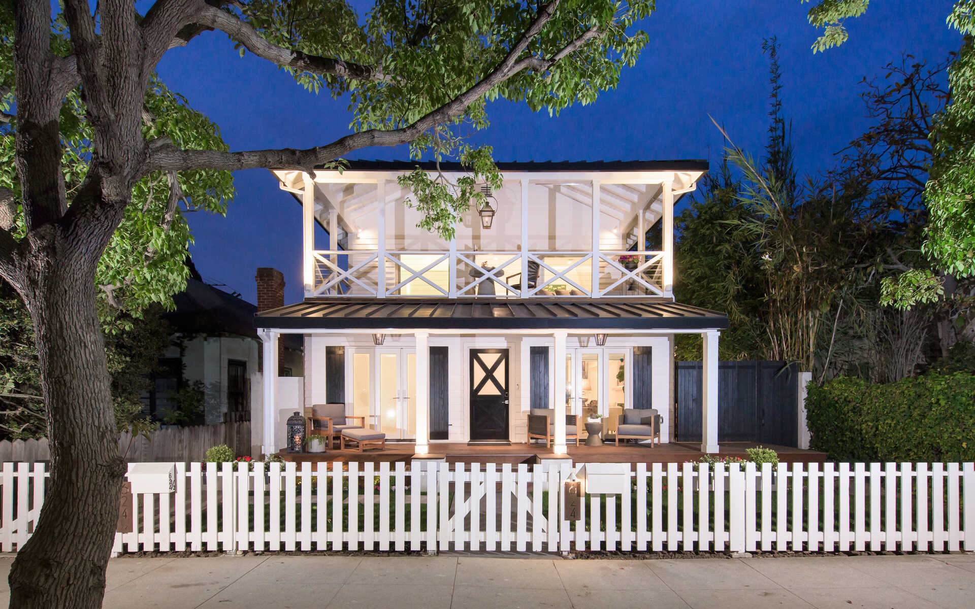 Stunning California Craftsman in the heart of Venice which blends traditional and contemporary architecture by the renown Julie Hart with classic southern design. Enter into a seamless style featuring European white oak flooring, monochromatic Caesar stone countertops in a sprawling open kitchen with impressive cabinetry throughout. Effortless entertaining with dual living spaces with a statement see-through, backlit wine cellar, three fireplaces and Marvin pocket sliding doors to embrace the indoor-outdoor theme of SoCal living. Downstairs is comprised of a full private bedroom and bath with the additional bedrooms and office nook on the second floor. Upstairs you will find a serene primary suite, with a state of the art walk in closet, and an impressive large private covered balcony. This home is framed by 800 sqft of IPE wrap-around veranda for transitional beach-side living. A truly unique gem in the heart of Venice you must see.