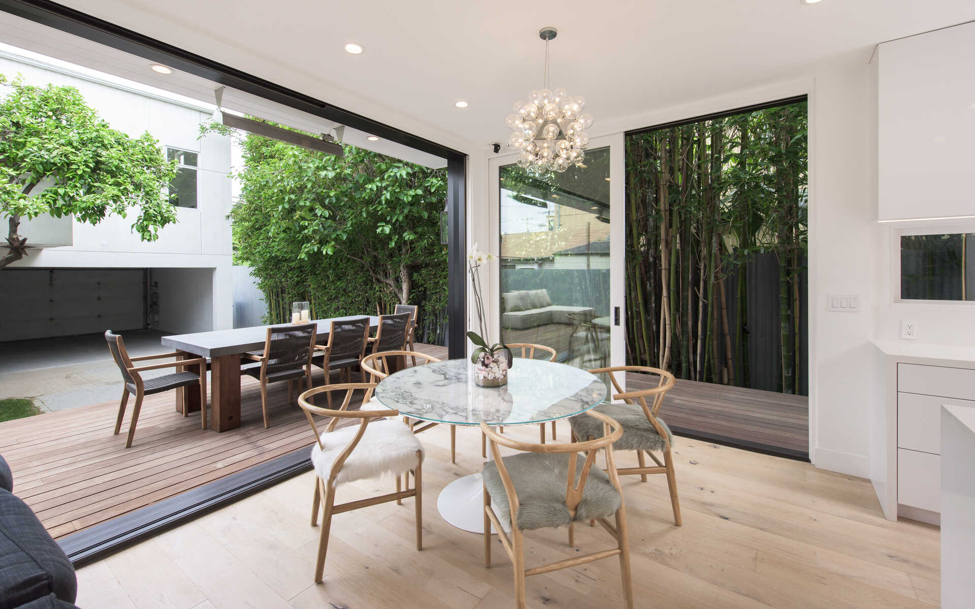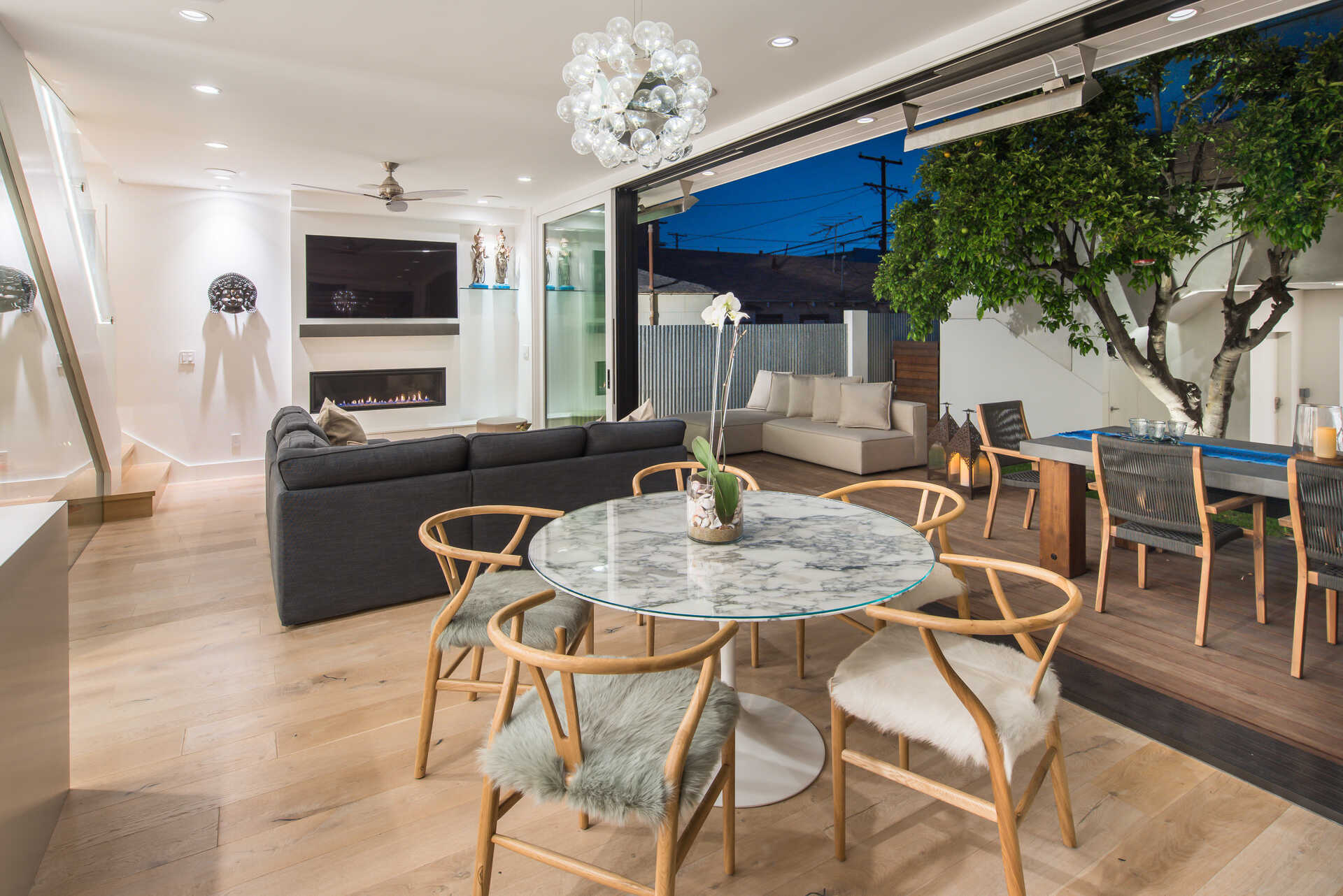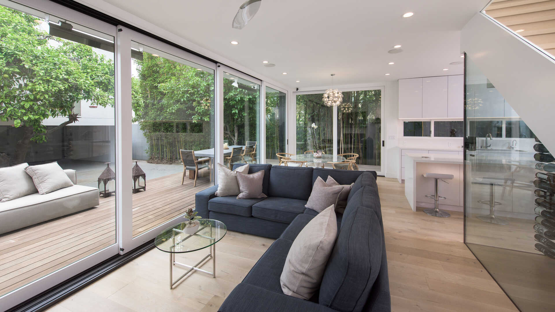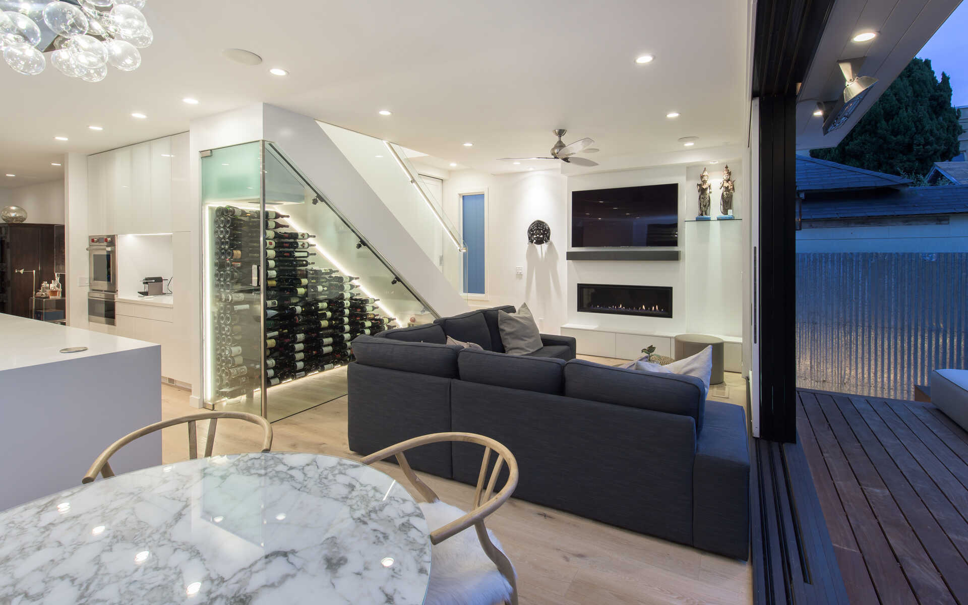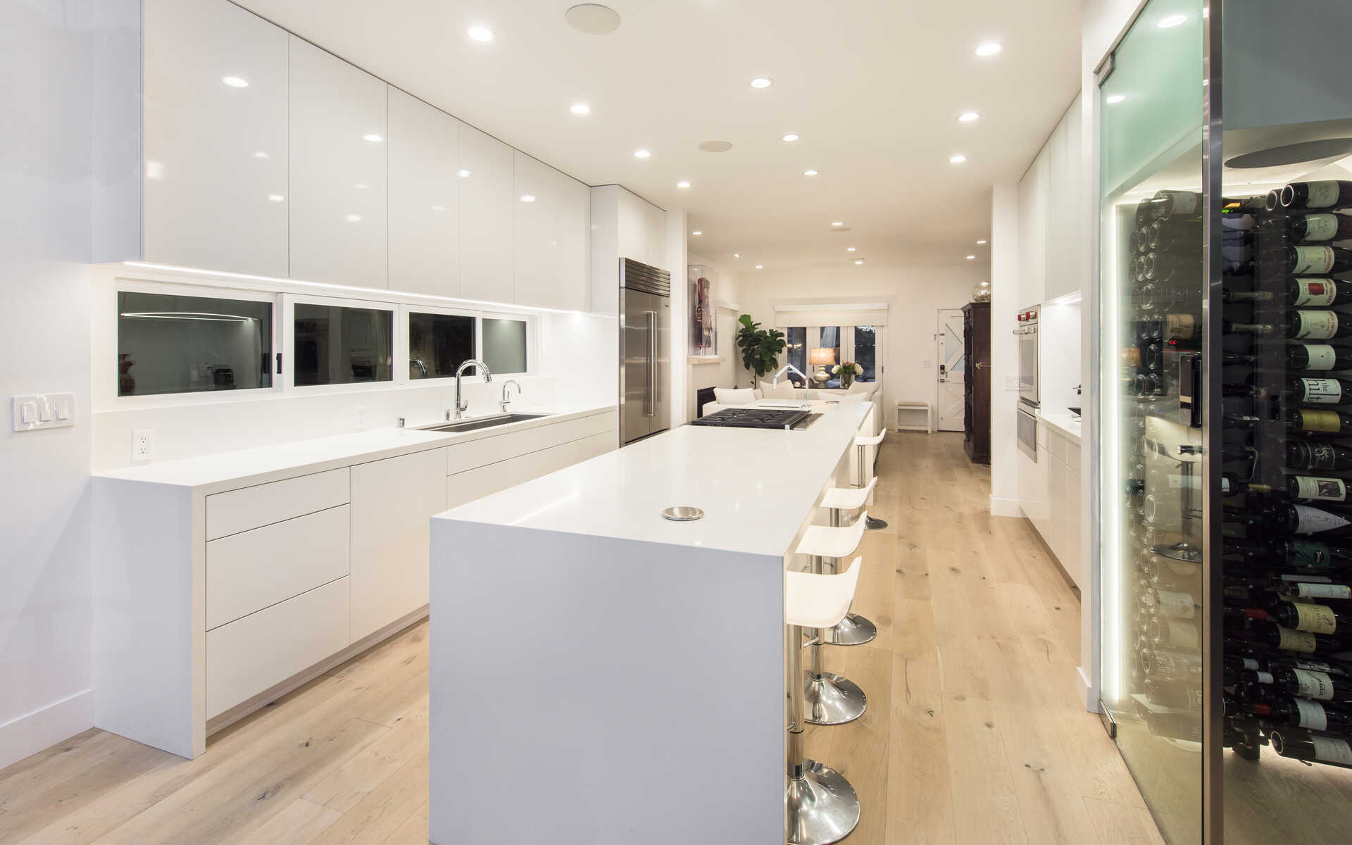 Stunning California Craftsman in the heart of Venice which blends traditional and contemporary architecture by the renown Julie Hart with classic southern design. Enter into a seamless style featuring European white oak flooring, monochromatic Caesar stone countertops in a sprawling open kitchen with impressive cabinetry throughout. Effortless entertaining with dual living spaces with a statement see-through, backlit wine cellar, three fireplaces and Marvin pocket sliding doors to embrace the indoor-outdoor theme of SoCal living. Downstairs is comprised of a full private bedroom and bath with the additional bedrooms and office nook on the second floor. Upstairs you will find a serene primary suite, with a state of the art walk in closet, and an impressive large private covered balcony. This home is framed by 800 sqft of IPE wrap-around veranda for transitional beach-side living. A truly unique gem in the heart of Venice you must see.