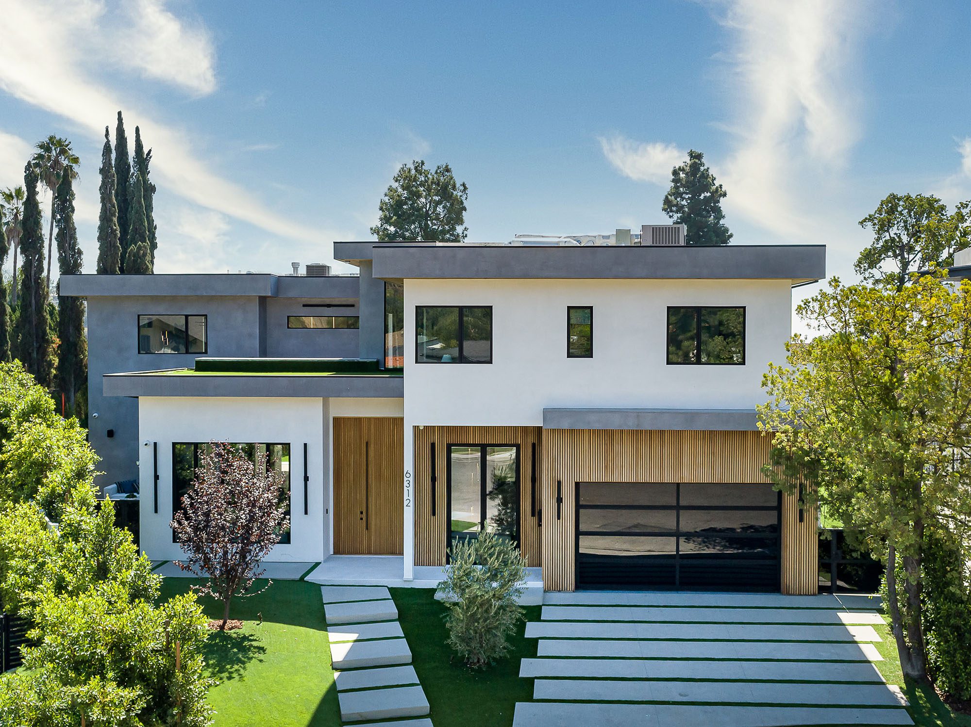 This modern tri-level residence is nestled at the end of a serene cul-de-sac within the sought-after Lake Hollywood Estate community. Its exterior boasts a blend of timber accents, expansive casement windows, and lush greenery. Upon crossing the grand 12-foot pivot door, you're welcomed into a realm of opulence. The space exudes luxury with soaring 14-foot ceilings, elegant marble-clad fireplaces, and a chef's kitchen equipped with top-of-the-line Miele appliances, complemented by a convenient butler's kitchen. Automated Italian cabinetry and a generously-sized central island complete the culinary space. The living room seamlessly connects to an infinity-edge pool and spa, adorned with sleek black marble, two fire pits at your command, a complete outdoor BBQ station, and a private pool cabana with its own bath. Ascend the floating staircase, flanked by a verdant moss wall that gracefully descends from the upper level to the basement. Here, discover a well-appointed wet bar, a fully-equipped gym, two full baths, and a meticulously designed home theater with customizable LED lighting integrated into the walls. The spacious master suite offers a captivating panorama of the iconic Hollywood sign, along with a private balcony. Its ensuite bath features dual vanities, a luxurious spa shower, and a freestanding tub. The walk-in closet is a haven for the style-conscious, featuring custom-built storage, a central dresser with a showcase for jewelry, full-length mirrors, and impeccable lighting.