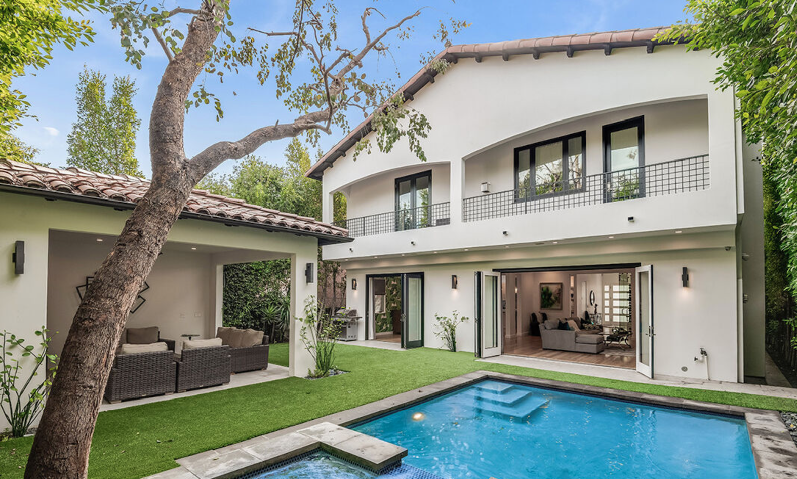 Stunning Spanish Contemporary in the heart of one of LA's most desirable neighborhoods. Immaculately maintained, this 5 bed 4.5 bath turnkey property will impress even the most sophisticated clientele. Enter through the gate to front yard & attached garage nestled behind lush greenery for ultimate privacy. Downstairs boasts open floor plan w/ beautifully crafted wine display, stunning Chef's kitchen w/ Viking appliances/dramatic marble island/Carrara backsplash, ample entertaining space, guest bed with en-suite bath, additional powder room, spacious family & dining rooms both w/ folding doors leading outside for excellent indoor-outdoor flow. Backyard is tranquil & private w/ sparkling pool & large cabana surrounded by mature landscaping. Upstairs find 4 generously sized bedrooms including luxurious master w/ soaring vaulted ceilings, fireplace, and marvelous master bath & closet. Nest, Sonos, Ring, security cameras, & more. Incredible location in immediate proximity to The Grove, LACMA, and some of the best dinning and shopping that LA has to offer!