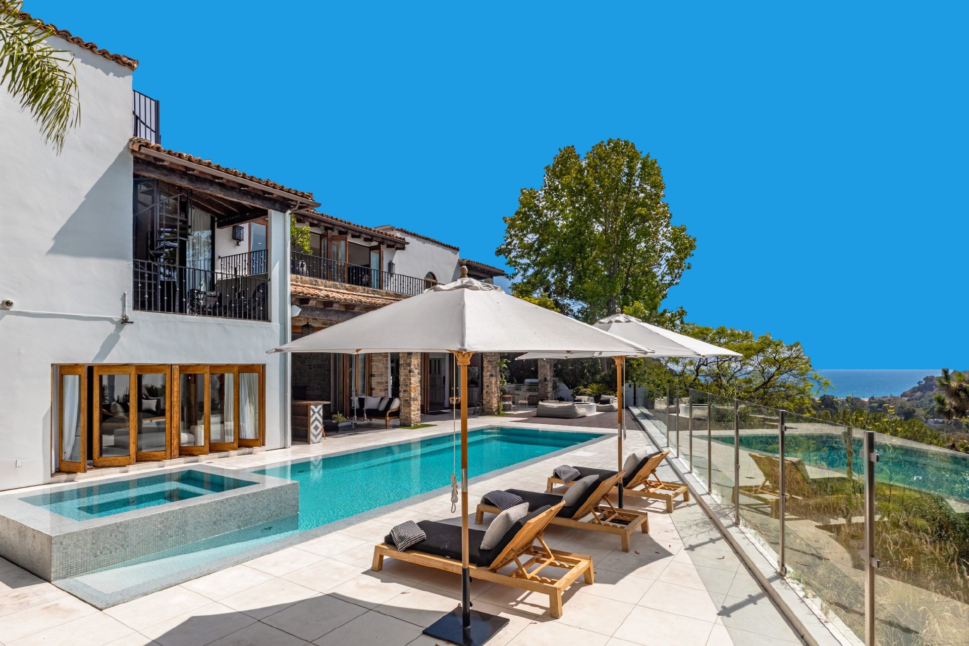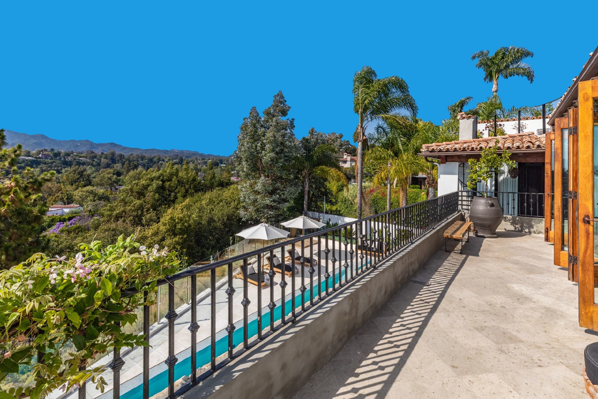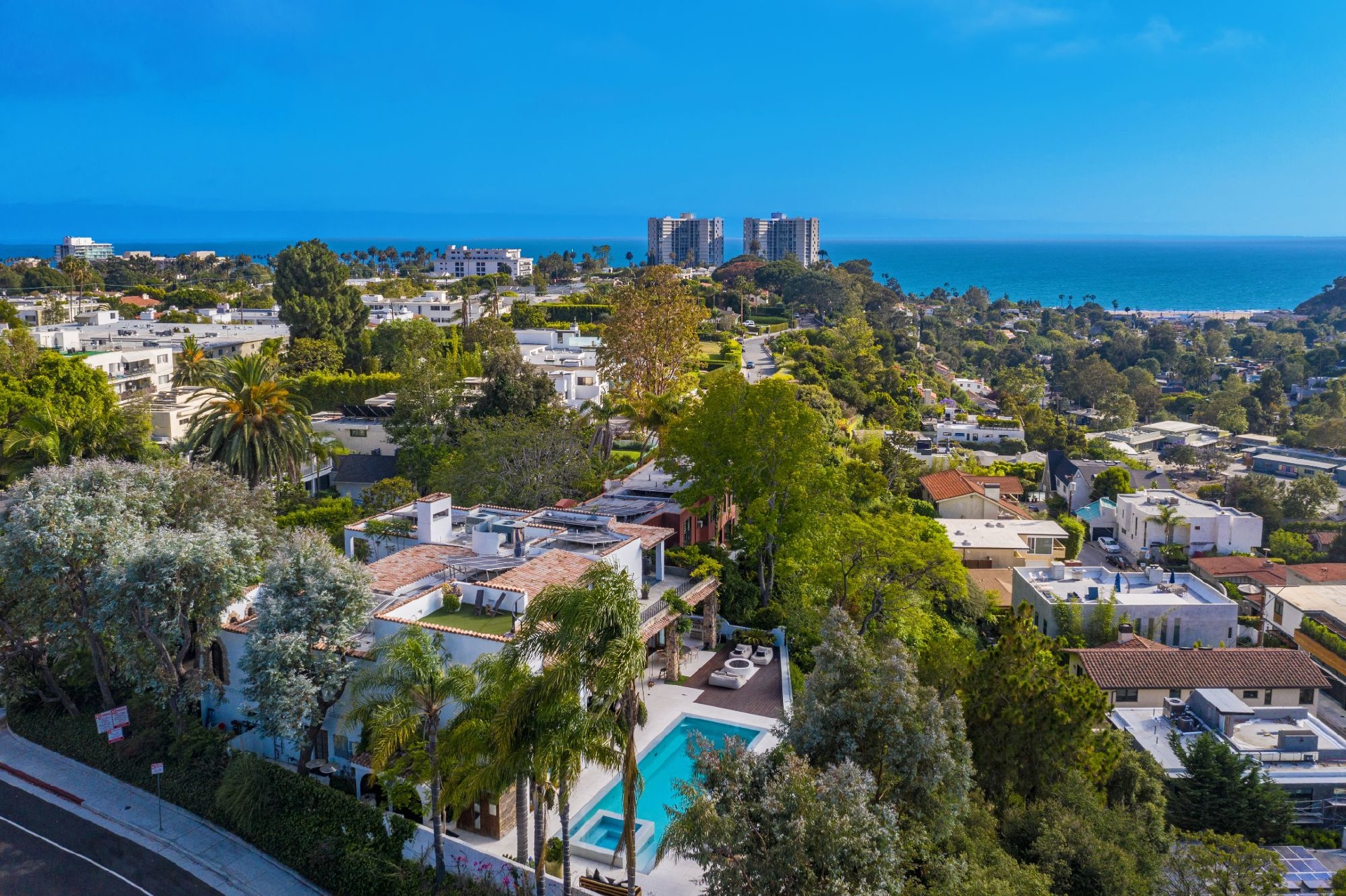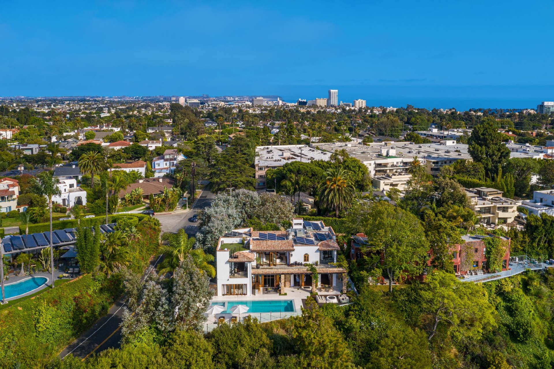 Situated on one of Santa Monica's most exclusive streets, this Spanish-style residence captures sweeping canyon, coastline, ocean and mountain views. Pass through the gated motor court and mission-style doors to the landscaped entry courtyard, where arched front doors lead to the light, bright interiors. Showcasing a blend of traditional craftsmanship and contemporary detail, living areas include a remodeled kitchen with Viking appliances and an adjacent dining area that opens to the family room through a brick accent wall with see-through fireplace. Folding glass doors open to the zero-edge pool, spa, bar, dining terrace, BBQ and fire pit lounge. The 5,345-sq. ft. residence boasts 7 bedroom suites, including a stunning master with private veranda, dressing room and wet room with soaking tub. Features include a rooftop garden terrace, media room, office, fitness studio, security system and 2-car garage, located moments from Santa Monica's best beaches, shopping and dining.