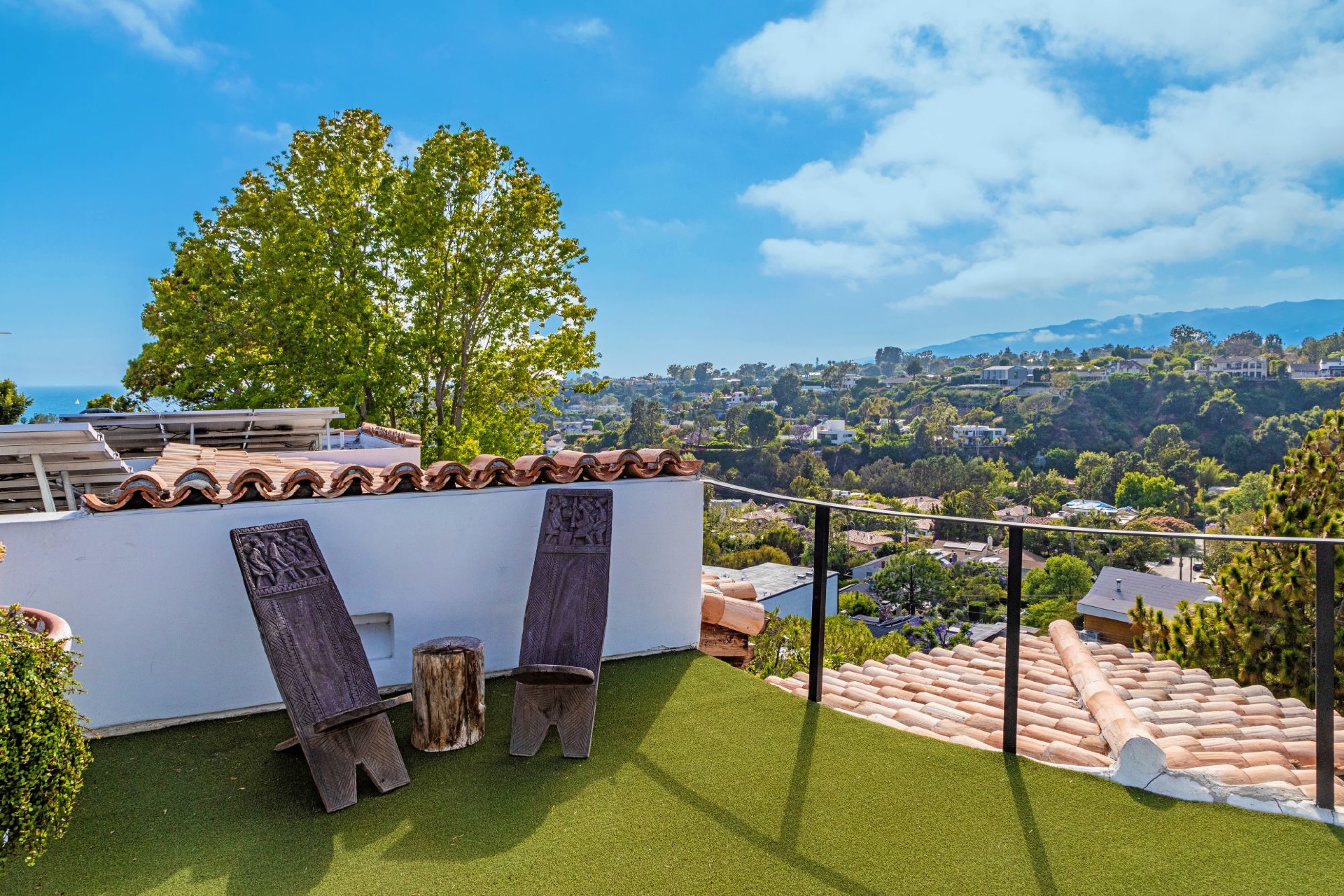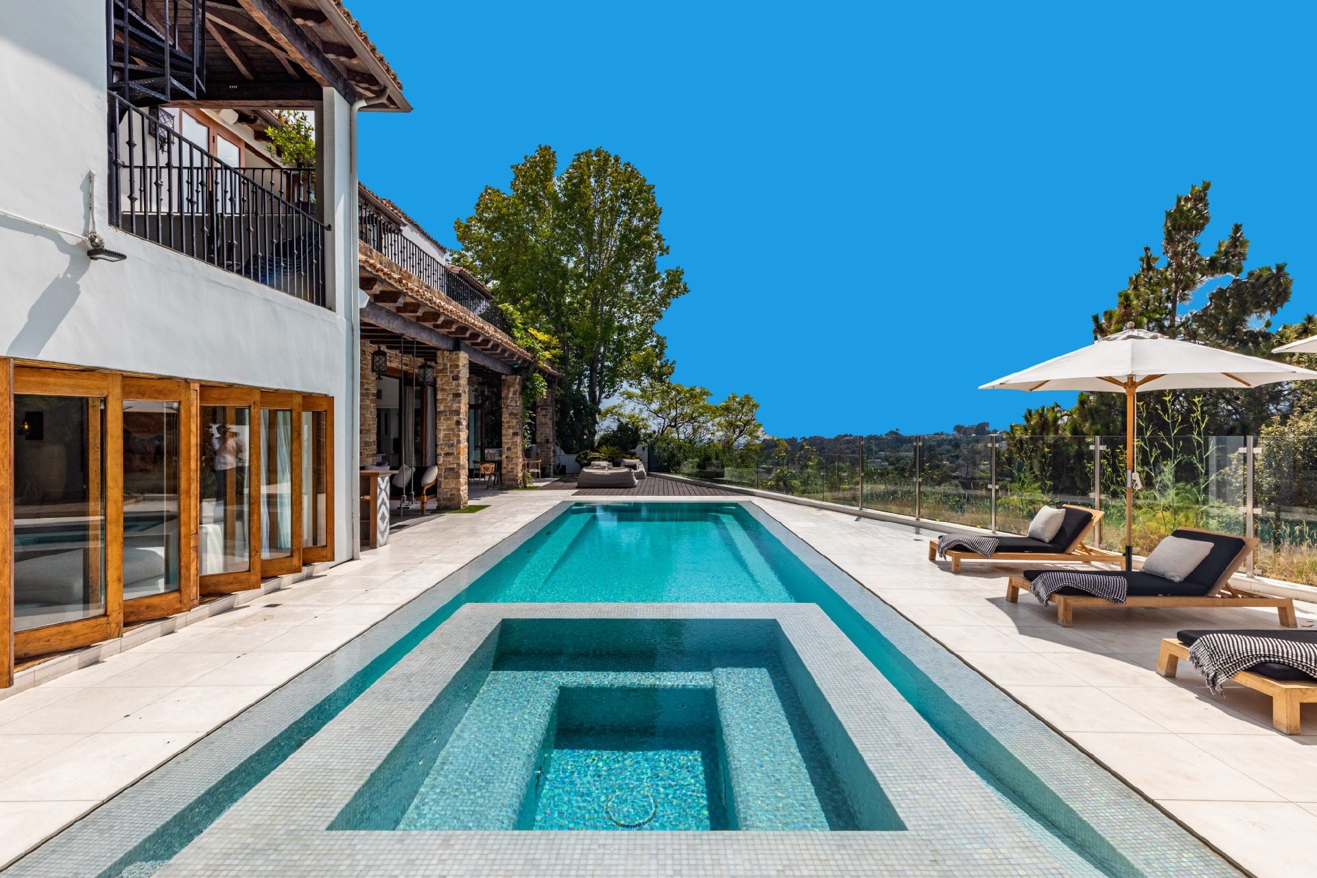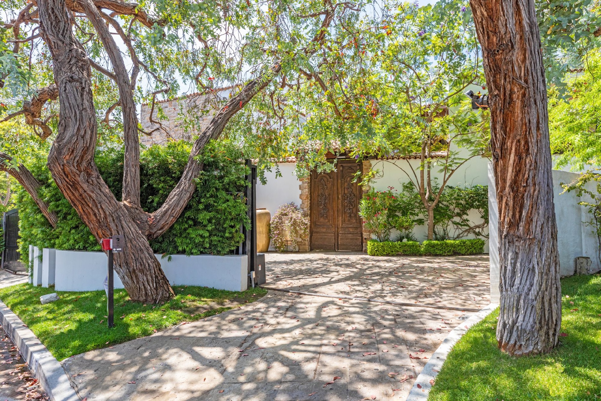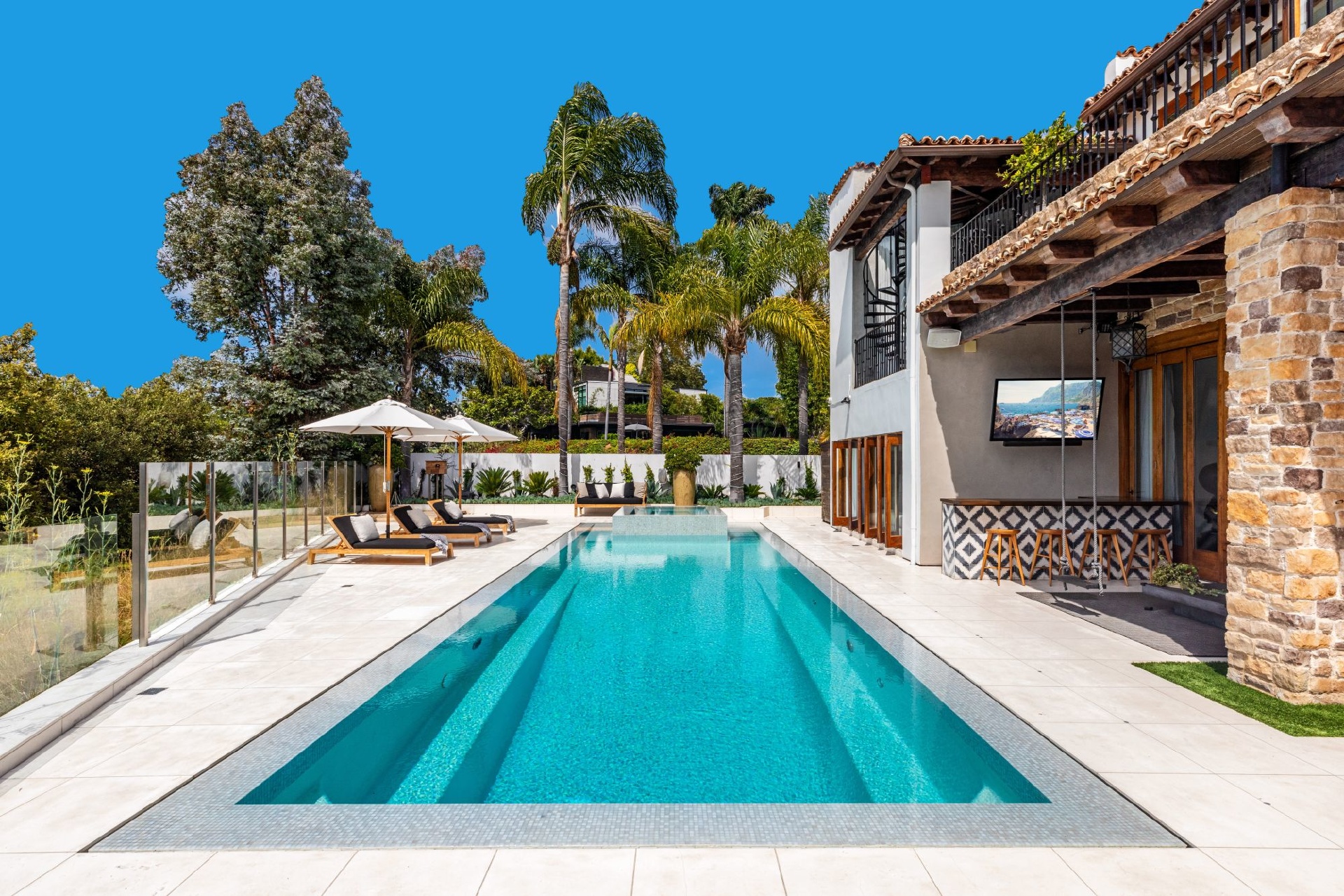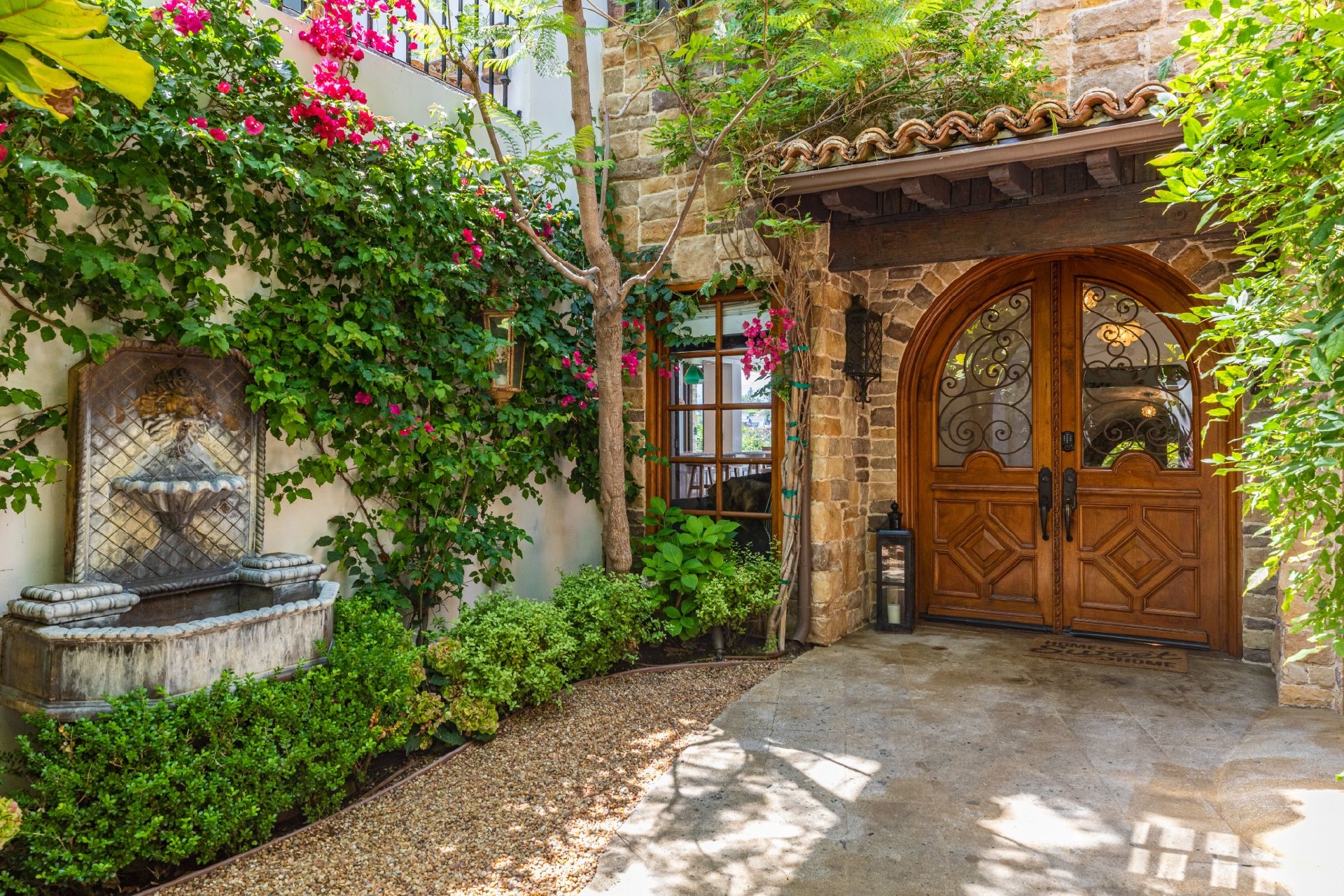 Situated on one of Santa Monica's most exclusive streets, this Spanish-style residence captures sweeping canyon, coastline, ocean and mountain views. Pass through the gated motor court and mission-style doors to the landscaped entry courtyard, where arched front doors lead to the light, bright interiors. Showcasing a blend of traditional craftsmanship and contemporary detail, living areas include a remodeled kitchen with Viking appliances and an adjacent dining area that opens to the family room through a brick accent wall with see-through fireplace. Folding glass doors open to the zero-edge pool, spa, bar, dining terrace, BBQ and fire pit lounge. The 5,345-sq. ft. residence boasts 7 bedroom suites, including a stunning master with private veranda, dressing room and wet room with soaking tub. Features include a rooftop garden terrace, media room, office, fitness studio, security system and 2-car garage, located moments from Santa Monica's best beaches, shopping and dining.
