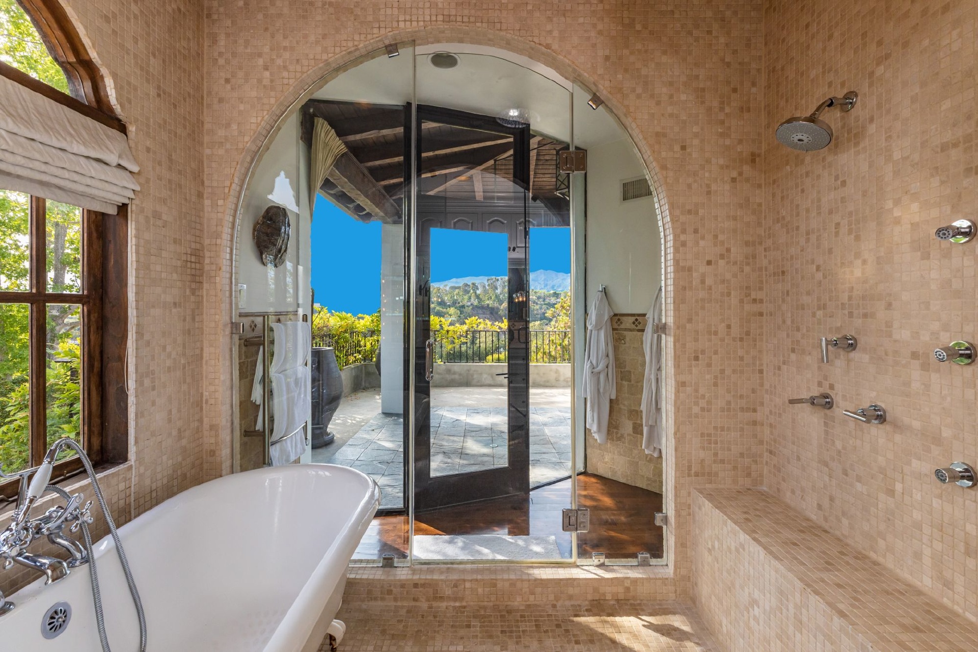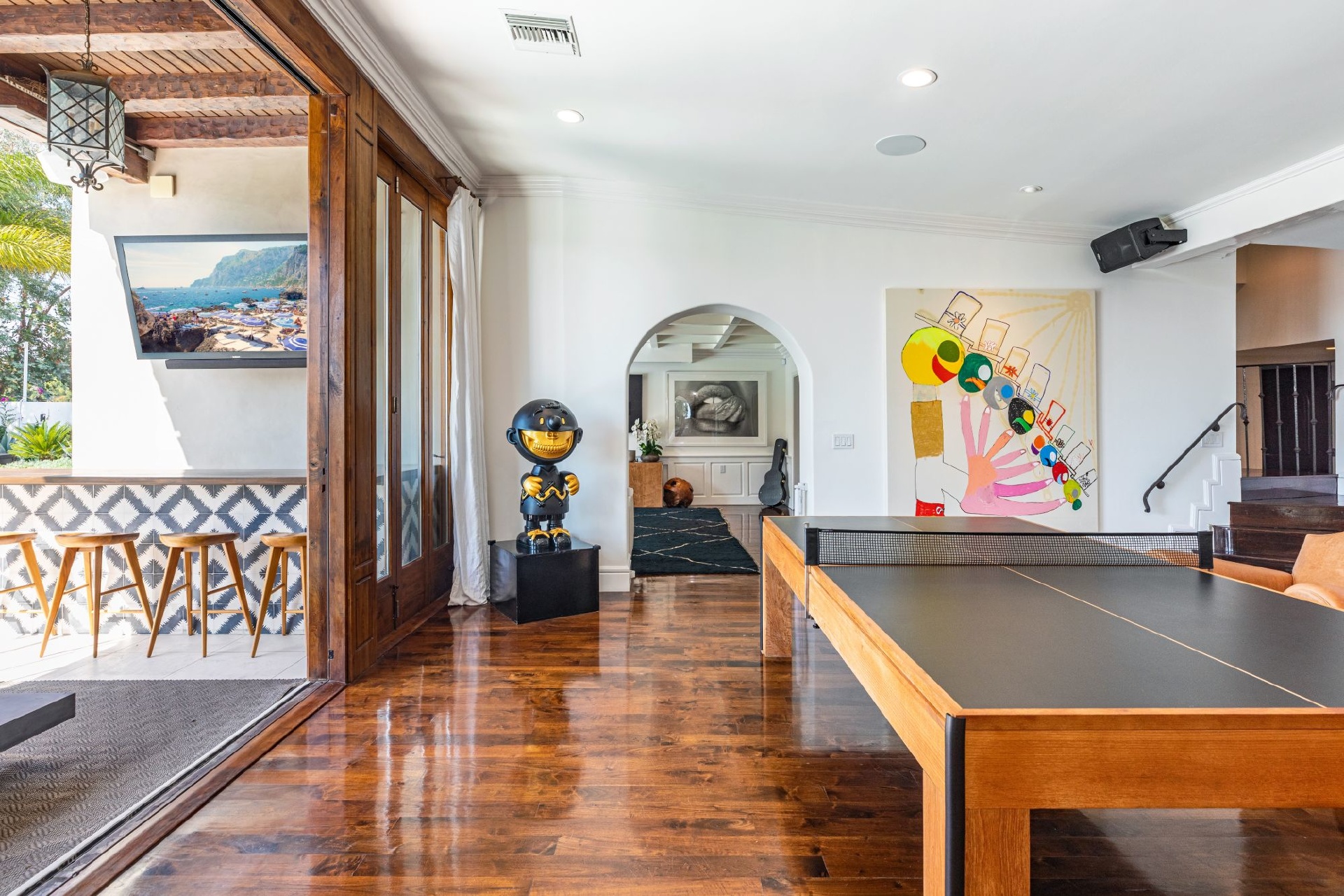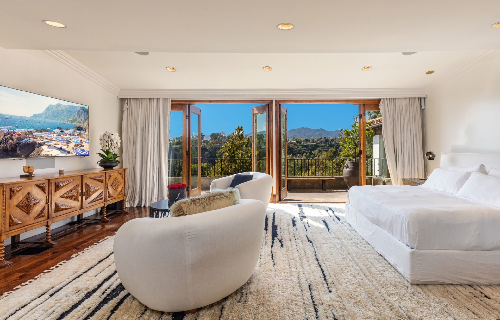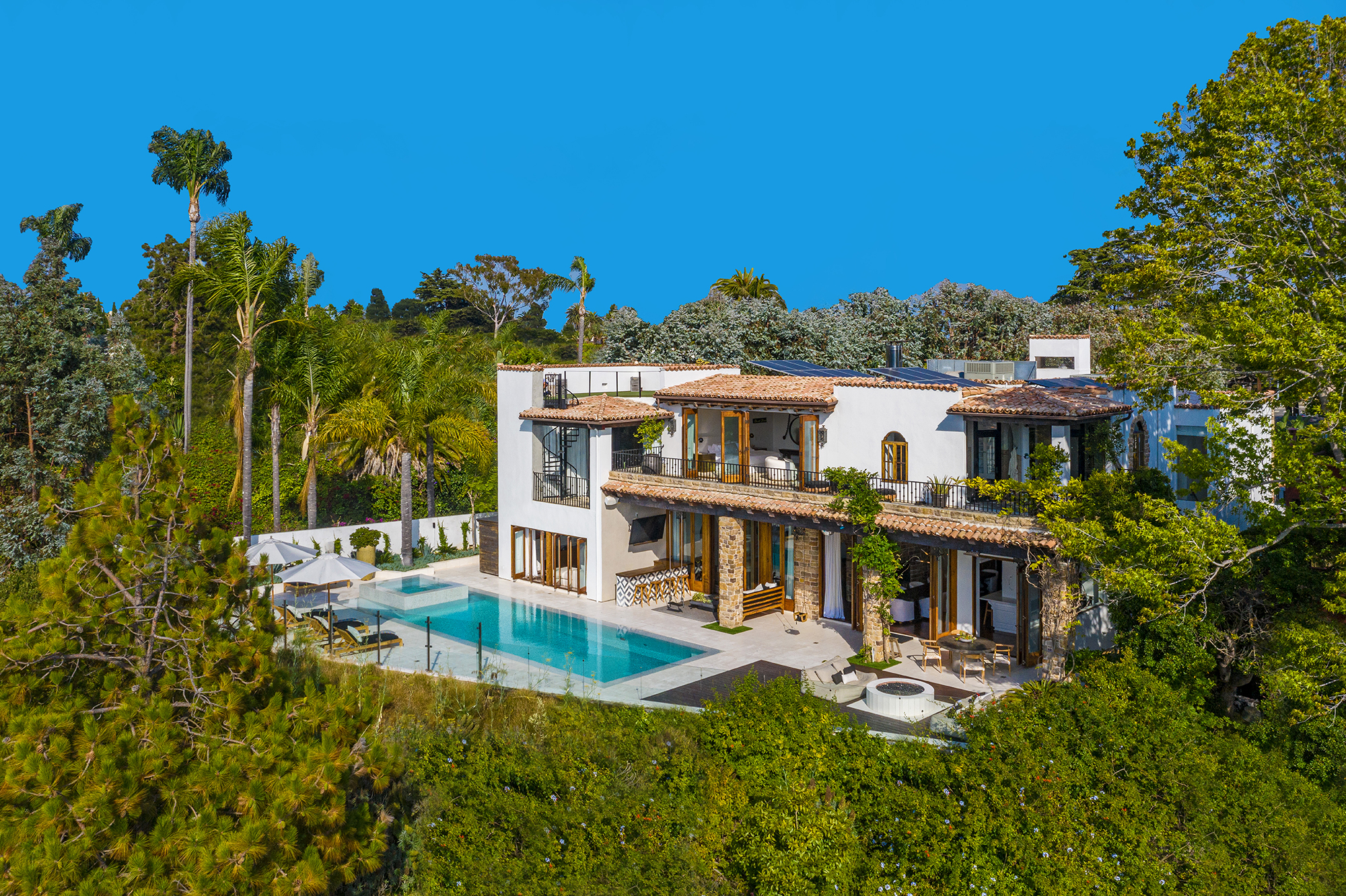 Situated on one of Santa Monica's most exclusive streets, this Spanish-style residence captures sweeping canyon, coastline, ocean and mountain views. Pass through the gated motor court and mission-style doors to the landscaped entry courtyard, where arched front doors lead to the light, bright interiors. Showcasing a blend of traditional craftsmanship and contemporary detail, living areas include a remodeled kitchen with Viking appliances and an adjacent dining area that opens to the family room through a brick accent wall with see-through fireplace. Folding glass doors open to the zero-edge pool, spa, bar, dining terrace, BBQ and fire pit lounge. The 5,345-sq. ft. residence boasts 7 bedroom suites, including a stunning master with private veranda, dressing room and wet room with soaking tub. Features include a rooftop garden terrace, media room, office, fitness studio, security system and 2-car garage, located moments from Santa Monica's best beaches, shopping and dining.