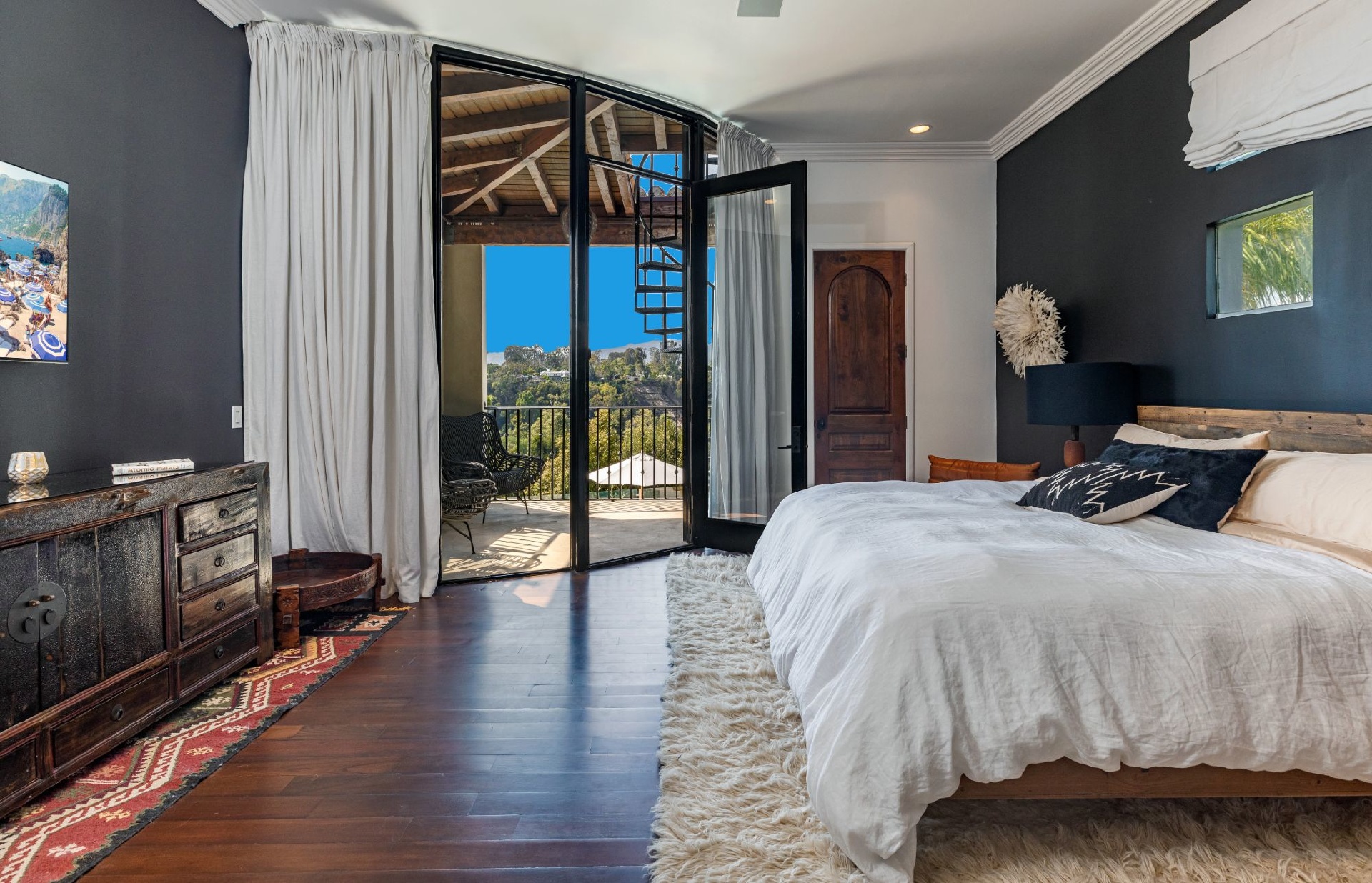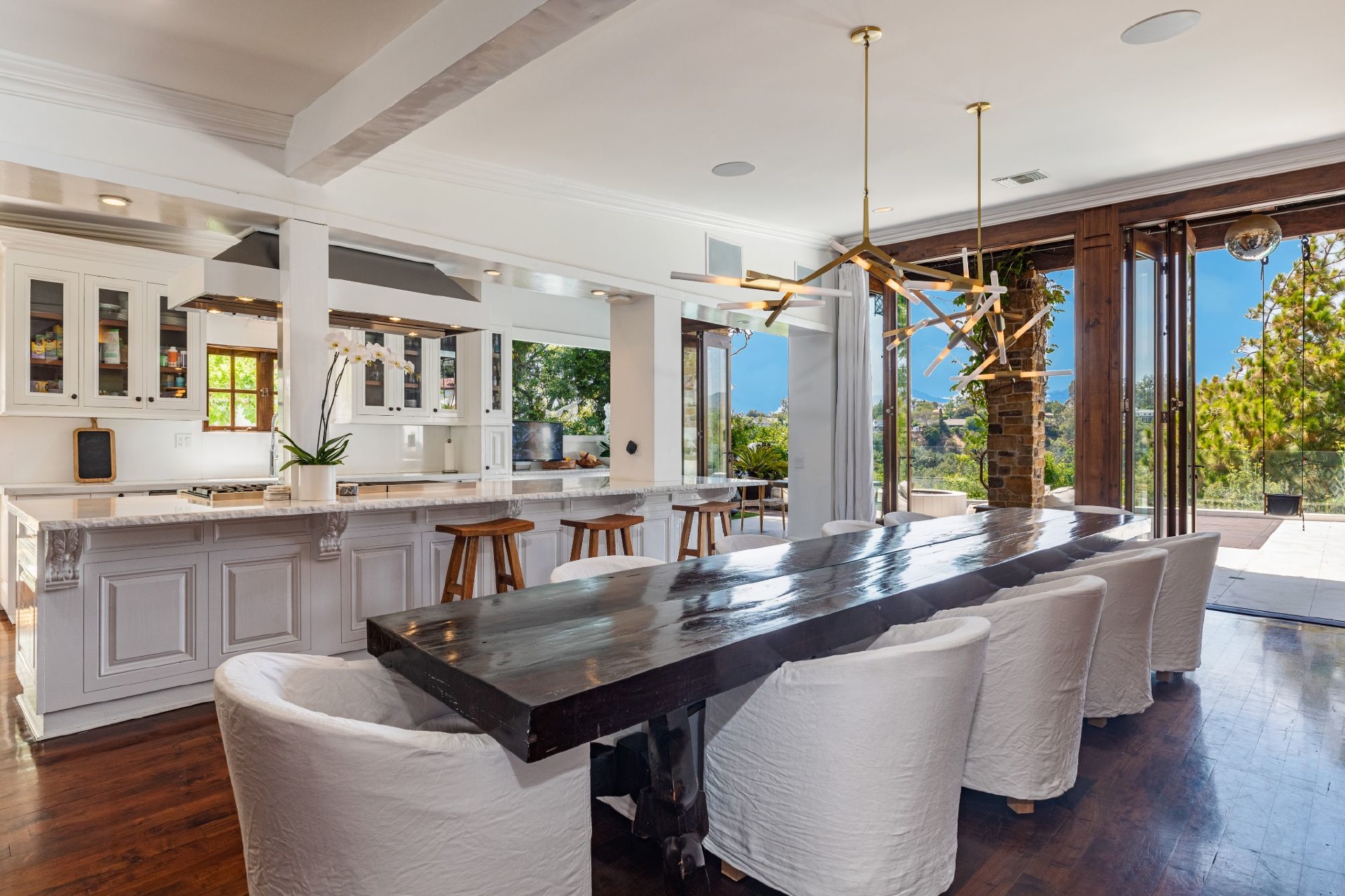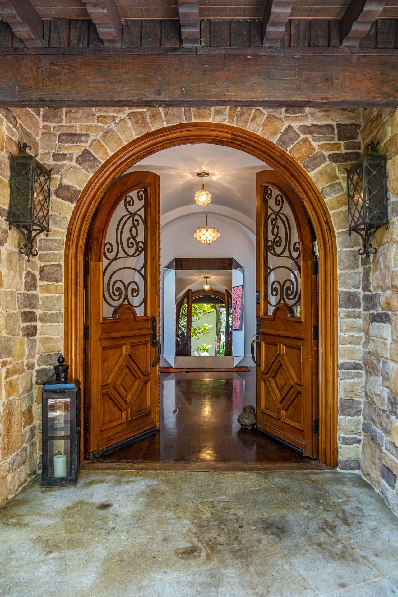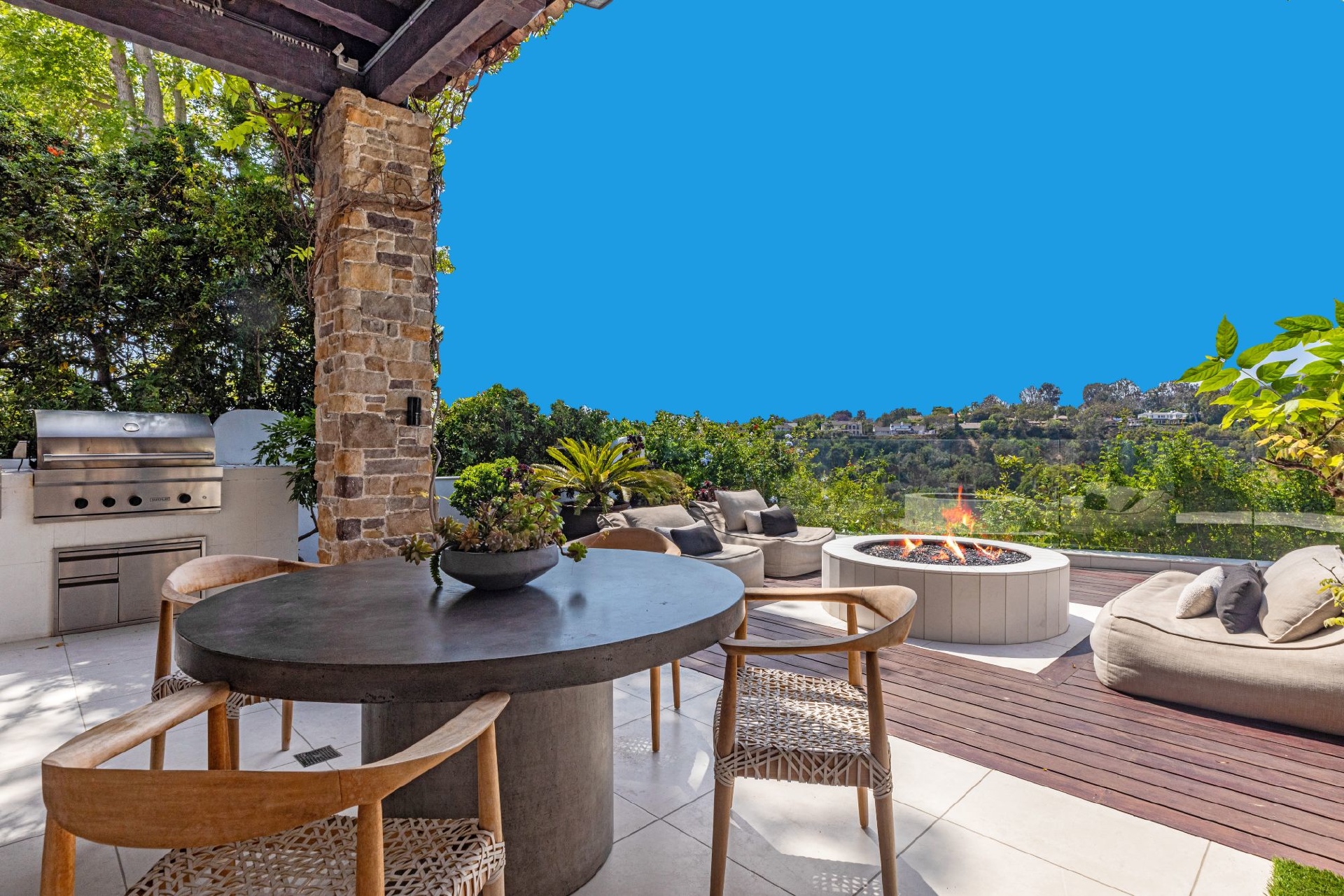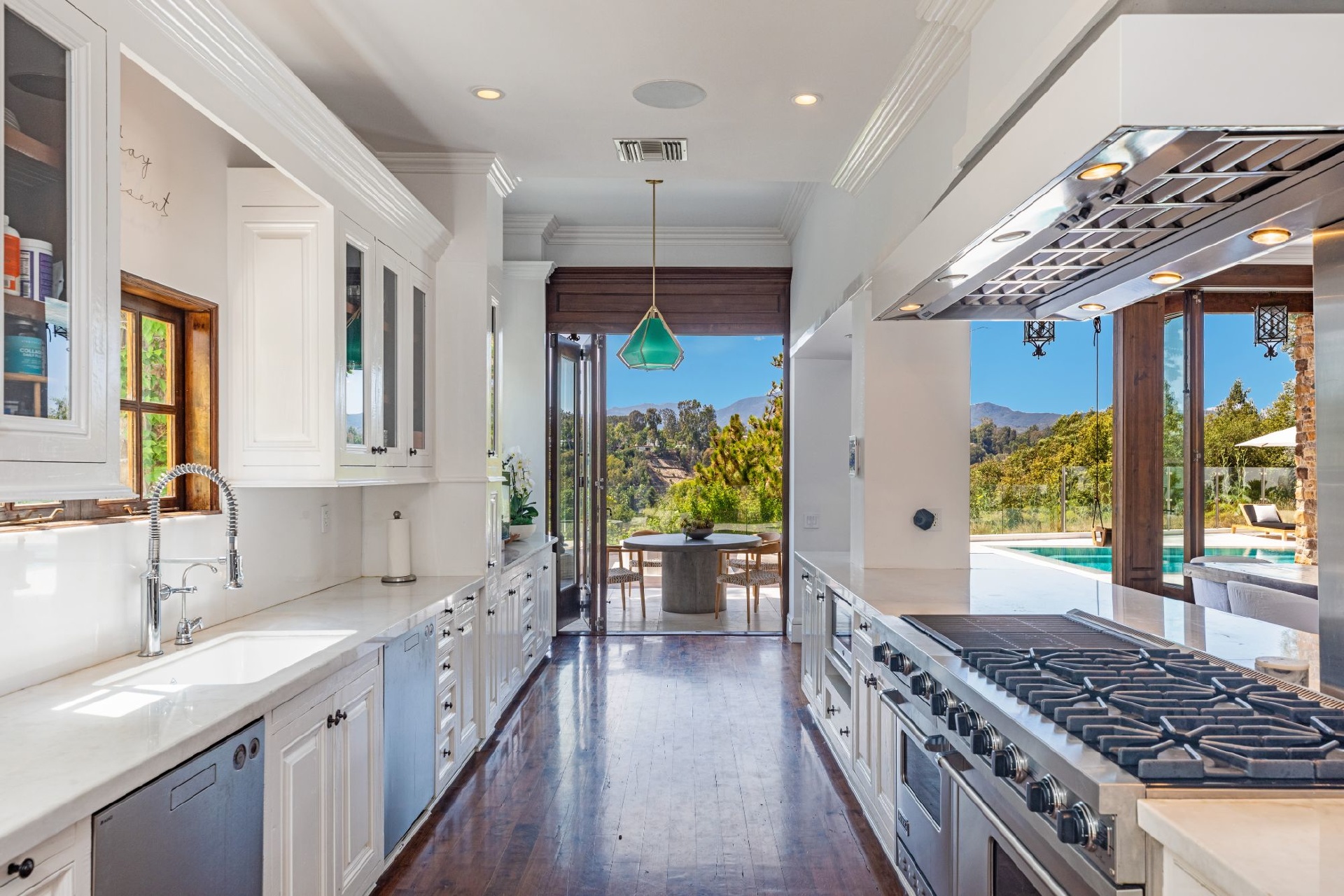 Situated on one of Santa Monica's most exclusive streets, this Spanish-style residence captures sweeping canyon, coastline, ocean and mountain views. Pass through the gated motor court and mission-style doors to the landscaped entry courtyard, where arched front doors lead to the light, bright interiors. Showcasing a blend of traditional craftsmanship and contemporary detail, living areas include a remodeled kitchen with Viking appliances and an adjacent dining area that opens to the family room through a brick accent wall with see-through fireplace. Folding glass doors open to the zero-edge pool, spa, bar, dining terrace, BBQ and fire pit lounge. The 5,345-sq. ft. residence boasts 7 bedroom suites, including a stunning master with private veranda, dressing room and wet room with soaking tub. Features include a rooftop garden terrace, media room, office, fitness studio, security system and 2-car garage, located moments from Santa Monica's best beaches, shopping and dining.
