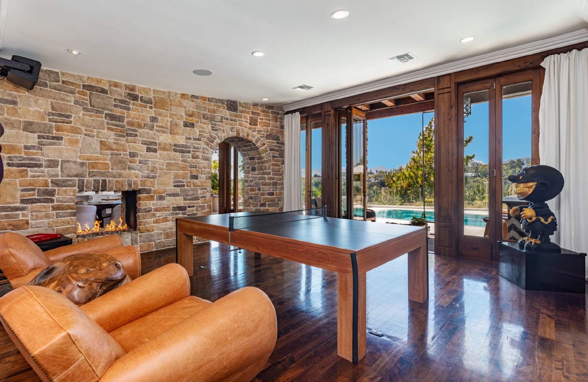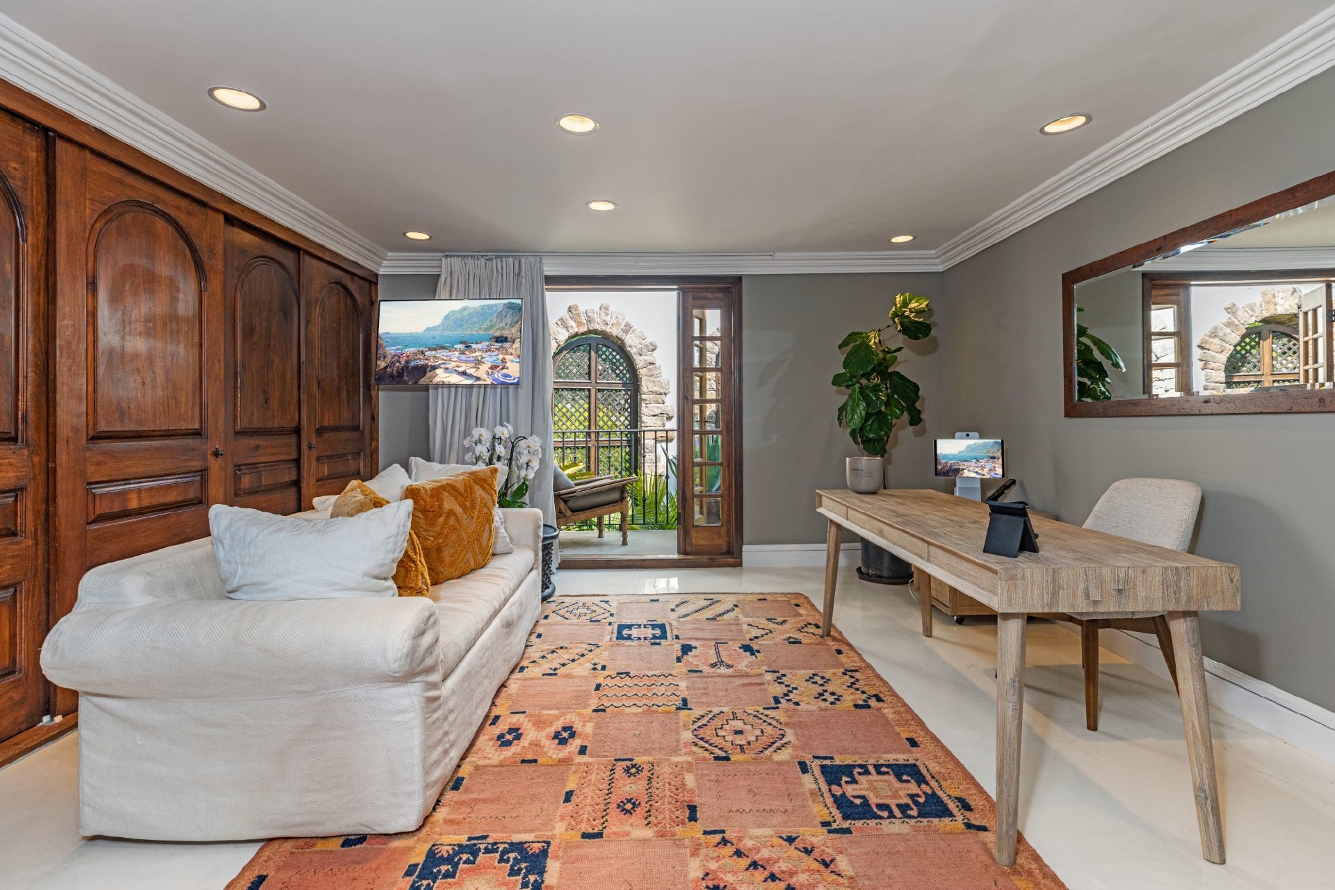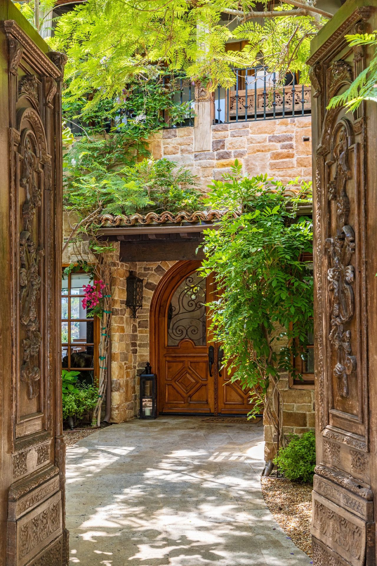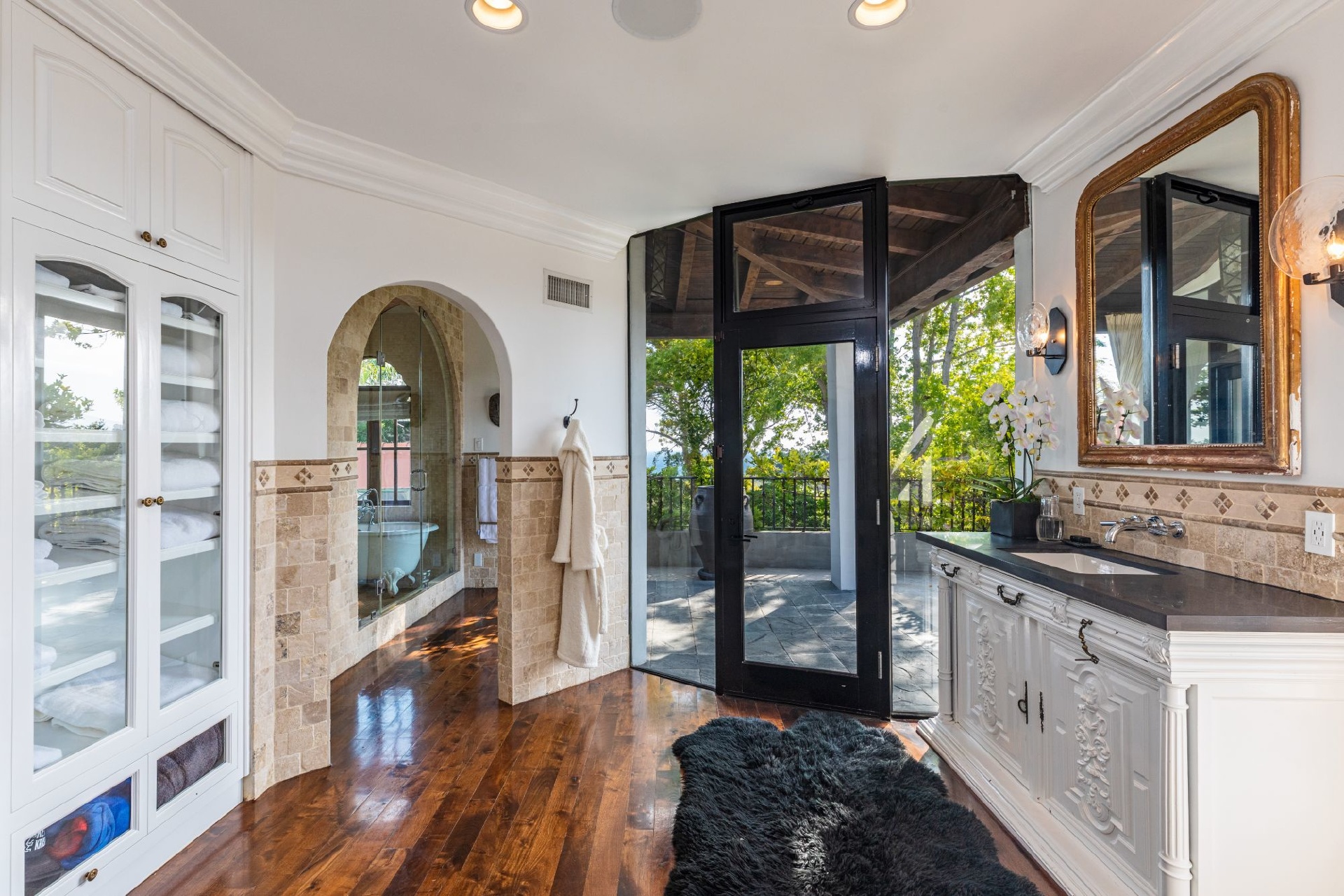 Situated on one of Santa Monica's most exclusive streets, this Spanish-style residence captures sweeping canyon, coastline, ocean and mountain views. Pass through the gated motor court and mission-style doors to the landscaped entry courtyard, where arched front doors lead to the light, bright interiors. Showcasing a blend of traditional craftsmanship and contemporary detail, living areas include a remodeled kitchen with Viking appliances and an adjacent dining area that opens to the family room through a brick accent wall with see-through fireplace. Folding glass doors open to the zero-edge pool, spa, bar, dining terrace, BBQ and fire pit lounge. The 5,345-sq. ft. residence boasts 7 bedroom suites, including a stunning master with private veranda, dressing room and wet room with soaking tub. Features include a rooftop garden terrace, media room, office, fitness studio, security system and 2-car garage, located moments from Santa Monica's best beaches, shopping and dining.