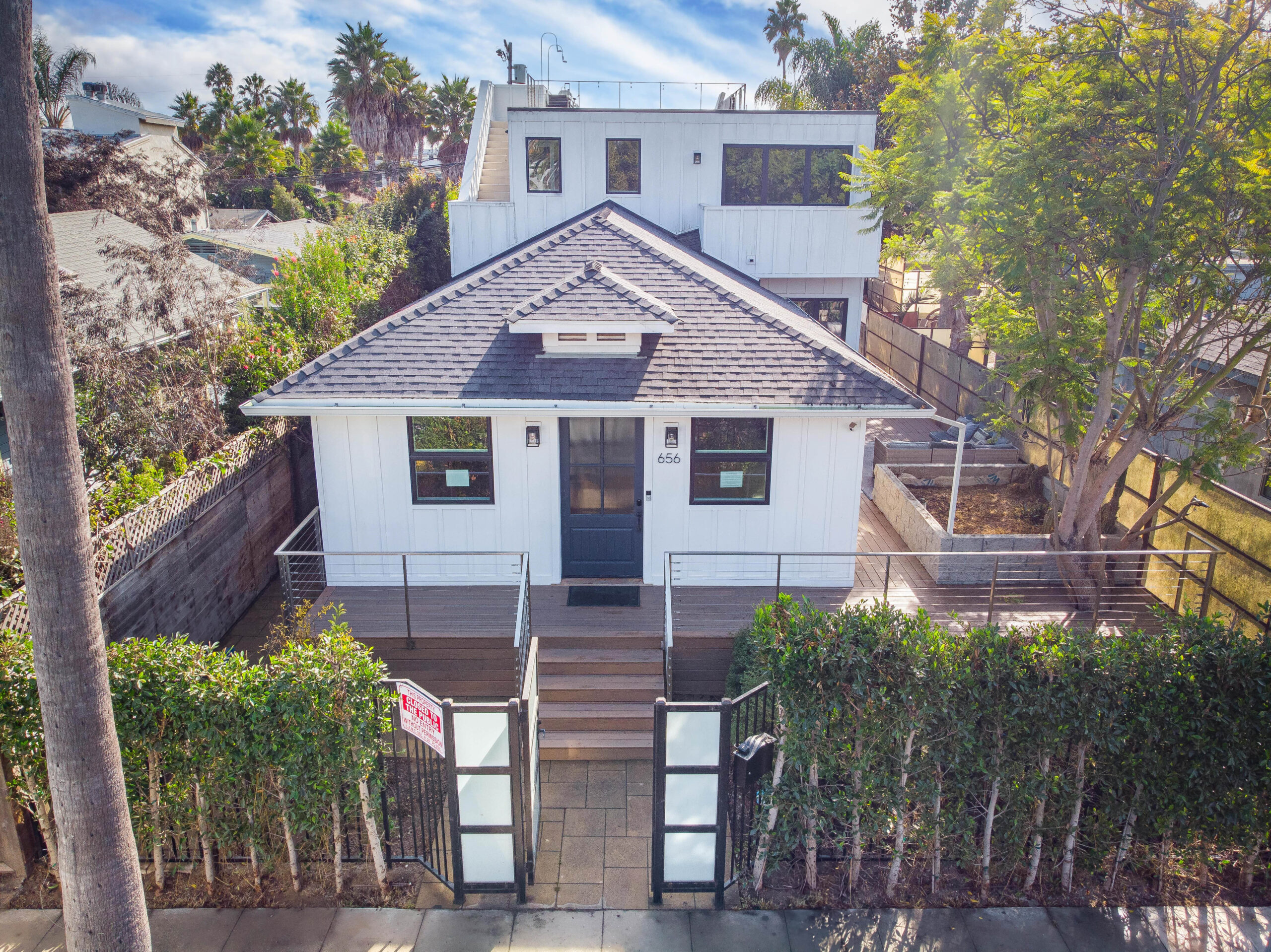 READY FOR IMMEDIATE OCCUPANCY!!! Built in 2020, this Venice gem is designed for seamless indoor/outdoor living and entertaining. The home features four spacious bedrooms and four and a half baths, set within an open floor plan highlighted by warm oak wood floors and a cozy gas fireplace. Fleetwood doors lead to a stylish outdoor lounge area. The bright, modern kitchen boasts contemporary lighting, a marble waterfall island, Miele appliances, a built-in fridge, and stunning cabinetry. A convenient en-suite guest room with a large closet is located on the first floor, ideal for hosting friends and family. The second floor includes two additional en-suite bedrooms and a master suite with a generous walk-in closet, a private balcony, and a luxurious spa-like bathroom with heated and lighted mirrors. The expansive sky deck offers breathtaking 360-degree views and refreshing Venice sea breezes. Situated on a peaceful and sought-after street, this home is truly a must-see. Enjoy the chic beach lifestyle, living just blocks away from the best restaurants, boutiques, coffee shops, nightlife, and more!