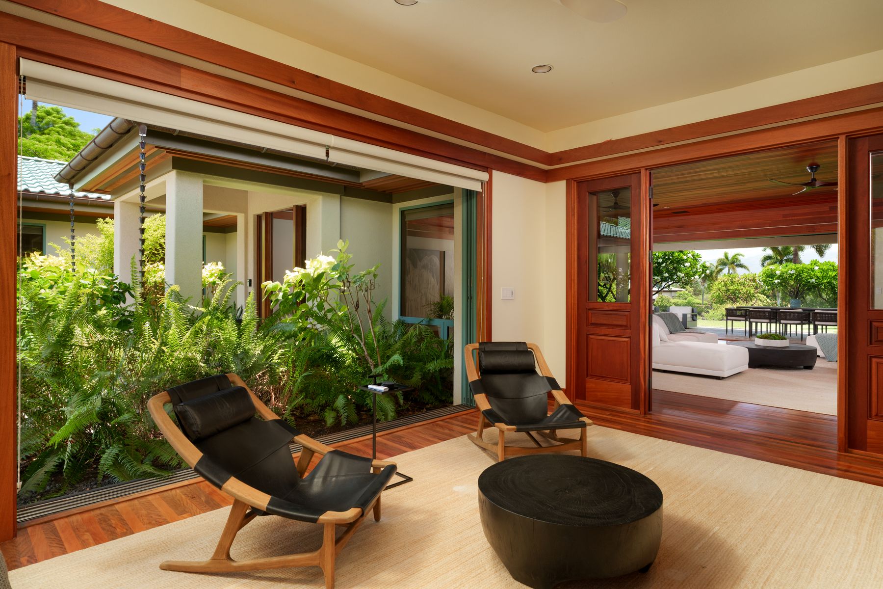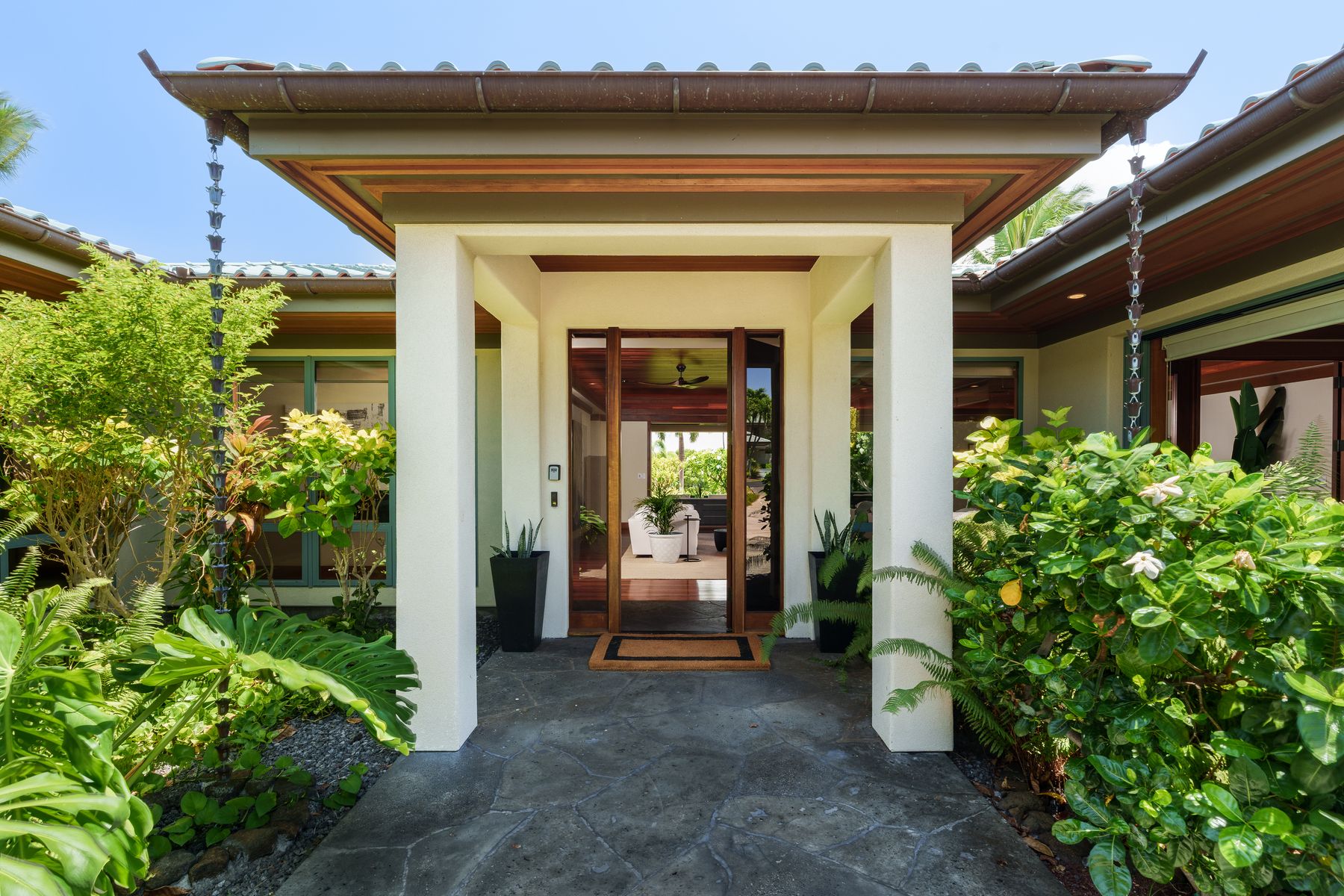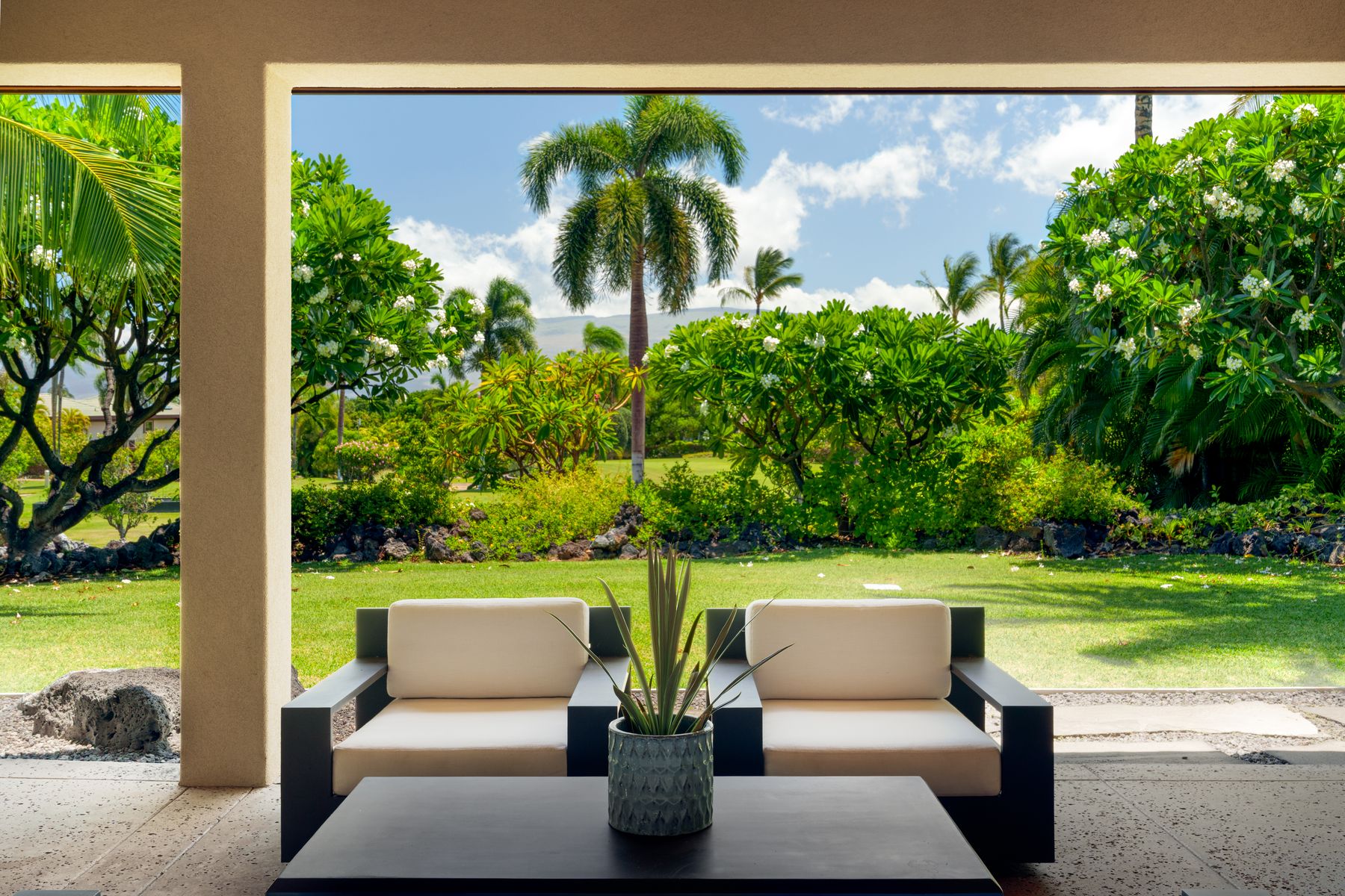 Luxury Island Living in Champion Ridge at Mauna Lani Resort. This furnished single-level home in the gated community of Champion Ridge offers privacy, sophistication, and modern upgrades throughout. With over 3,300 square feet of living space, the residence features 3 bedroom suites, plus a spacious office that can flex as a fourth bedroom. Garden views and lush surroundings provide a quiet, private setting just moments from world-class resort amenities. Inside, high 9-foot ceilings, ohia wood floors, and custom mahogany doors create a warm and refined atmosphere. Pocket doors open to blend indoor and outdoor living. The kitchen has been fully redesigned with a new quartz island, chic bar area, Sub-Zero refrigerator, Thermador appliances, and a wine fridge. The primary suite bath was thoughtfully remodeled using Hansgrohe, Badeloft, and Palacek finishes. All guest baths and the powder room have been upgraded, including the addition of a second outdoor shower.