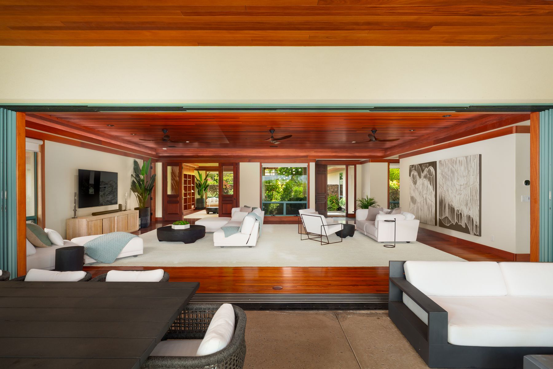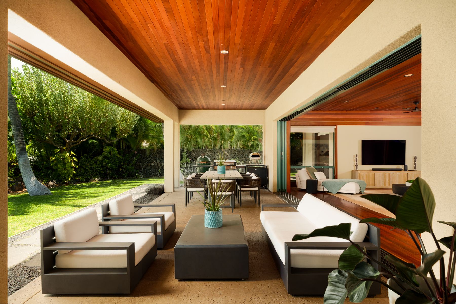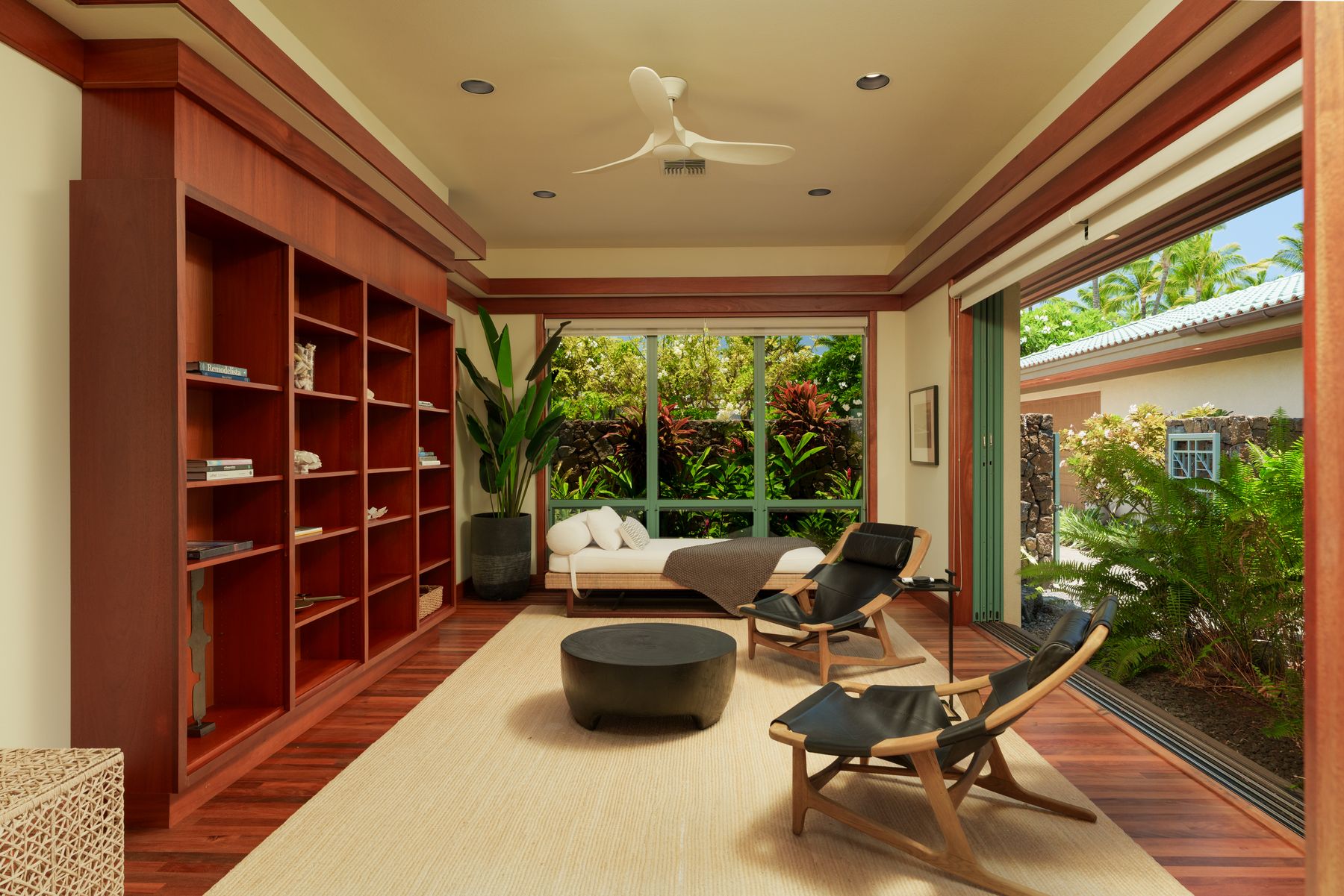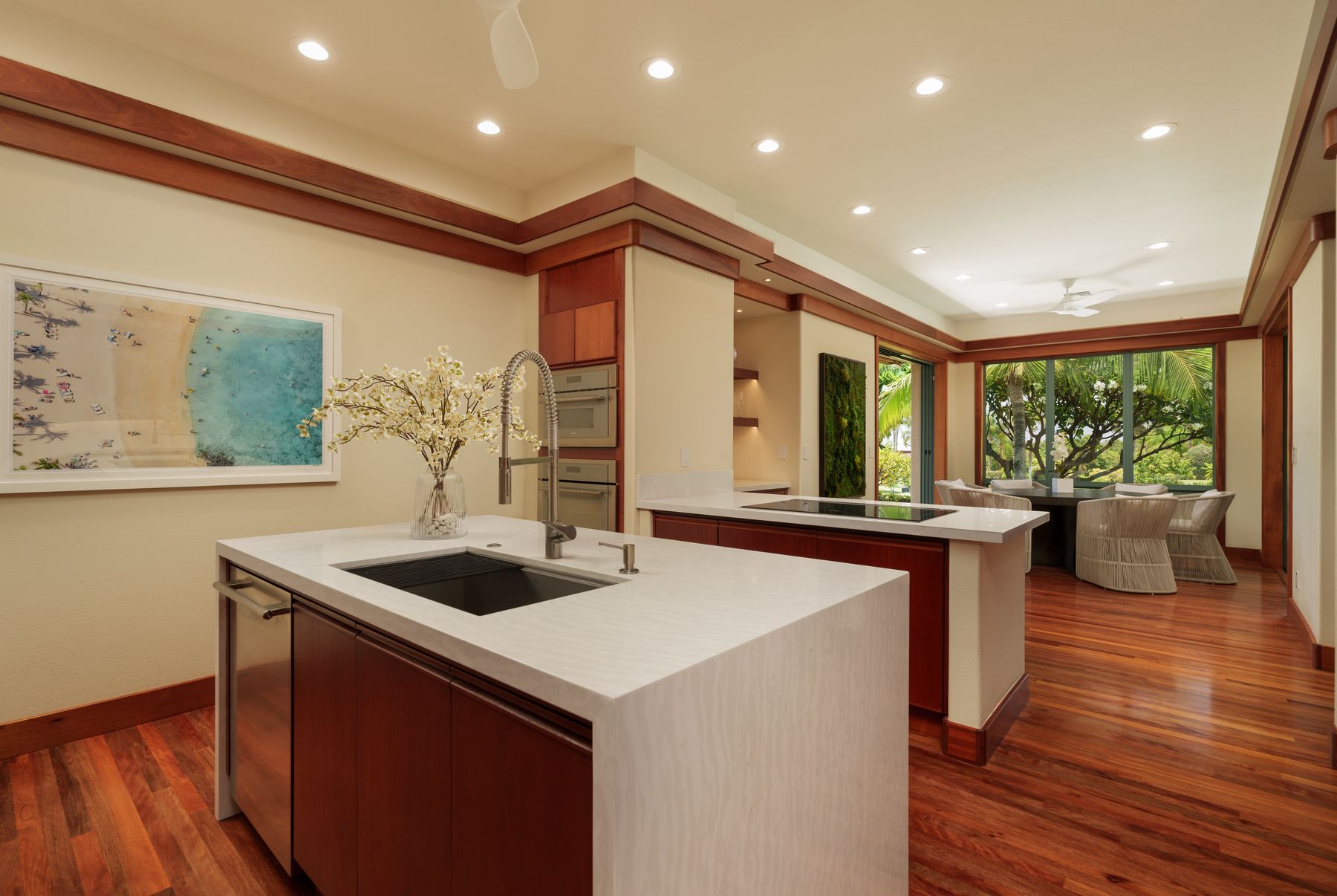 Luxury Island Living in Champion Ridge at Mauna Lani Resort. This furnished single-level home in the gated community of Champion Ridge offers privacy, sophistication, and modern upgrades throughout. With over 3,300 square feet of living space, the residence features 3 bedroom suites, plus a spacious office that can flex as a fourth bedroom. Garden views and lush surroundings provide a quiet, private setting just moments from world-class resort amenities. Inside, high 9-foot ceilings, ohia wood floors, and custom mahogany doors create a warm and refined atmosphere. Pocket doors open to blend indoor and outdoor living. The kitchen has been fully redesigned with a new quartz island, chic bar area, Sub-Zero refrigerator, Thermador appliances, and a wine fridge. The primary suite bath was thoughtfully remodeled using Hansgrohe, Badeloft, and Palacek finishes. All guest baths and the powder room have been upgraded, including the addition of a second outdoor shower.
