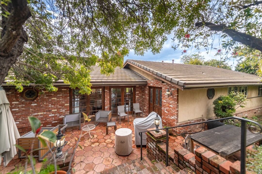 Brentwood Crestwood Hills, North of Sunset Blvd., on a quiet cul-de-sac street surrounded by new construction homes. Woodsy, private, one story 3 bed, 2.5 bath home. Surrounded by mature trees, partial ocean view, wood floors throughout, large open rooms for entertaining with expansive windows with the most serene and peaceful views. Open kitchen with granite countertops, stone backsplash, island, high pitched wood paneled ceiling, oversize windows with access to a long wood deck perfect for BBQing and taking in the sunsets. Living Room with white stone floor to ceiling fireplace with walls of windows with a green canopy and partial ocean view. White wood paneled and dark wood exposed accent beams in the high, angled ceiling creating an open. The Den/Dining Room with a corner antique canopy bar tavern with stained glass, beveled mirrors and carved columns has two sets of French doors opening to the front, gated brick patio perfect for entertaining. The primary bedroom is connected to a private patio and has the most tranquil en-suite with a soaking tub with huge windows overlooking complete greenery in the side yard. 2 bedrooms and 2 bathrooms on the right side of house and the third bedroom or office on the left side of house. 1/2 bath and laundry hook ups in the two-car garage. Direct entrance from the garage into the house. Central HVAC. Gated brick patio in front of the house and a partially fenced yard below. Views of trees everywhere. Located near Crestwood Hills Park and in the Kenter Canyon Elementary Charter School district. Tenant occupied. Do not disturb tenant. Will be delivered vacant. Virtual Tour Available.