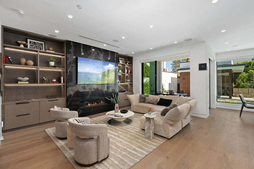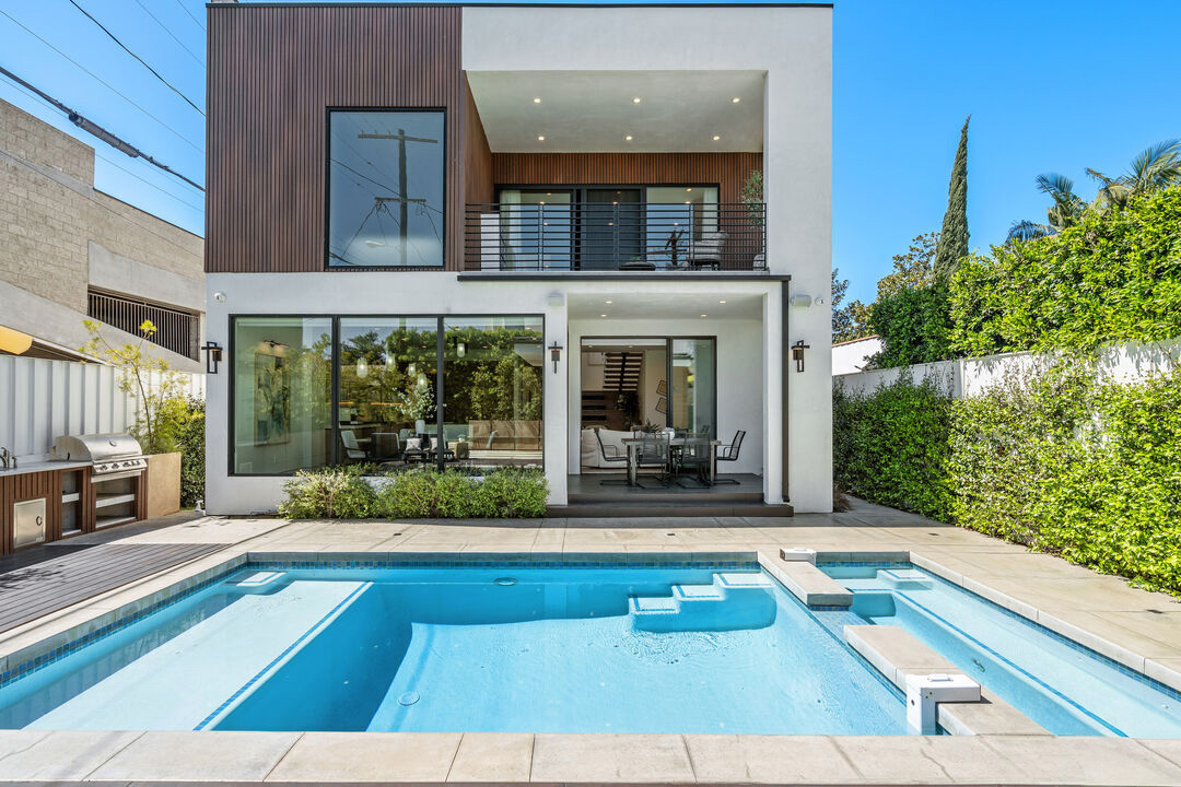 Discover a modern retreat tucked into one of Los Angeles' most energetic and highly walkable pockets. From the moment you arrive, the mature greenery framing the property hints at the calm, modern sanctuary that awaits inside. This five-bedroom residence blends clean design with everyday comfort, offering ensuite bathrooms in every bedroom for effortless privacy and convenience. The primary suite serves as a standout escape, opening onto a private balcony with tranquil views of the pool and spa. Its adjoining bath feels like a boutique spa--thoughtfully laid out with refined finishes that create a serene environment for unwinding at the end of the day. At the center of the home is an open, airy kitchen equipped with sleek appliances, generous storage, and stylish surfaces. The space transitions fluidly into the dining and living areas, where the integrated sound system sets the tone for both movie nights and lively gatherings. Slide open the doors to the covered patio and the backyard reveals itself as a secluded paradise. A sparkling pool and jacuzzi sit surrounded by lush potted trees, creating a resort-like atmosphere ideal for sun-soaked afternoons or evenings under the stars. The built-in BBQ, outdoor sound system, and charming pool house, complete with its own bath and compact kitchen, make entertaining effortless. Step outside the gates and the lifestyle only gets better. With a walk score of 92, this neighborhood is truly a pedestrian's dream. Cafes, comedy clubs, galleries, and an array of restaurants are all just minutes away, giving you endless ways to explore and enjoy your surroundings. More than a home, this property offers a modern way of living--one that balances relaxation with connection, privacy with vibrancy. Welcome to a place where design, comfort, and community come together in perfect harmony.
